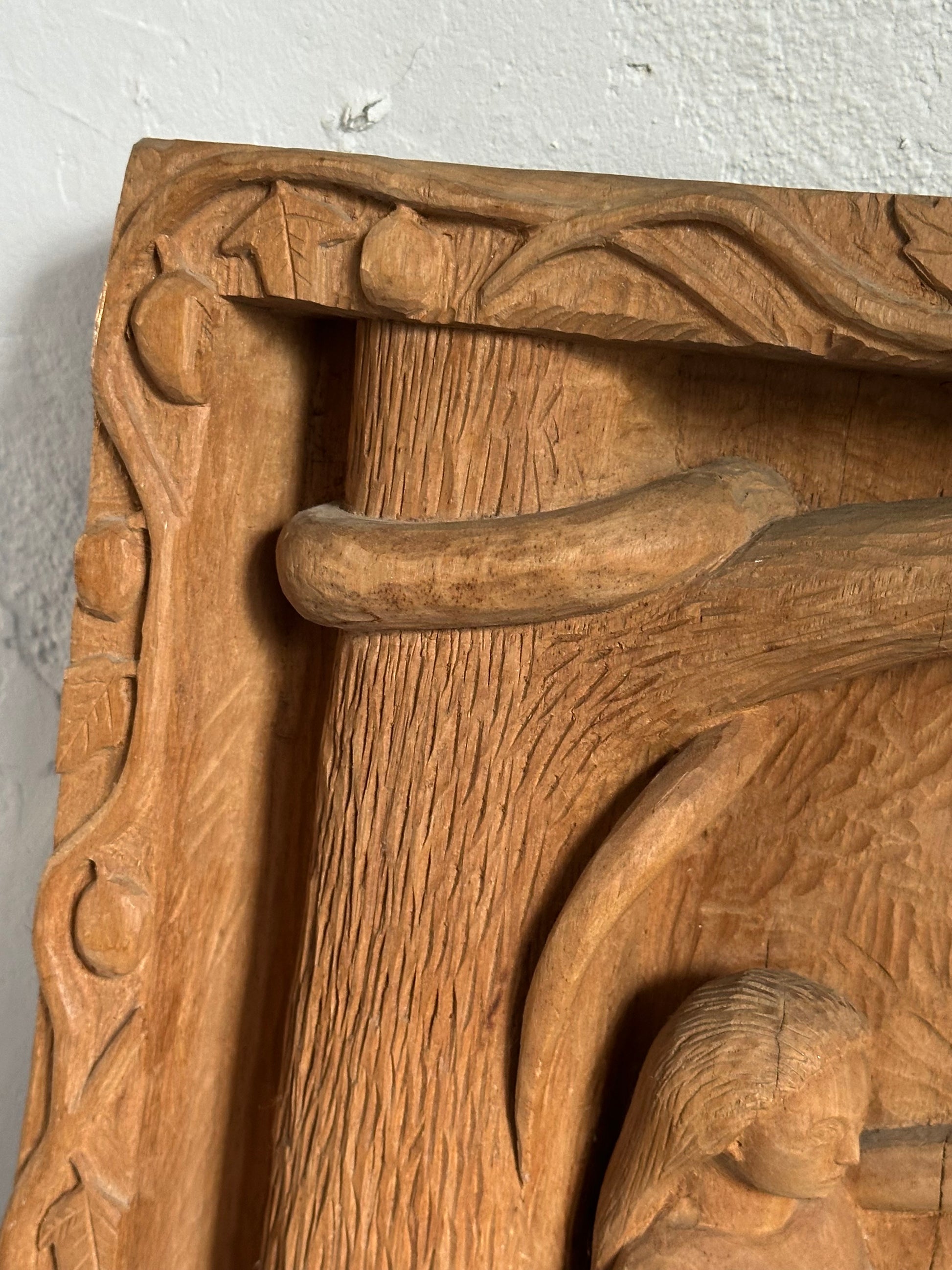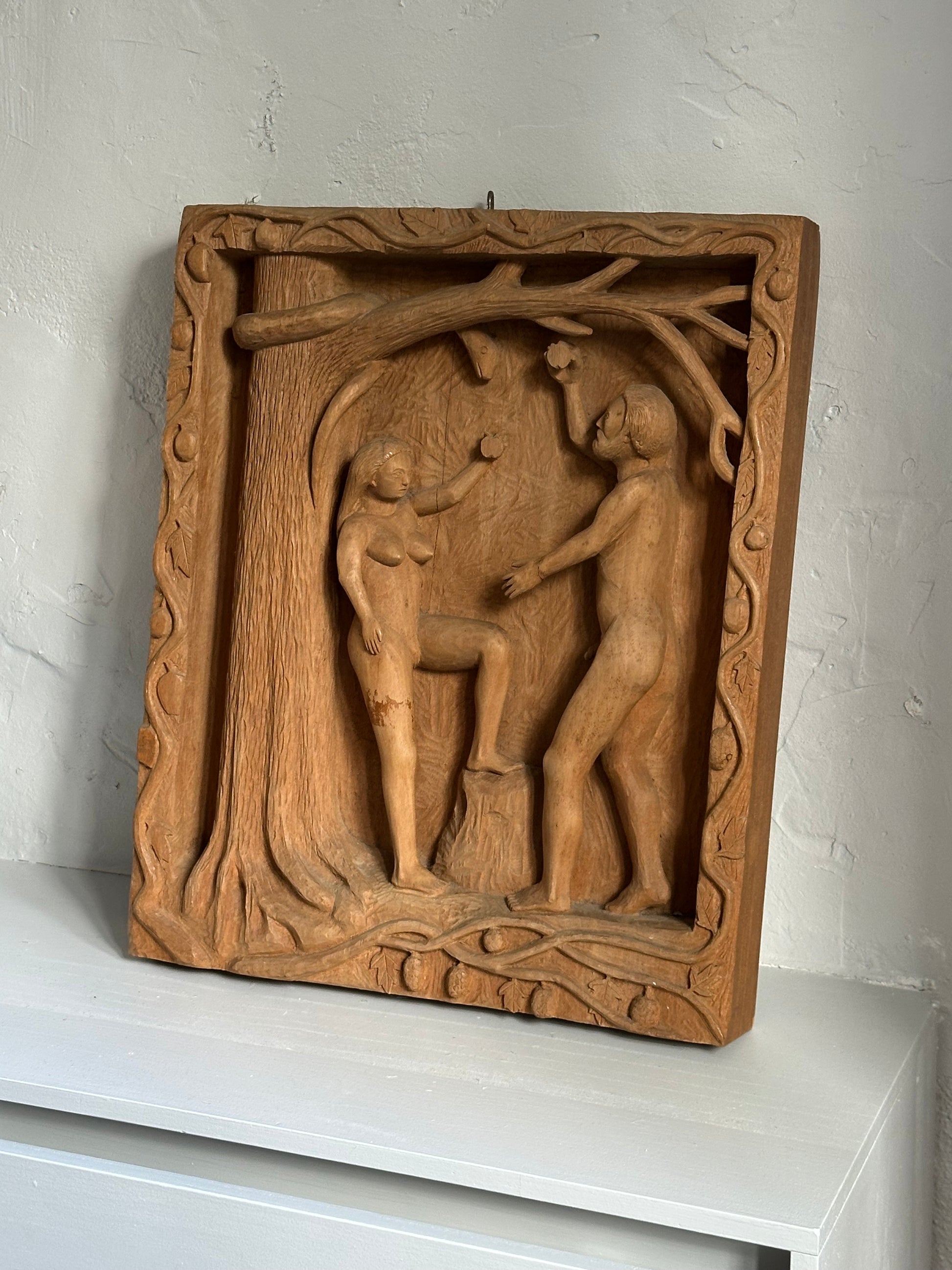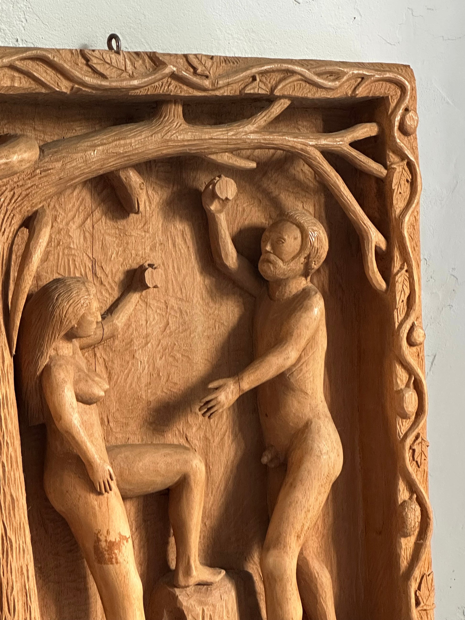 Håndskåret relief i træ fundet i Italien med Adam og Eva motiv. Det må ha taget så længe at lave. Det er i flot stand - enkelte af de små udstikkende dele (såsom Adams … jaer… altså … you know) har været knækket af og limet på igen - men meget pænt repareret. Overall flot vintage stand. Der er ophæng på i toppen.