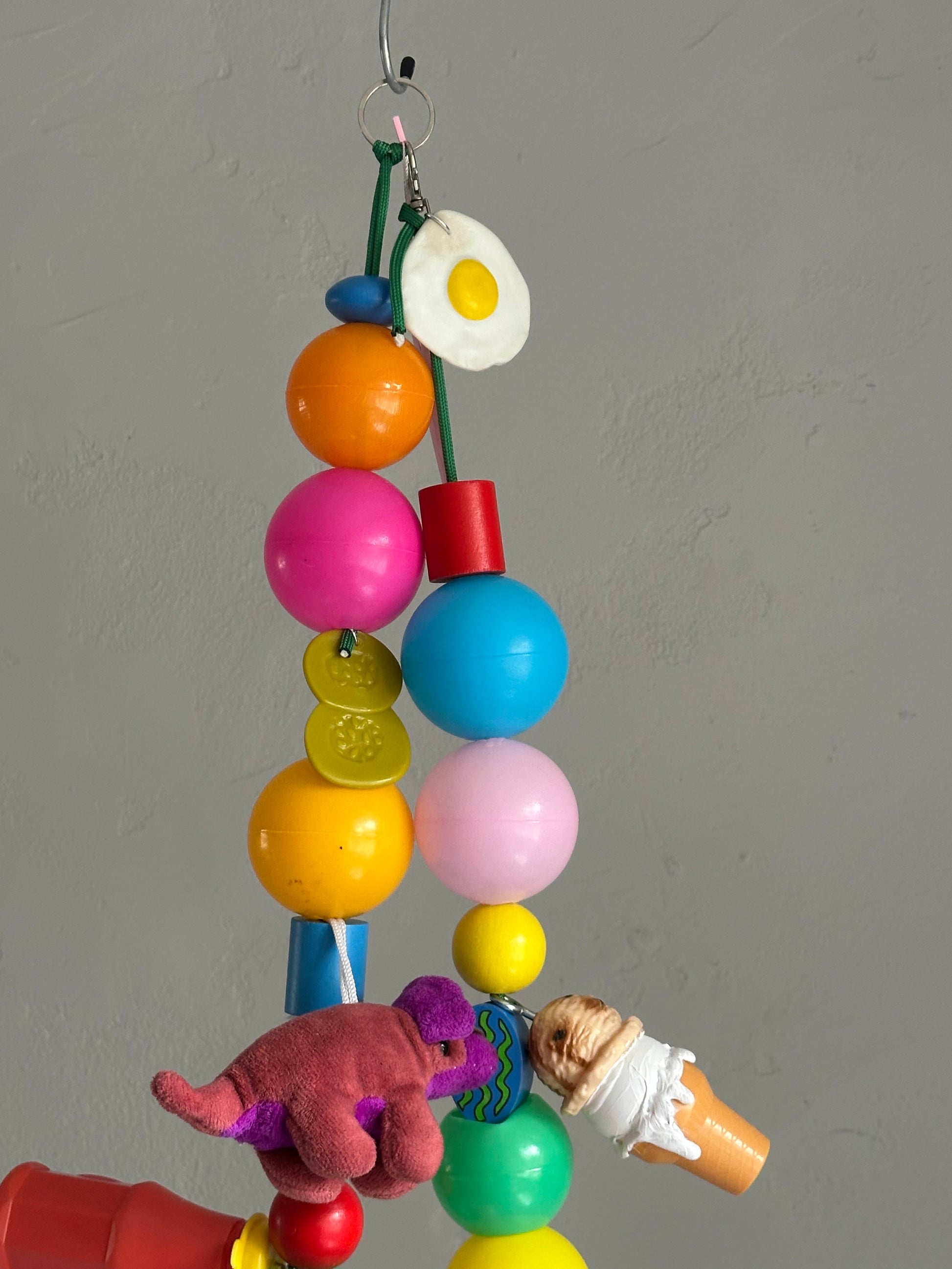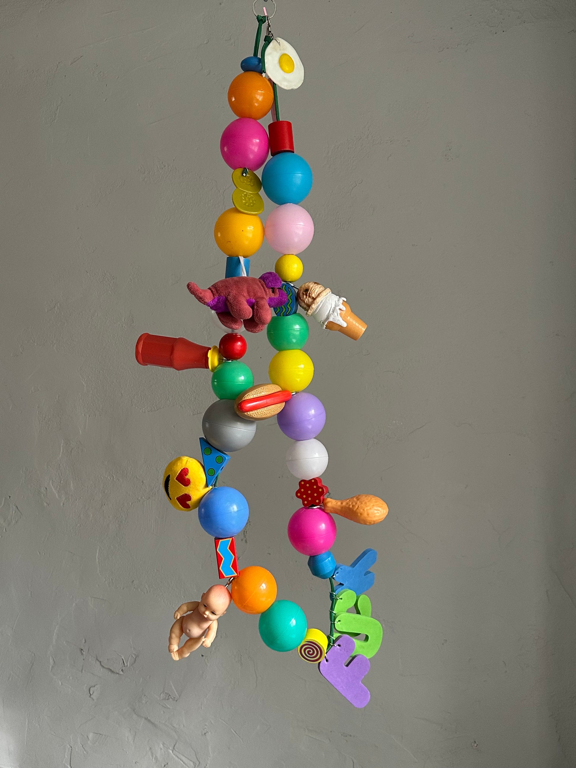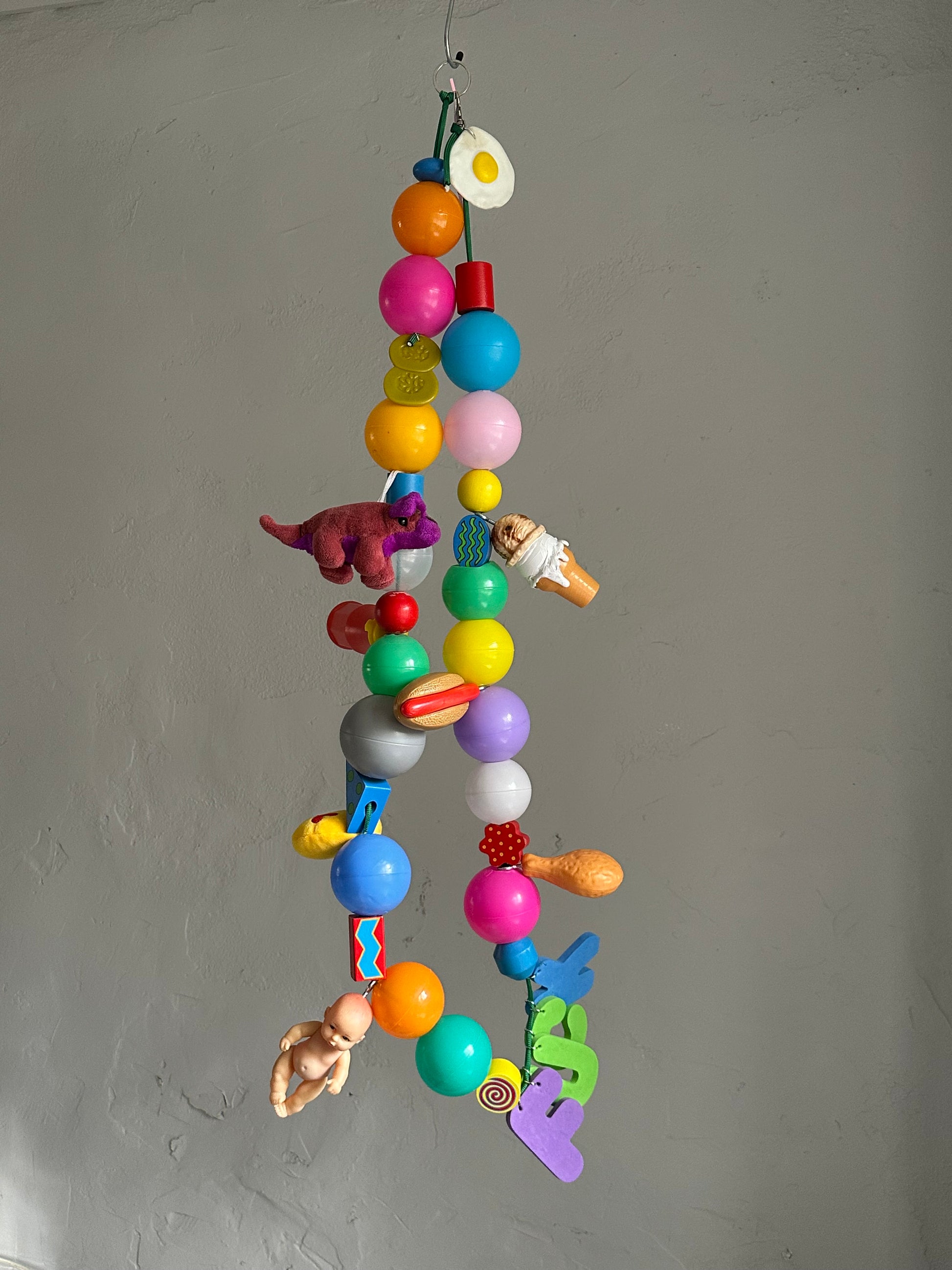 Håndlavet BIG BRACELET værk lavet af udelukkende genbrugsmaterialer af @loespaatraaden (Instagram). Det er kun fantastisk der sætter grænser for hvordan det kan hænges op. Låsen kan åbnes så den også kan hænge i sin fulde længde (måske sno sig omkring et vandrør etc). Så mange muligheder.