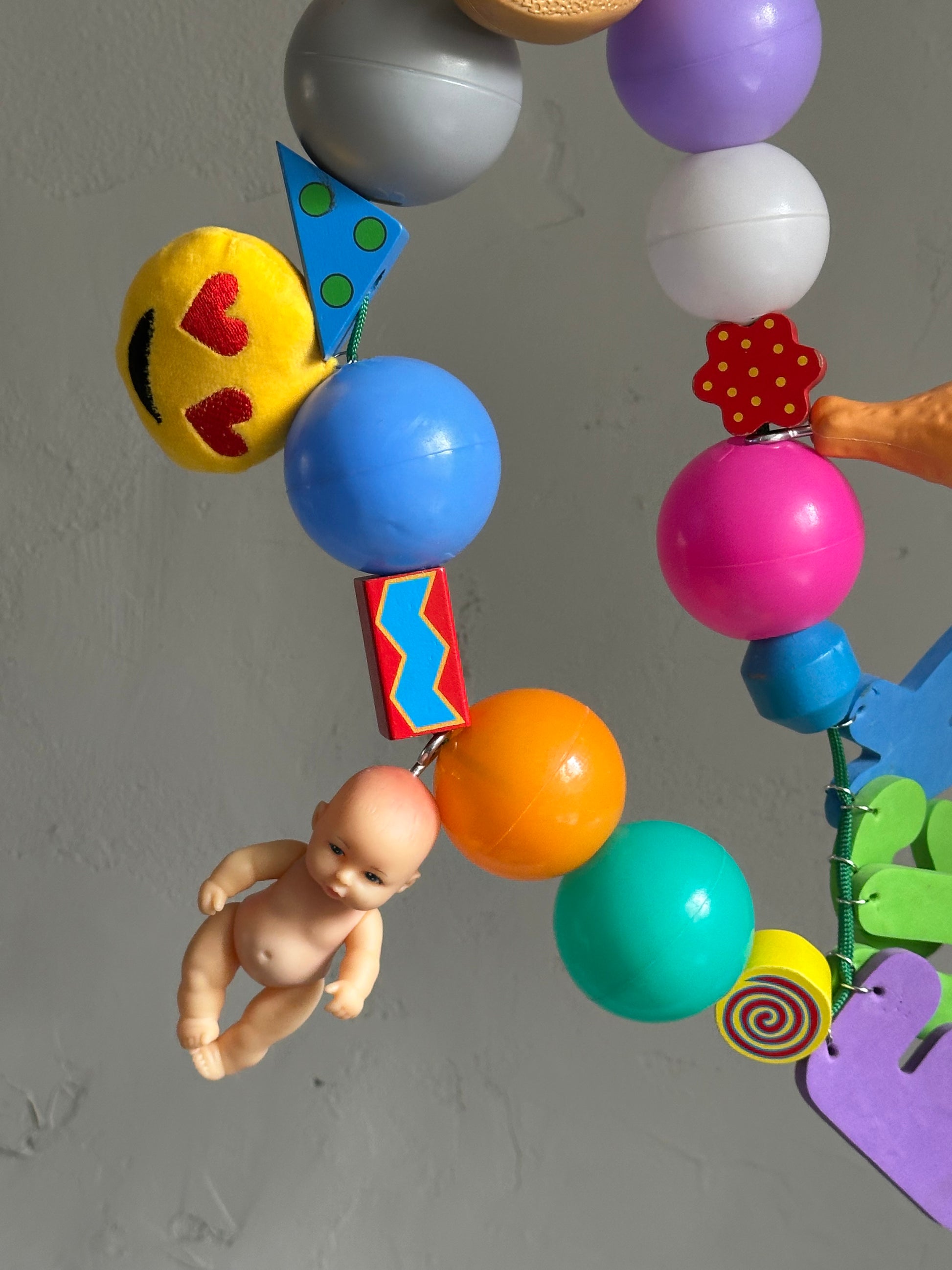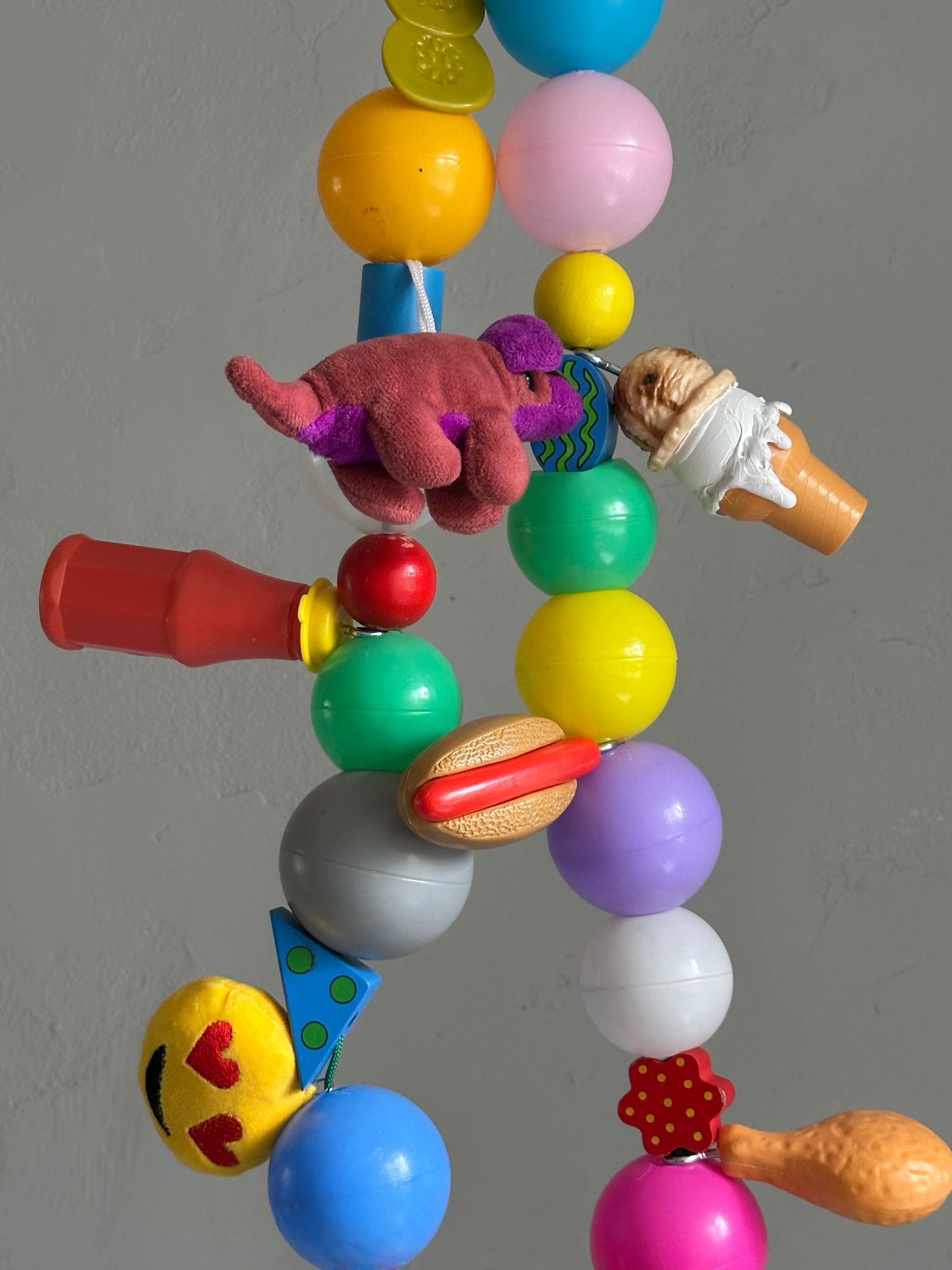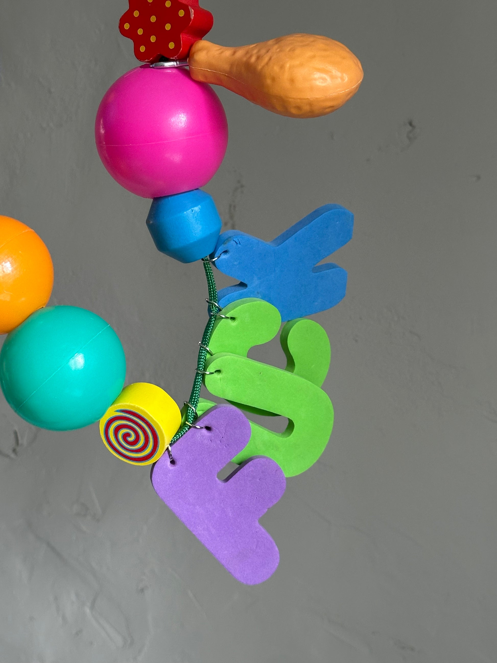Håndlavet BIG BRACELET værk lavet af udelukkende genbrugsmaterialer af @loespaatraaden (Instagram). Det er kun fantastisk der sætter grænser for hvordan det kan hænges op. Låsen kan åbnes så den også kan hænge i sin fulde længde (måske sno sig omkring et vandrør etc). Så mange muligheder.