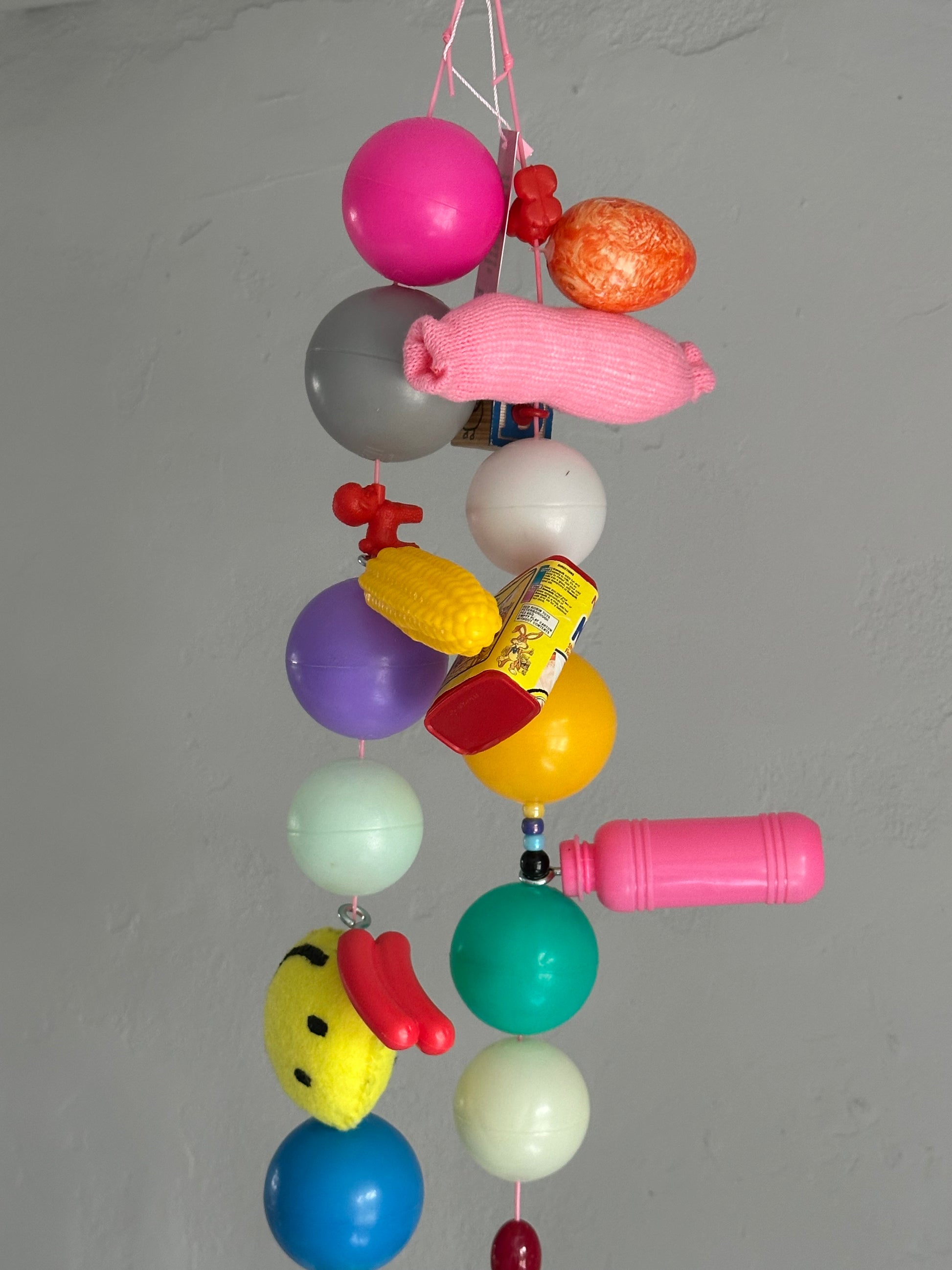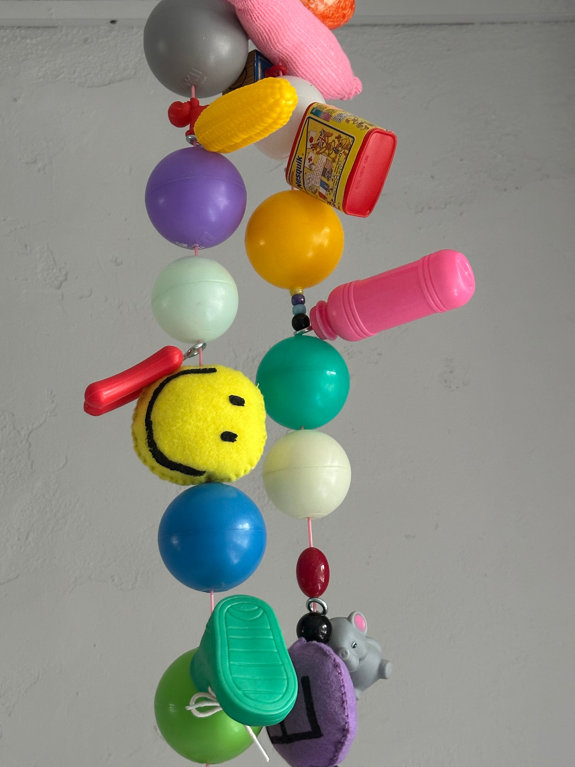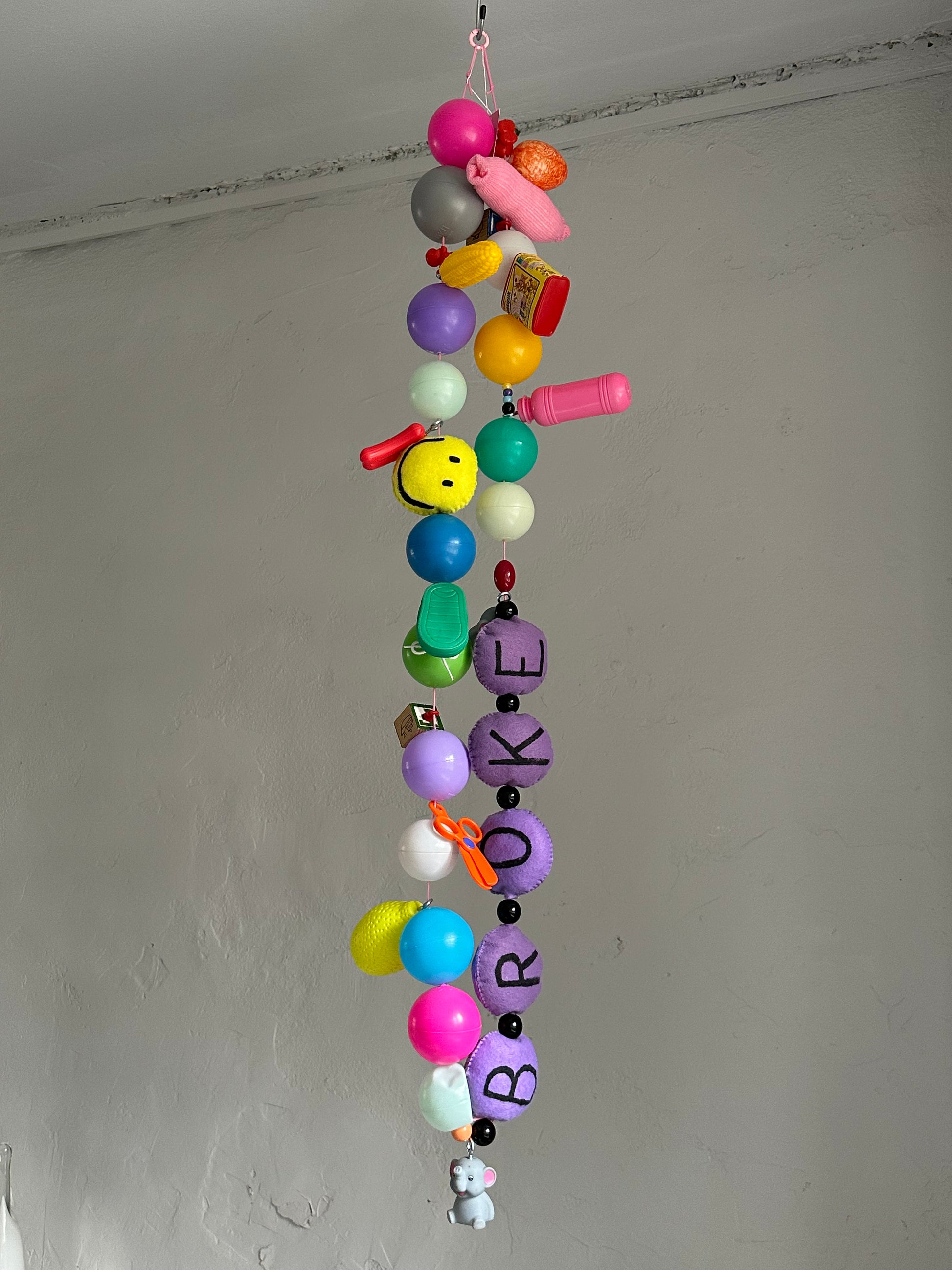 Håndlavet BIG BRACELET værk lavet af udelukkende genbrugsmaterialer af @loespaatraaden (Instagram). Det er kun fantastisk der sætter grænser for hvordan det kan hænges op. Låsen kan åbnes så den også kan hænge i sin fulde længde (måske sno sig omkring et vandrør etc). Så mange muligheder.