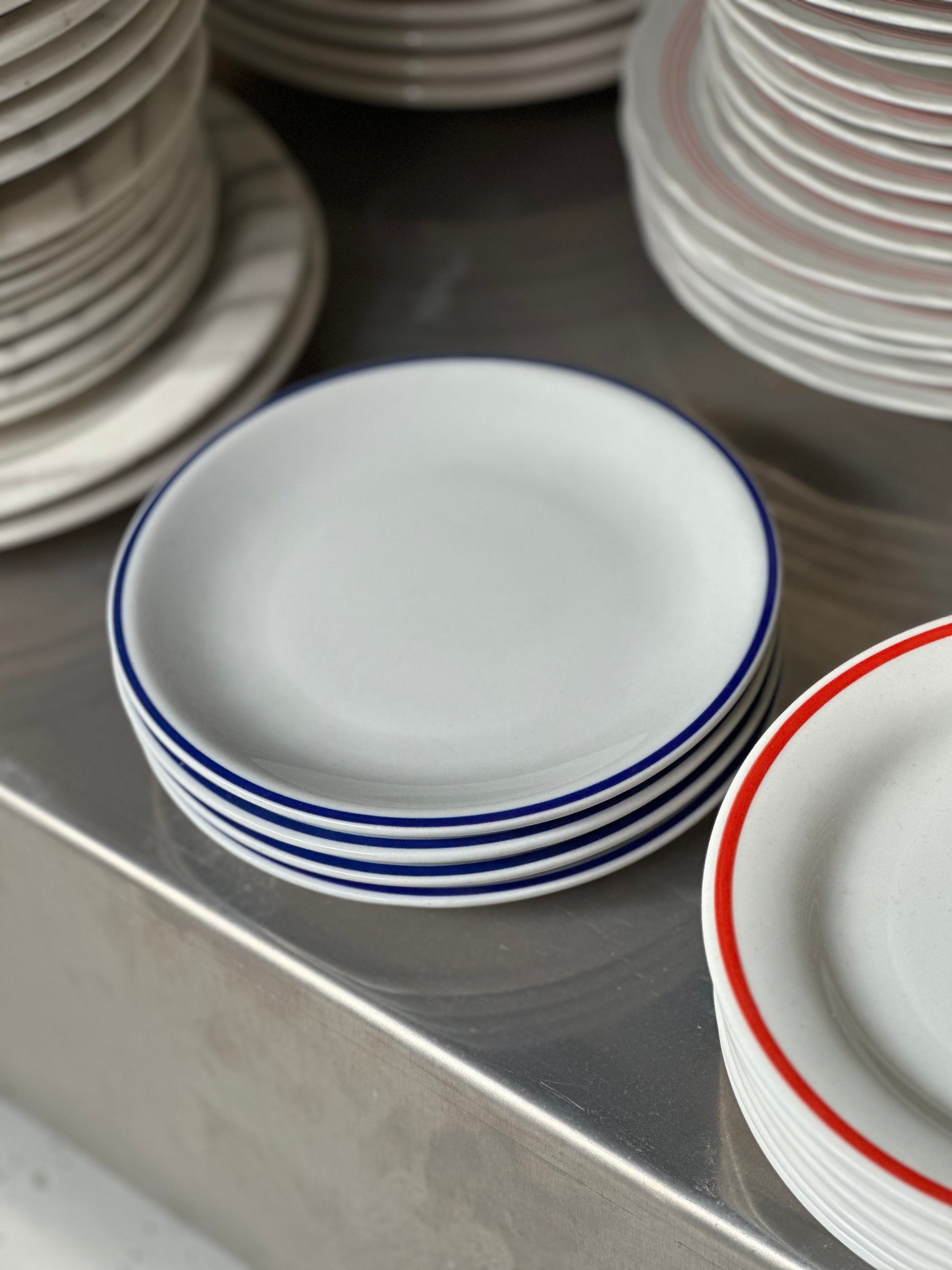 Vintage bistro frokost tallerkener med blå kanter. De er fundet i Italien og er i flot stand uden skår og kun alm lette brugsspor.