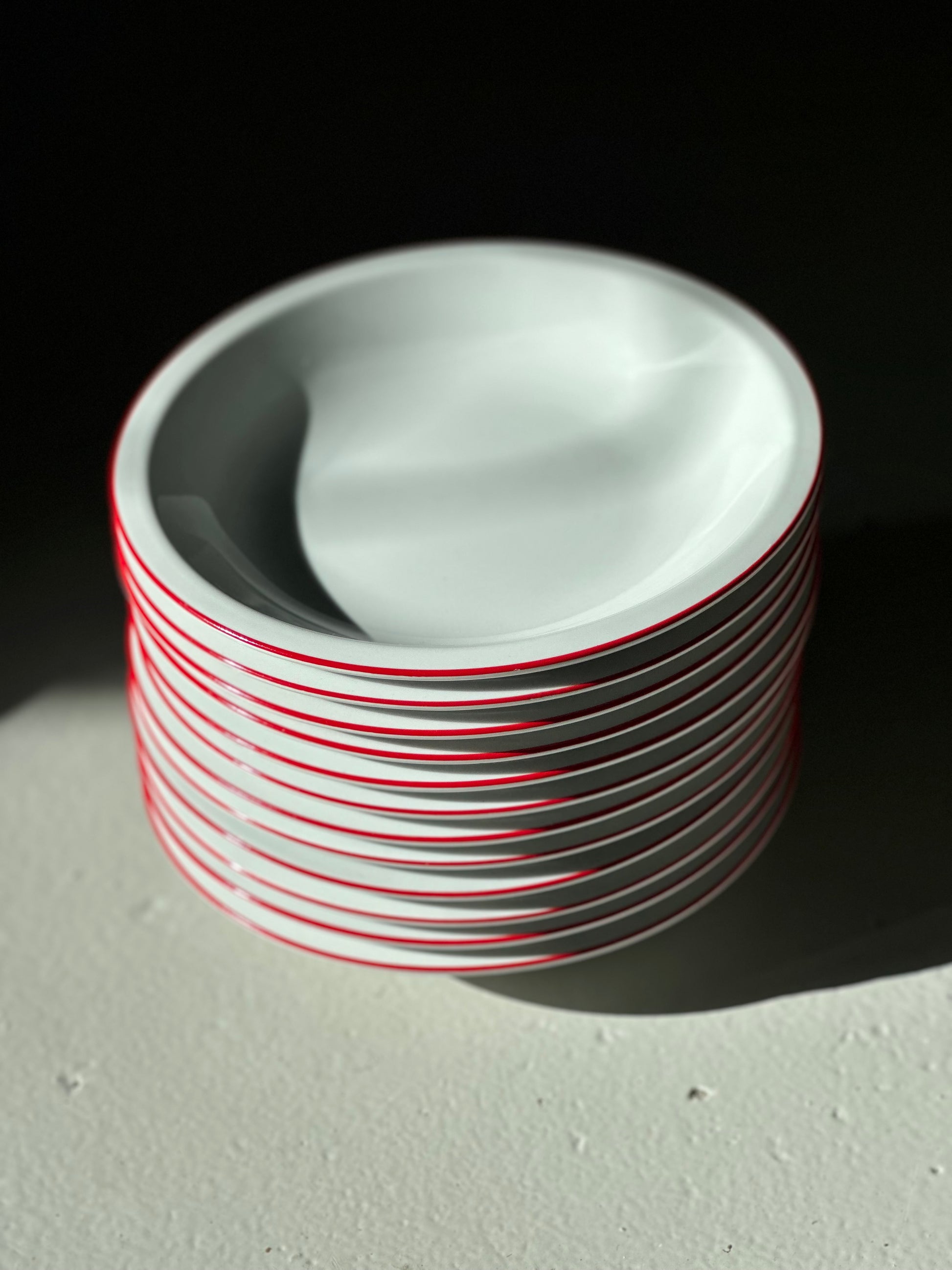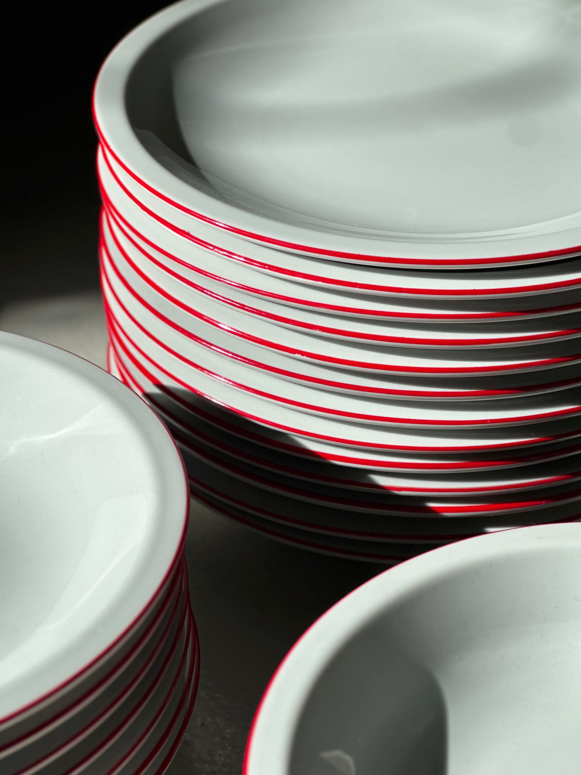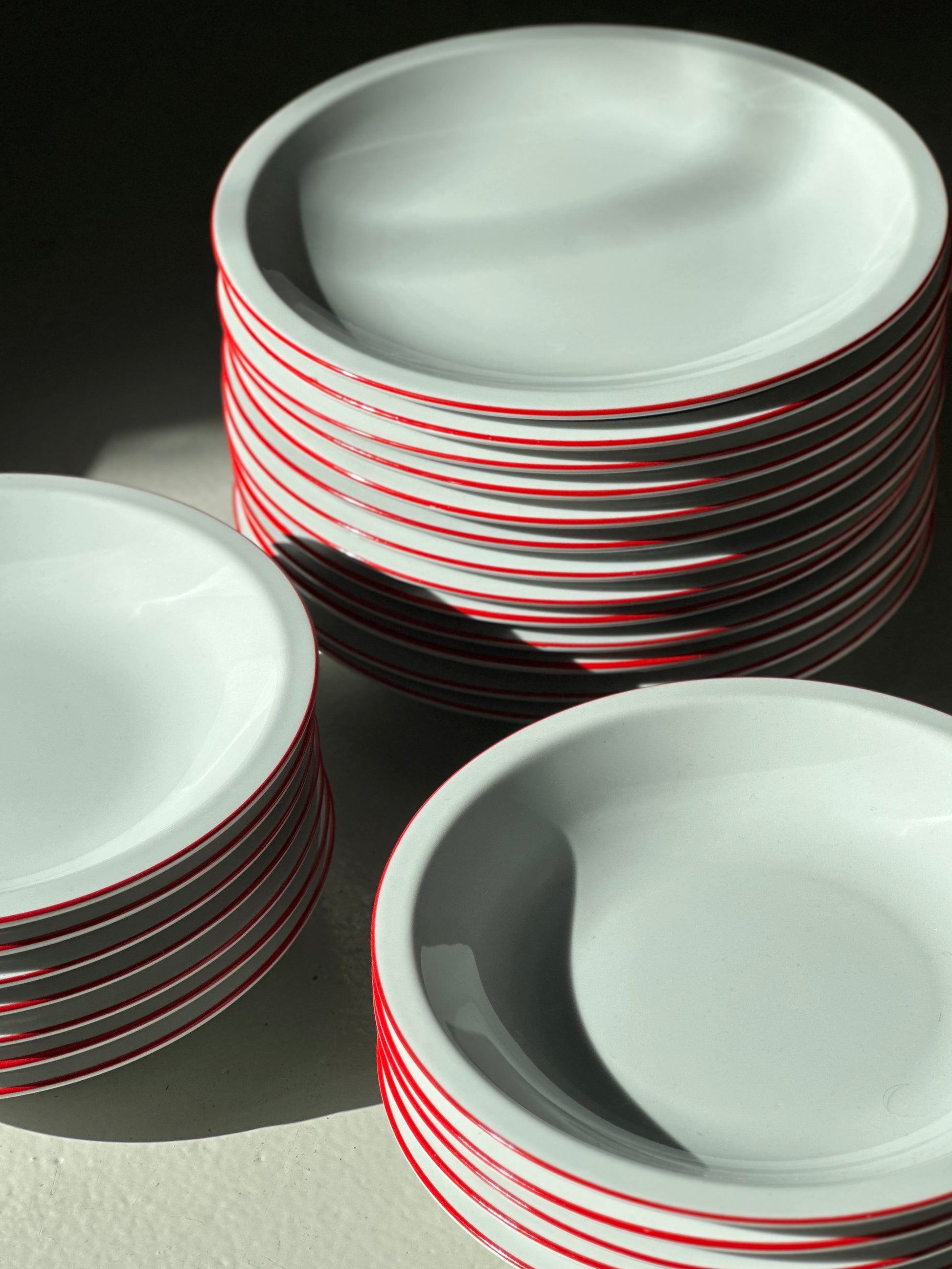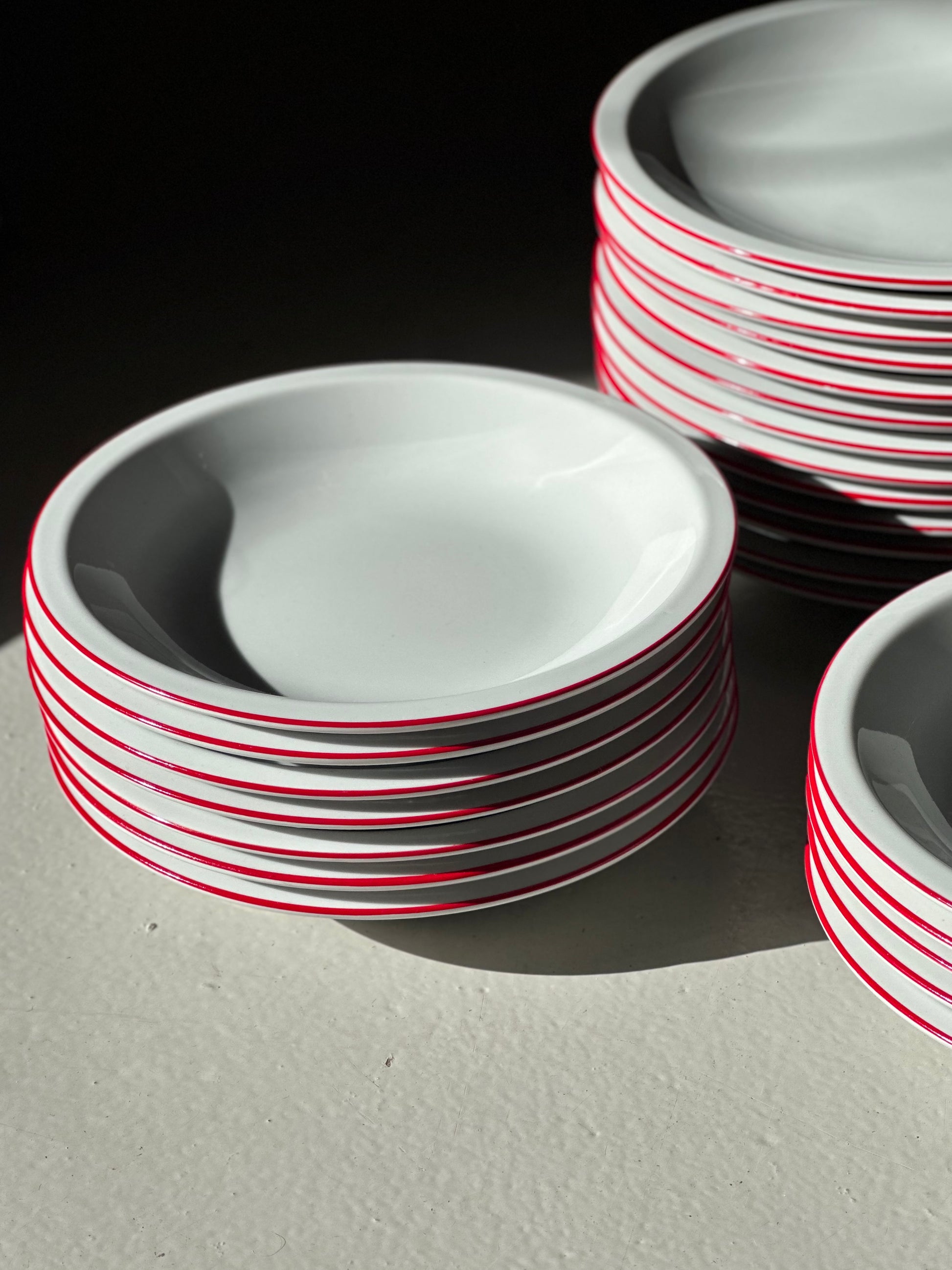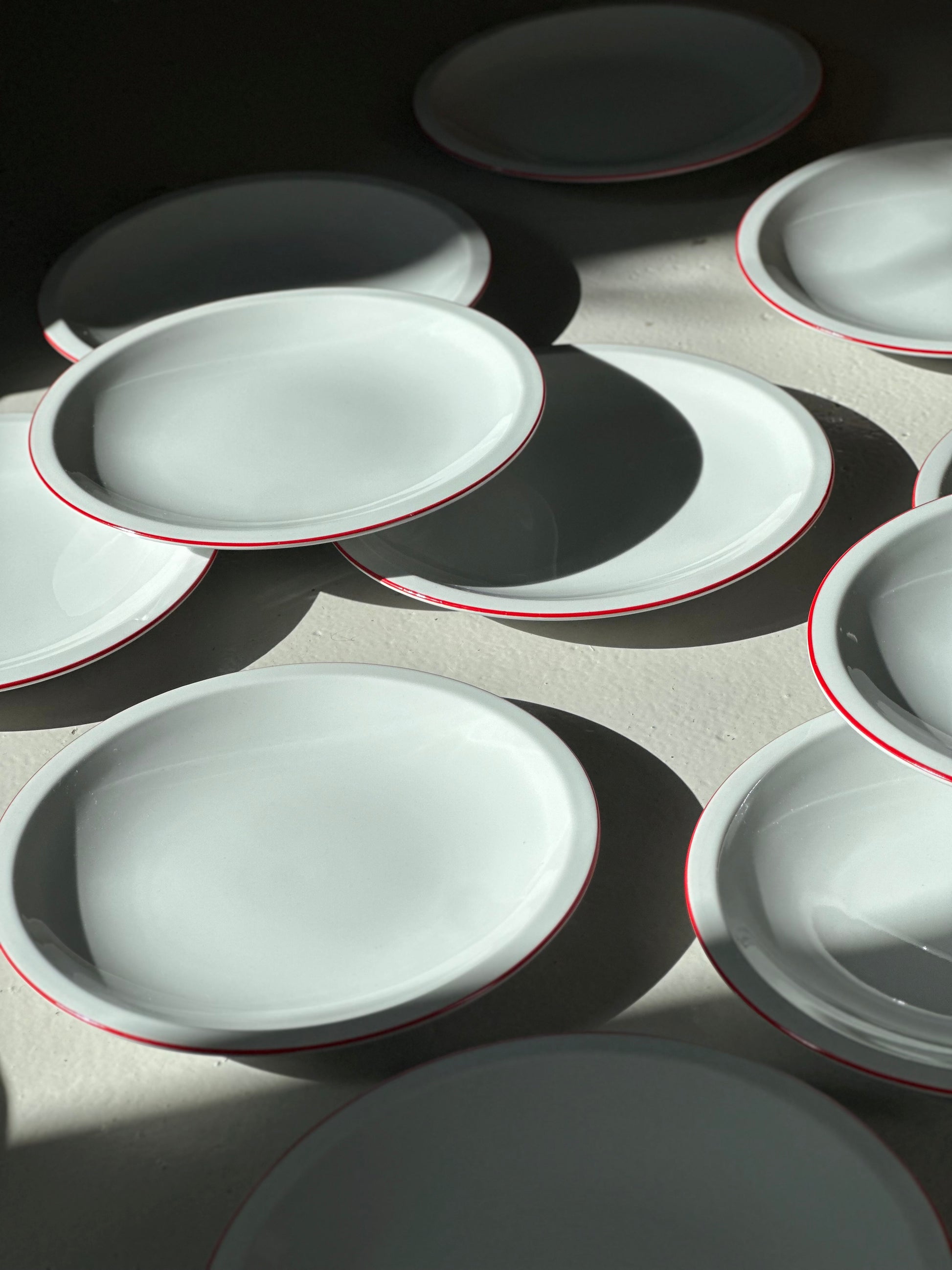 Italienske vintage bistro tallerkener i hvidt porcelæn med røde kanter. De er fundet i Italien og er alle i flot stand uden skår og kun alm lette brugsspor.
