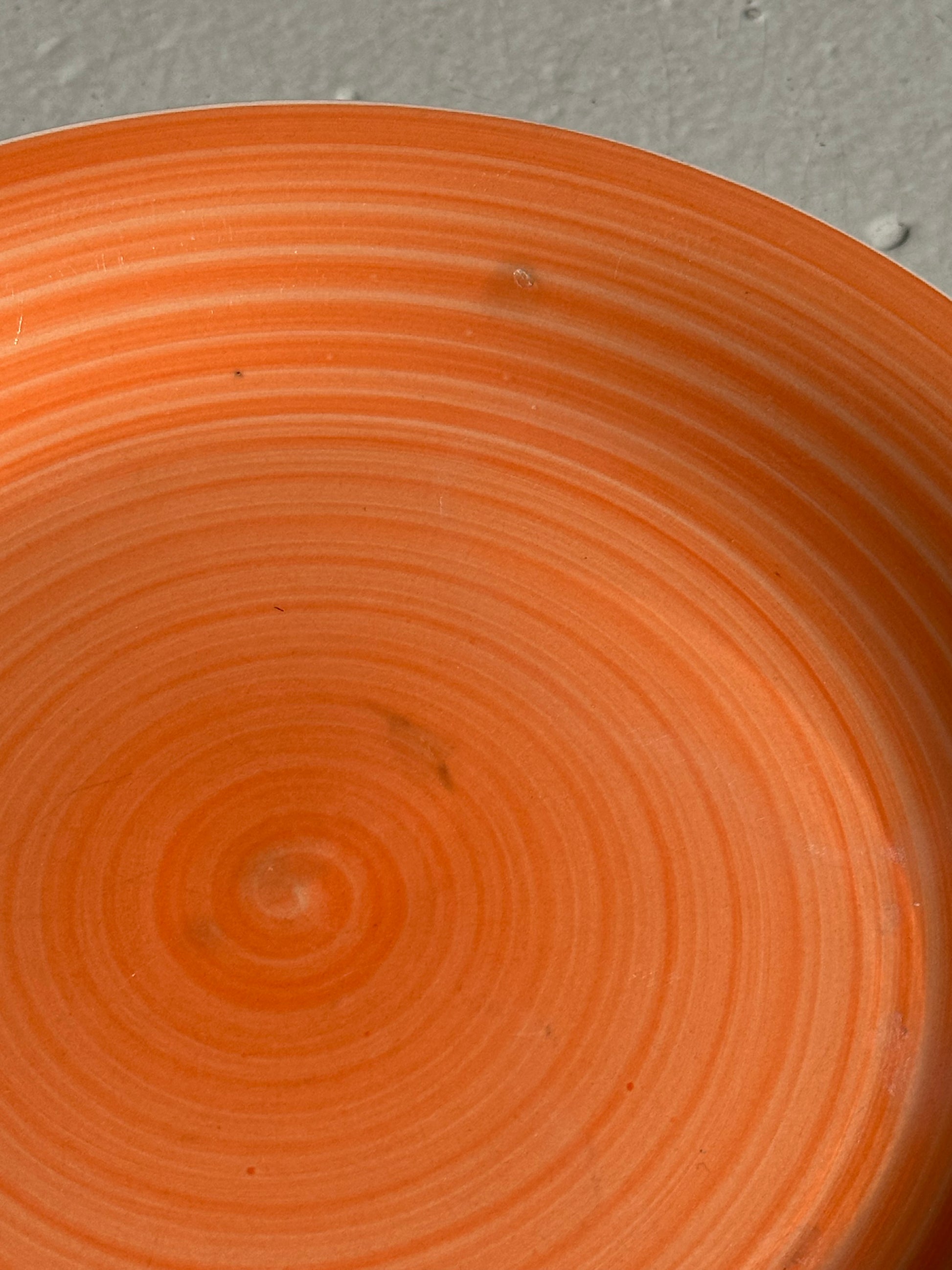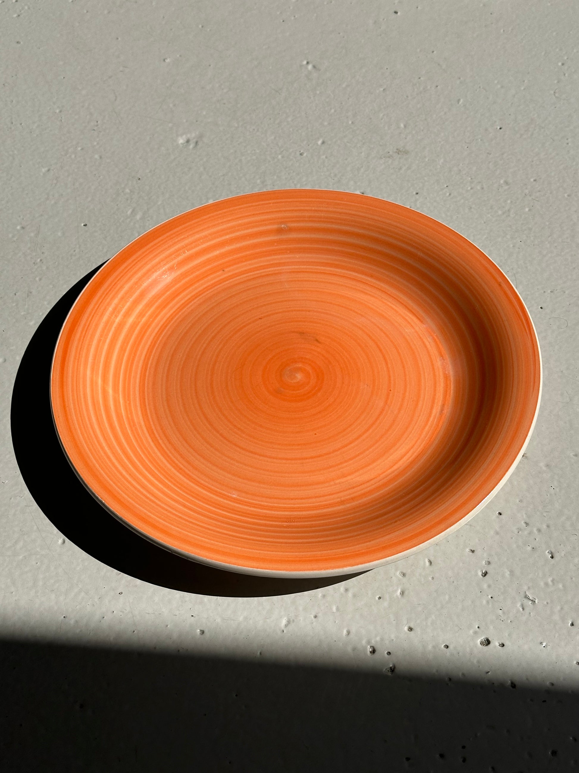 Flad italienske middagstallerkener i orange swirly glasur. Den har lidt brugsspor (se billeder) derfor prisen