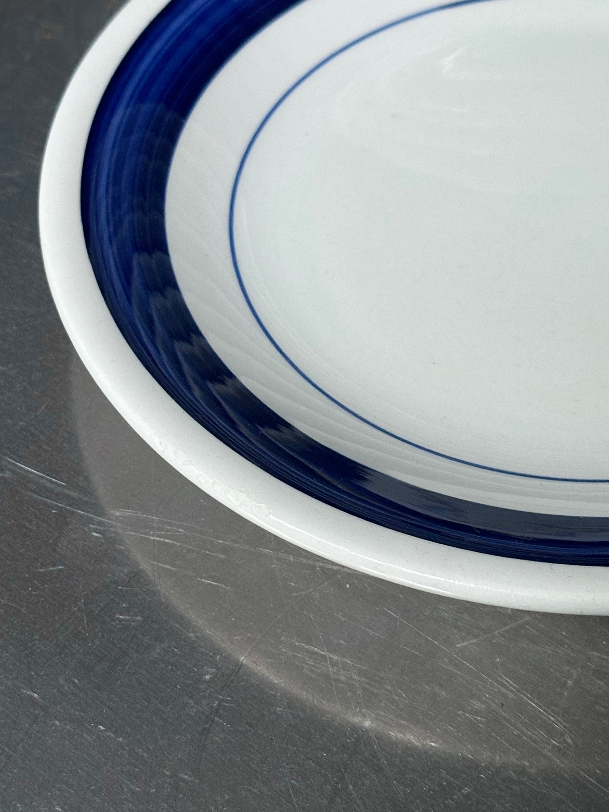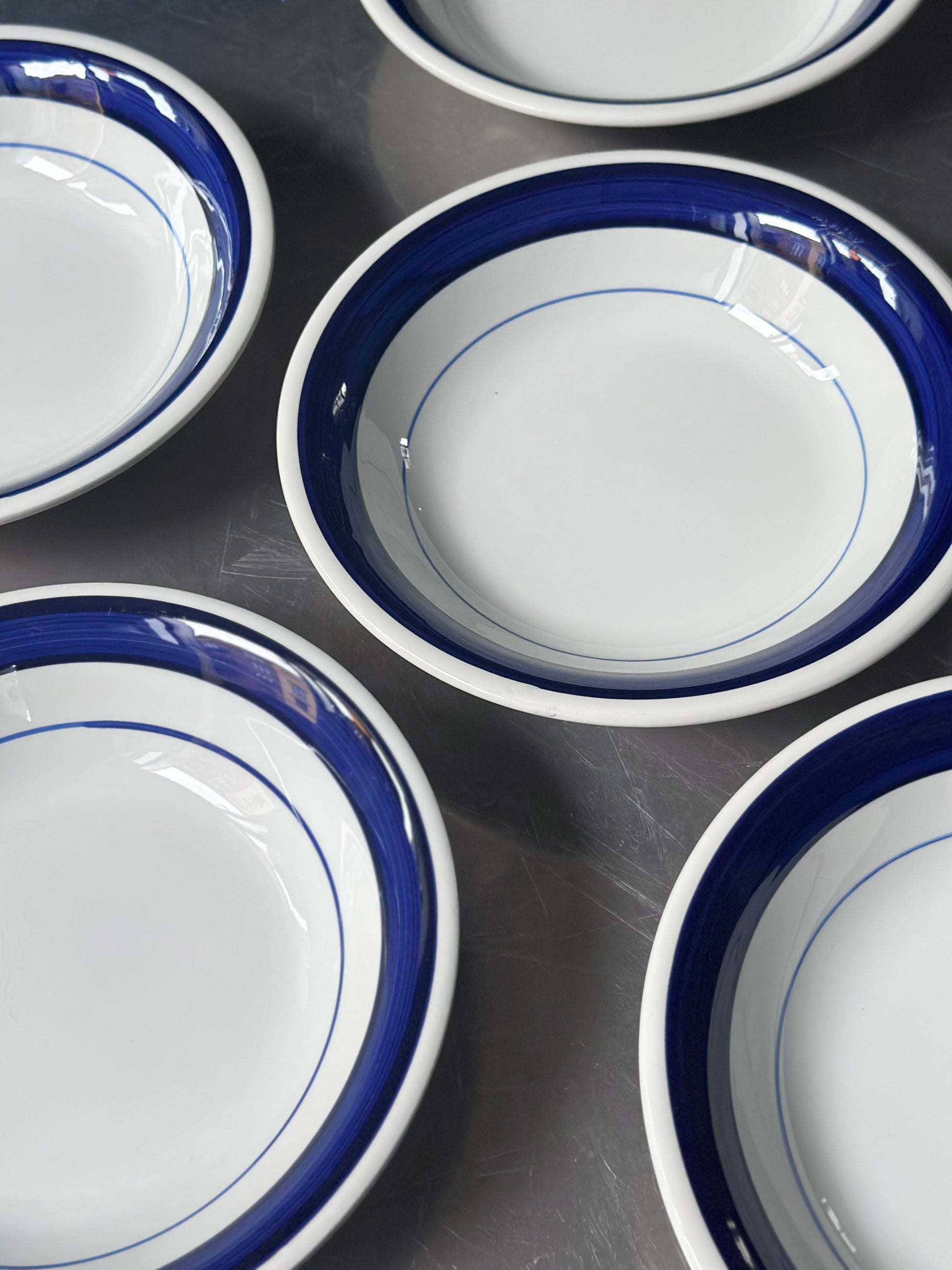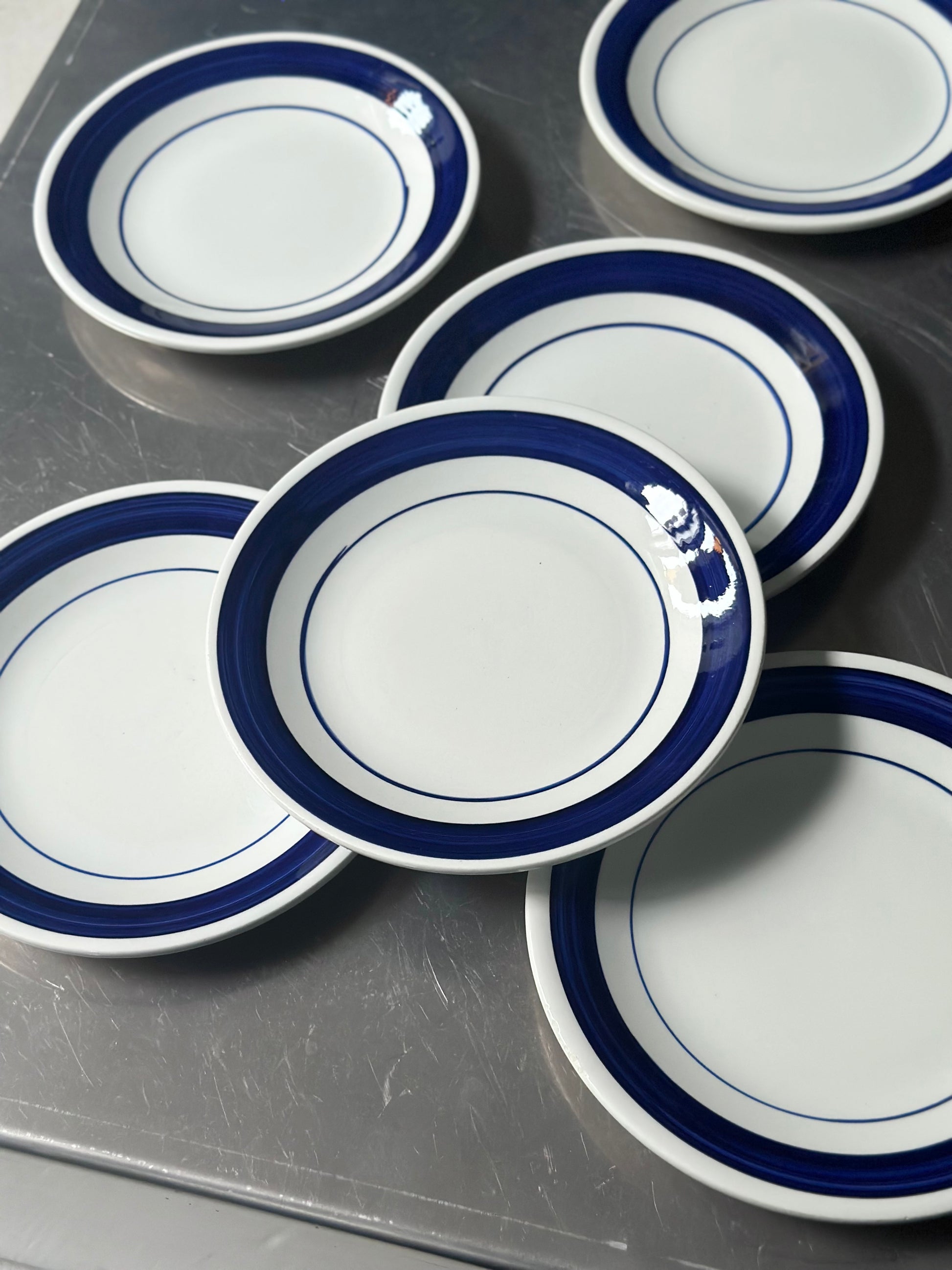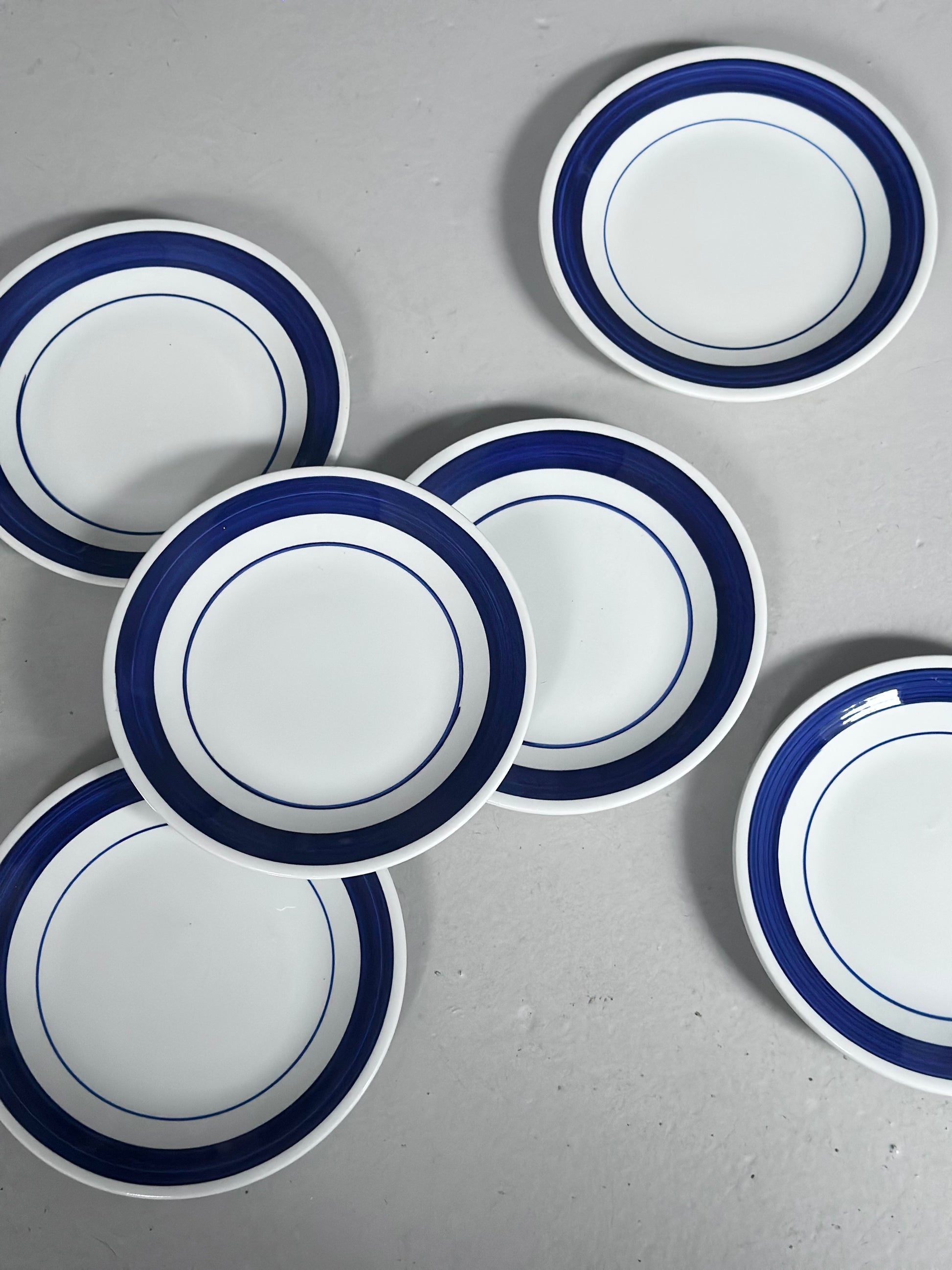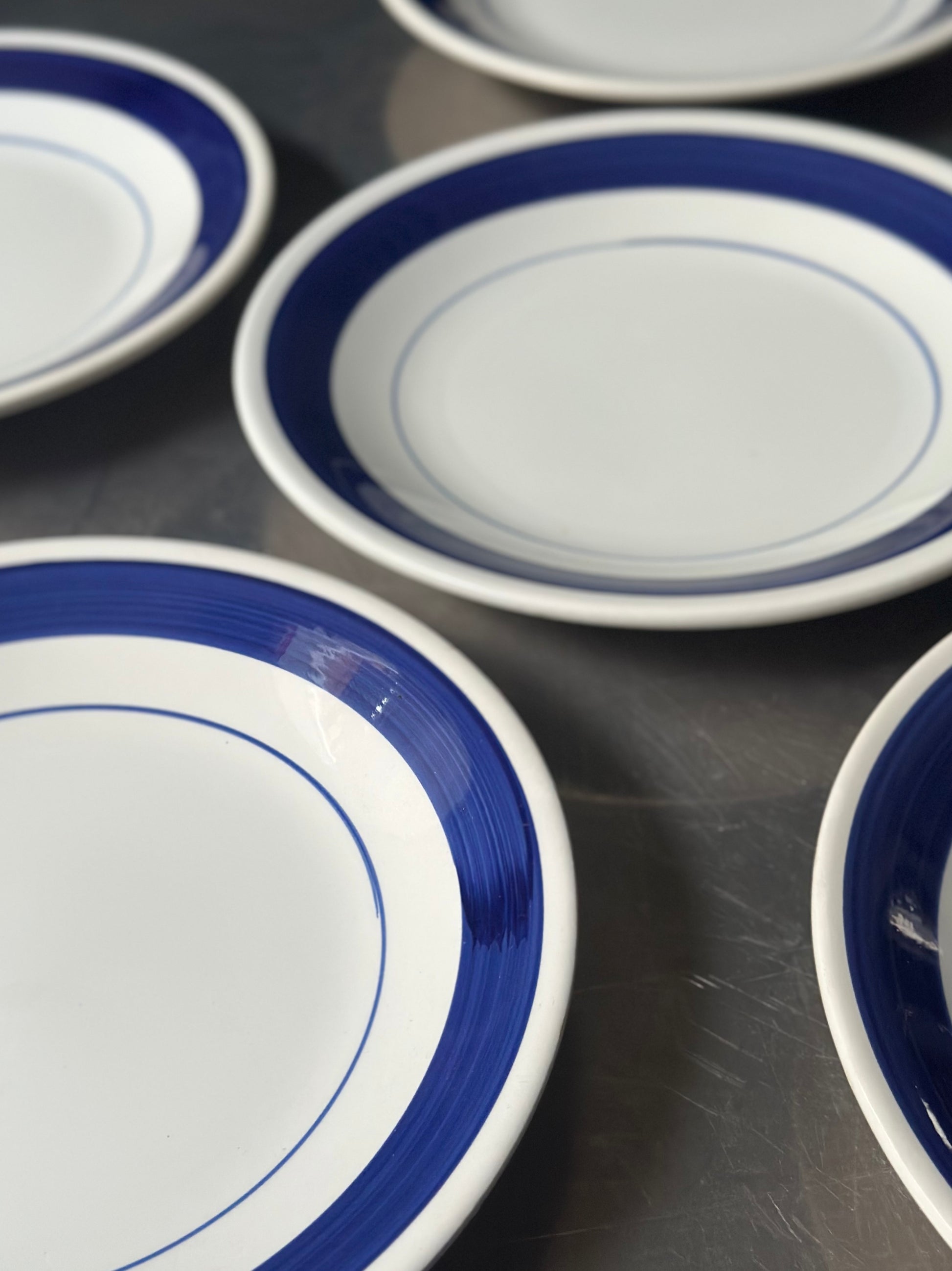 Italiensk vintage bistro stel med chunky hvid glasur og håndmalede blå kanter. De er fundet i Italien og er alle i flot stand uden skår - de har små diskrete skrab hist pist enkelte steder på kanterne.
