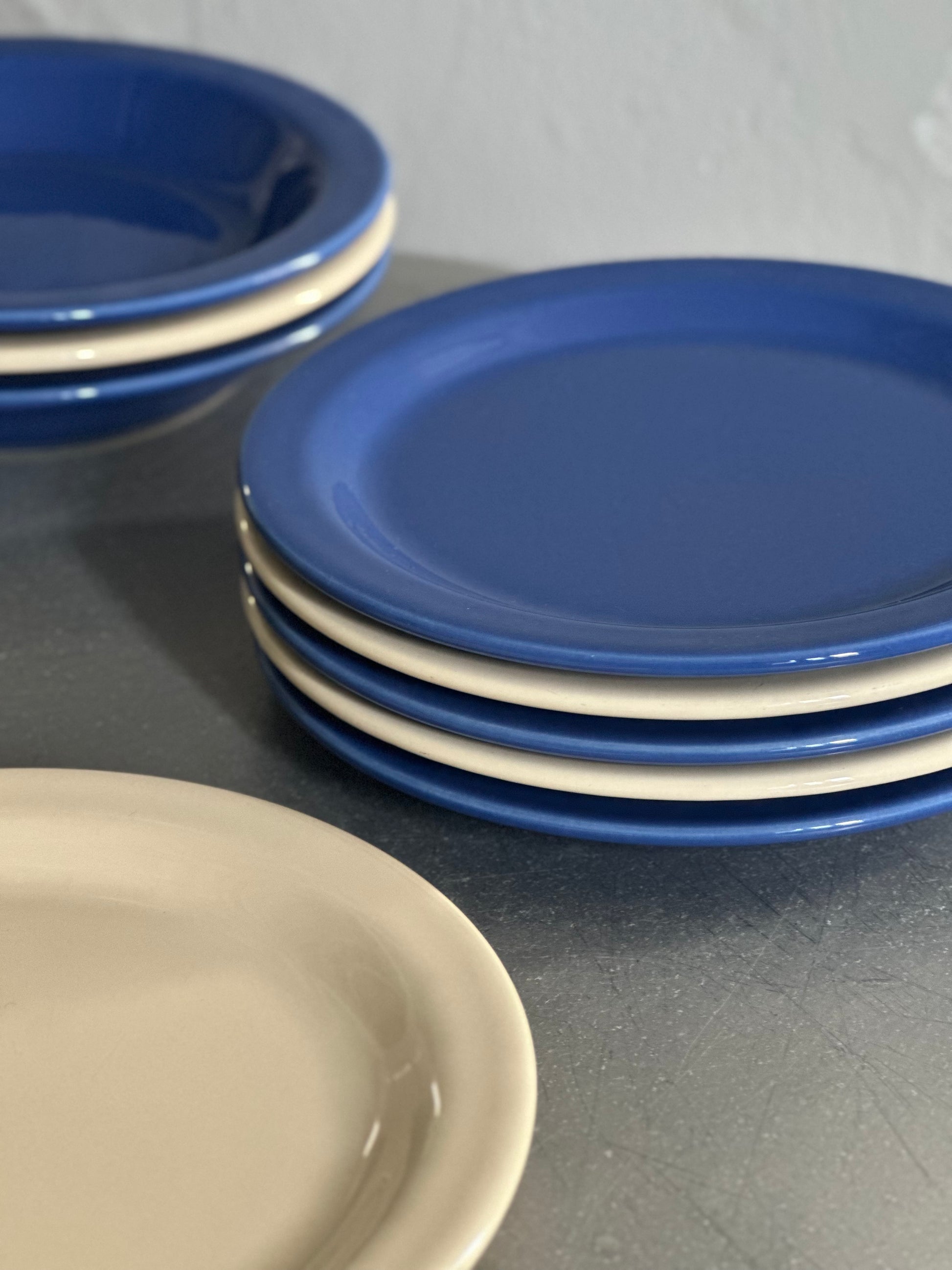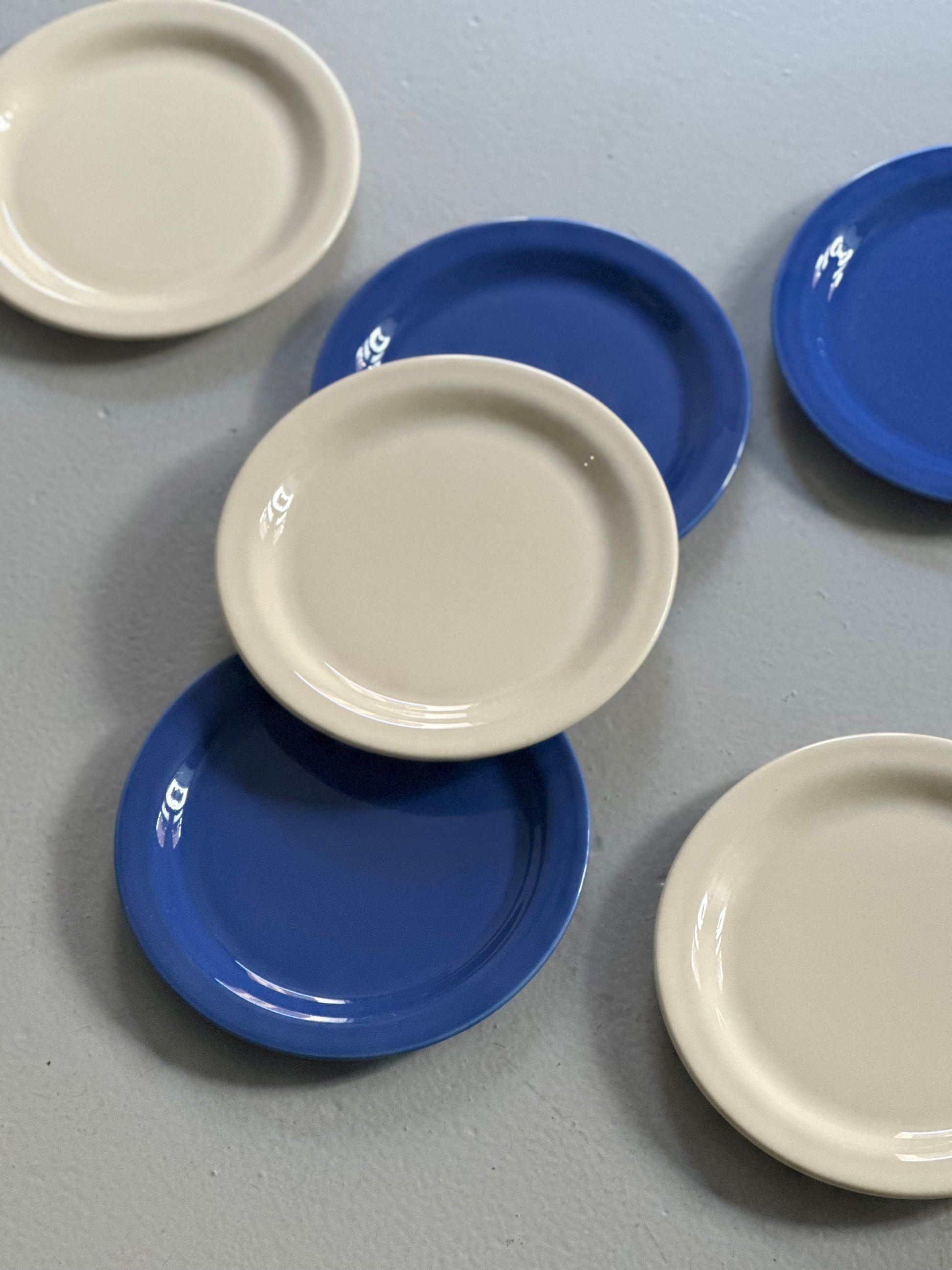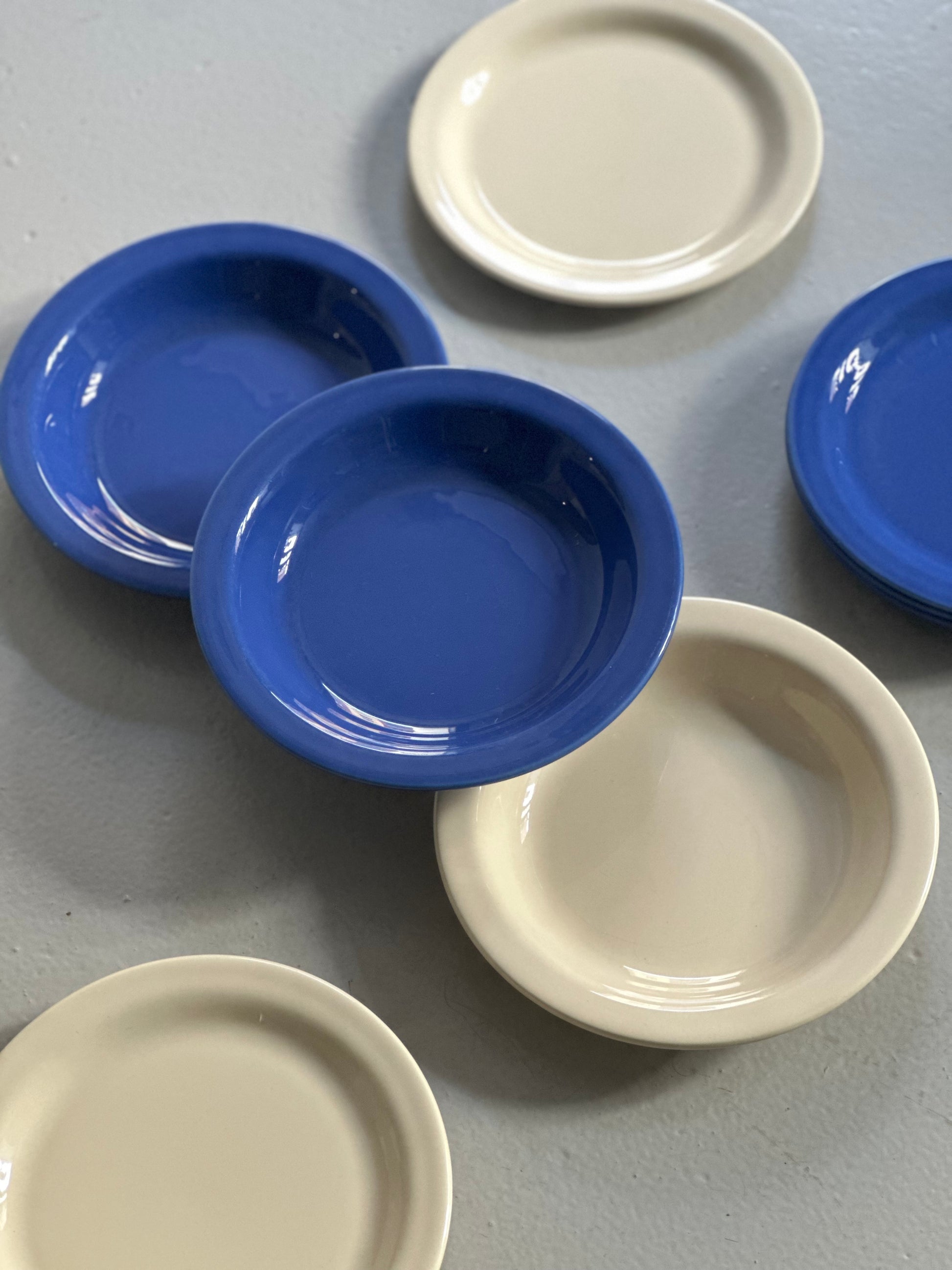 Chunky tallerkener med blå og cremefarvet glasur. Stellet er fundet i Italien og alle delene er i flot stand uden skår og med kun alm lette brugsspor.