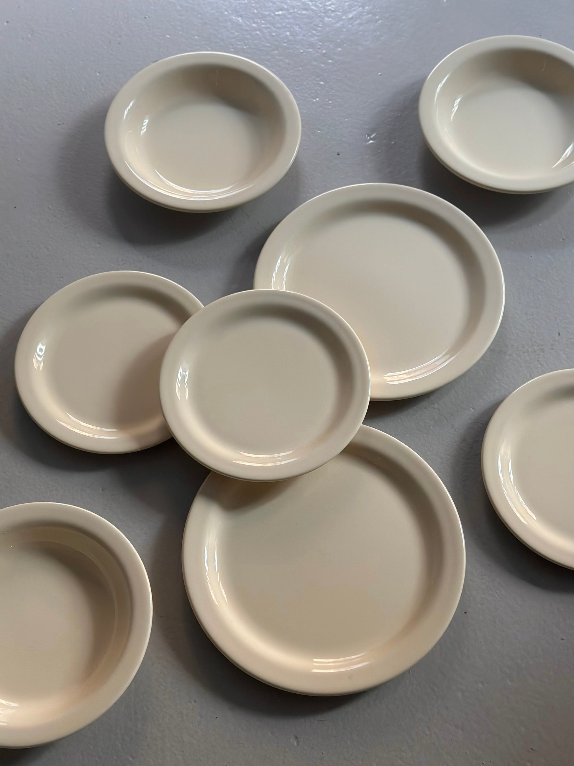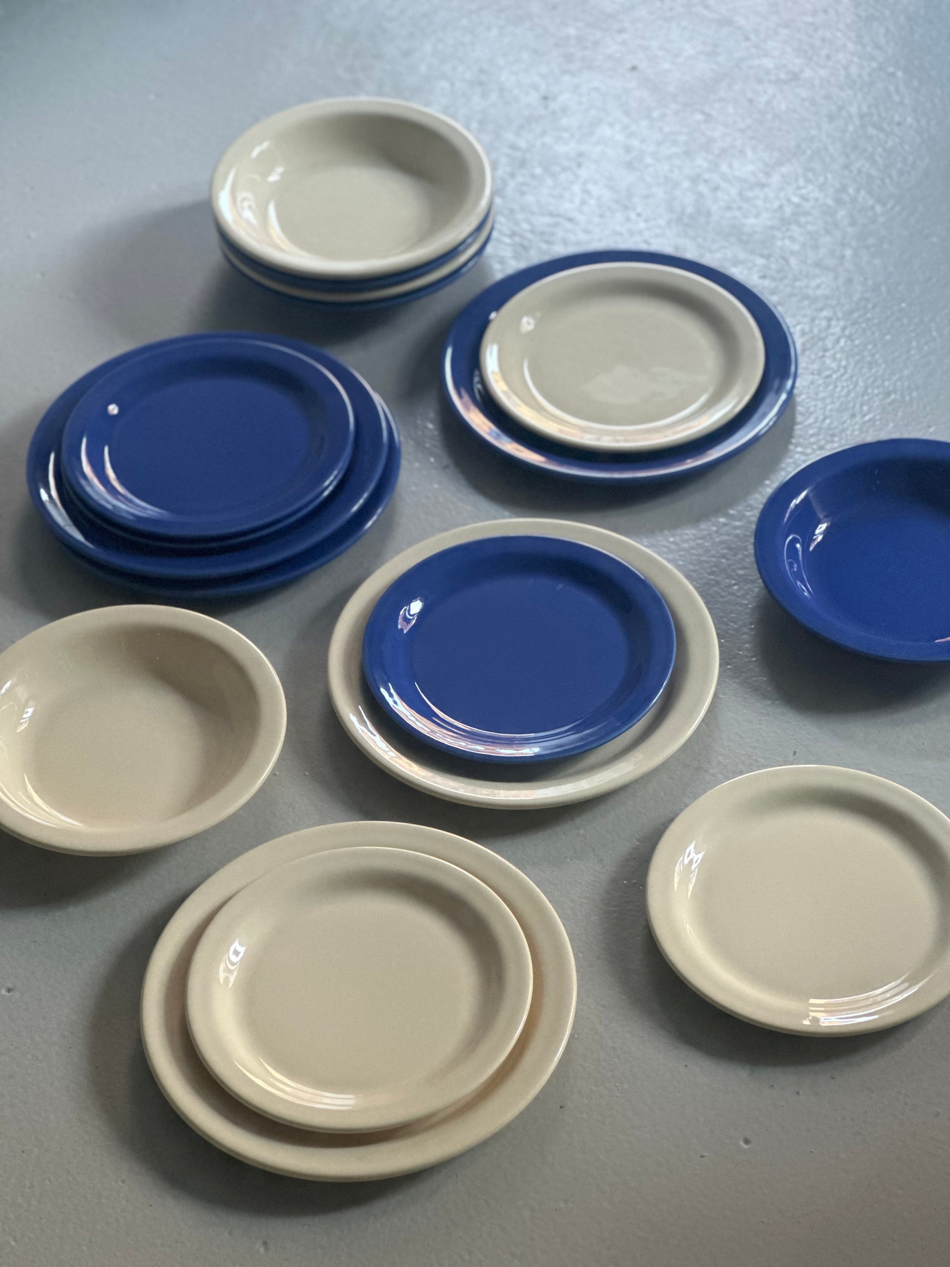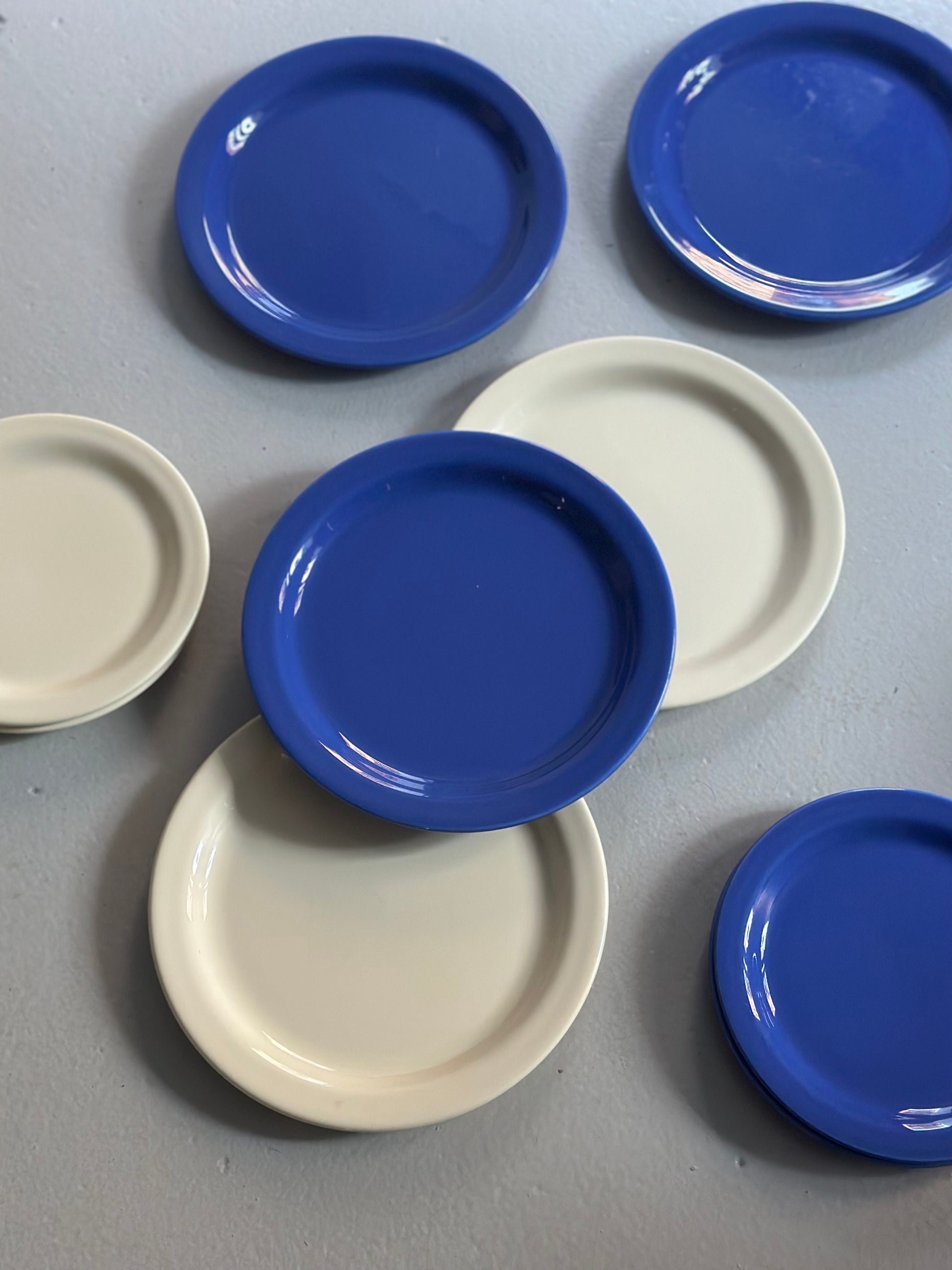 Chunky tallerkener med blå og cremefarvet glasur. Stellet er fundet i Italien og alle delene er i flot stand uden skår og med kun alm lette brugsspor.