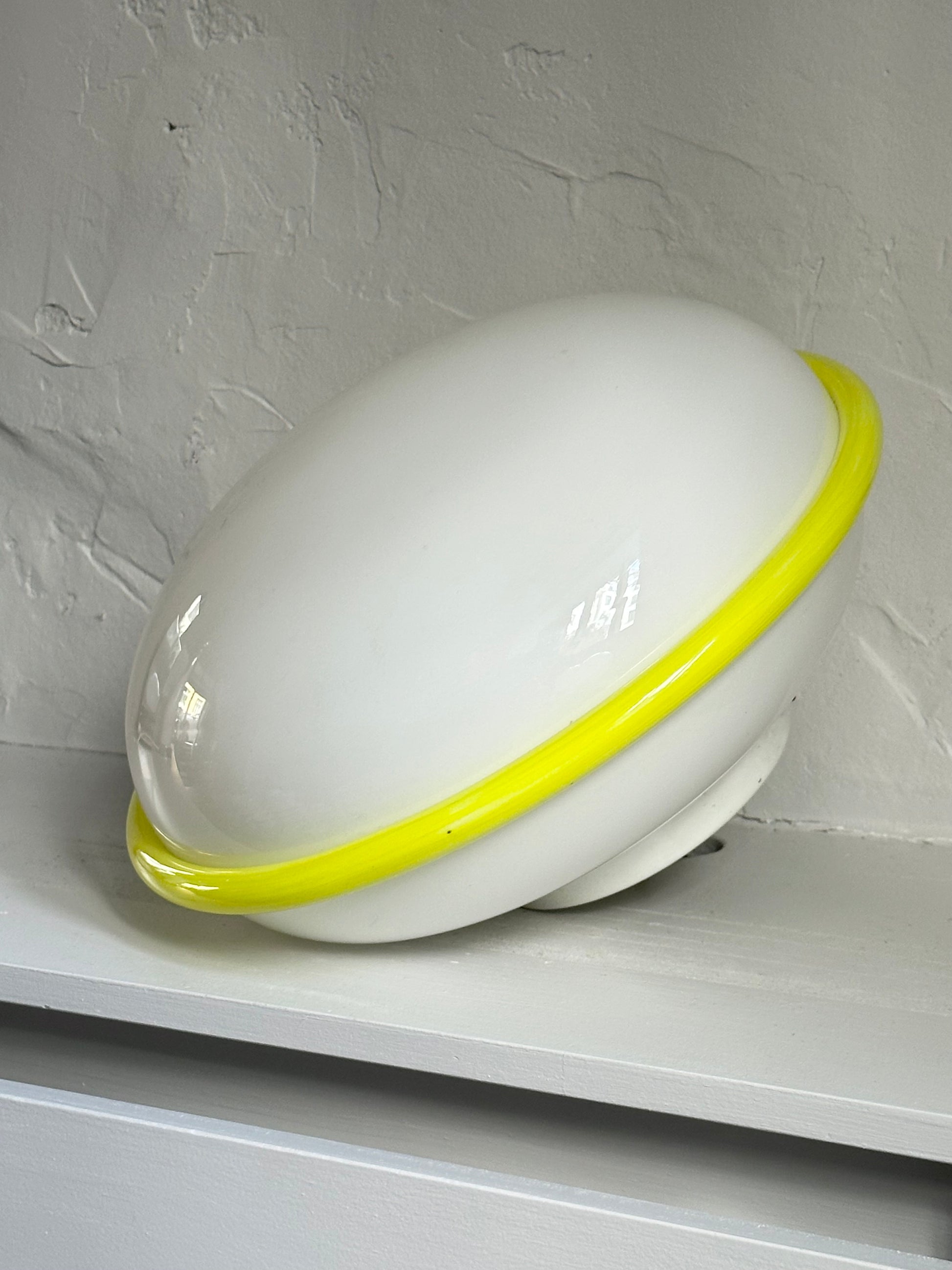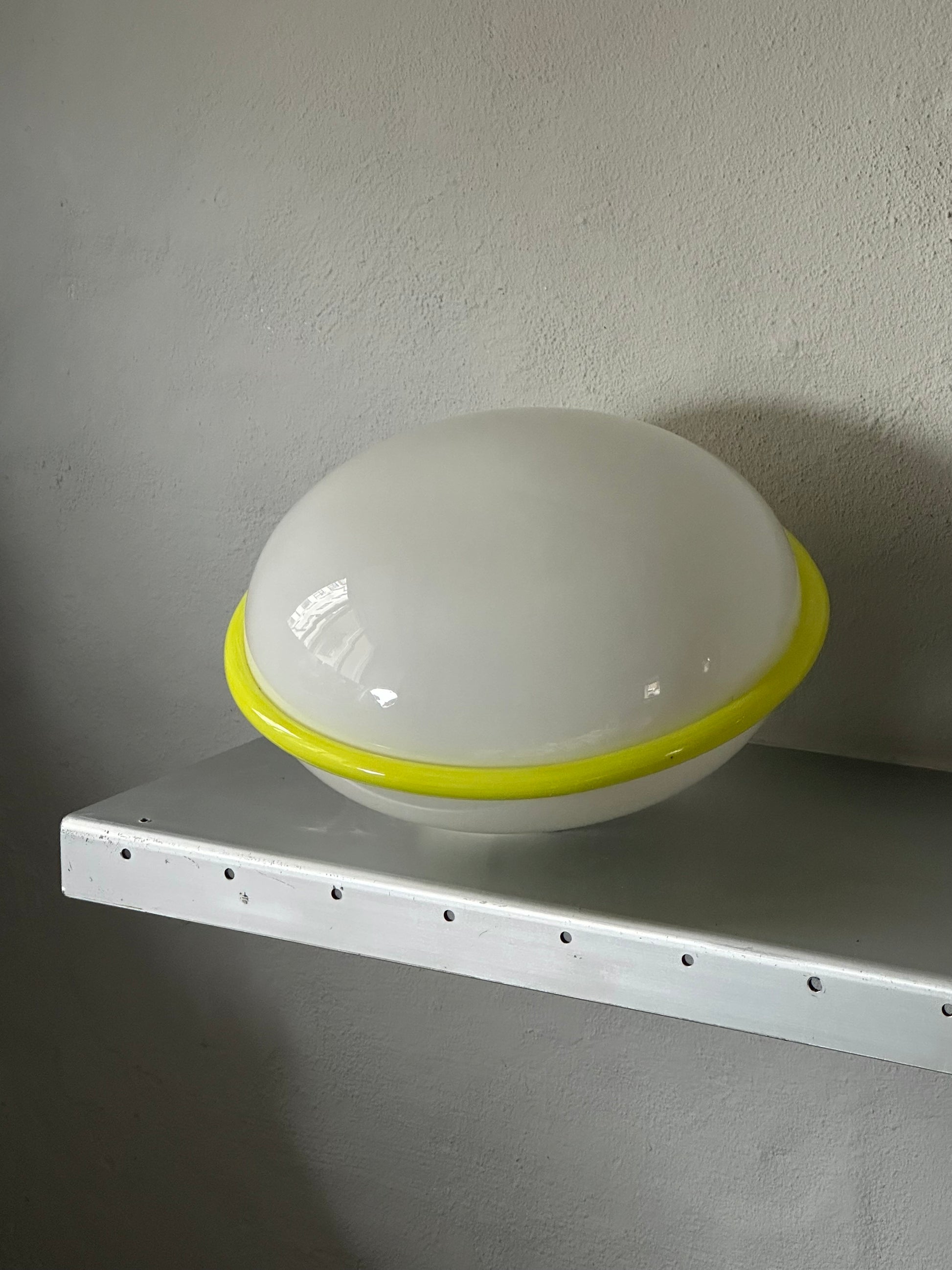 Vintage Murano plafond i hvidt glas med gul stribe. Den har fået ny frisk flettet hvid stof ledning med afbryder og stikprop på så den er lige til at tage i brug. Den kan hænge på både væg og i loft