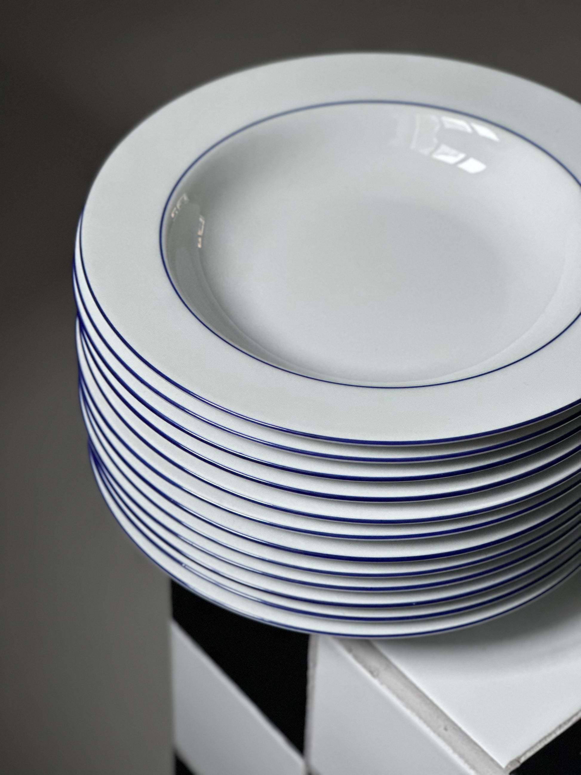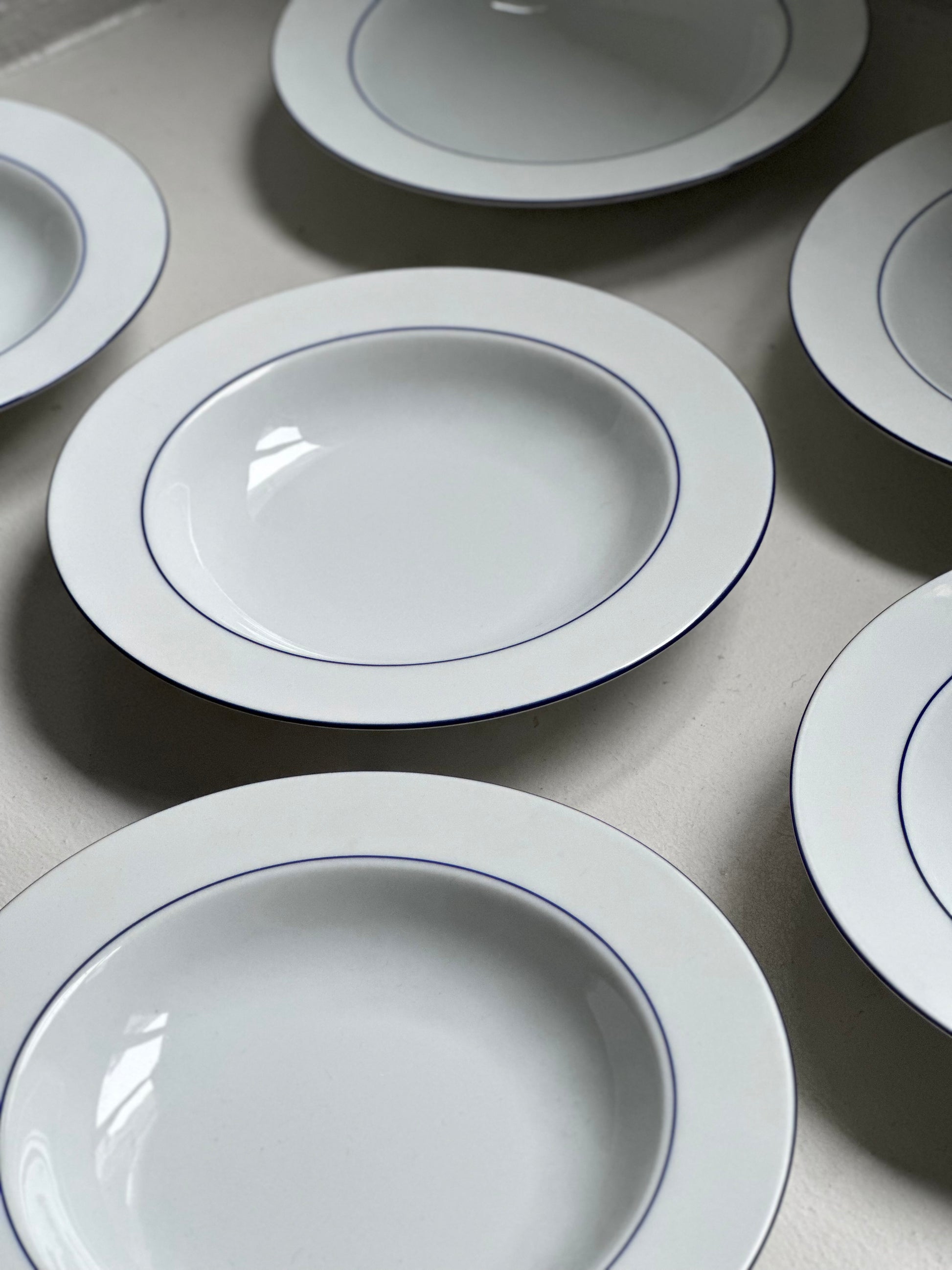 Dybe vintage bistro tallerkener med tynde blå kanter. De er fundet i Italien og er i flot stand uden skår og kun alm lette brugsspor.