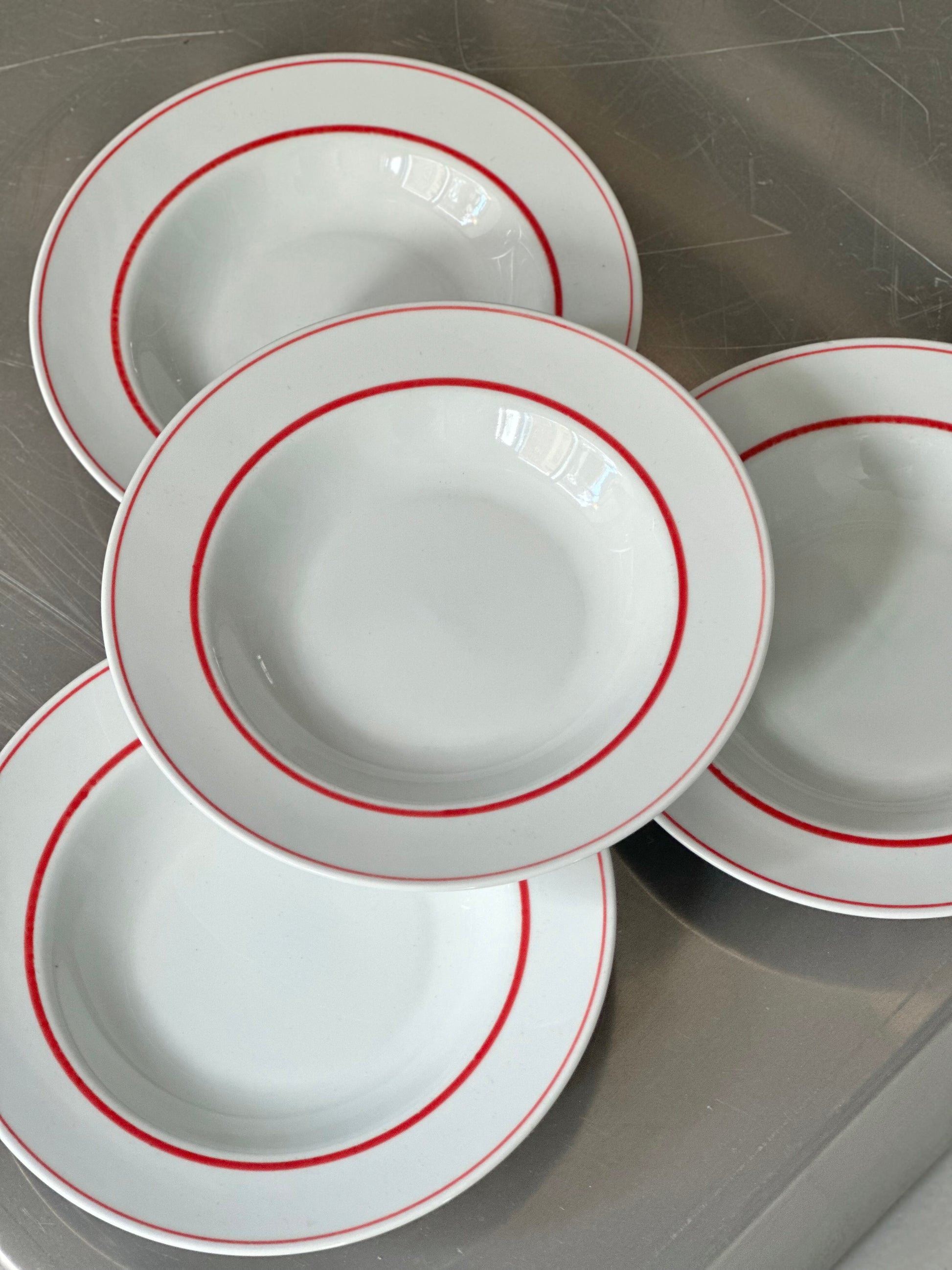 Dybe italienske bistrotallerkener i hvidt porcelæn med røde steg-detaljer. De er alle uden skår og i flot stand med kun alm lette brugsspor.
