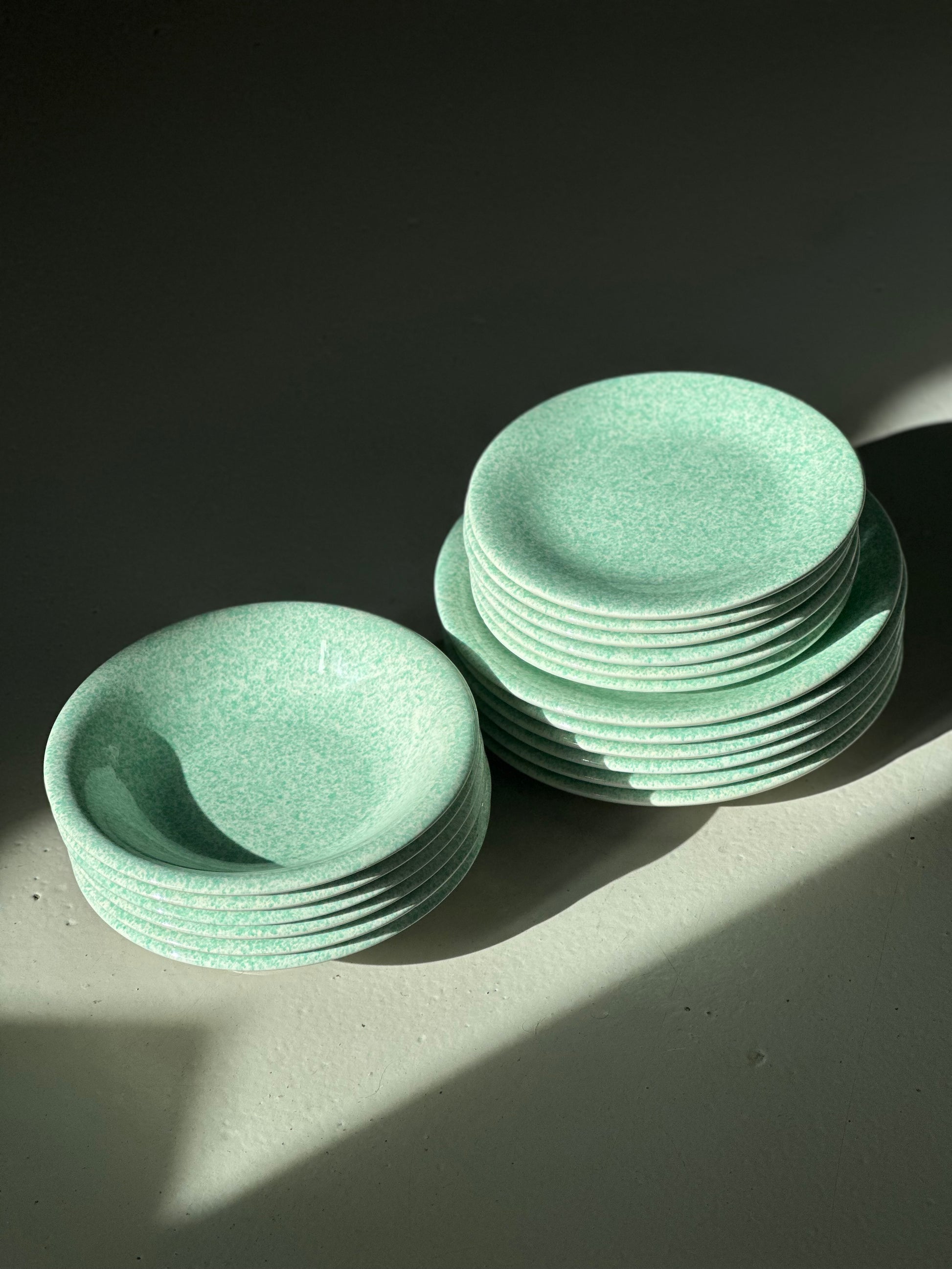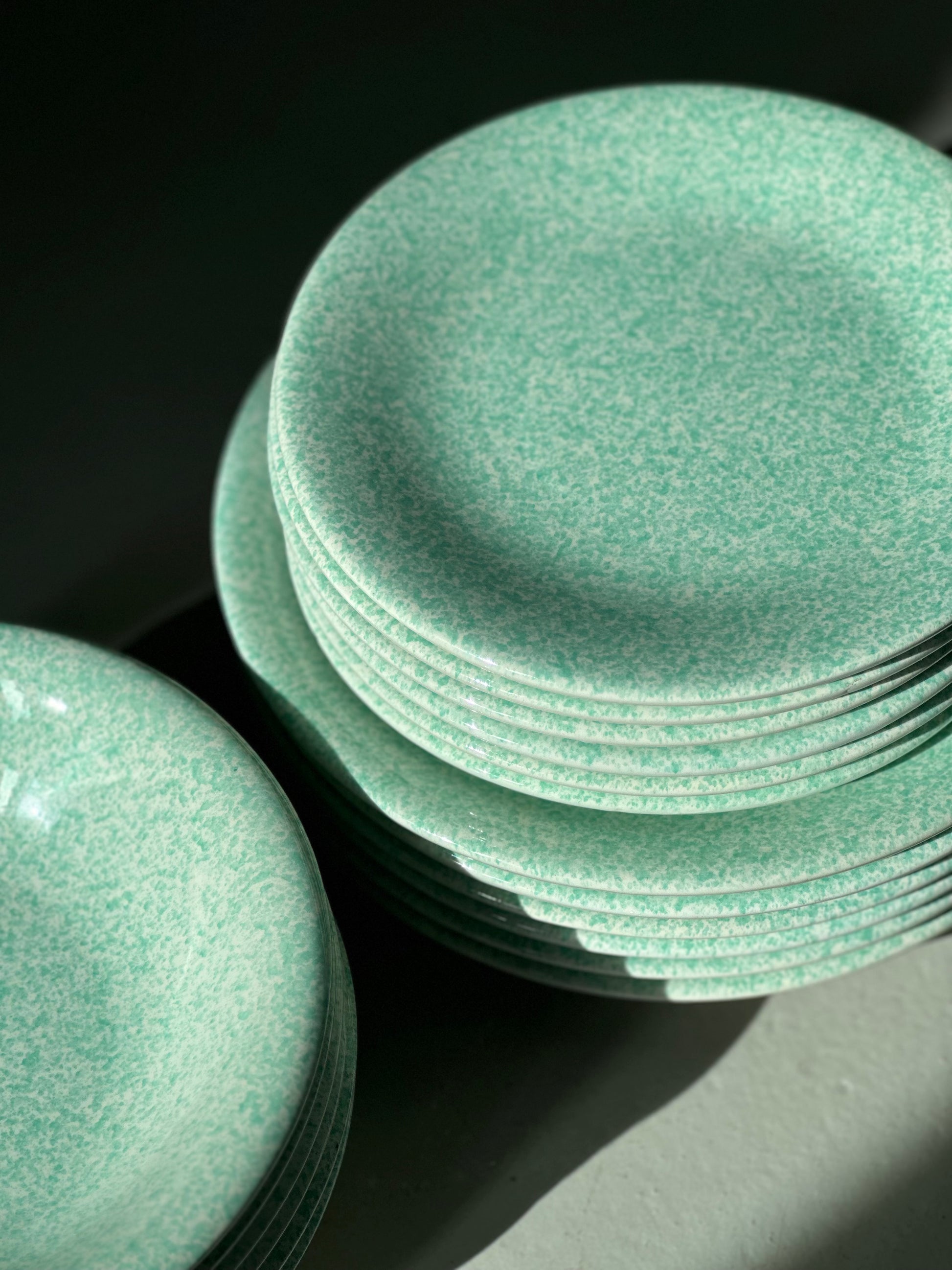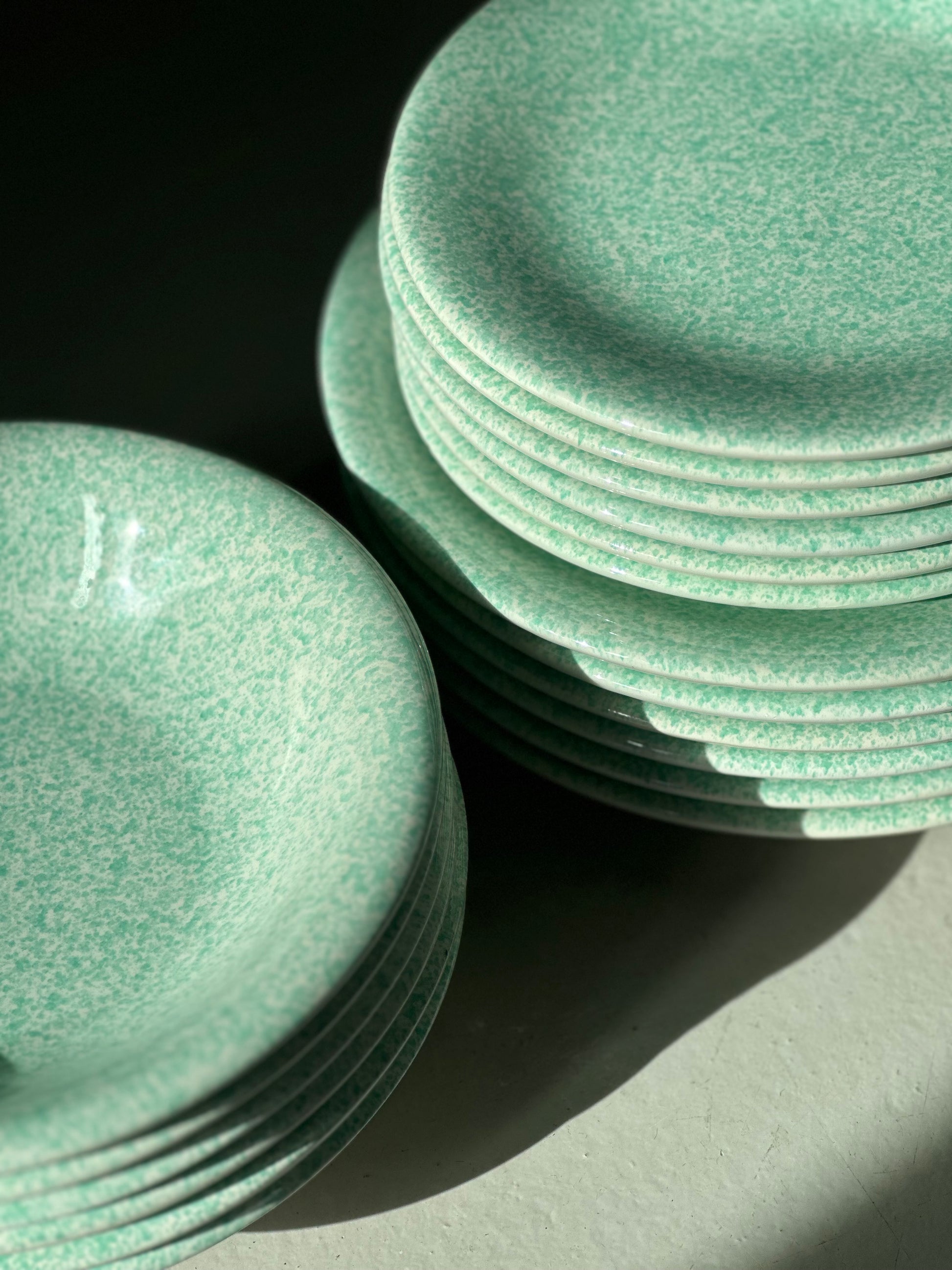 Italienske vintage tallerkener med grøn-nistret glasur. De er fundet i Italien og er alle i flot stand uden skår - kun enkelte små nag på enkelte kanter (de er dog camoufleret genialt pga mønstret).