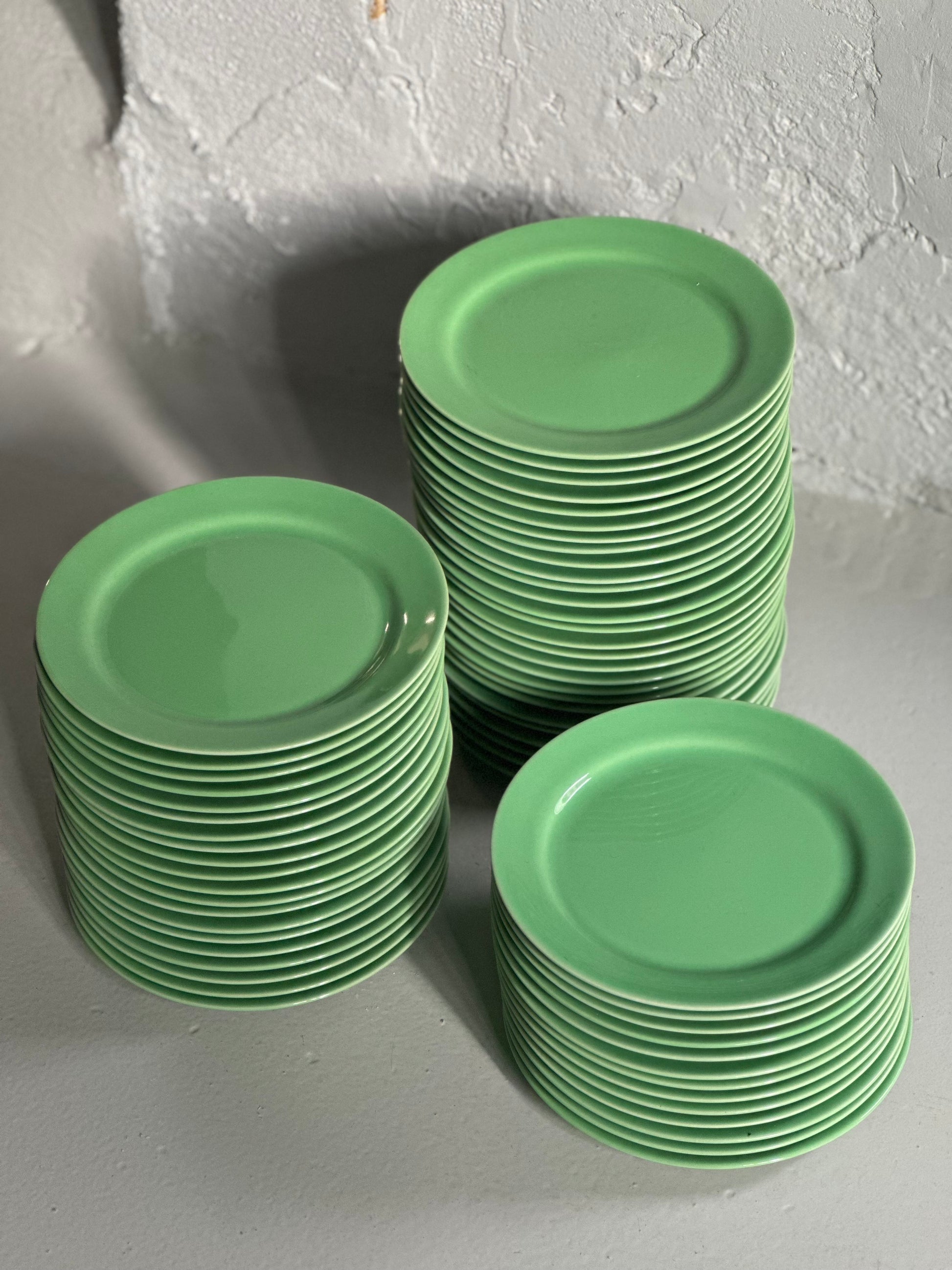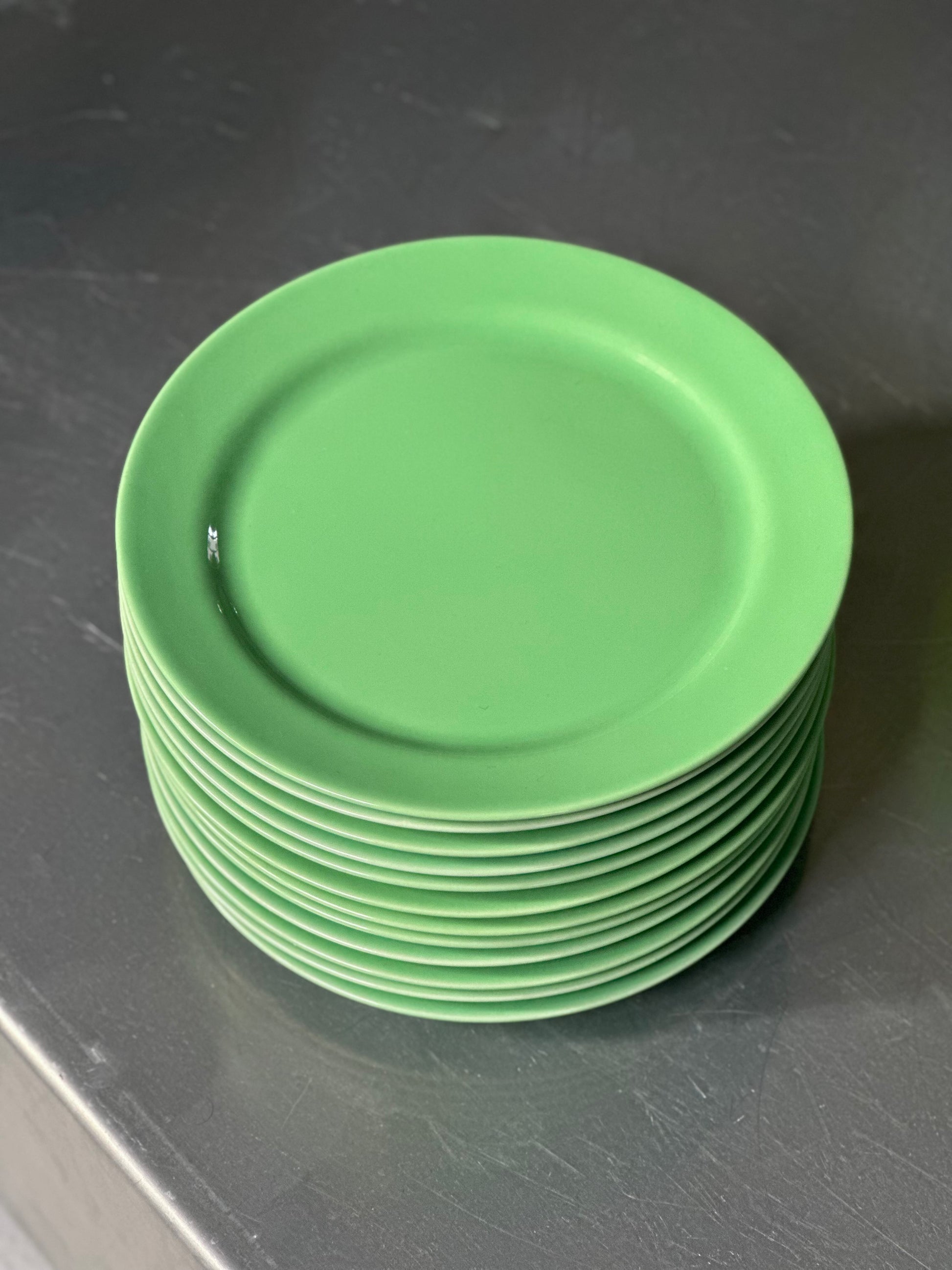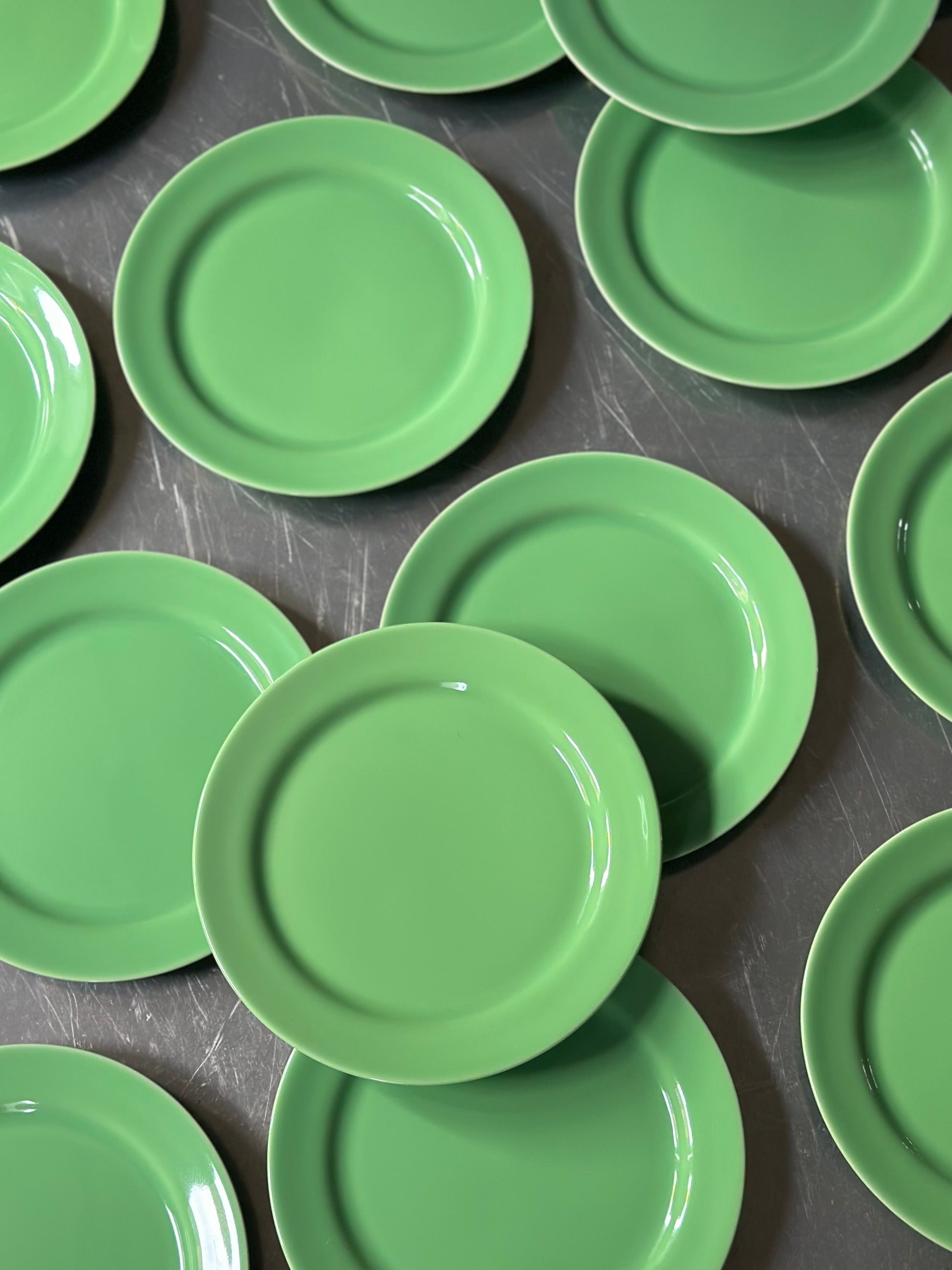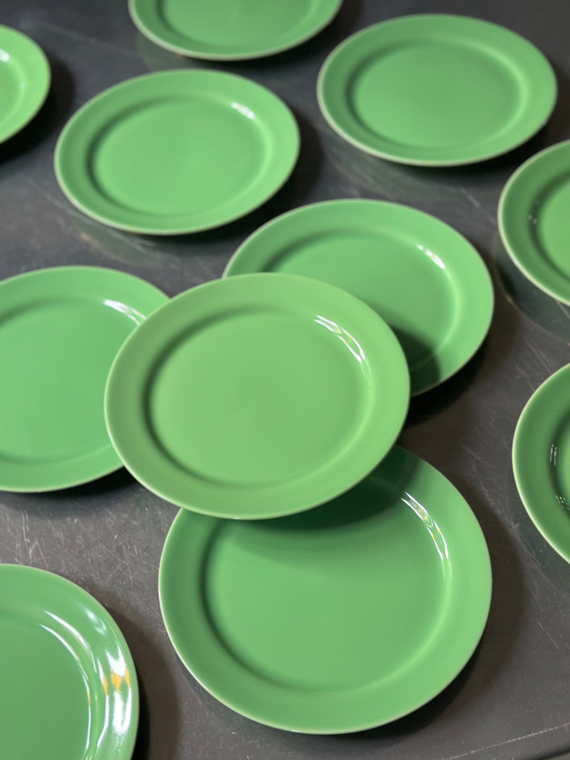 Italiensk vintage tallerkener i porcelæn med grøn glasur. De er fundet i Italien og er alle i vanvittig flot stand uden skår.