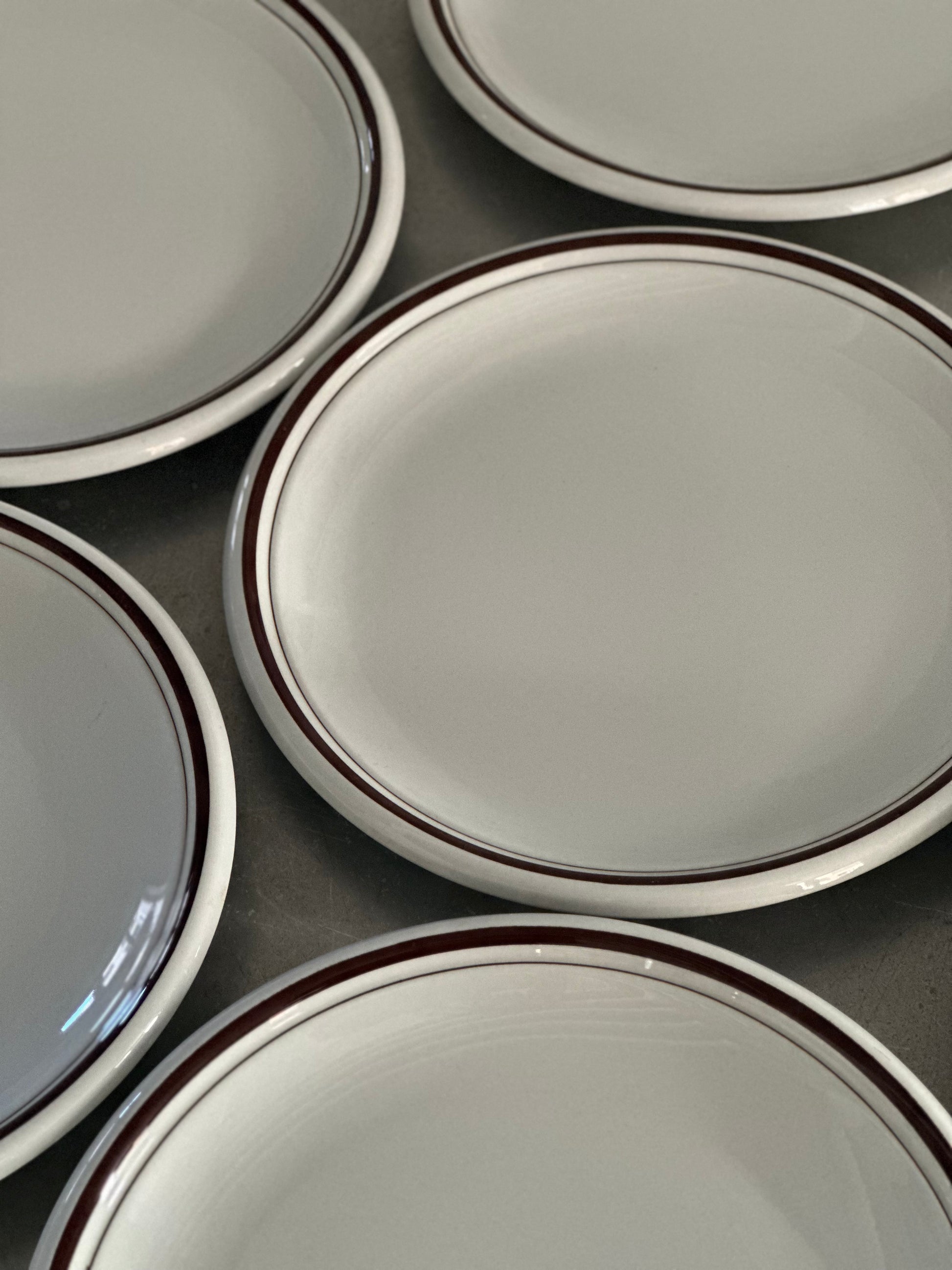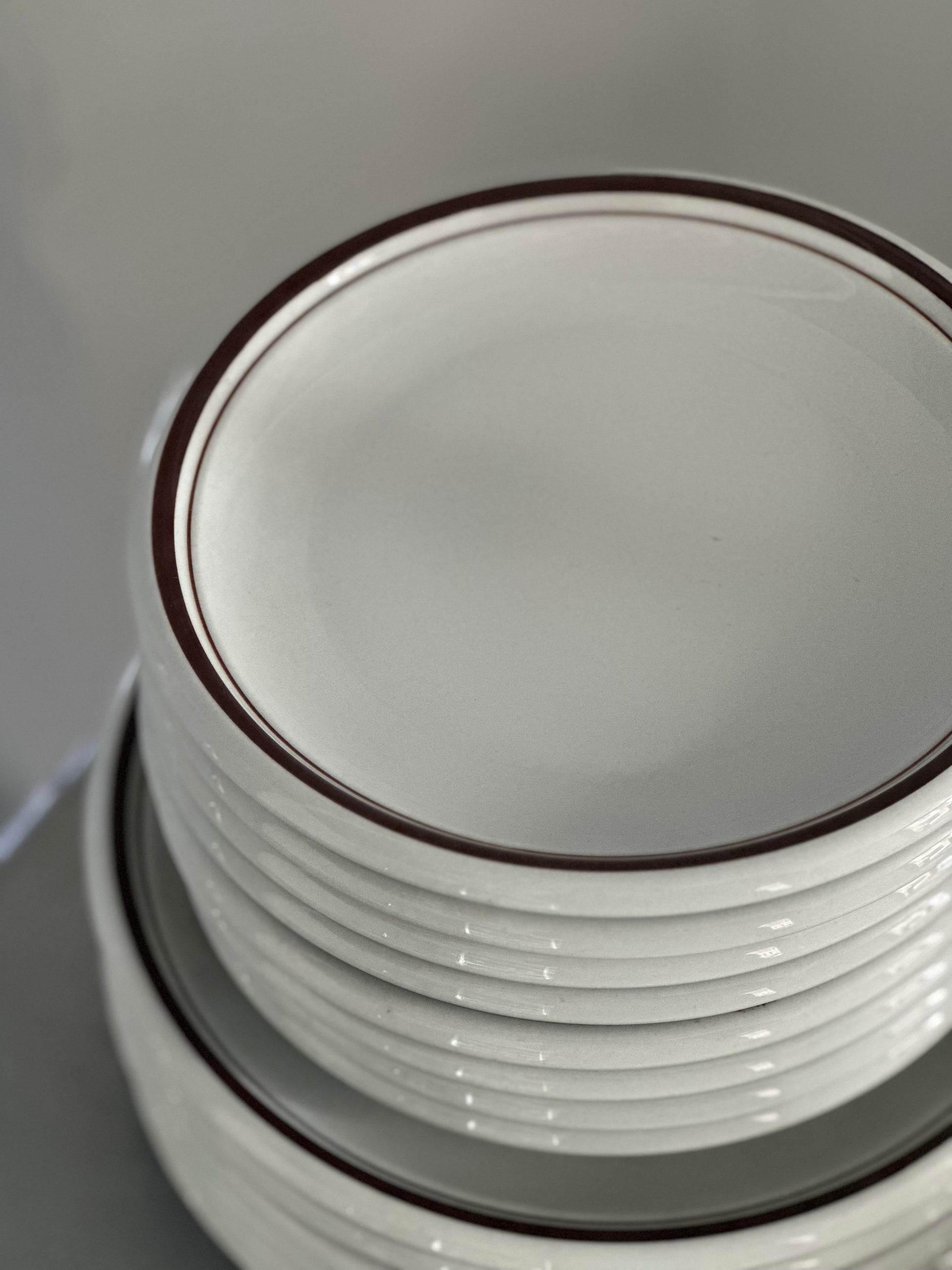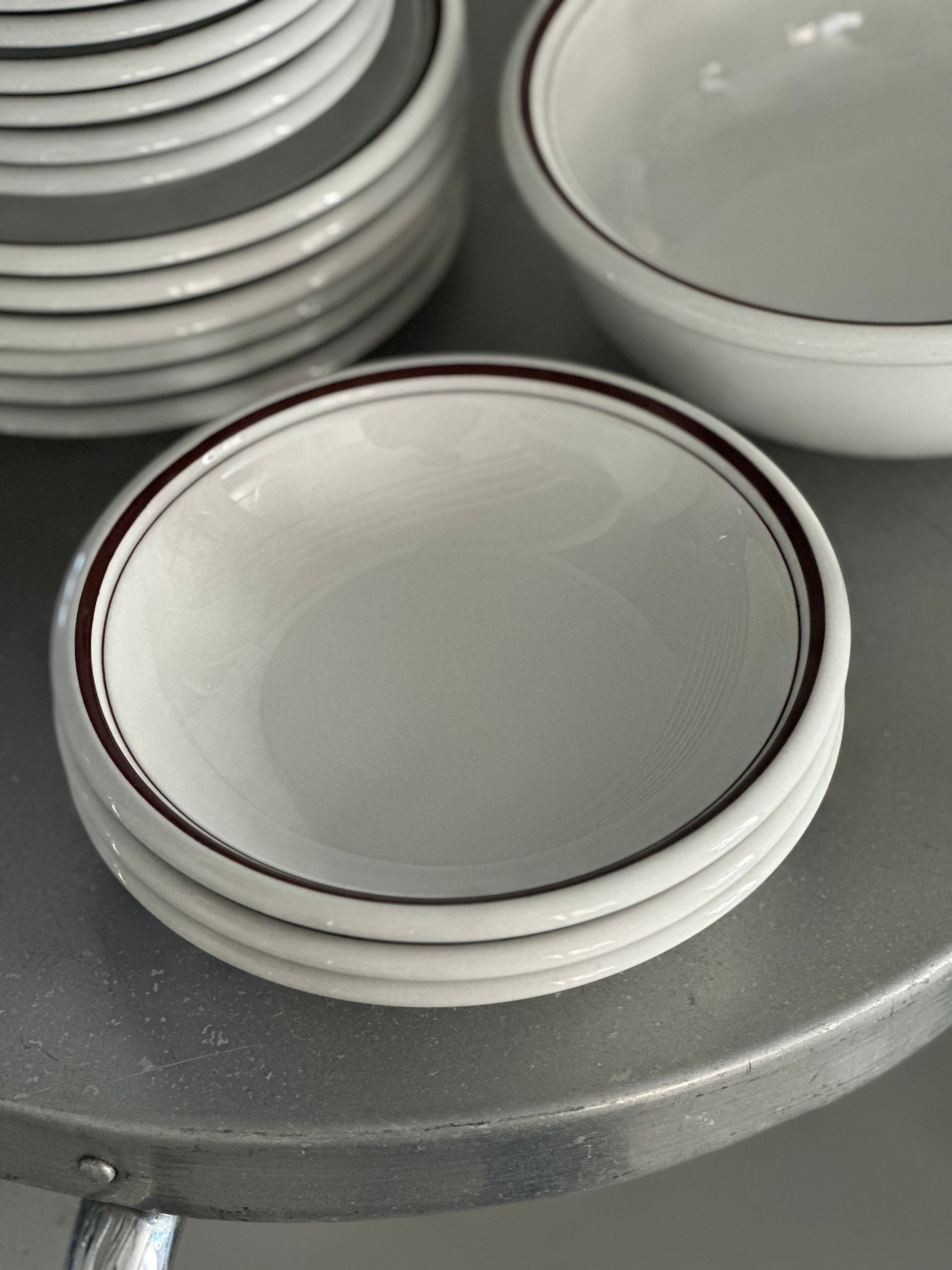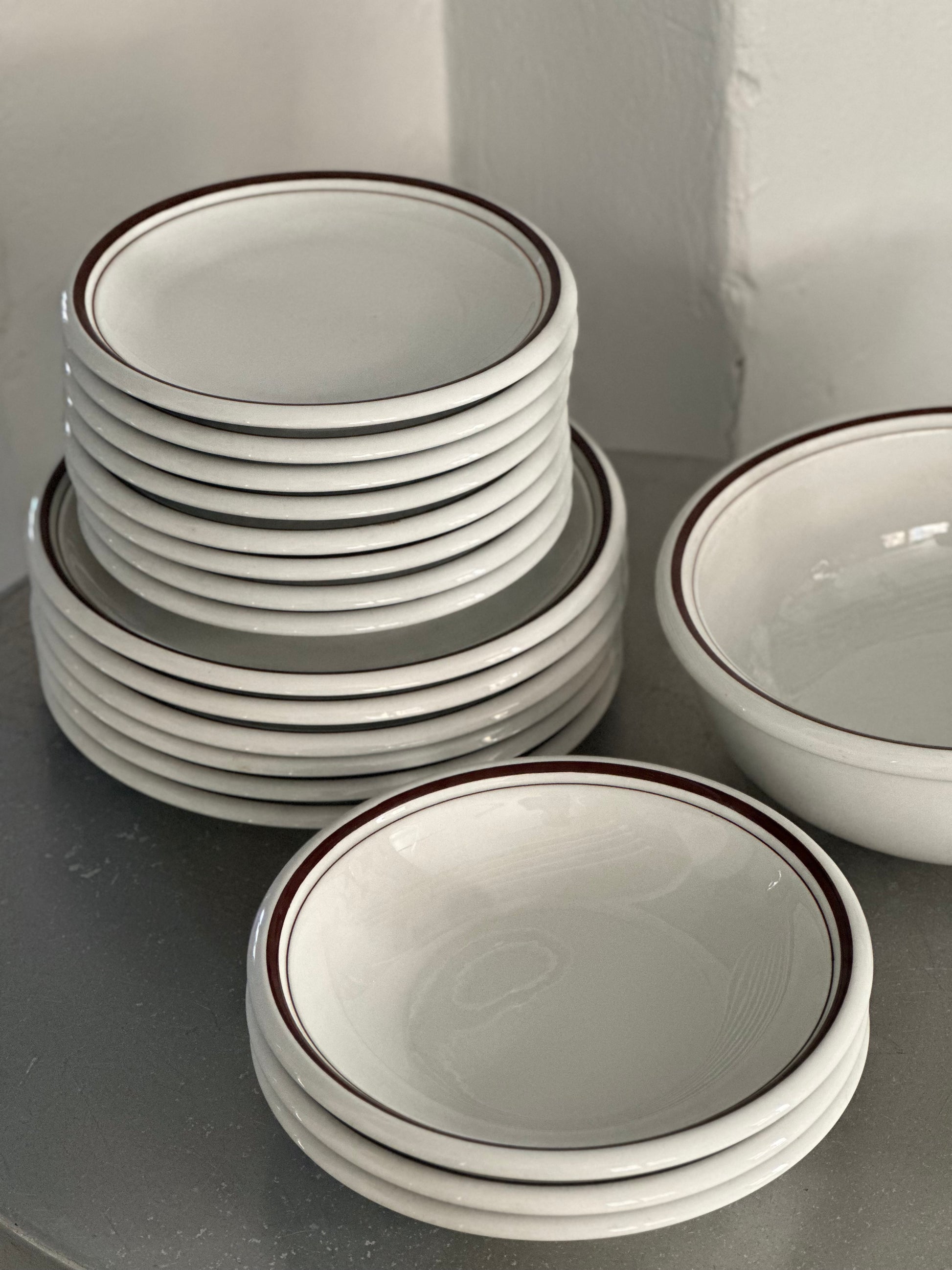 Italiensk vintage bistro stel med hvid glasur og brune kanter. Stellet er fundet i Italien og alle delene er i super flot stand uden skår.