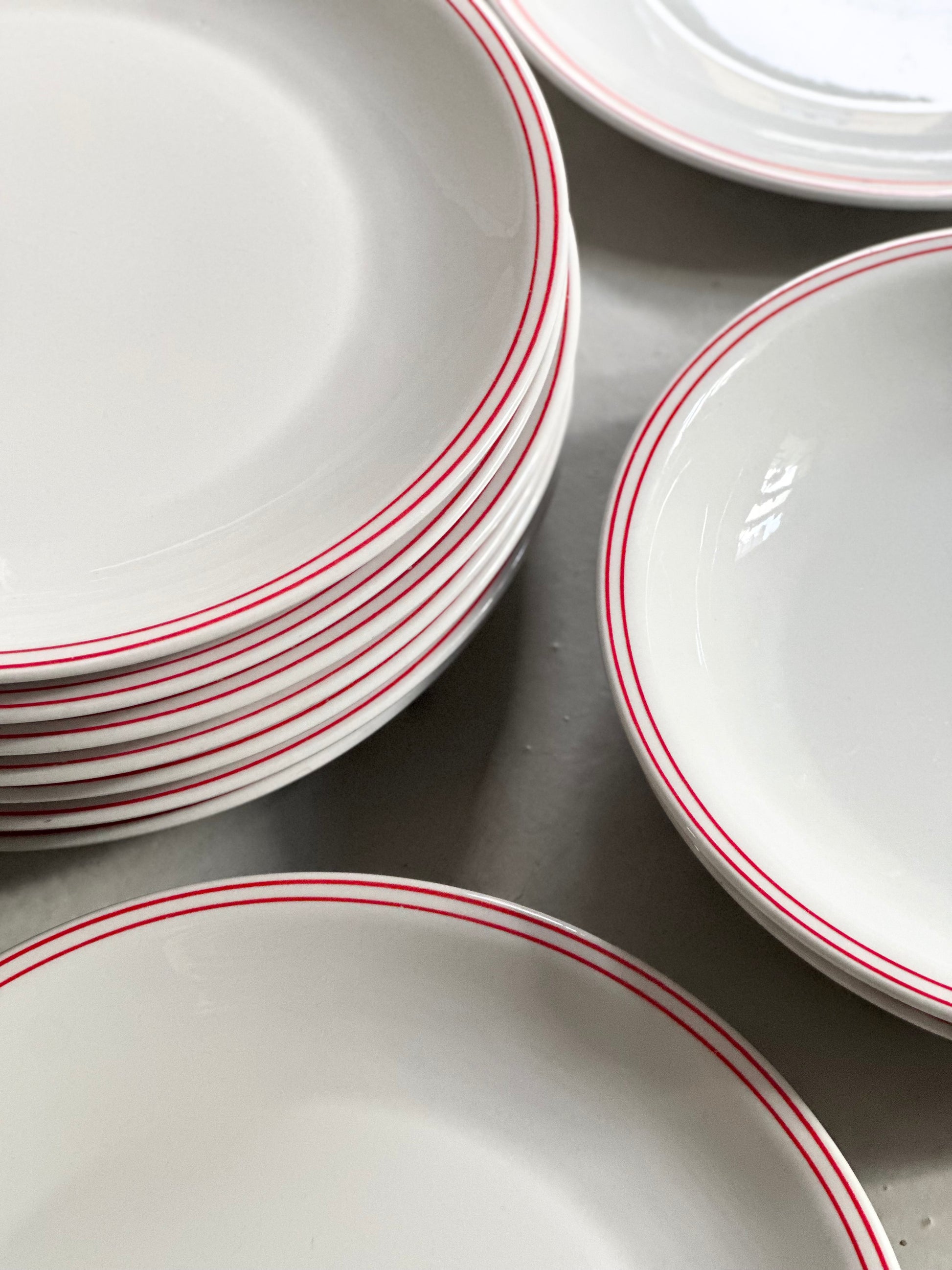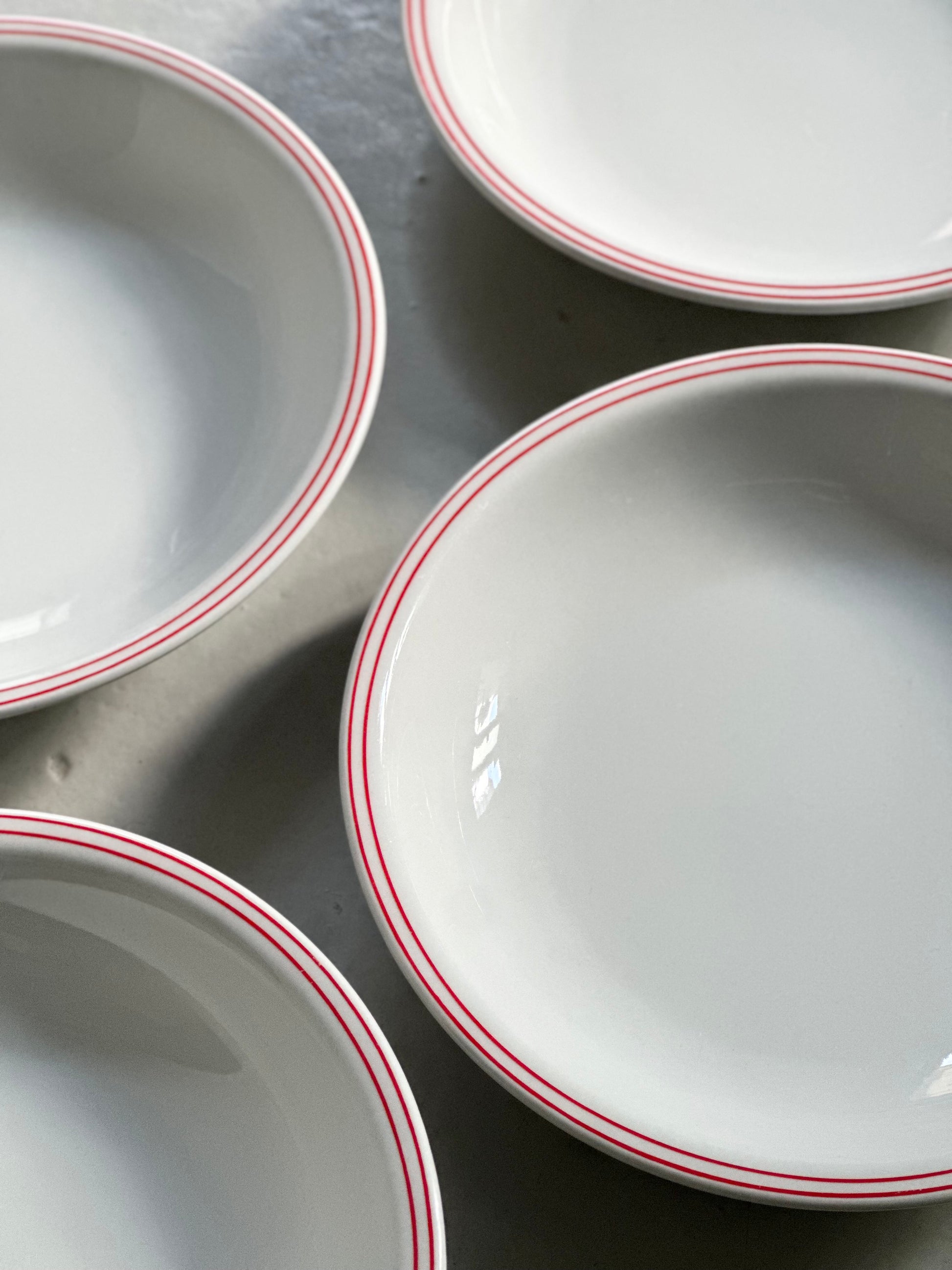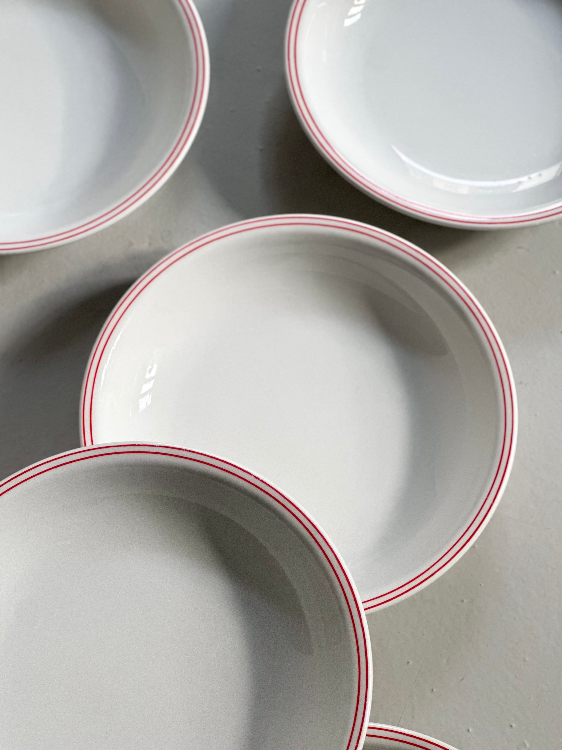 Italiensk vintage bistro tallerkener og skåle i hvidt porclæn med tynde røde dobbelt kanter. De er fundet i Italien og er alle i flot stand uden skår og kun alm lette brugsspor.