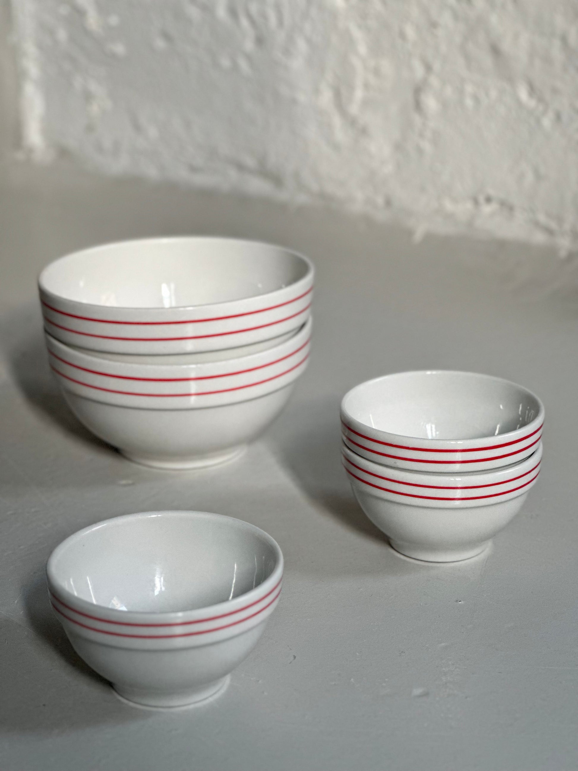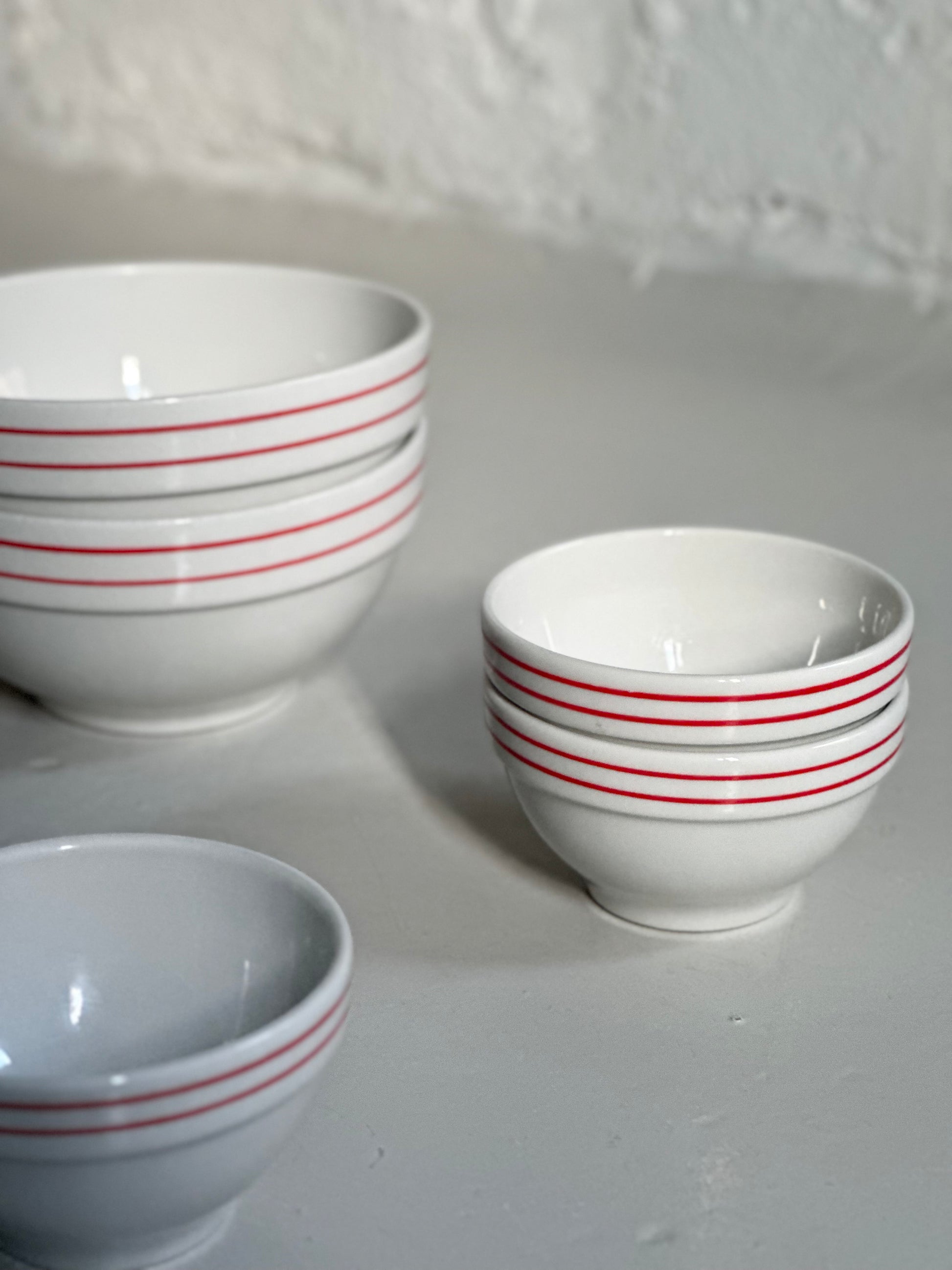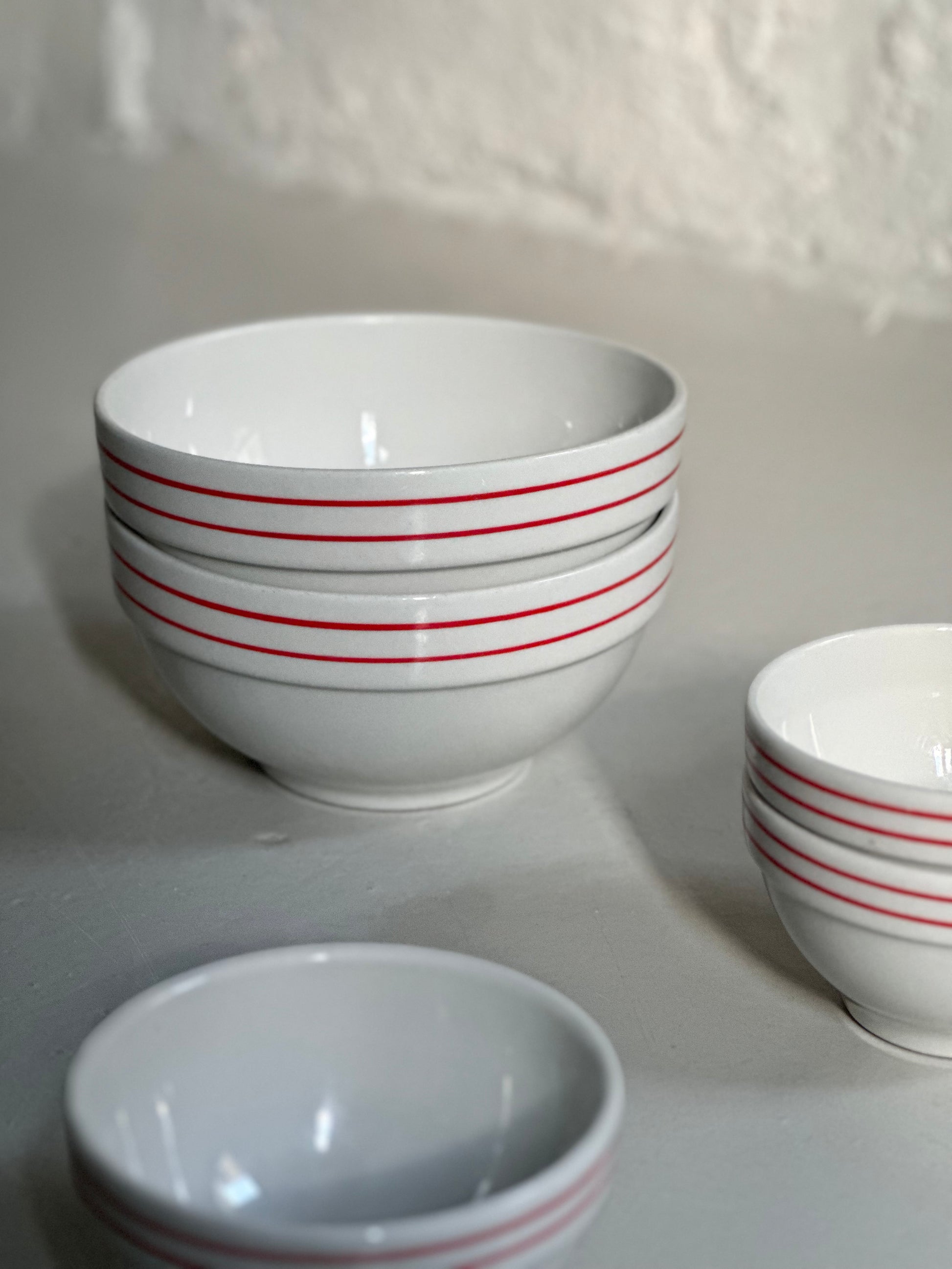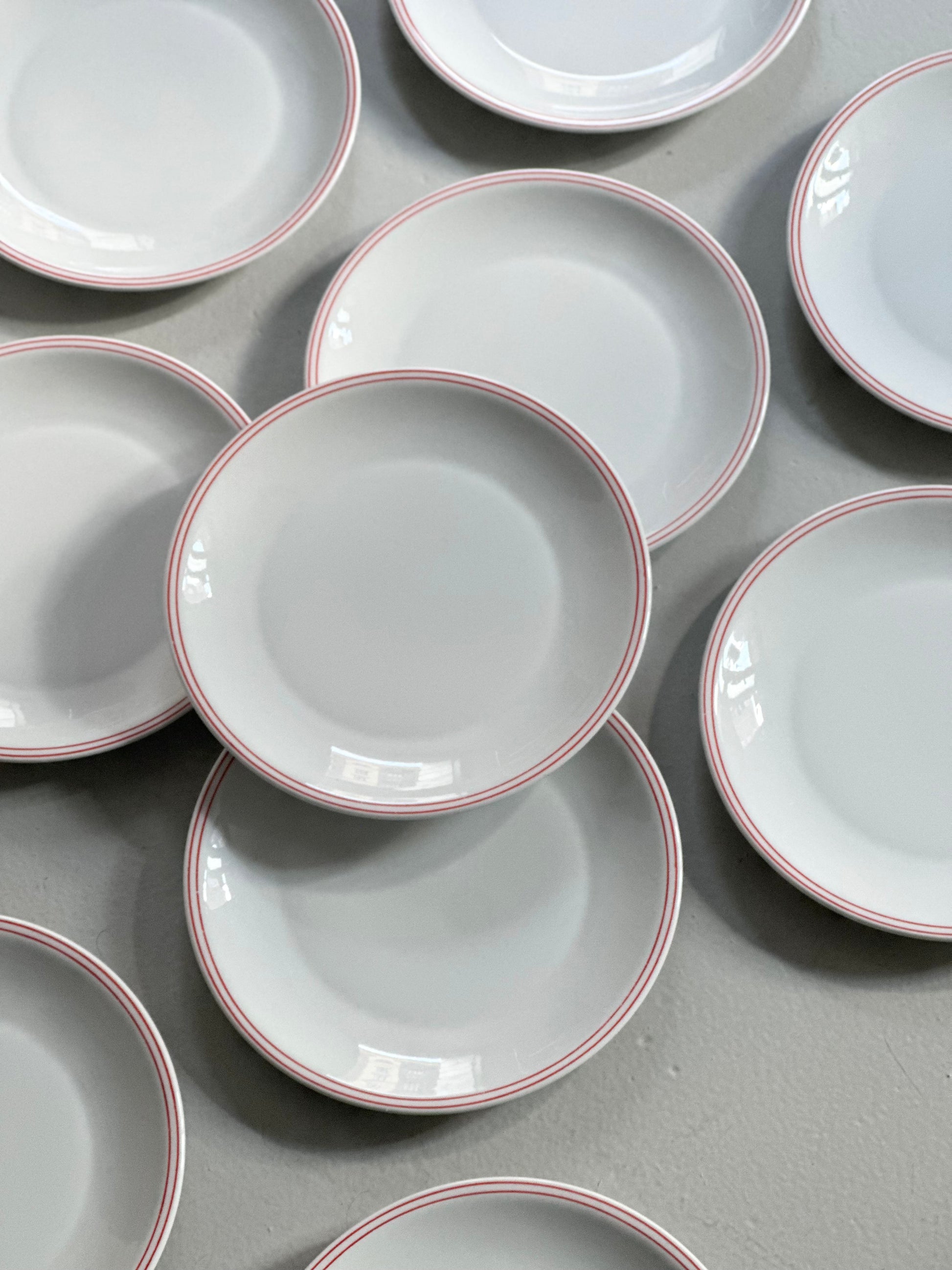 Italiensk vintage bistro tallerkener og skåle i hvidt porclæn med tynde røde dobbelt kanter. De er fundet i Italien og er alle i flot stand uden skår og kun alm lette brugsspor.