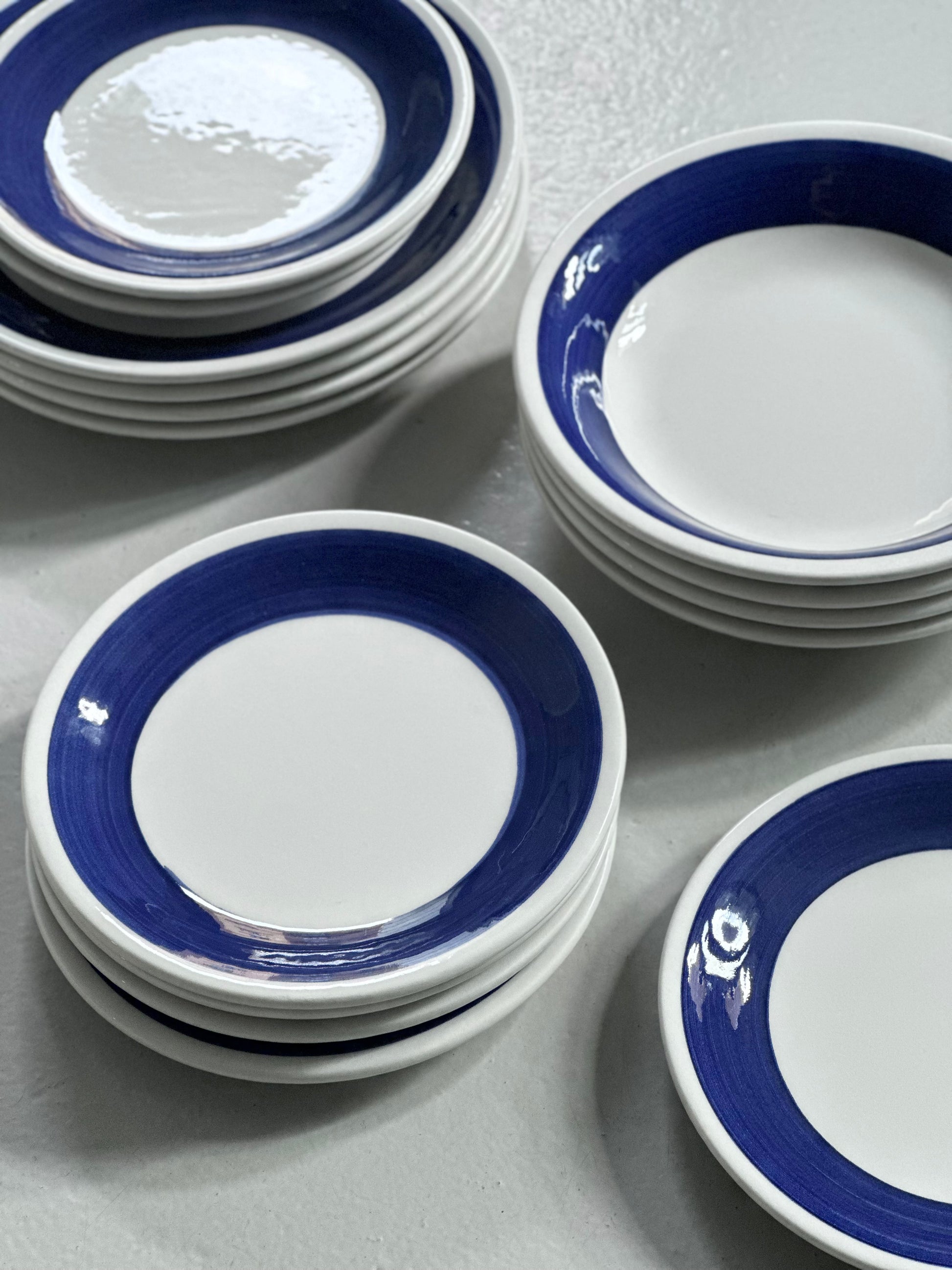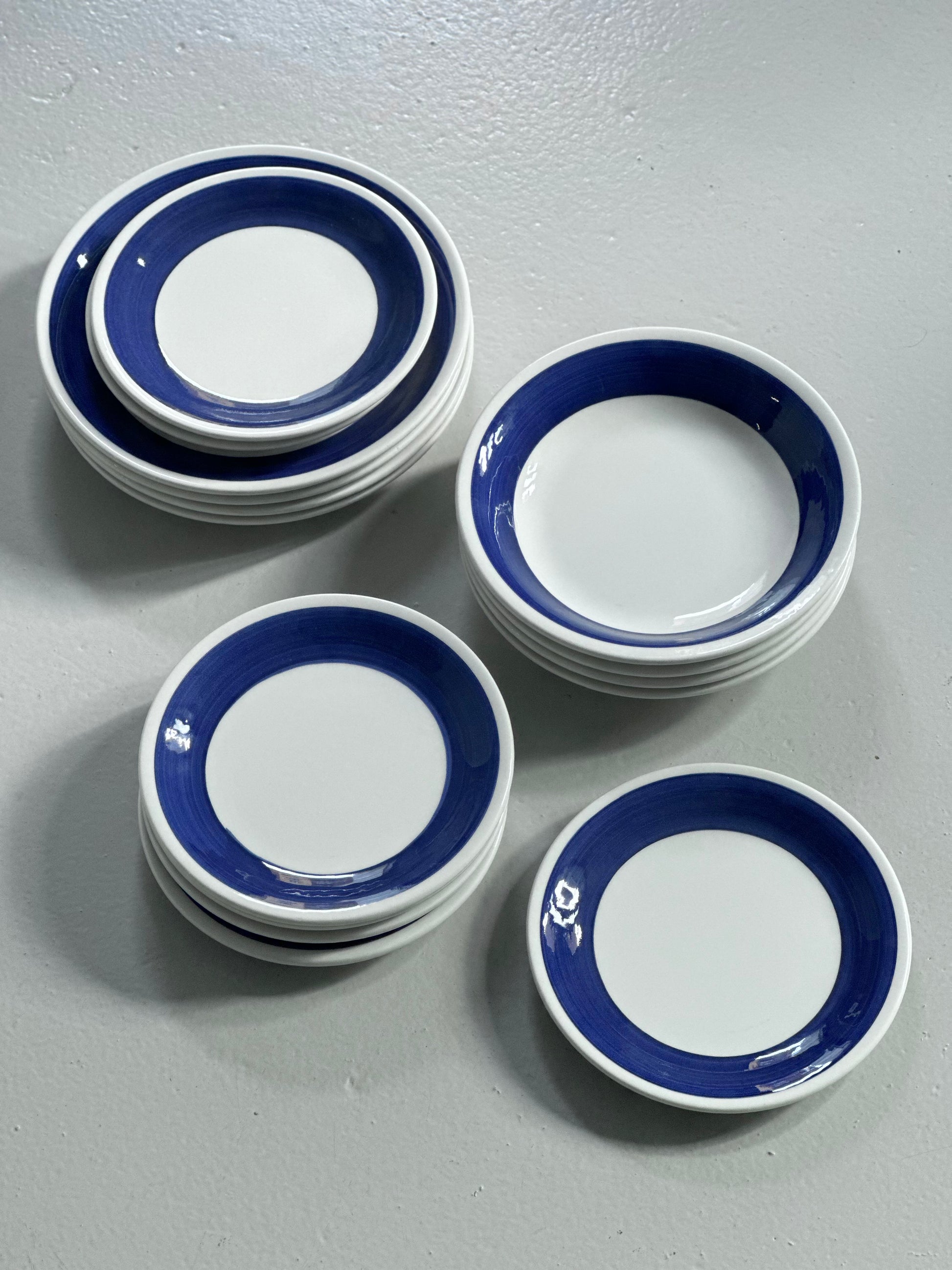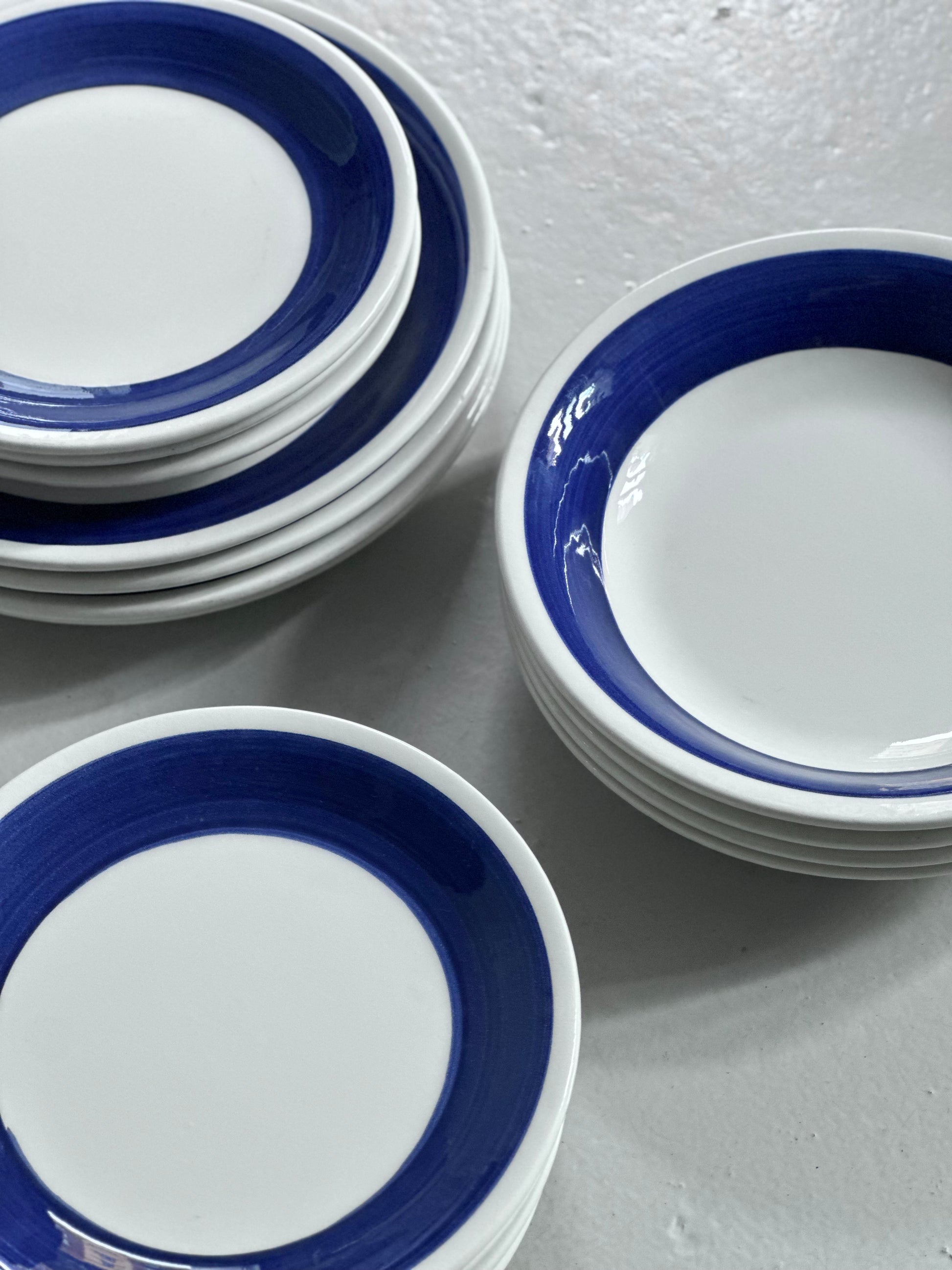 Italiensk vintage bistro stel i hvidt porclæn med tyk blå kant. De er fundet i Italien og er alle i flot stand uden skår og med kun alm lette brugsspor.
