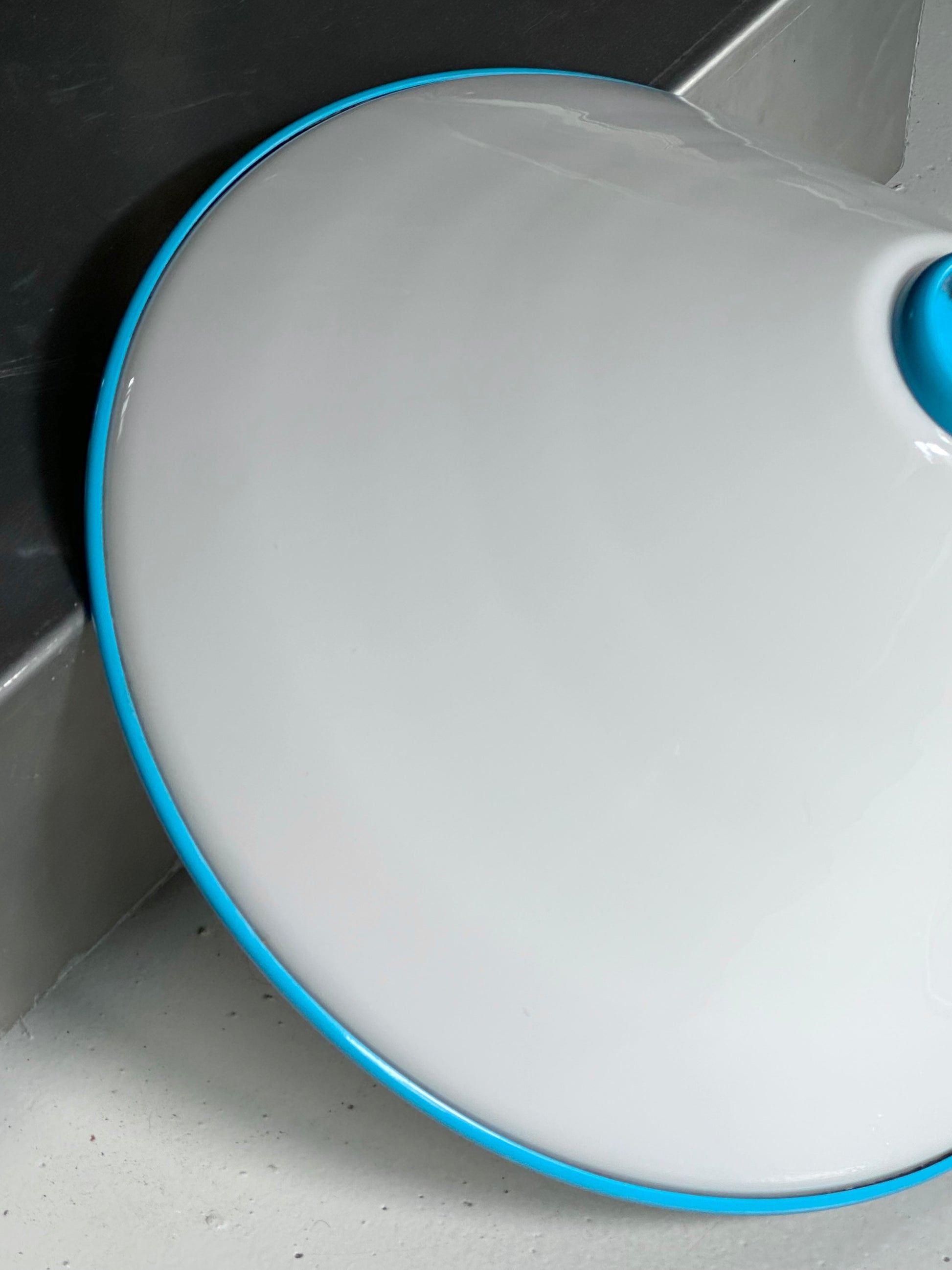 Italiensk vintage lampe i hvidt glas med kant, ophæng og roset i lyseblåt lakeret metal (den original lakering). Den har fået ny wire til højdejustering samt ny frisk ledning. Den er i fantastisk flot stand uden skår og med kun alm meget lette brugsspor.