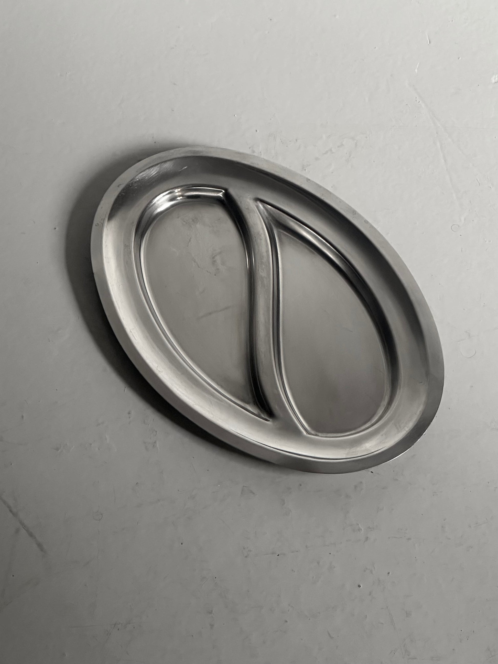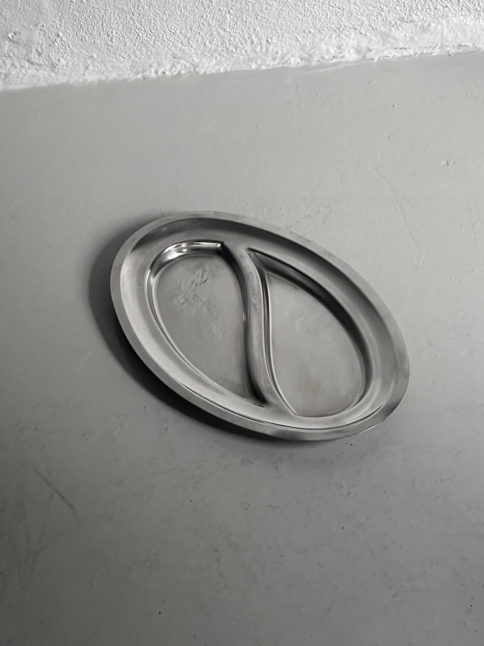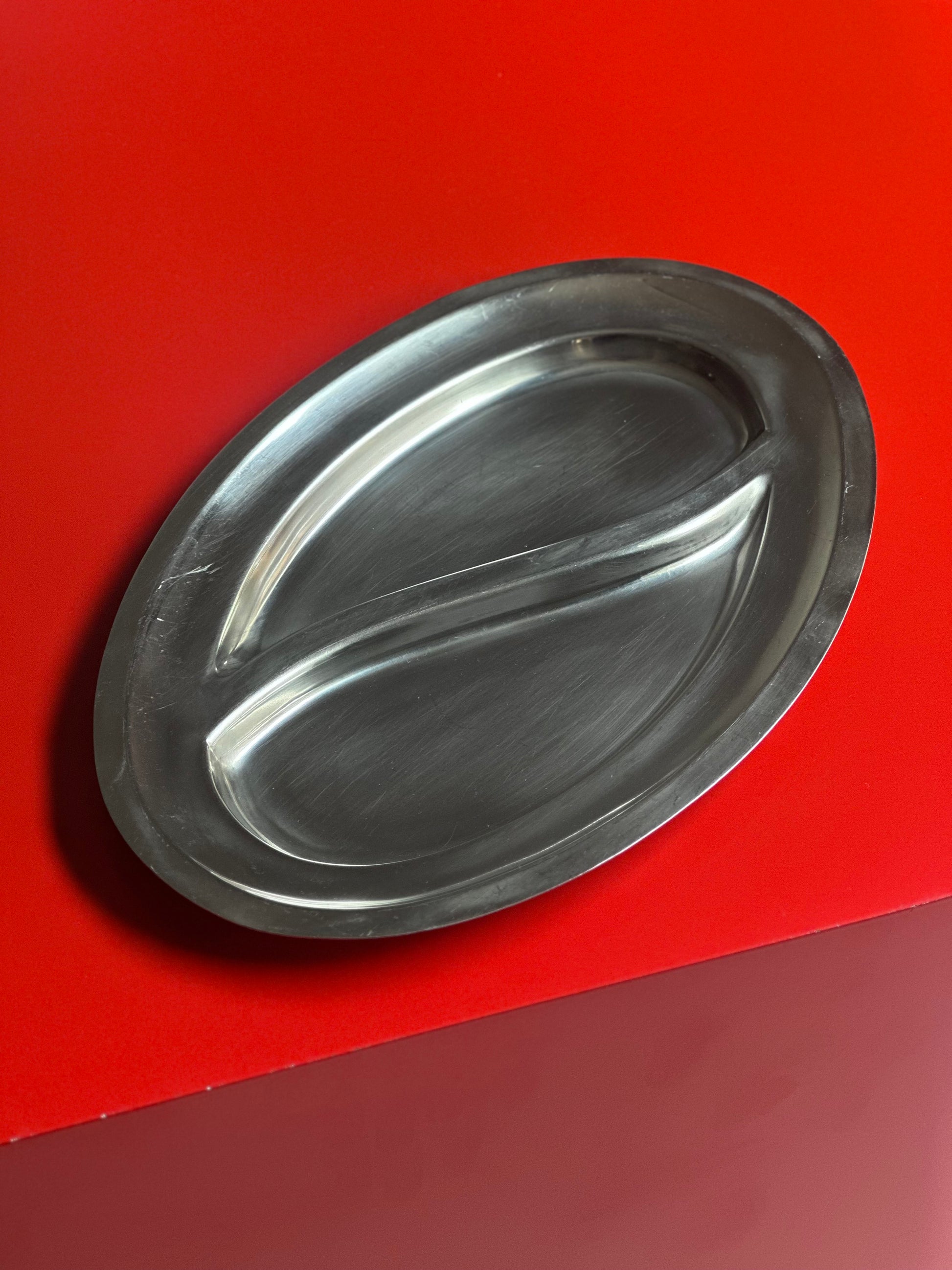 Ovalt italiensk vintage stålfad med 2 swirly rum. Det er i flot stand med alm lette brugsspor.