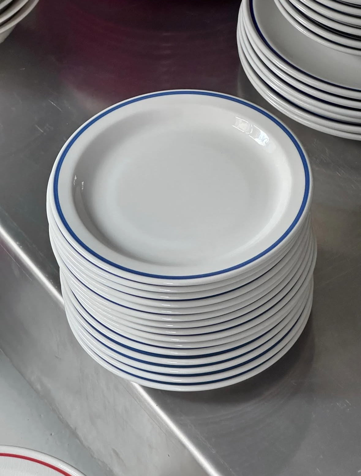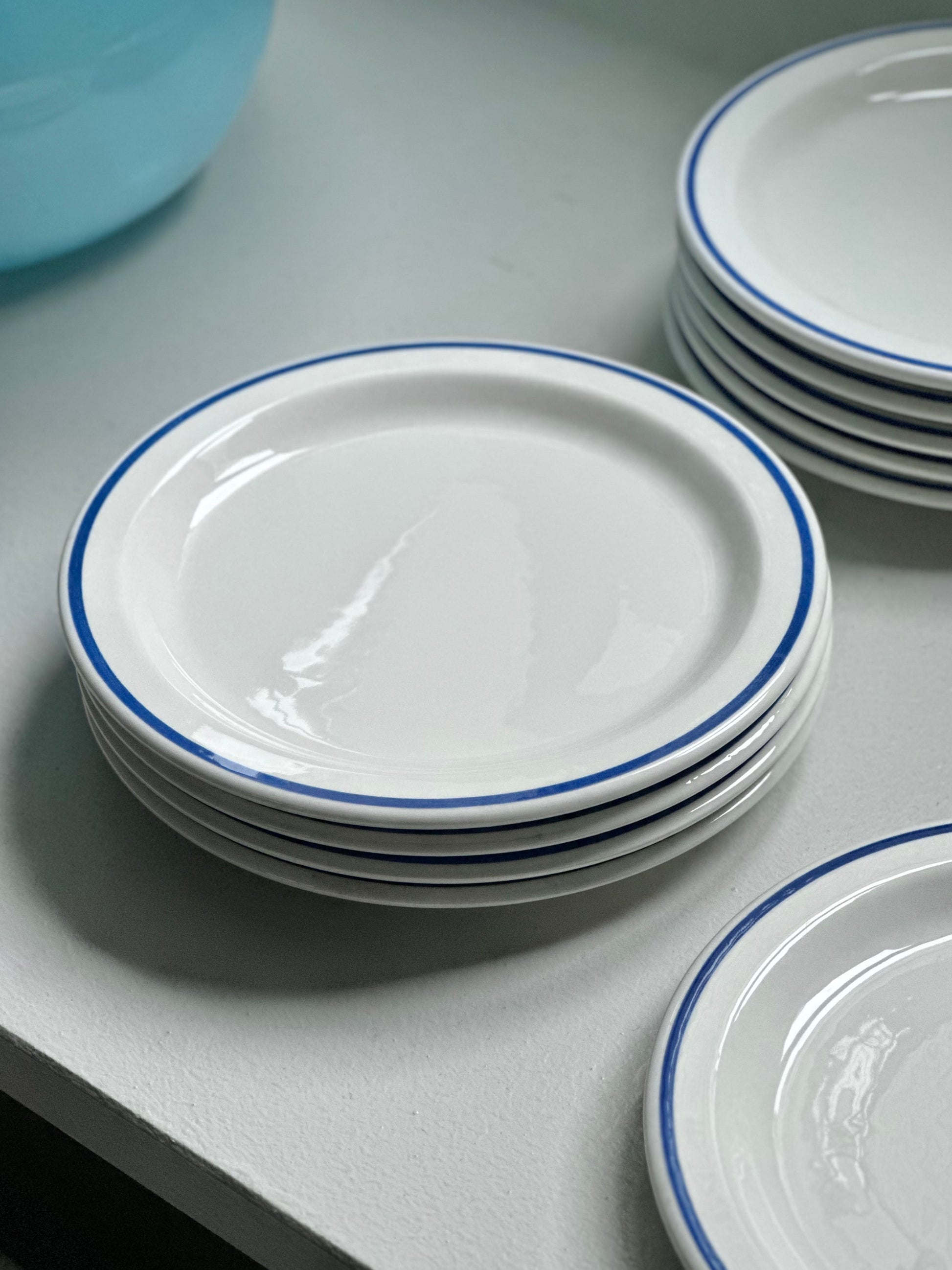 Italienske vintage bistro frokost tallerkener med blå kant. De er fundet i Italien og er alle i super flot stand uden skår.