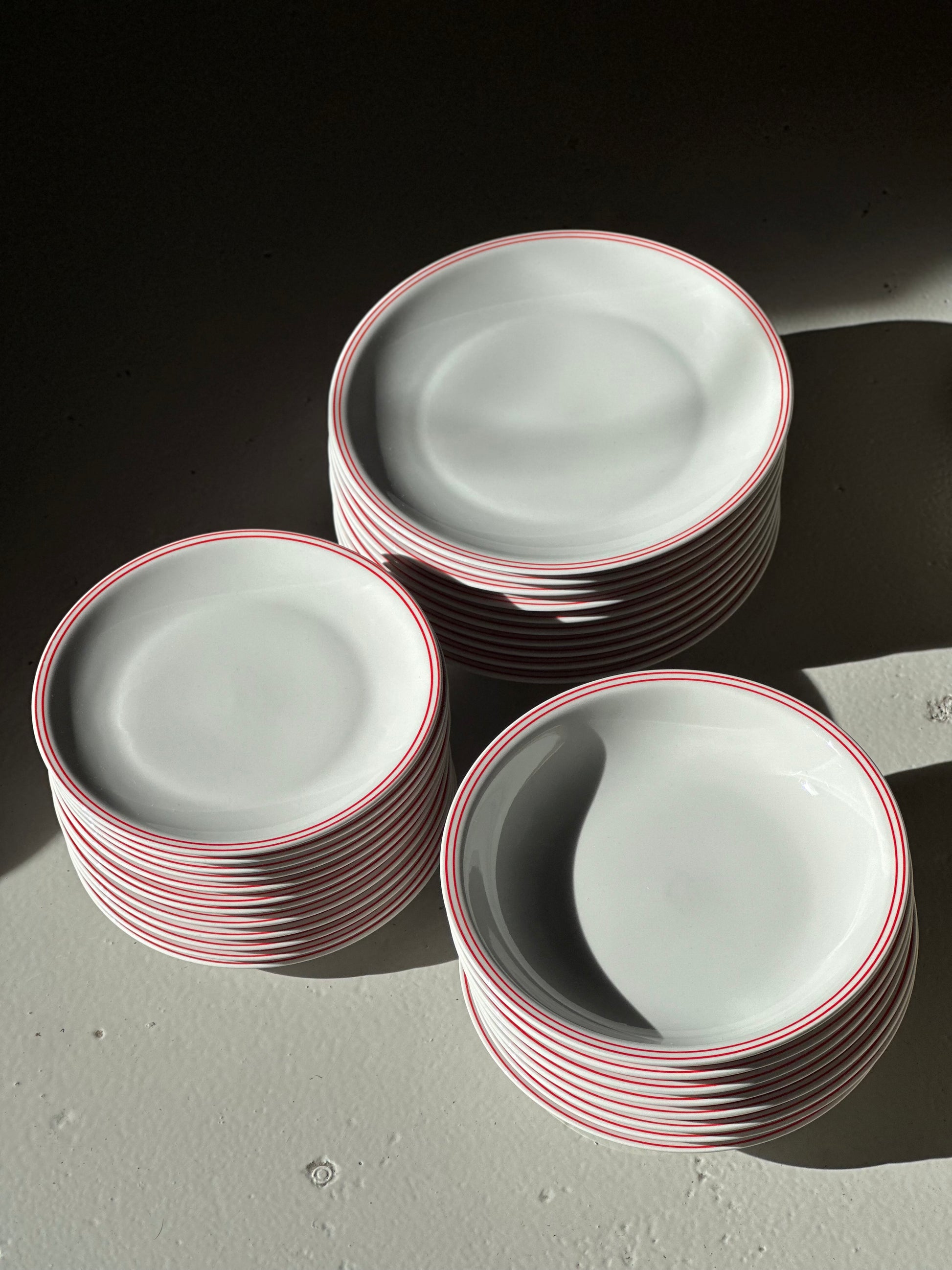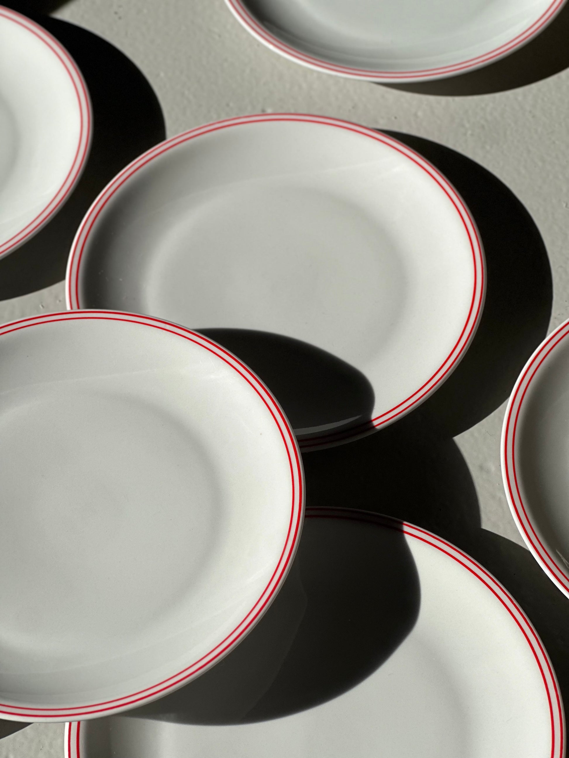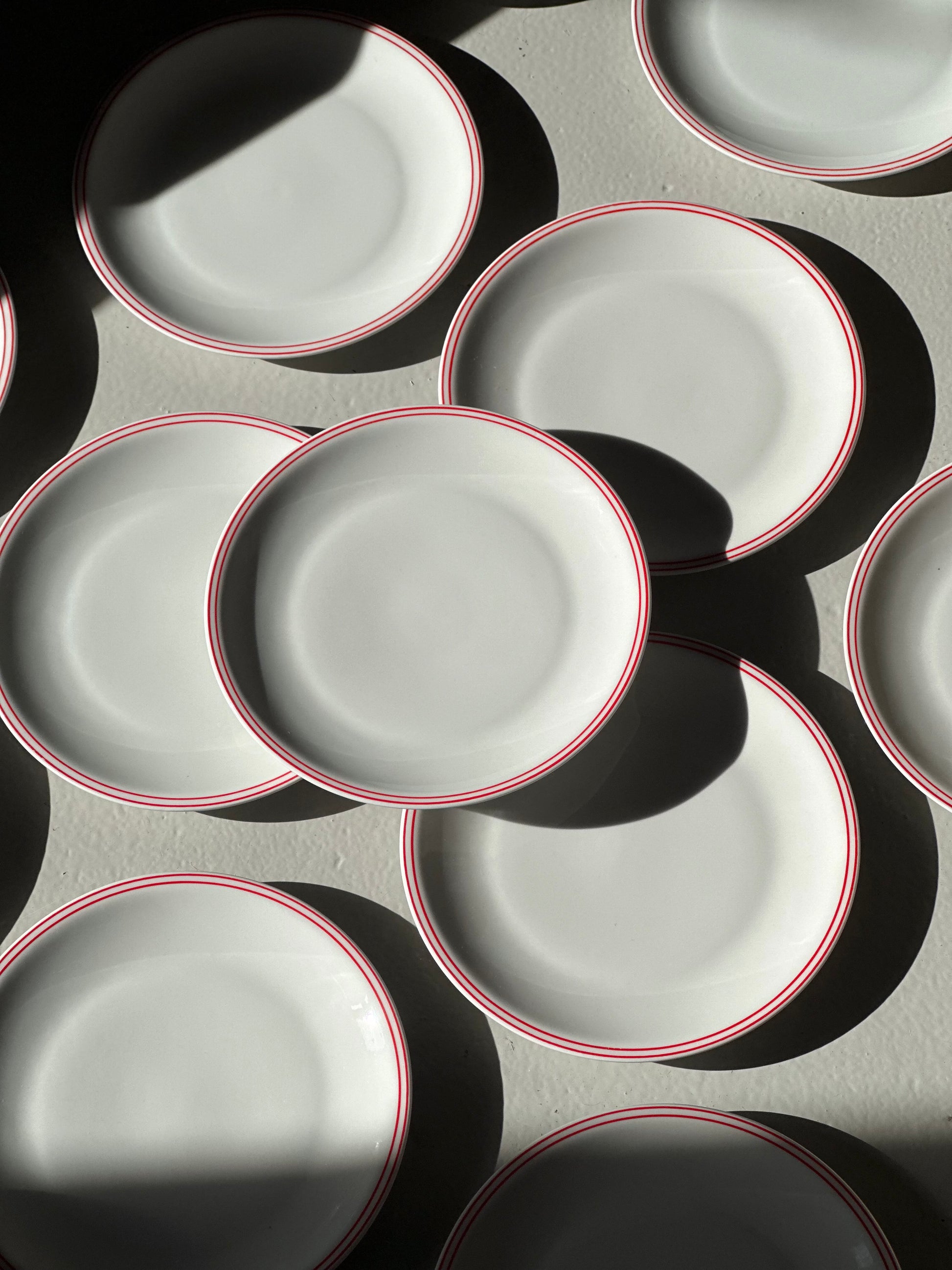 Italienske vintage bistro tallerkener i hvidt porclæn med tynde røde dobbelt kanter. De er fundet i Italien og er alle i super super flot stand uden skår.