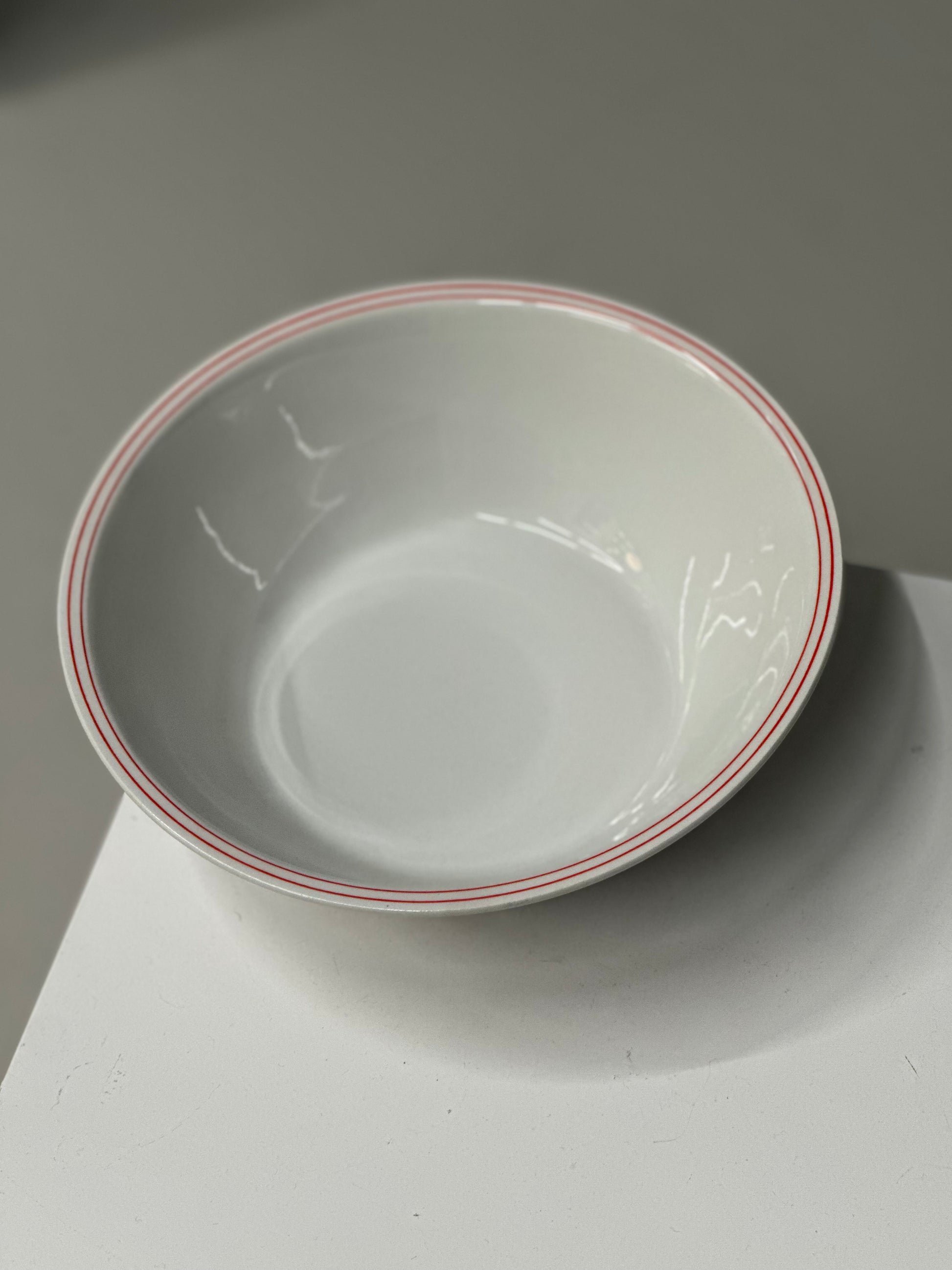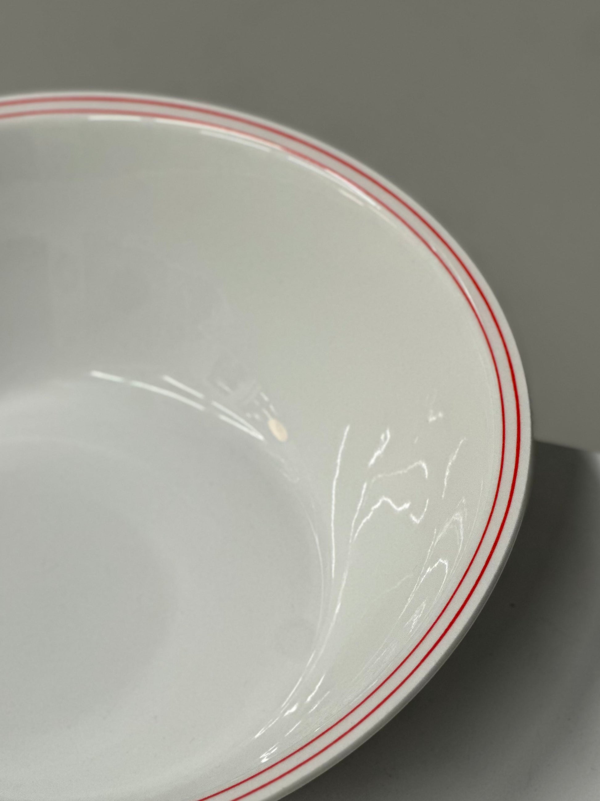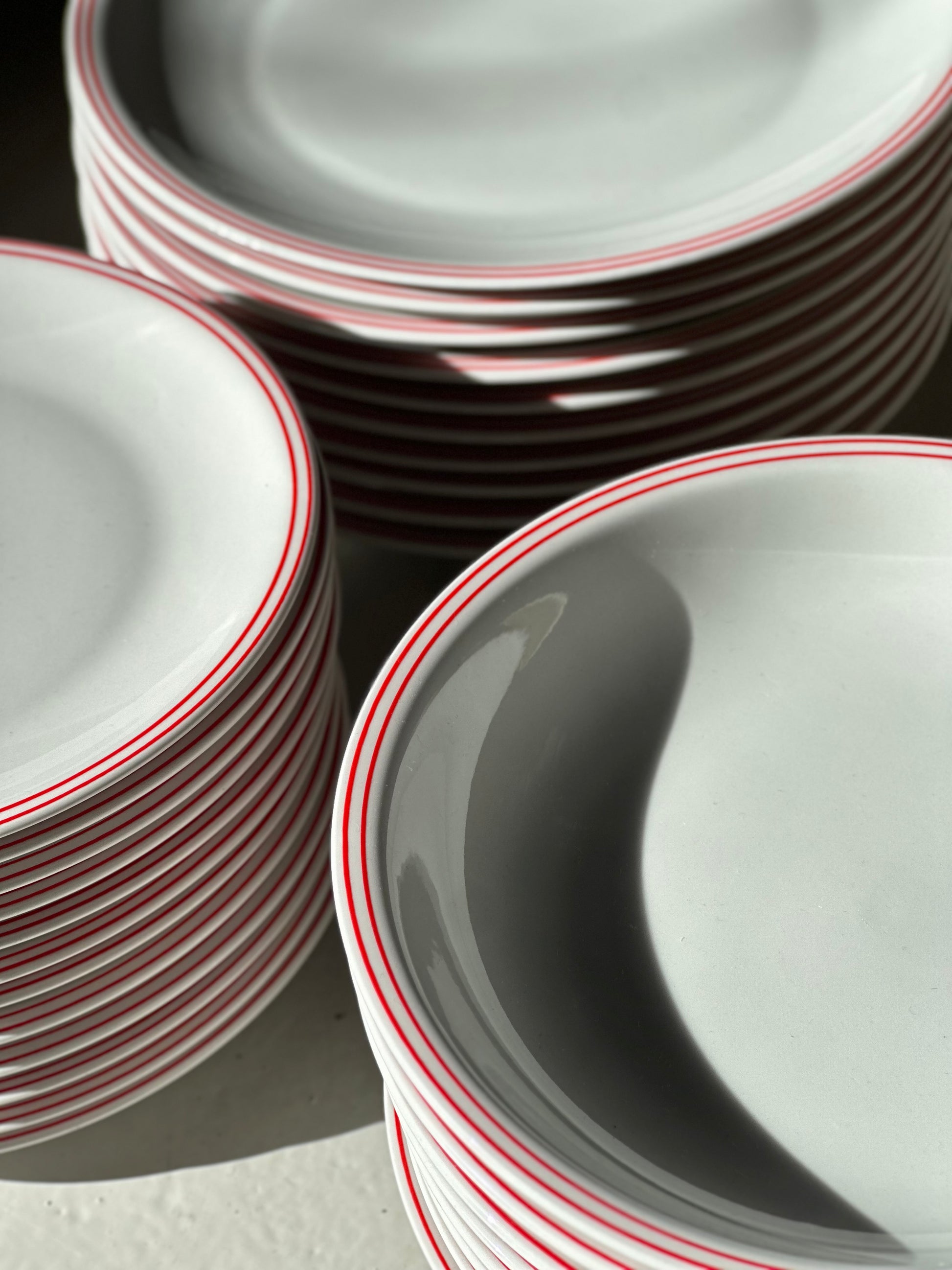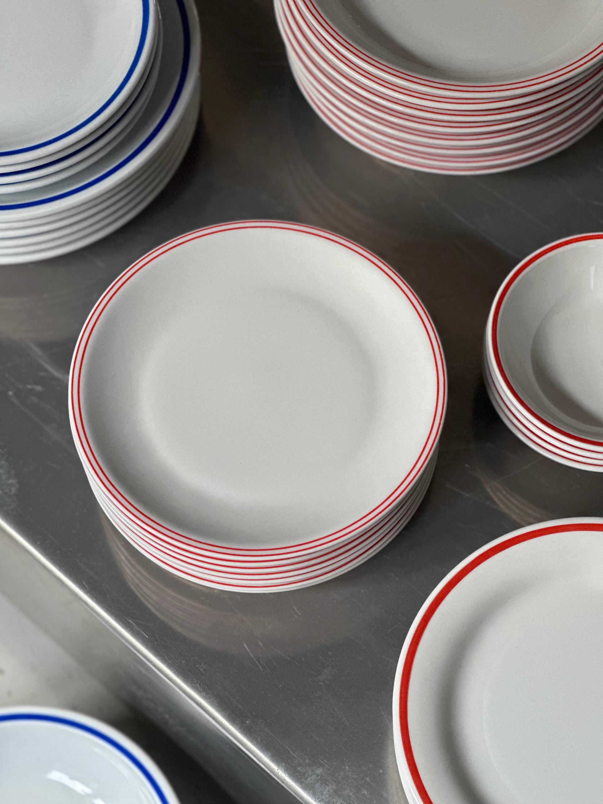 Italienske vintage bistro tallerkener i hvidt porclæn med tynde røde dobbelt kanter. De er fundet i Italien og er alle i super super flot stand uden skår.