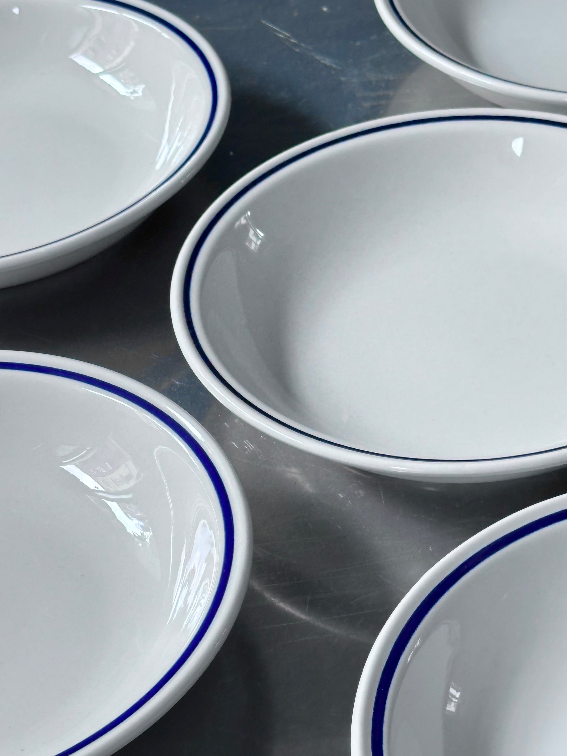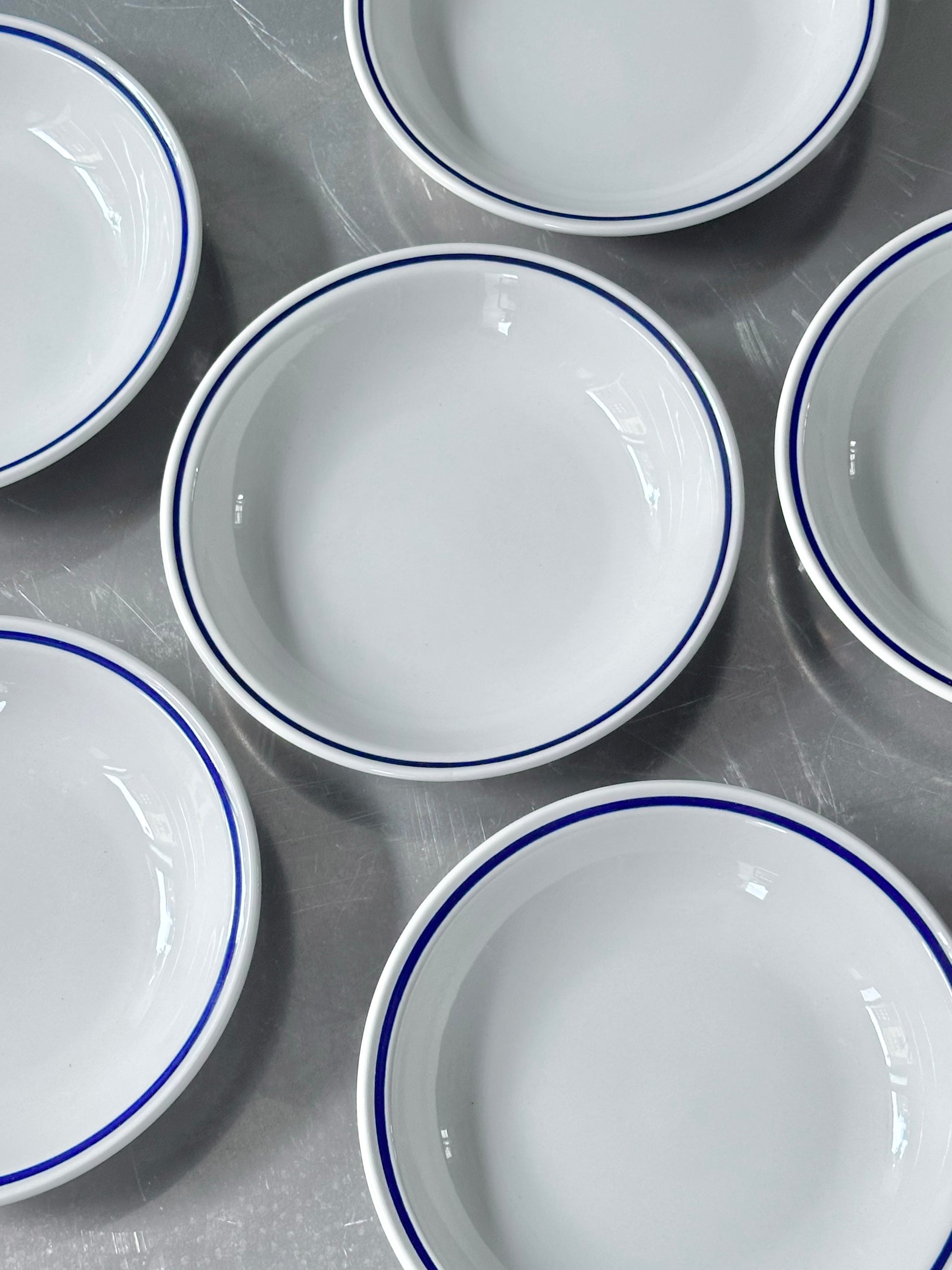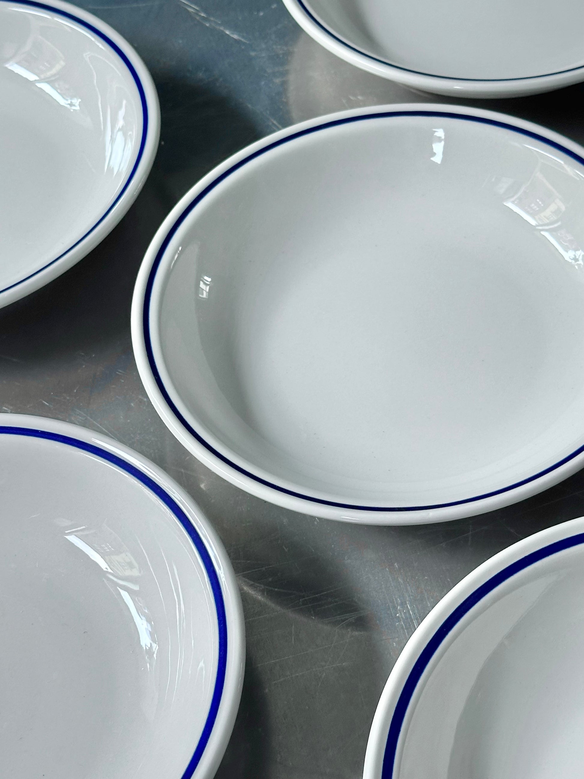 Italienske dybe vintage tallerkener med blå streg-kanter. De er alle uden skår og med kun minimale alm lette brugsspor. Tallerkenerne er fundet i Italien.