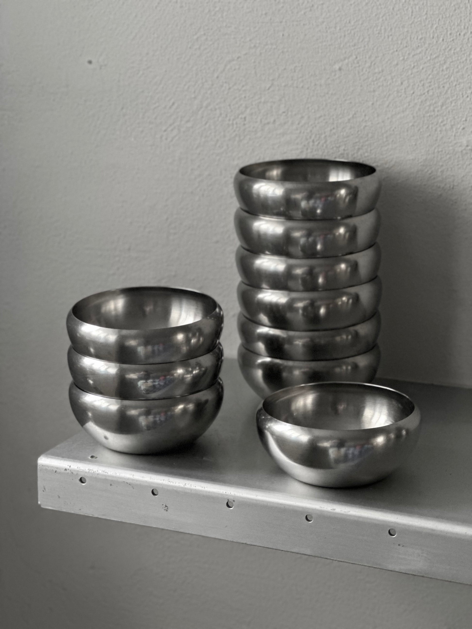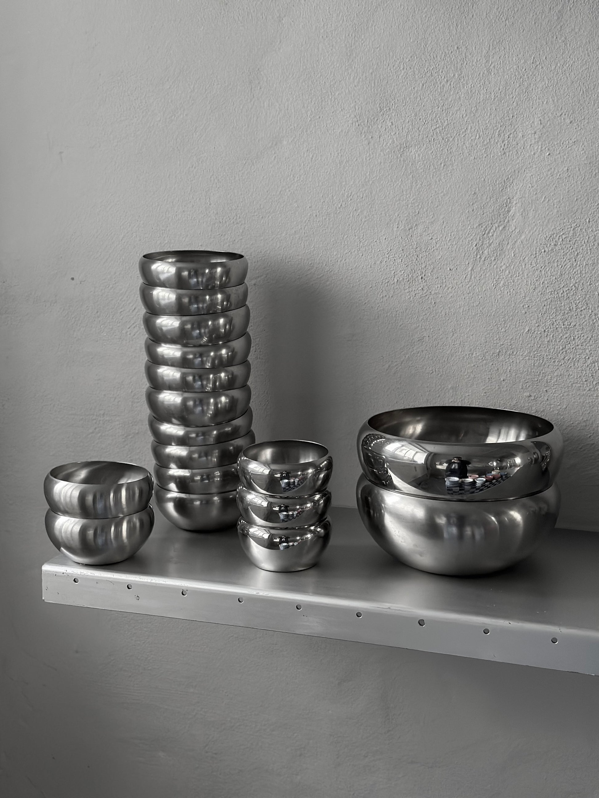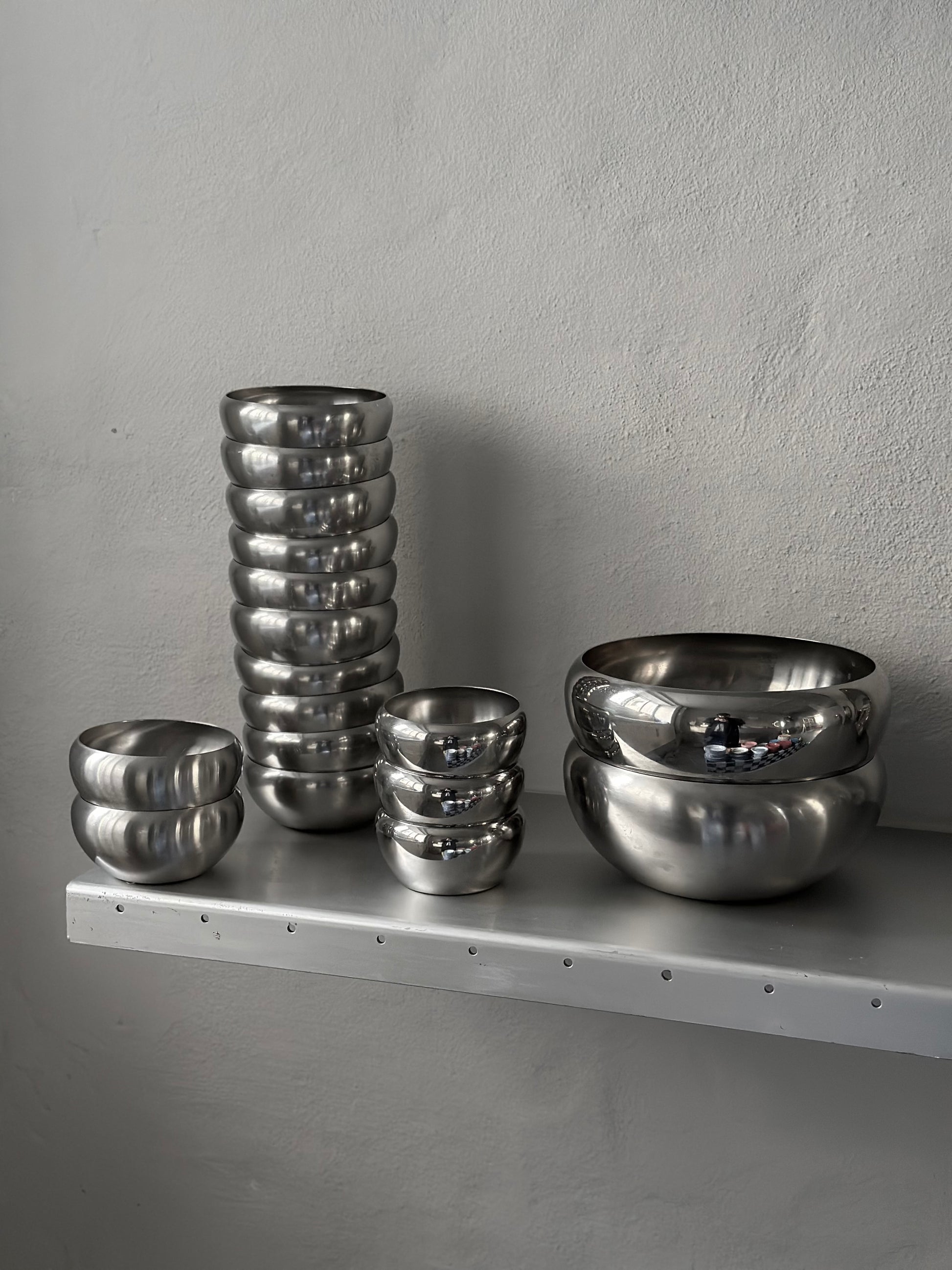 Forskellige italienske vintage stål skåle i chubby design i forskellige størrelser. De er alle i fantastisk flot stand med kun minimale alm lette brugsspor. De små og en enkelt af de XL er i blank finish - og de resterende i mere børstet finish.