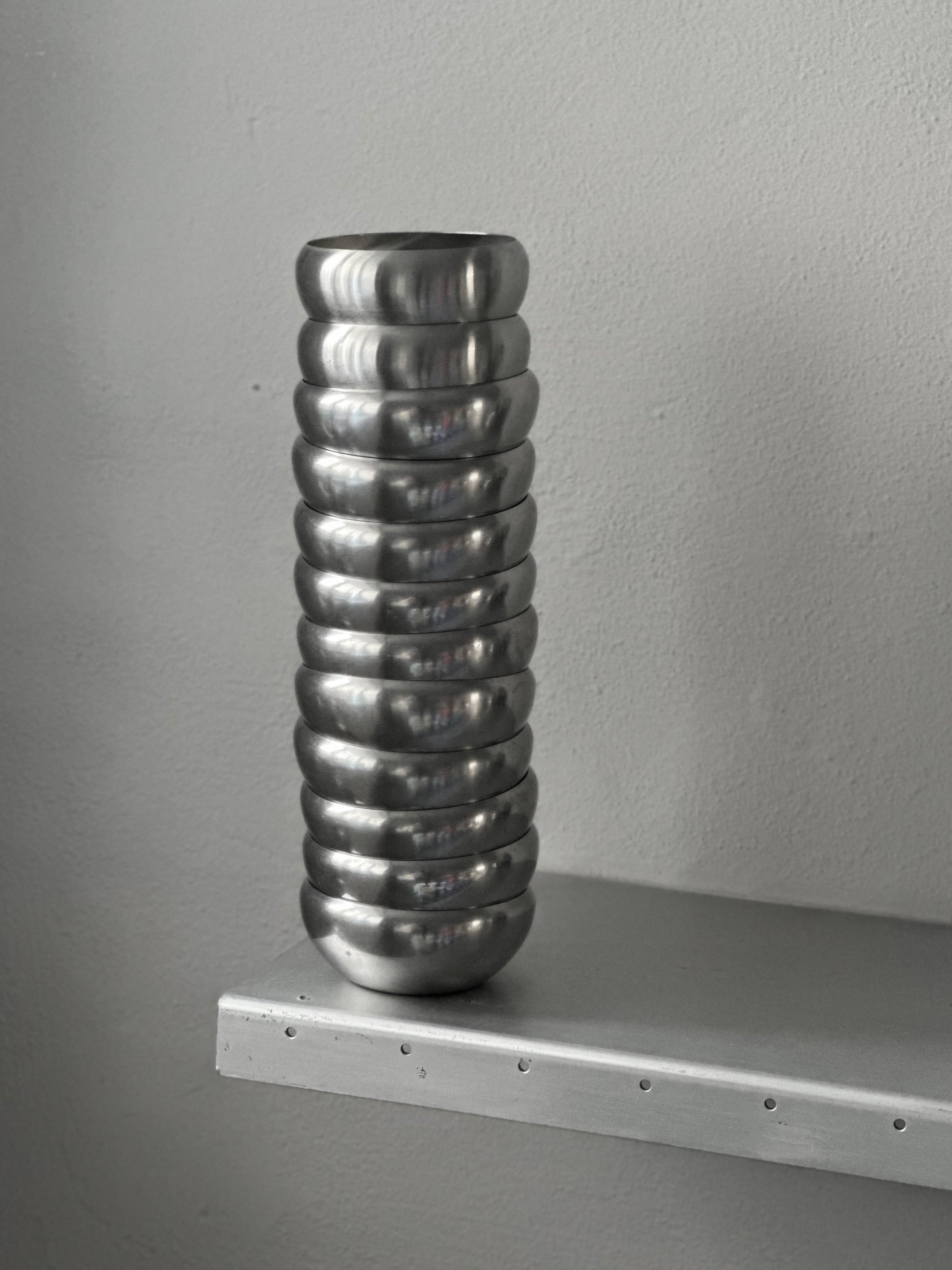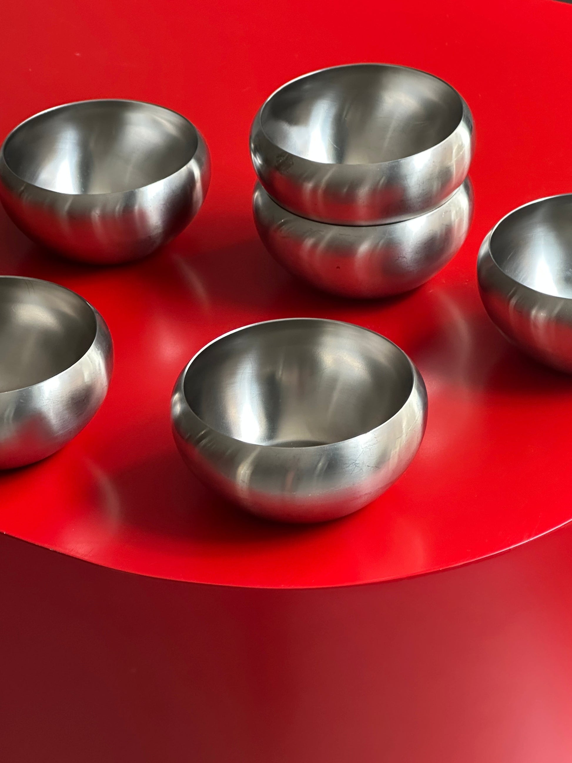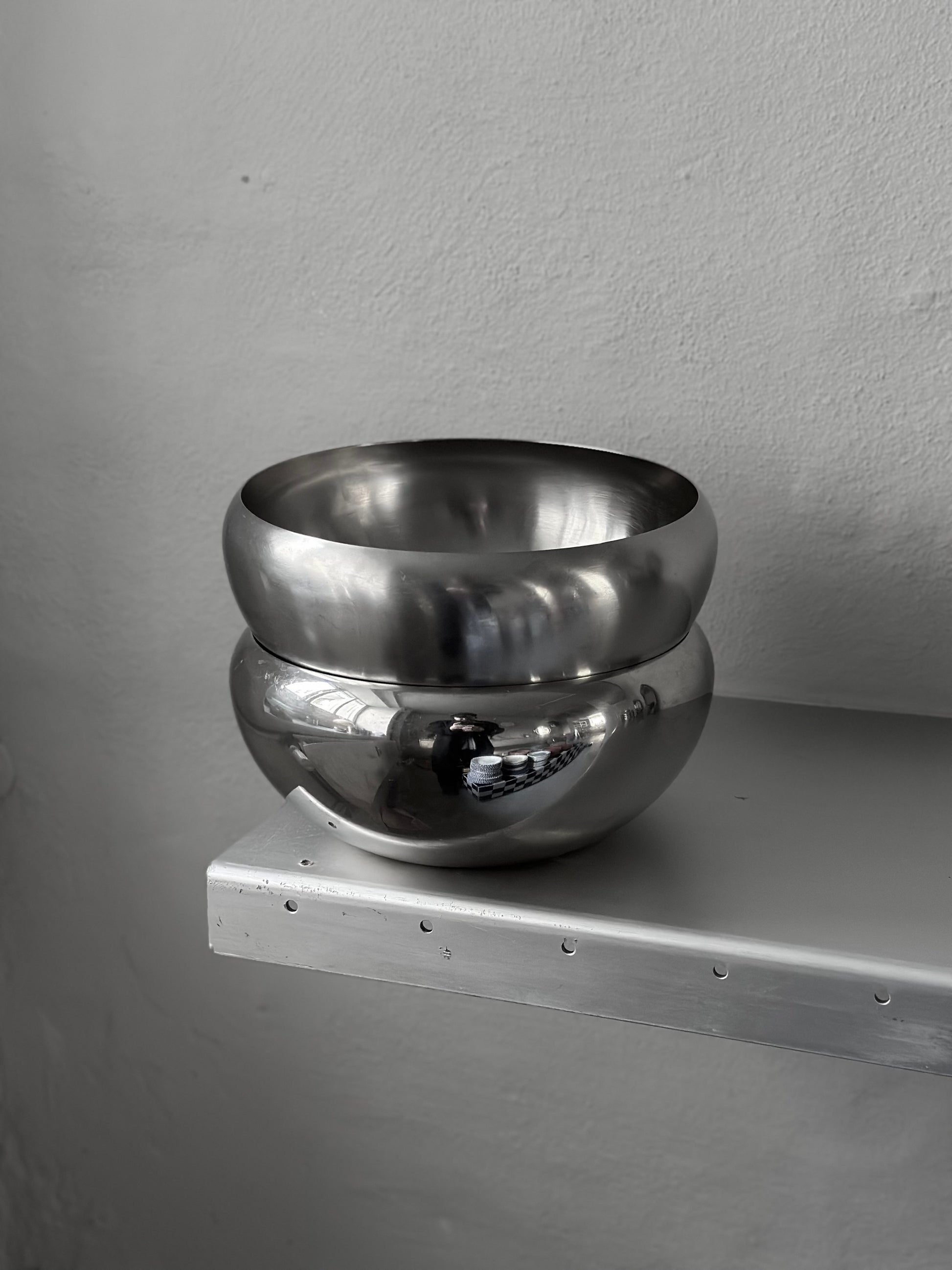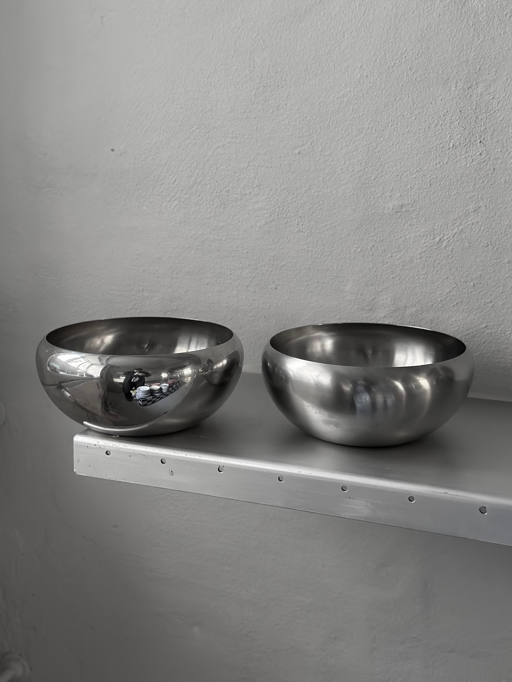Forskellige italienske vintage stål skåle i chubby design i forskellige størrelser. De er alle i fantastisk flot stand med kun minimale alm lette brugsspor. De små og en enkelt af de XL er i blank finish - og de resterende i mere børstet finish.