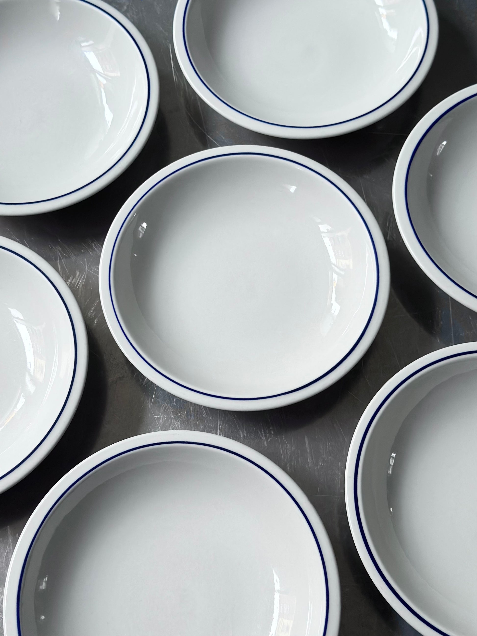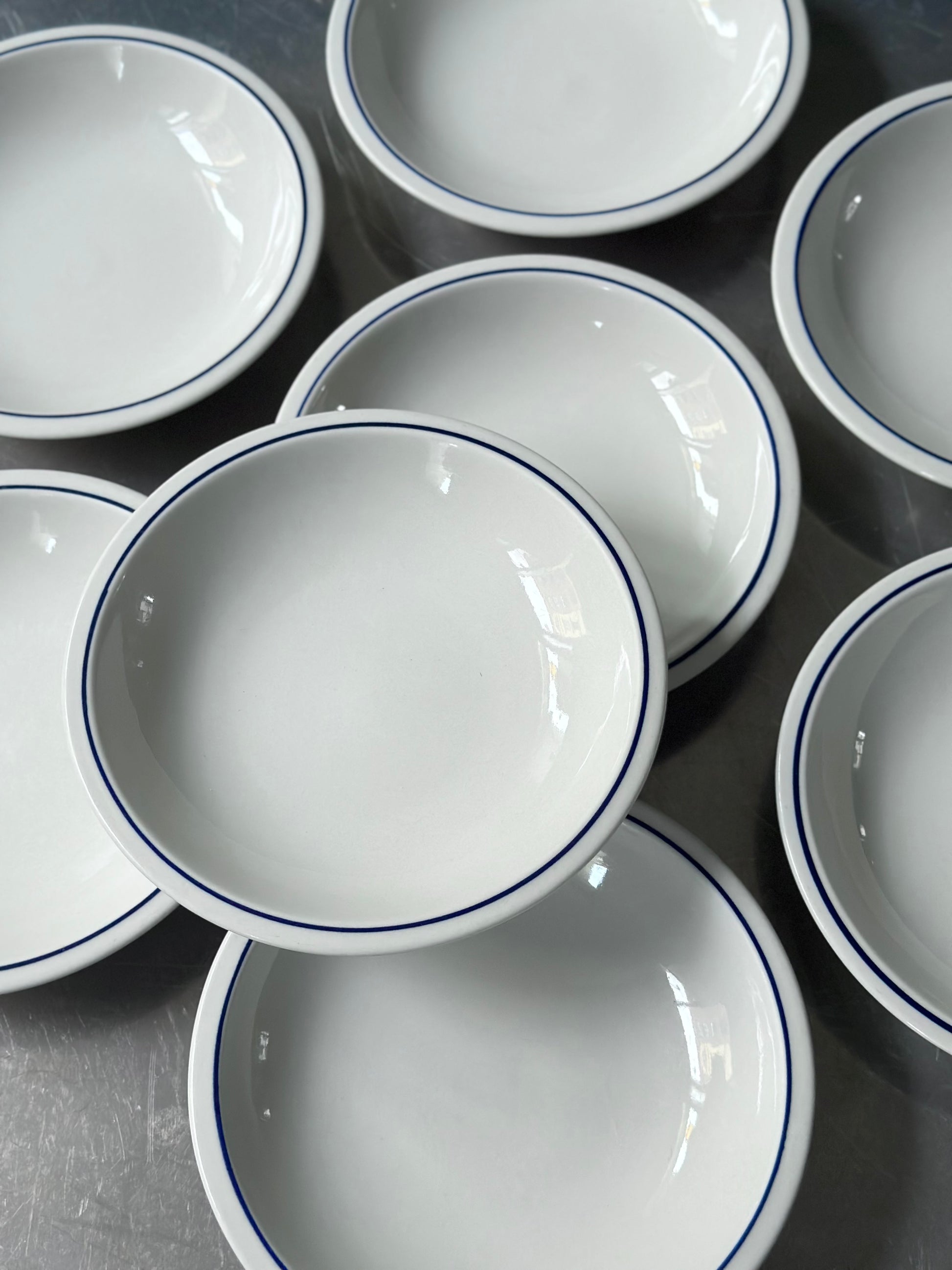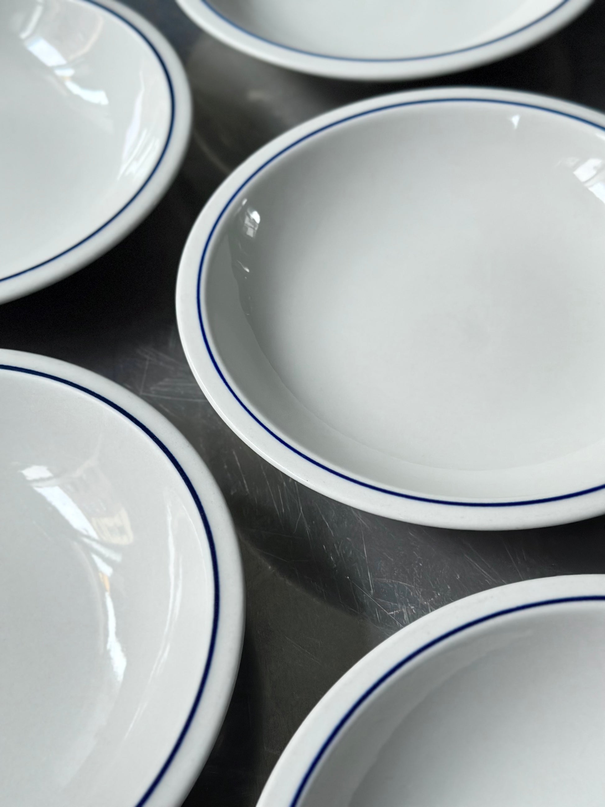 Italiensk vintage bistro pastaskåle / dybe tallerkener i hvidt porcelæn med blå kanter. De er fundet i Italien og er alle i flot stand uden skår.