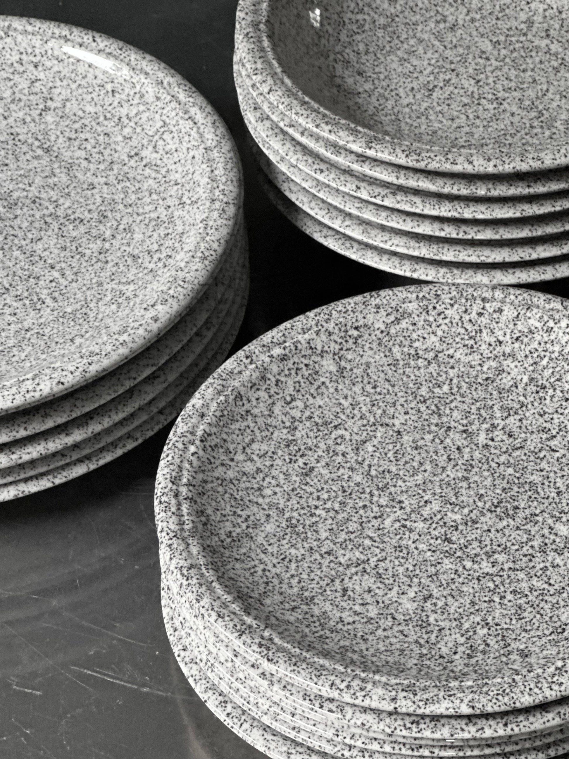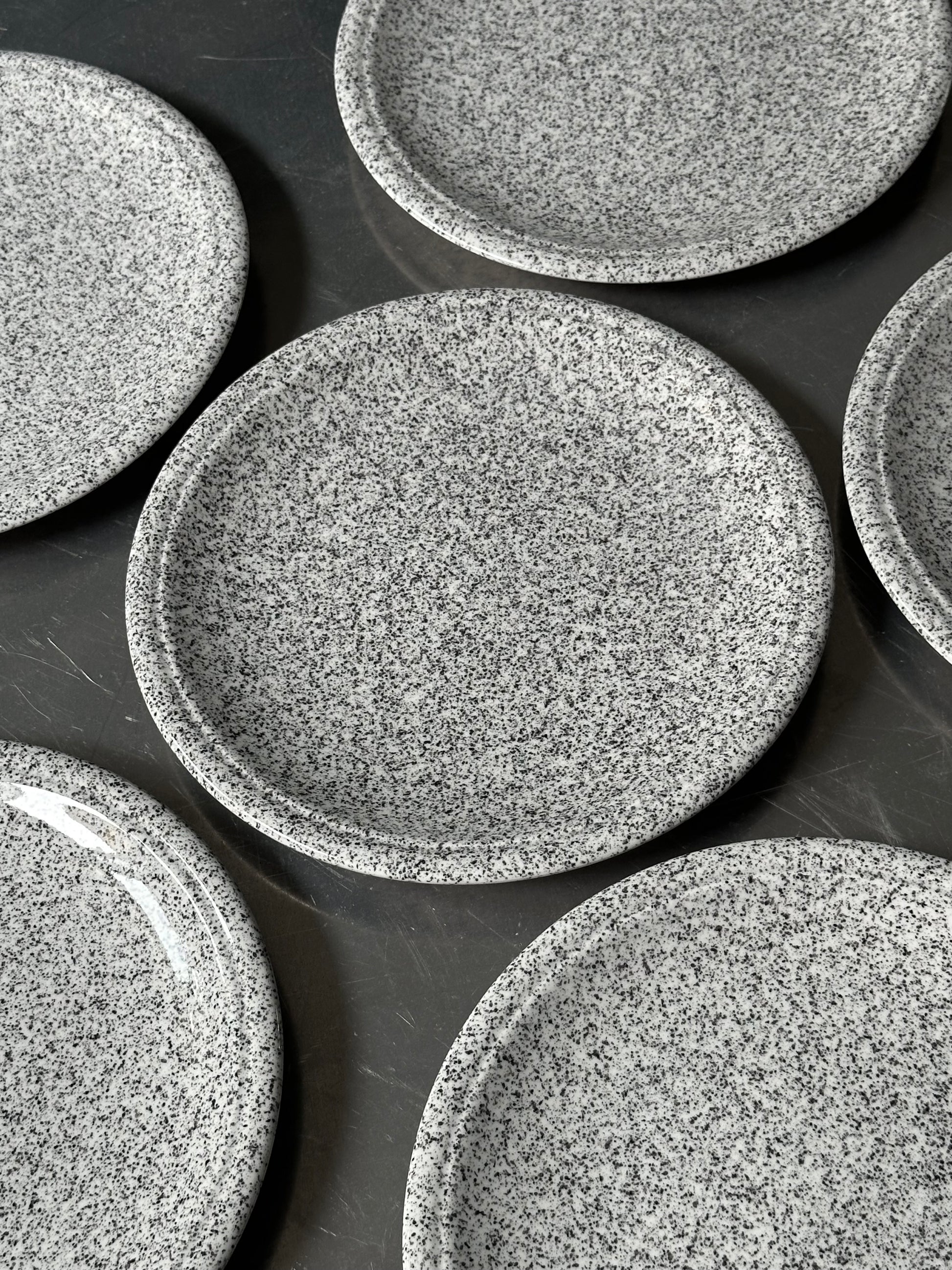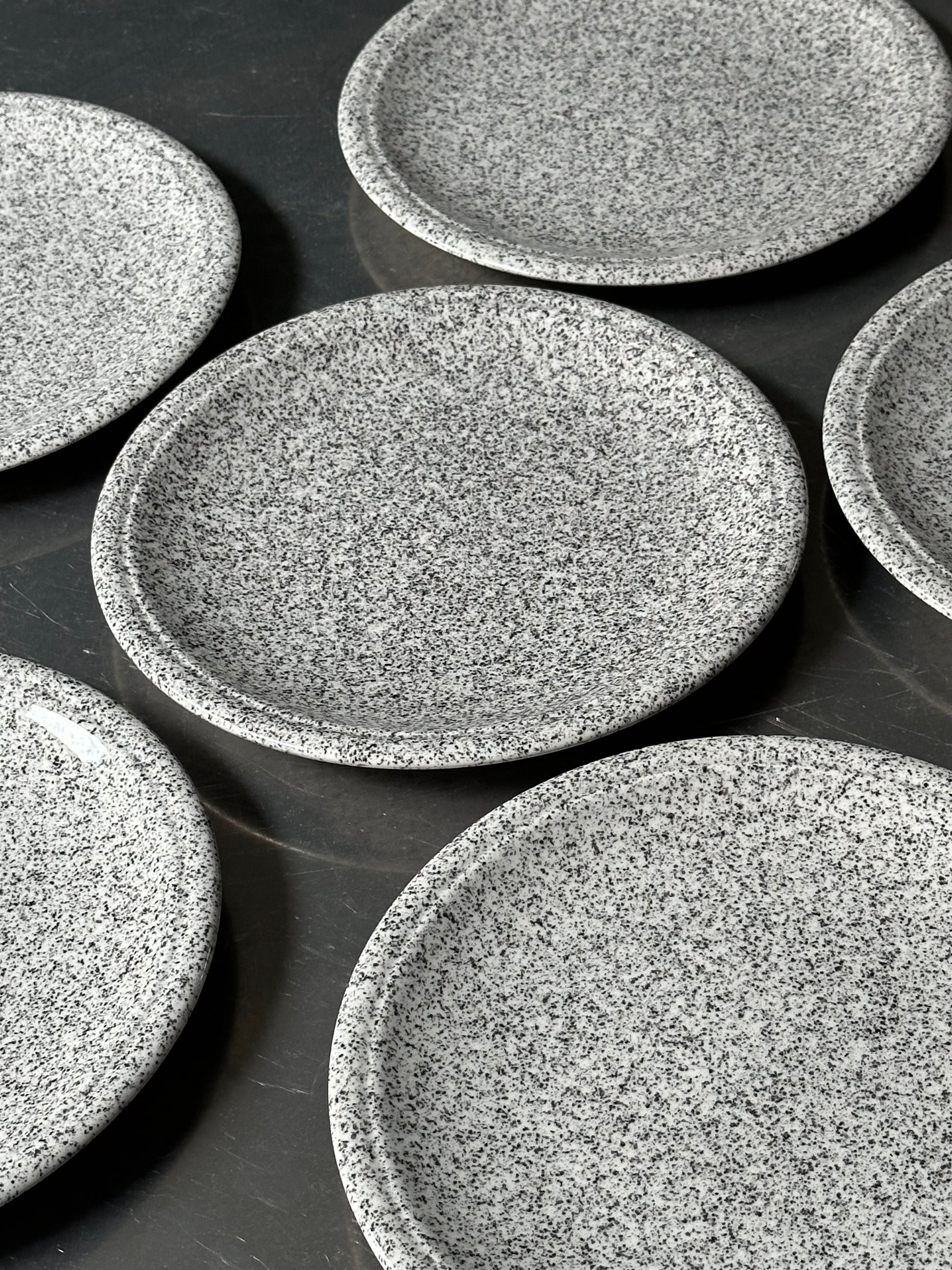 Italienske flade vintage frokost tallerkener sort/hvid nistret glasur. De er alle i helt vanvittig flot stand uden skår og med virkelig minimale brugsspor. Tallerkenerne er fundet i Italien.