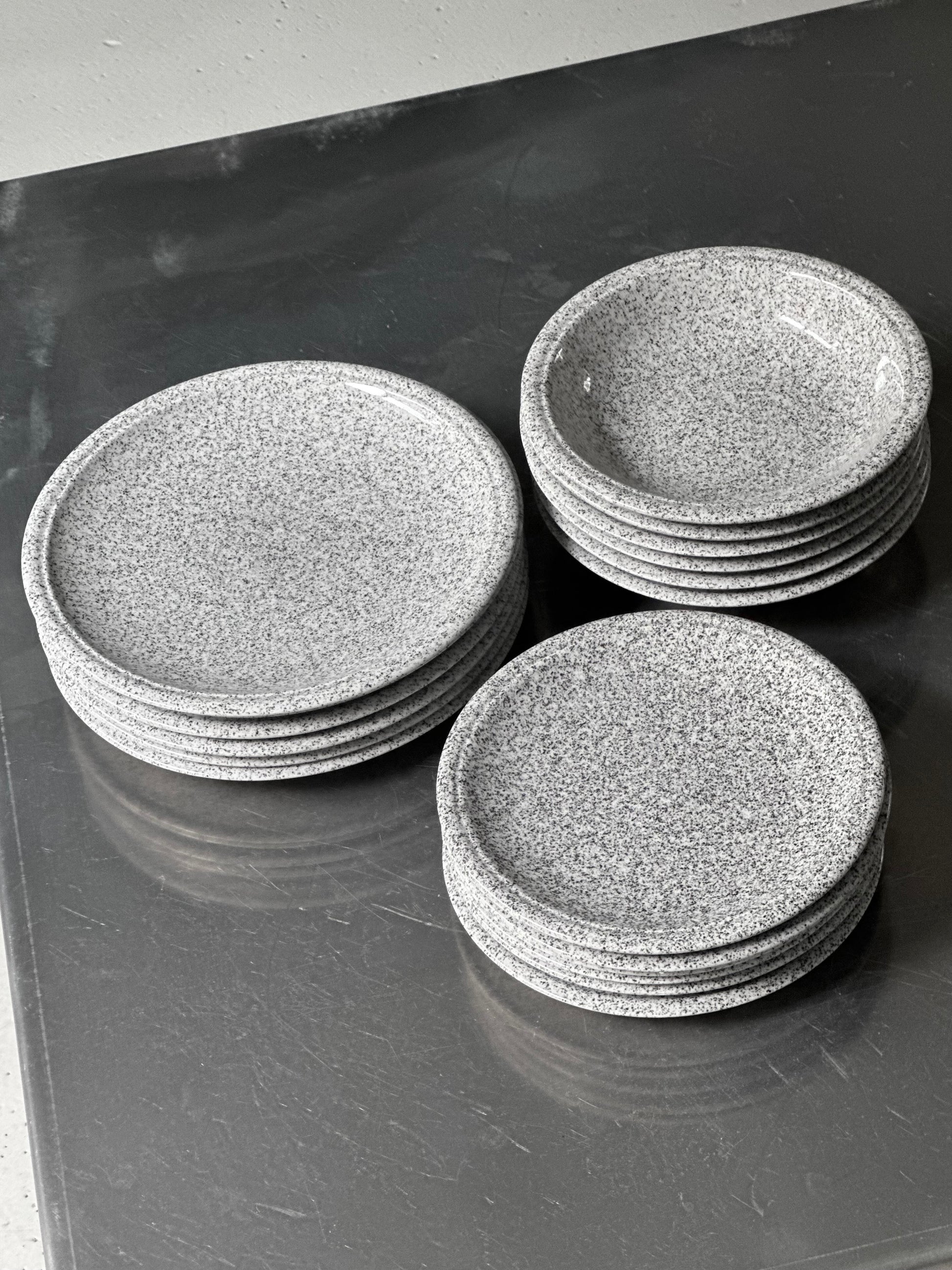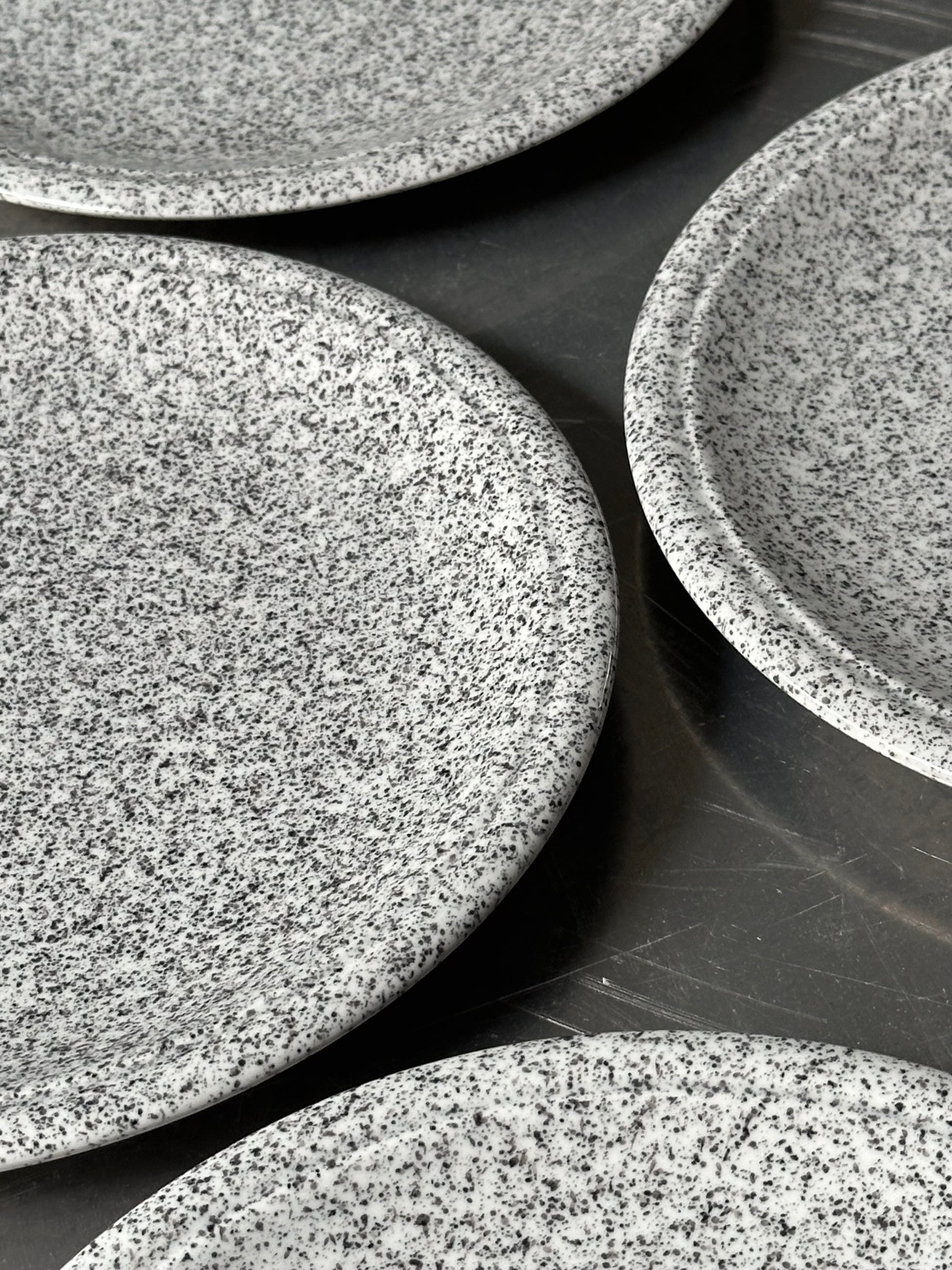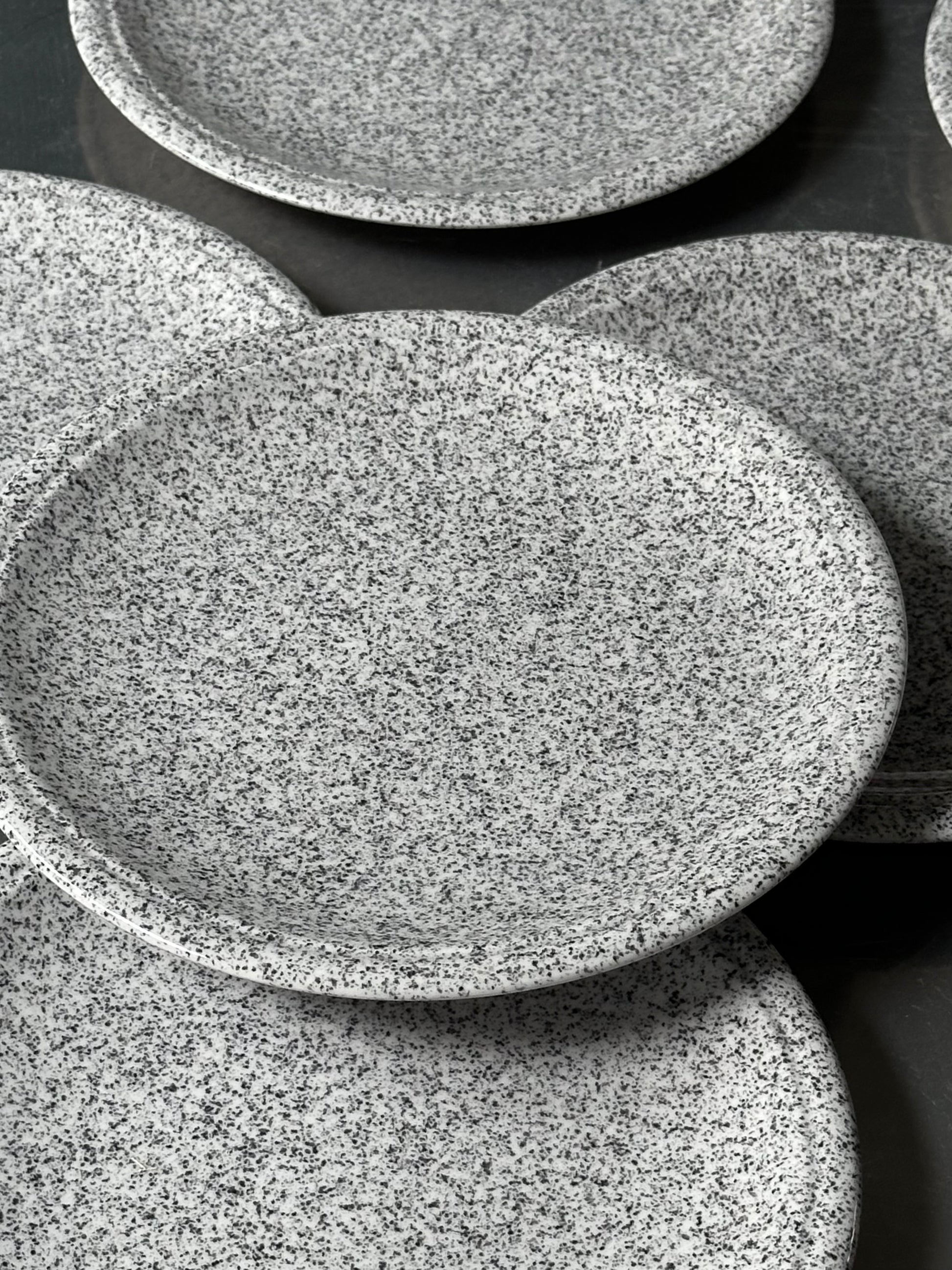 Italienske flade vintage frokost tallerkener sort/hvid nistret glasur. De er alle i helt vanvittig flot stand uden skår og med virkelig minimale brugsspor. Tallerkenerne er fundet i Italien.