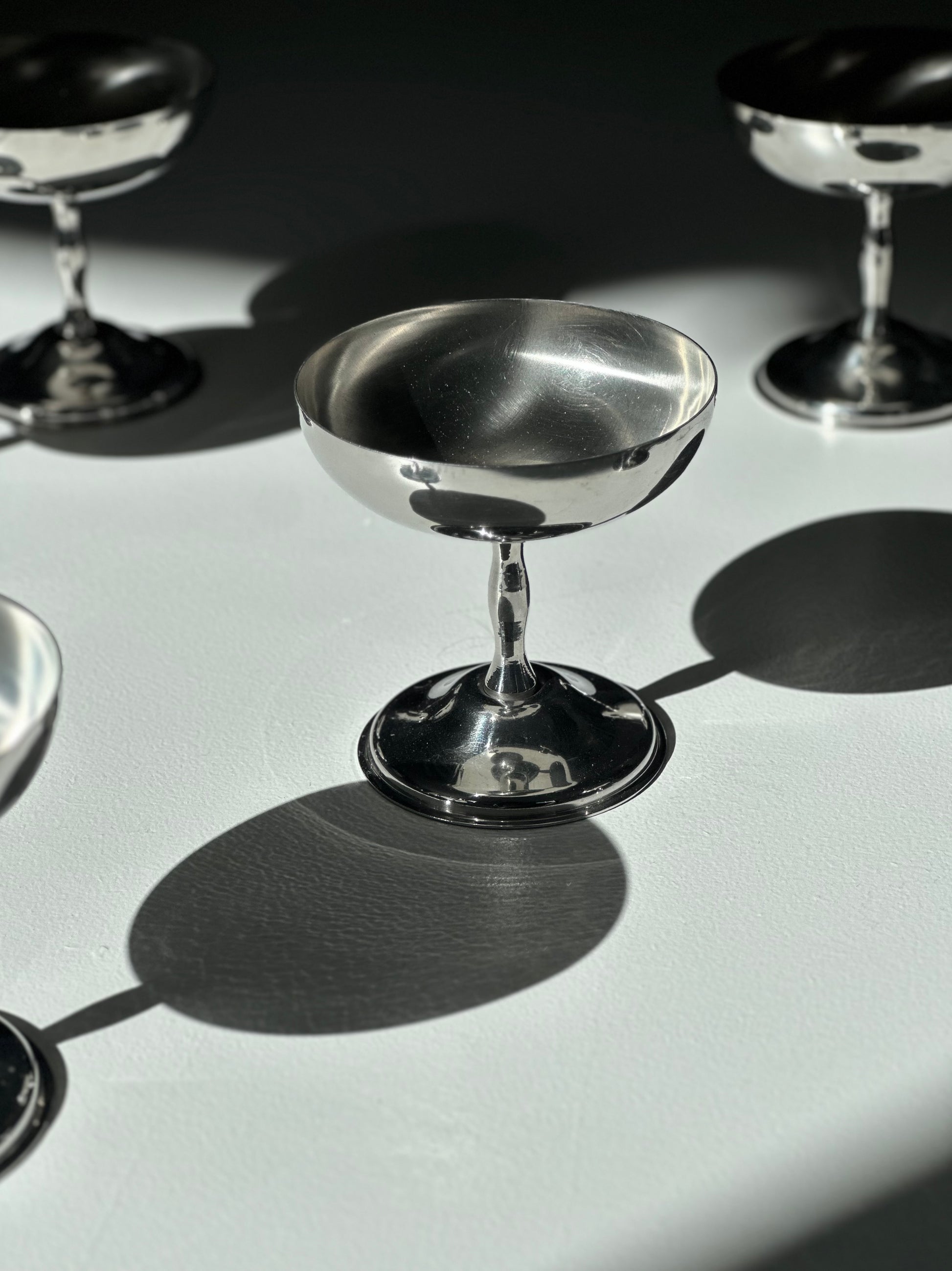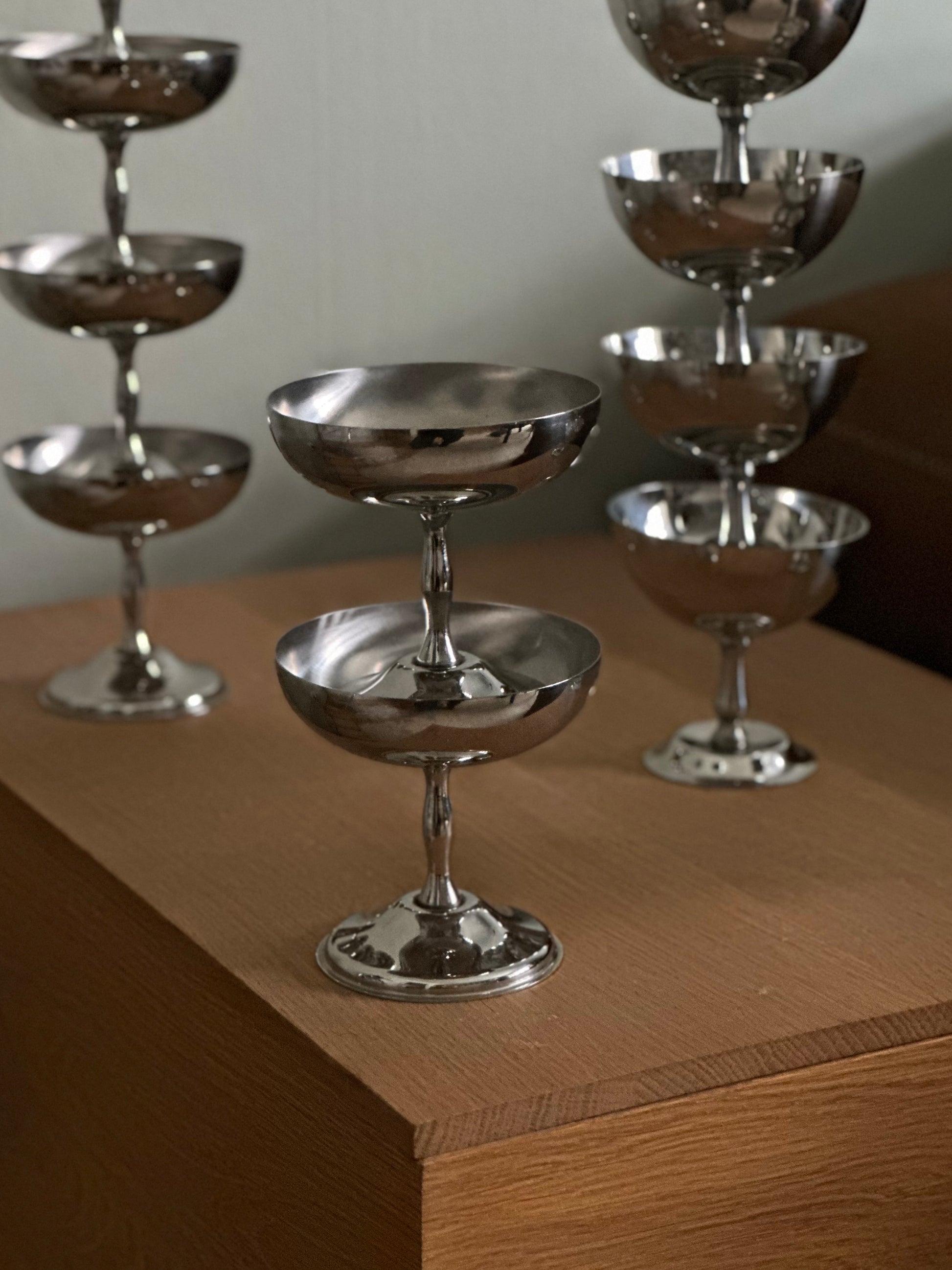 Italienske vintage skåle på fod i blankt stål. De er fundet i Italien og er alle i super flot stand.
