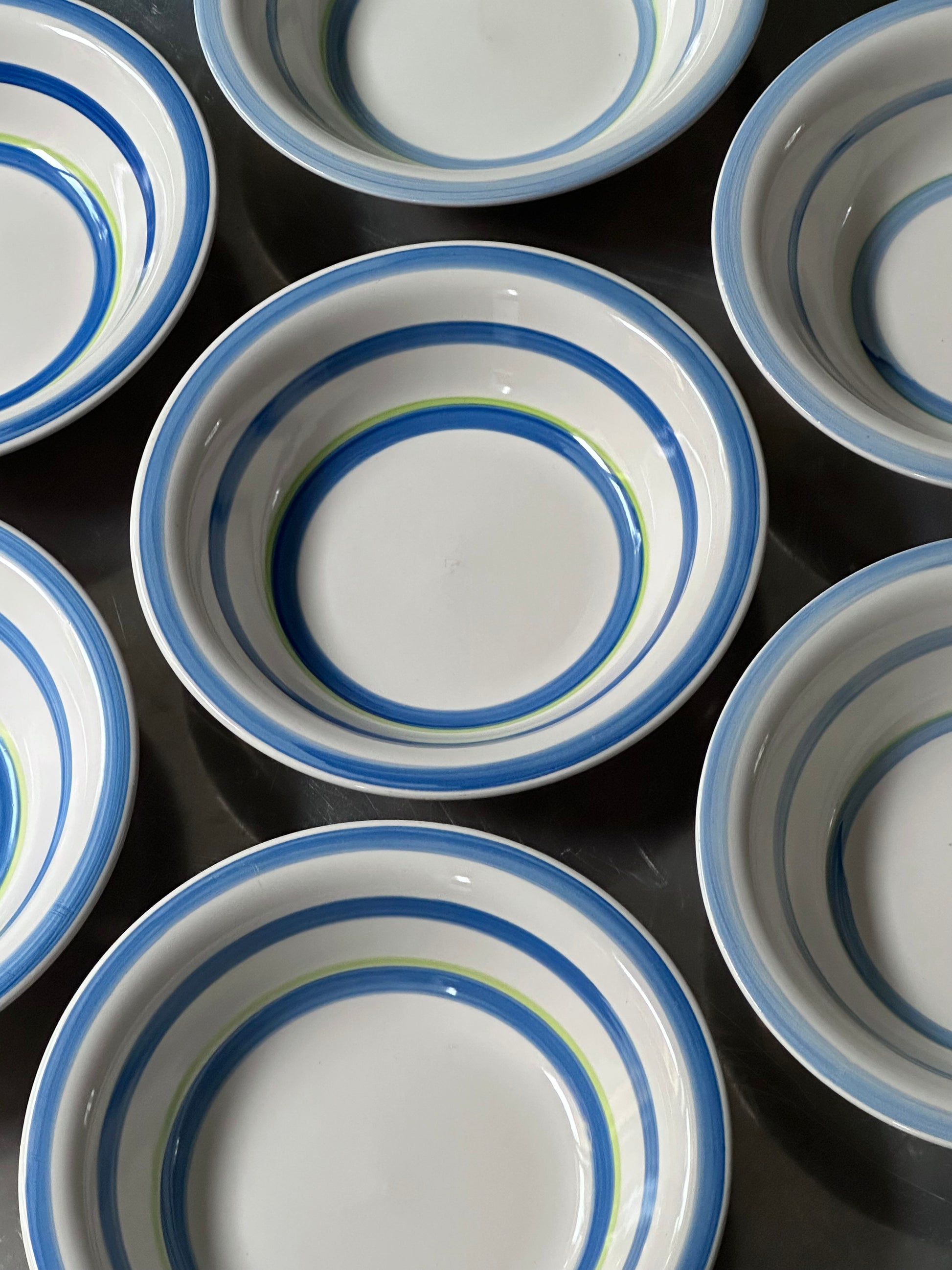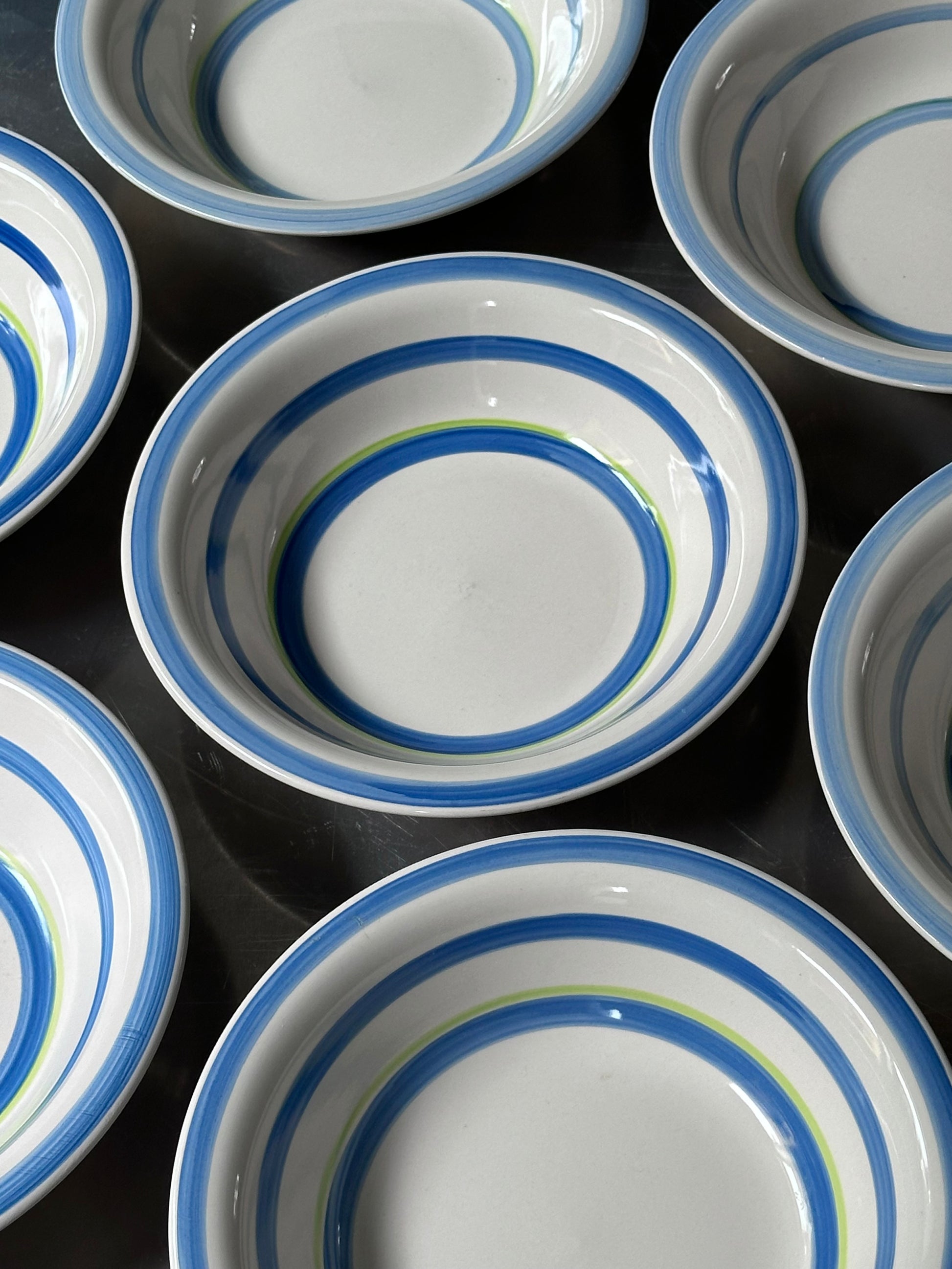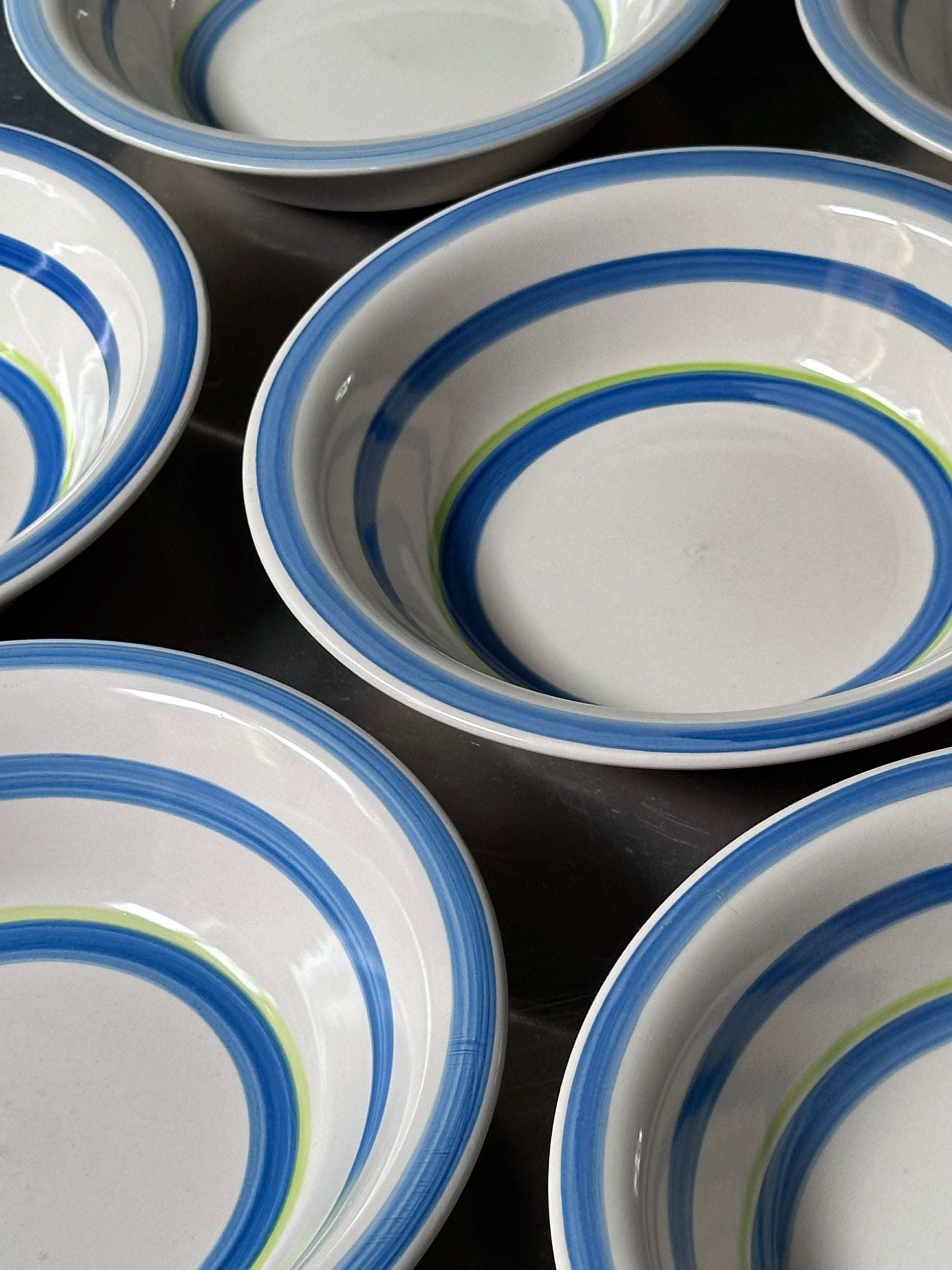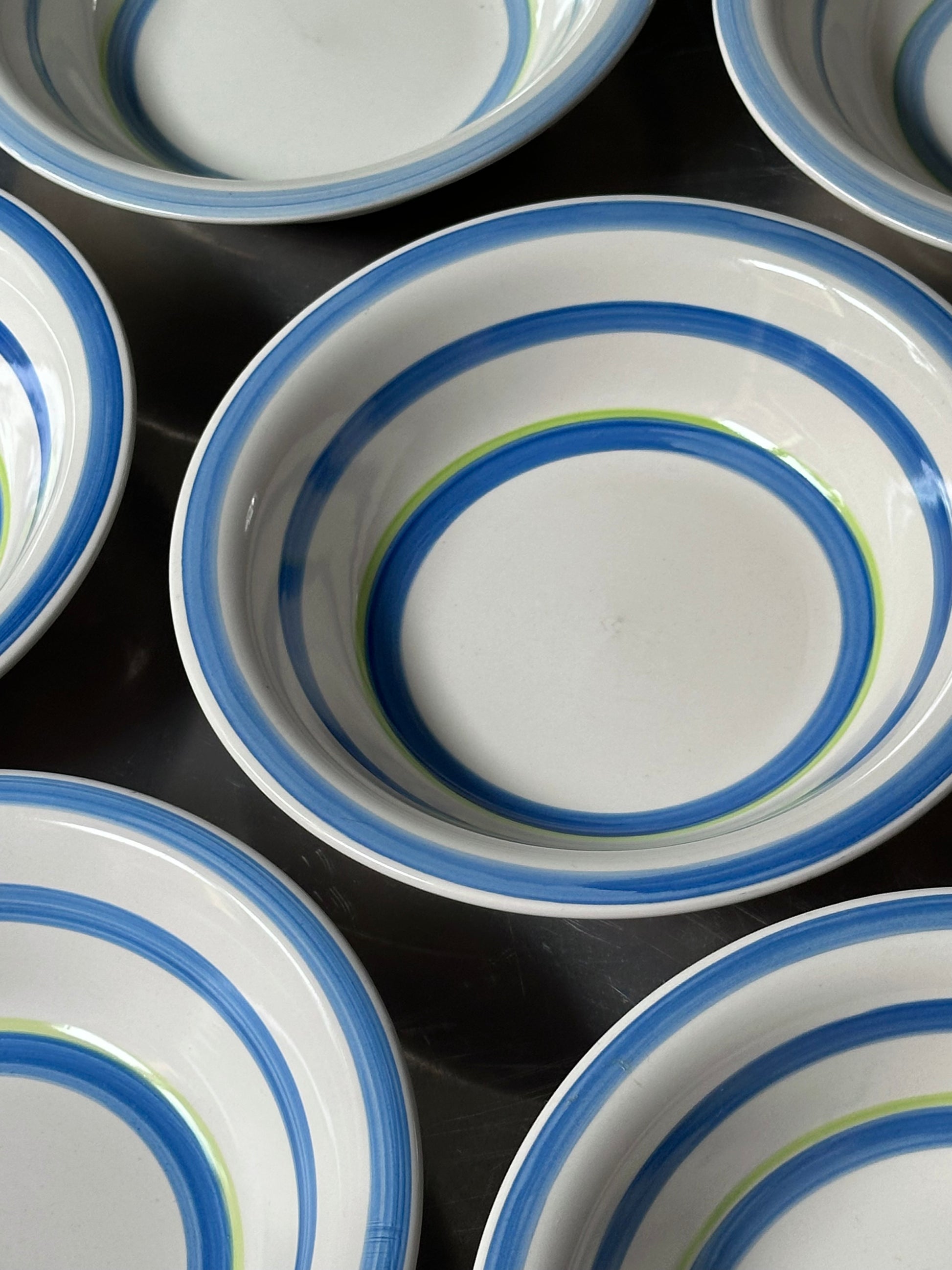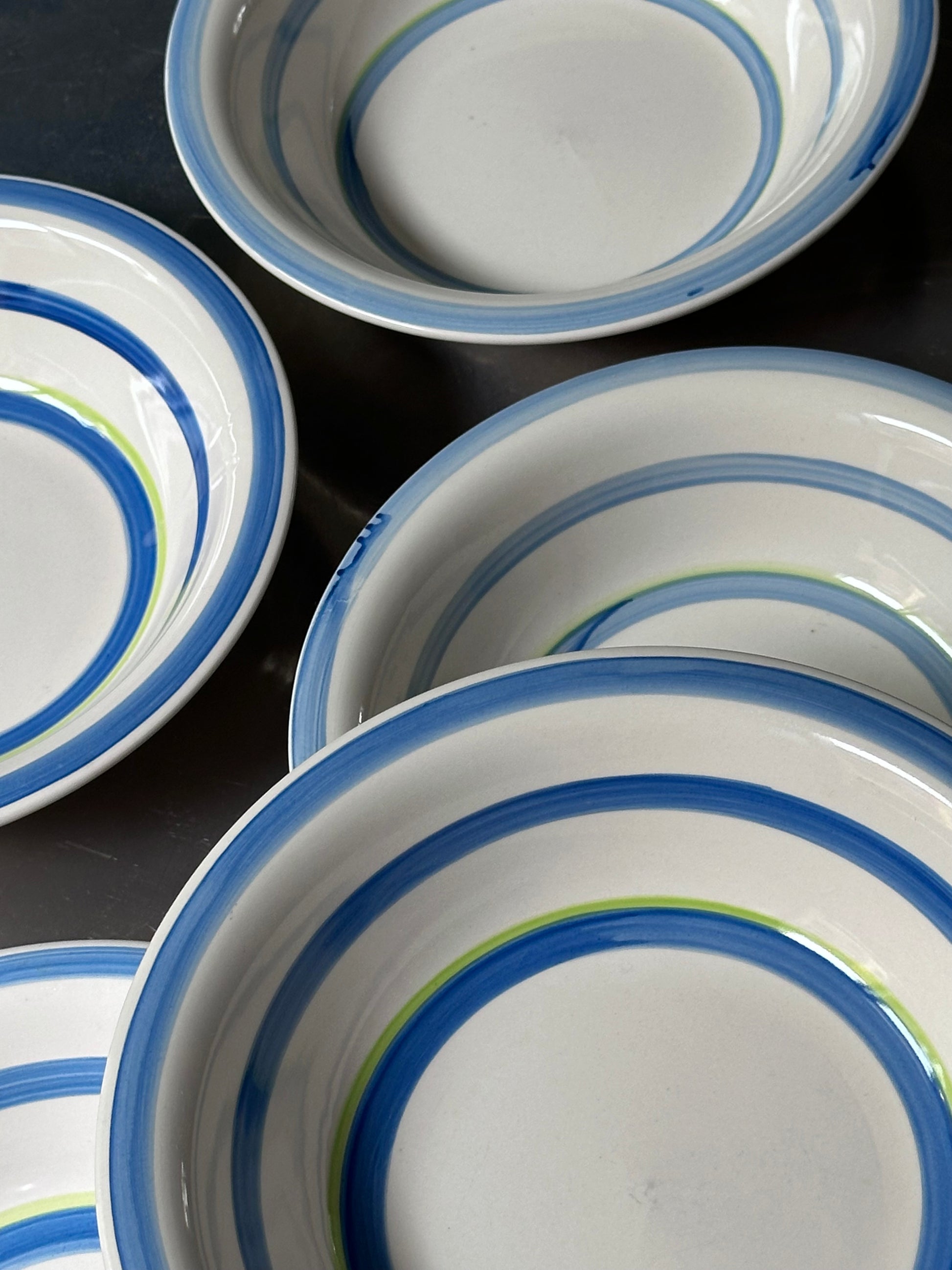 Italienske tallerkener med blå og grønne cirkler i glasuren. De er fundet i Italien og er alle i super flot stand uden skår og kun alm meget meget lette brugsspor. Glasuren varier en smule ift hvor kraftige farverne er - men mønstrene er de samme.