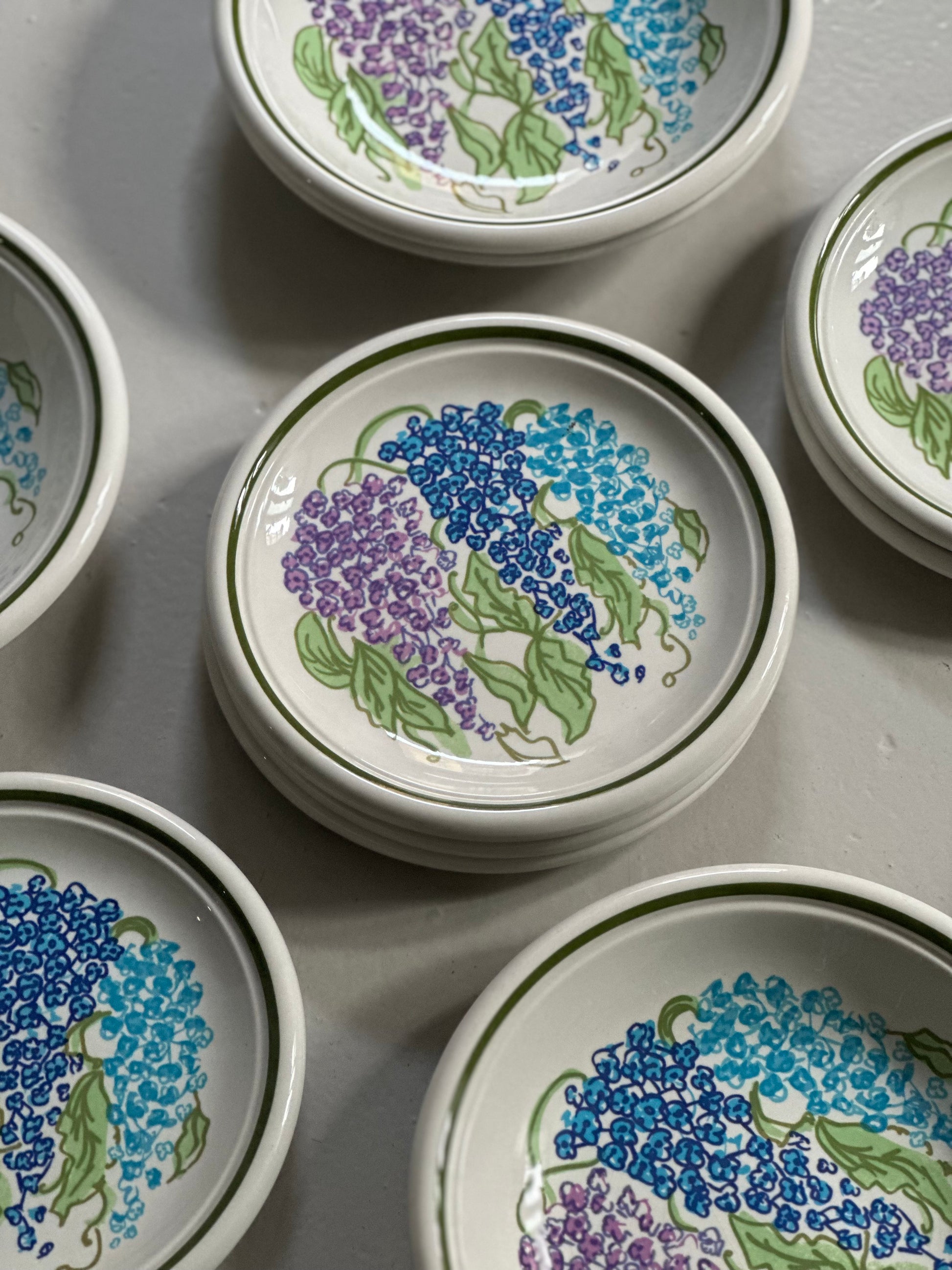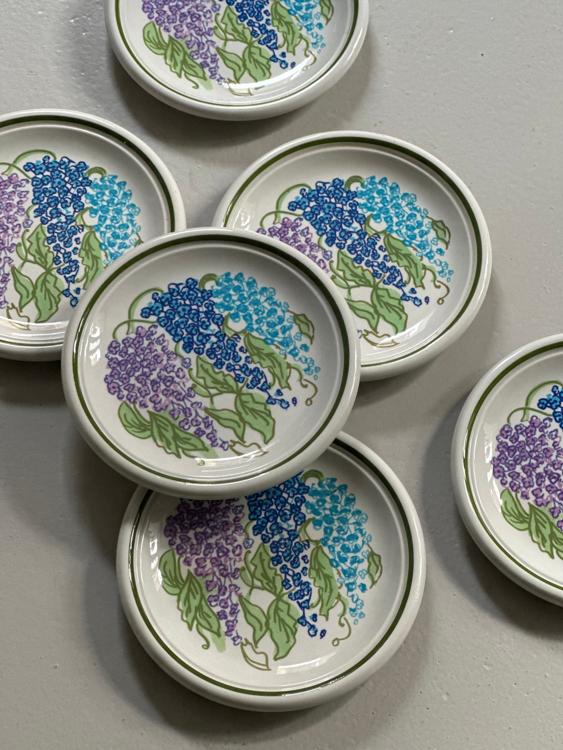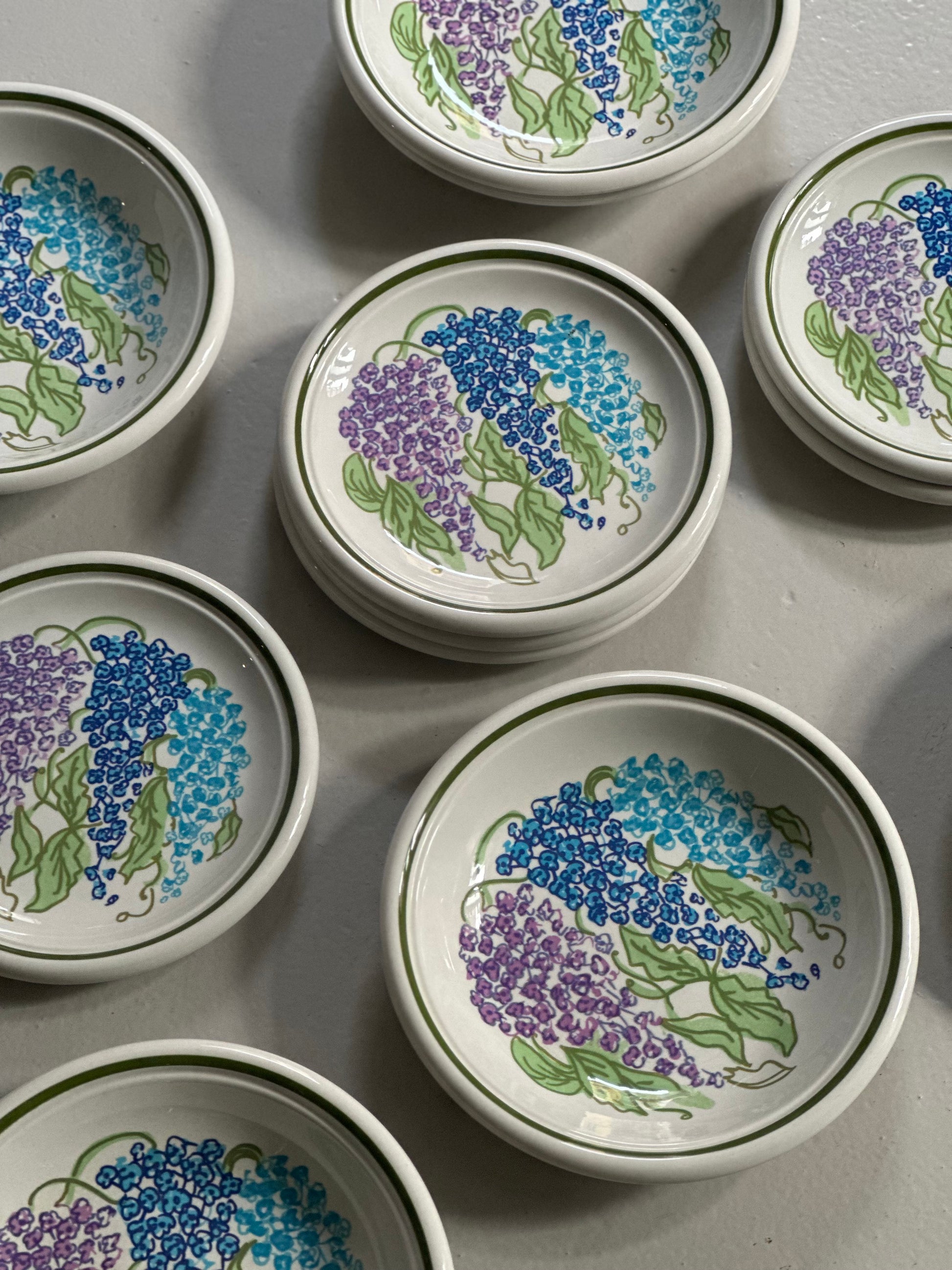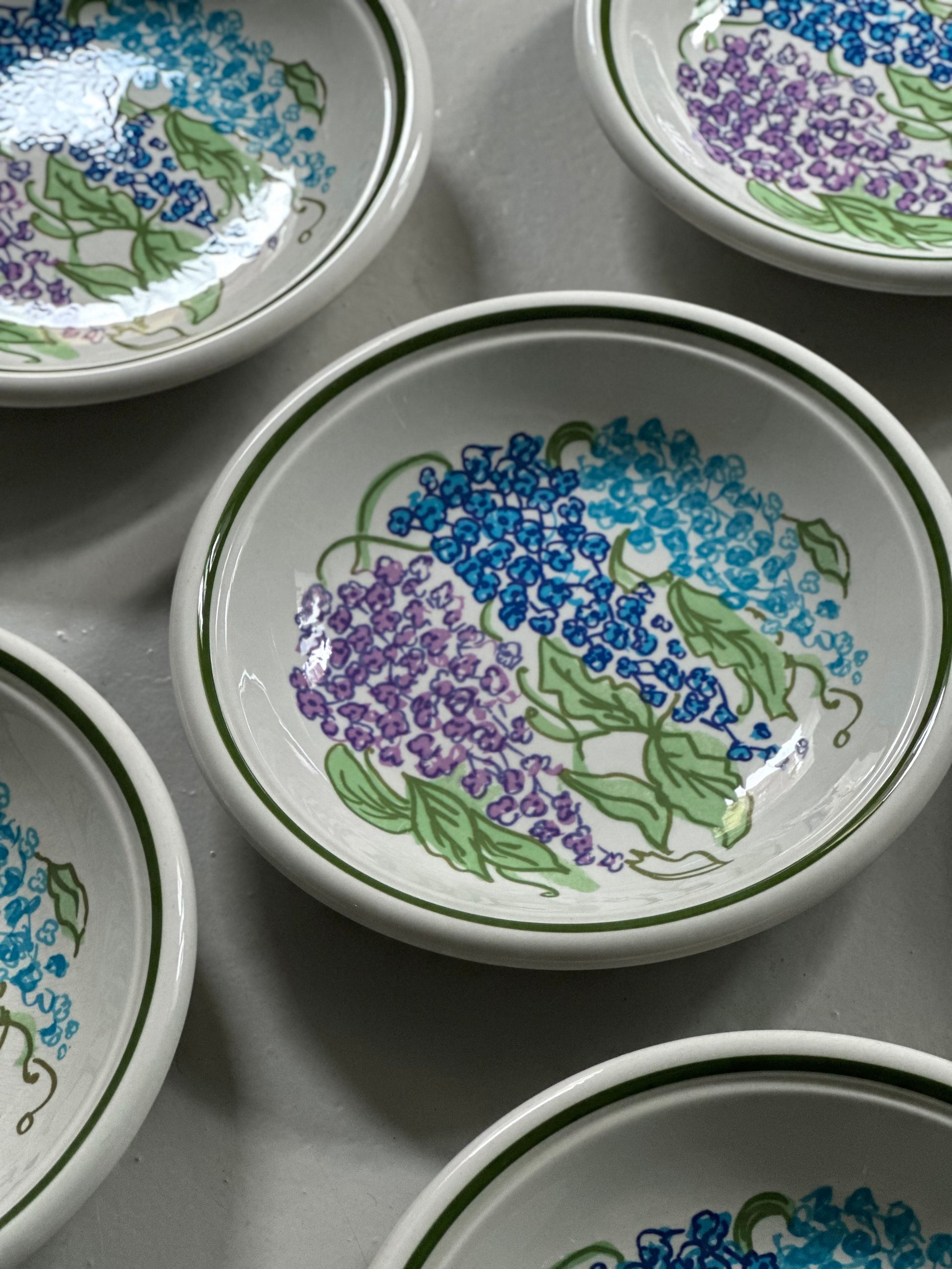 Italienske vintage tallerkener med grøn bistro kant og wisteria (blåregn) motiv. De er fundet i Italien og er alle i flot stand uden skår (enkelte frokost tallerkener har nogle mikro små nag hist pist - meget diskret).