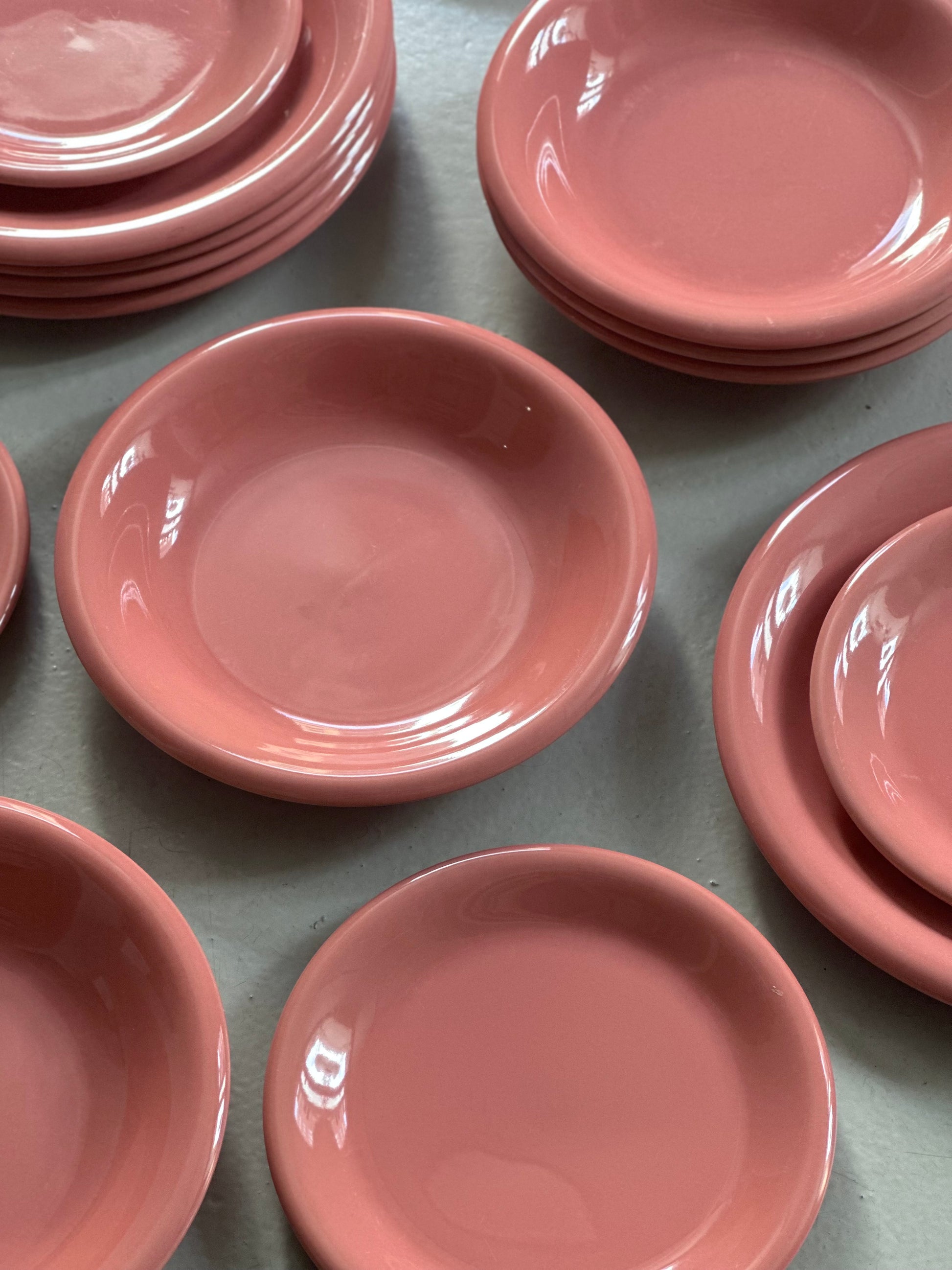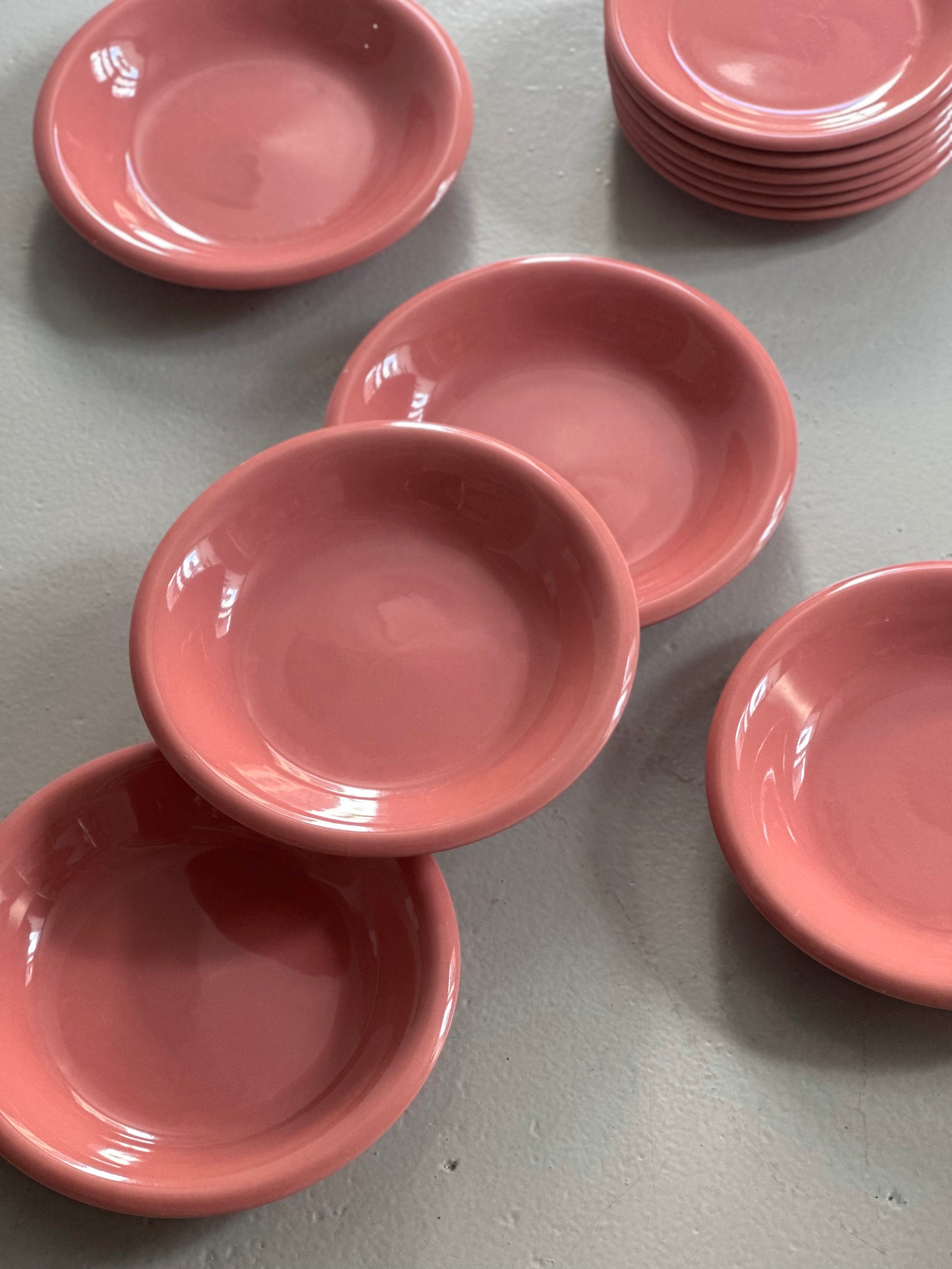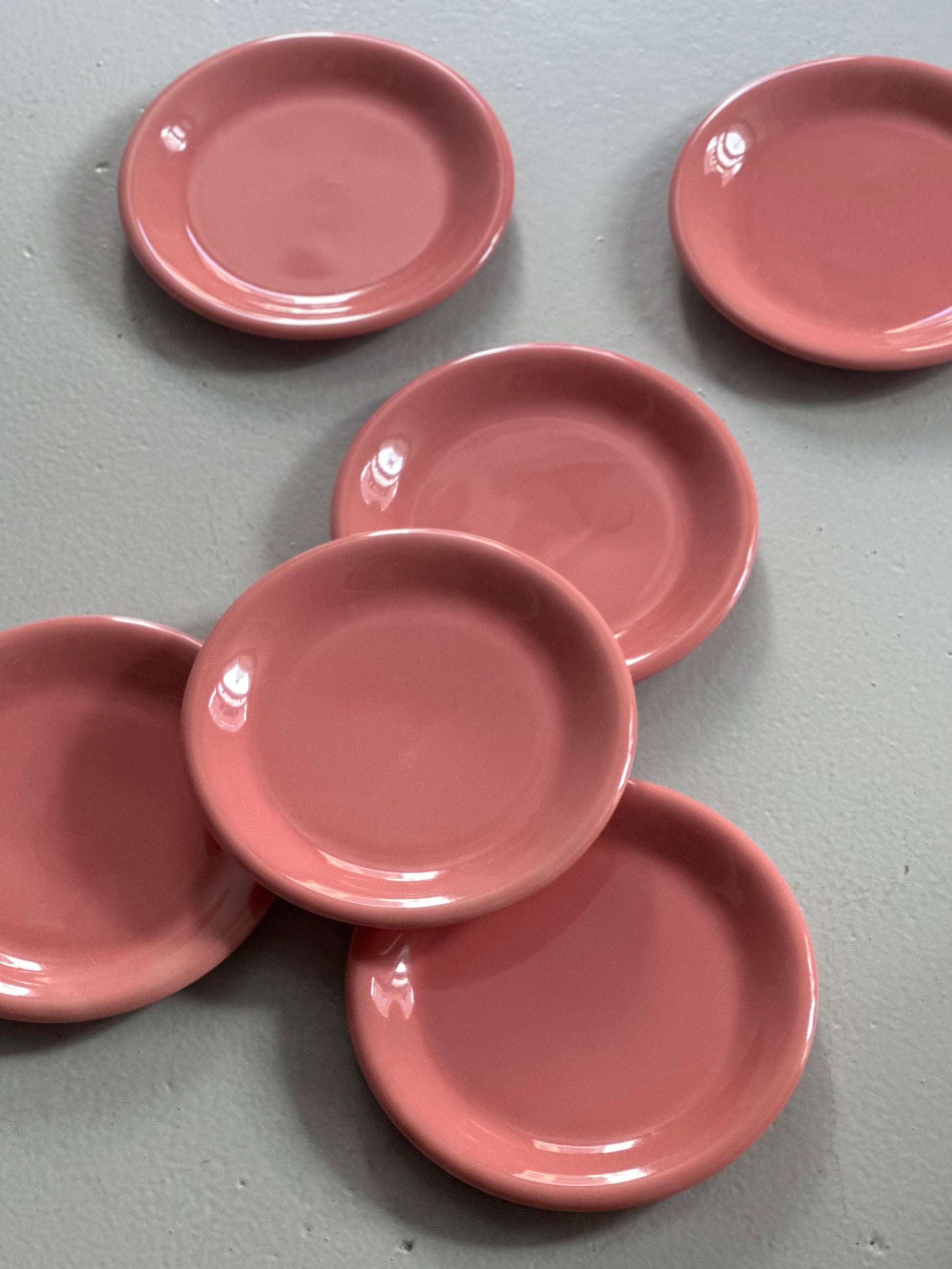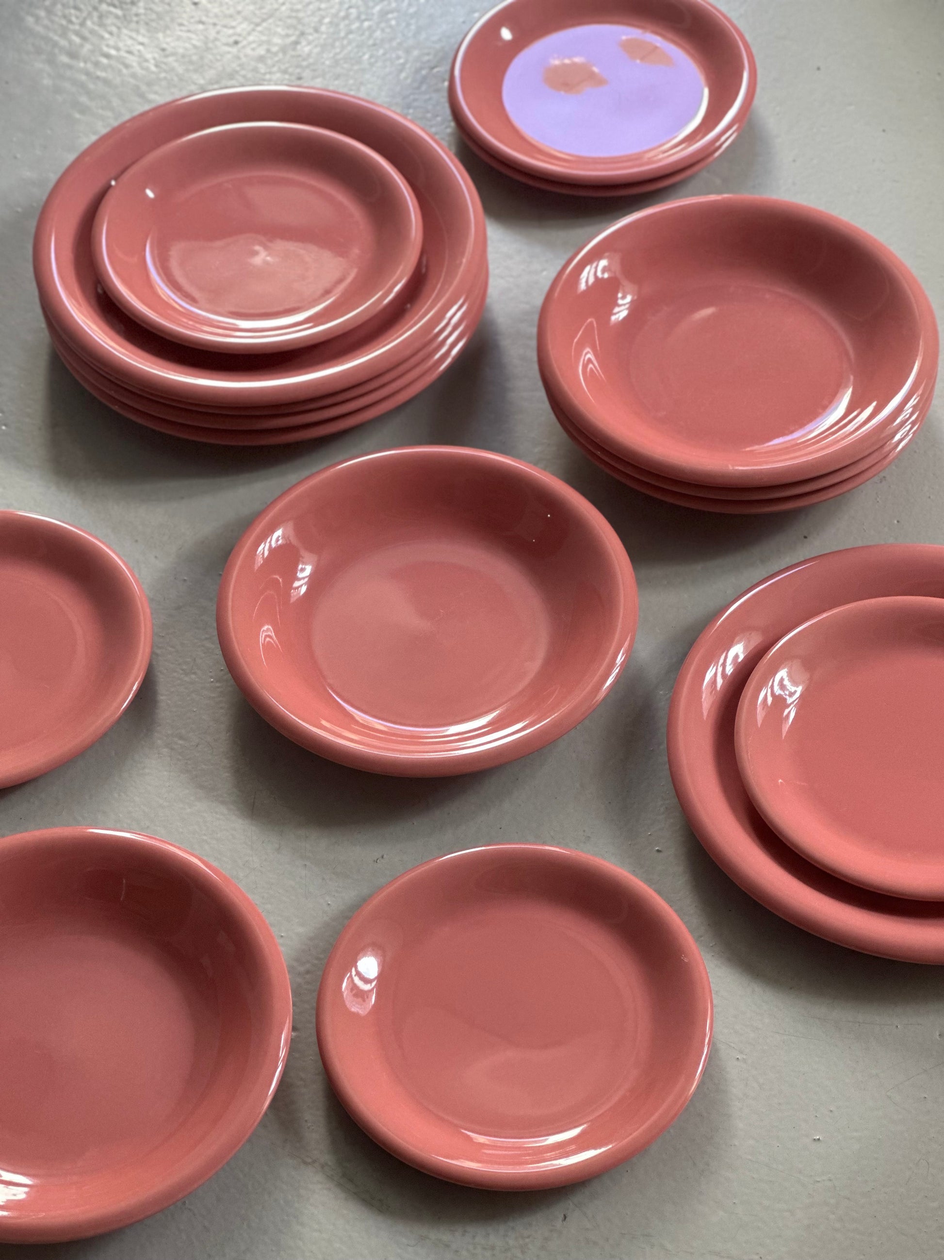 Chunky tallerkener med lyserød glasur. Stellet er fundet i Italien og alle delene er i flot stand uden skår og med kun alm lette brugsspor.