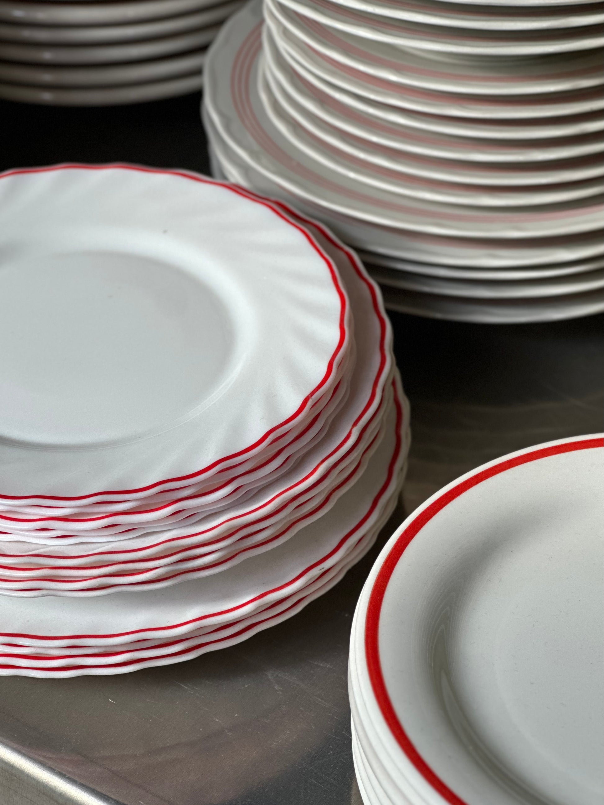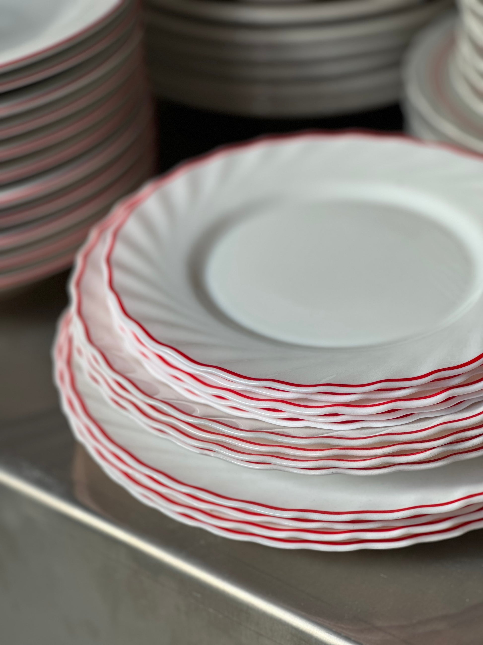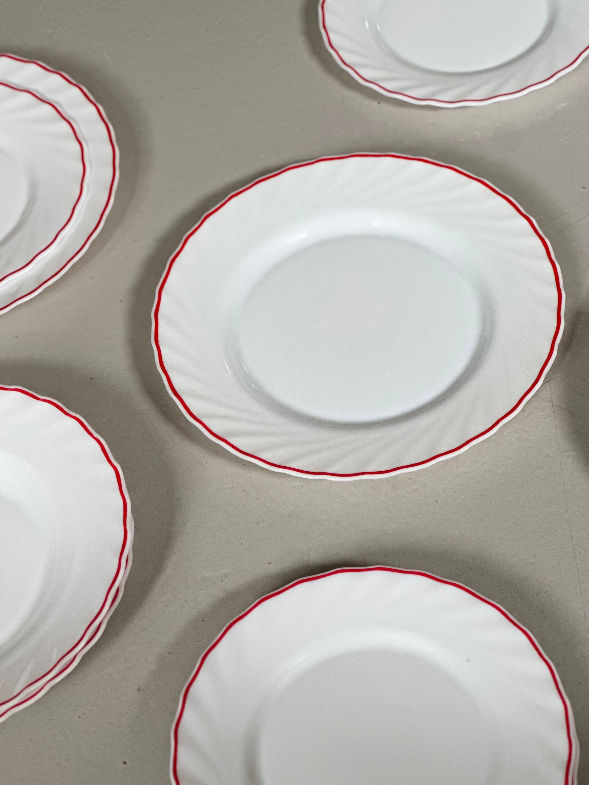 Franske bistro tallerkener i hvidt swirly opal glas med røde kanter. De er fundet i Italien og er alle i flot stand uden skår og med alm lette brugsspor (små skrab på den røde kant hist pist).