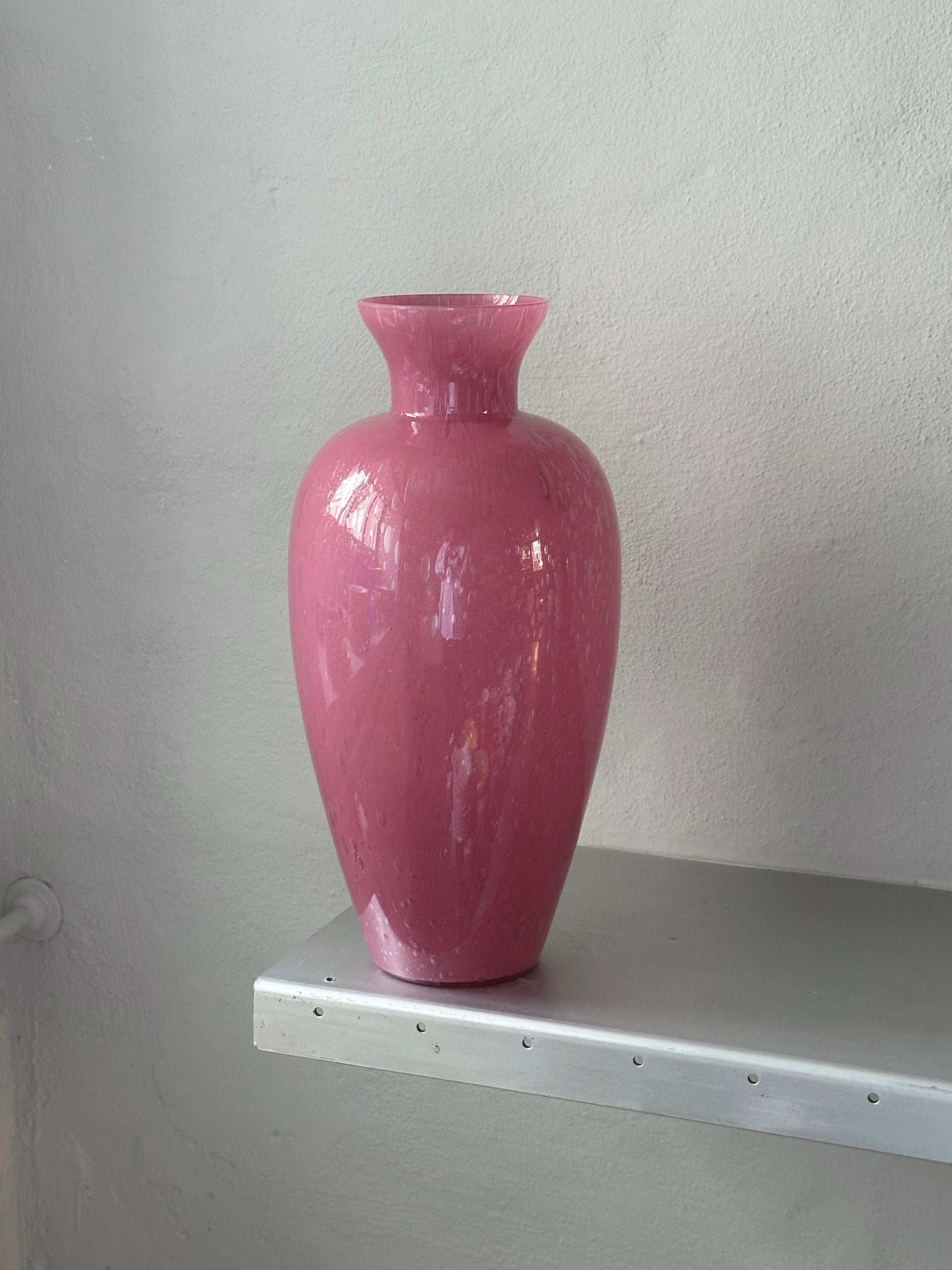 Kæmpe italiensk vase i tykt pink mundblæst glas spækket med luftbobler. Den er fundet i Italien. Den er i fantastisk flot stand uden skår og kun alm meget lette brugsspor.