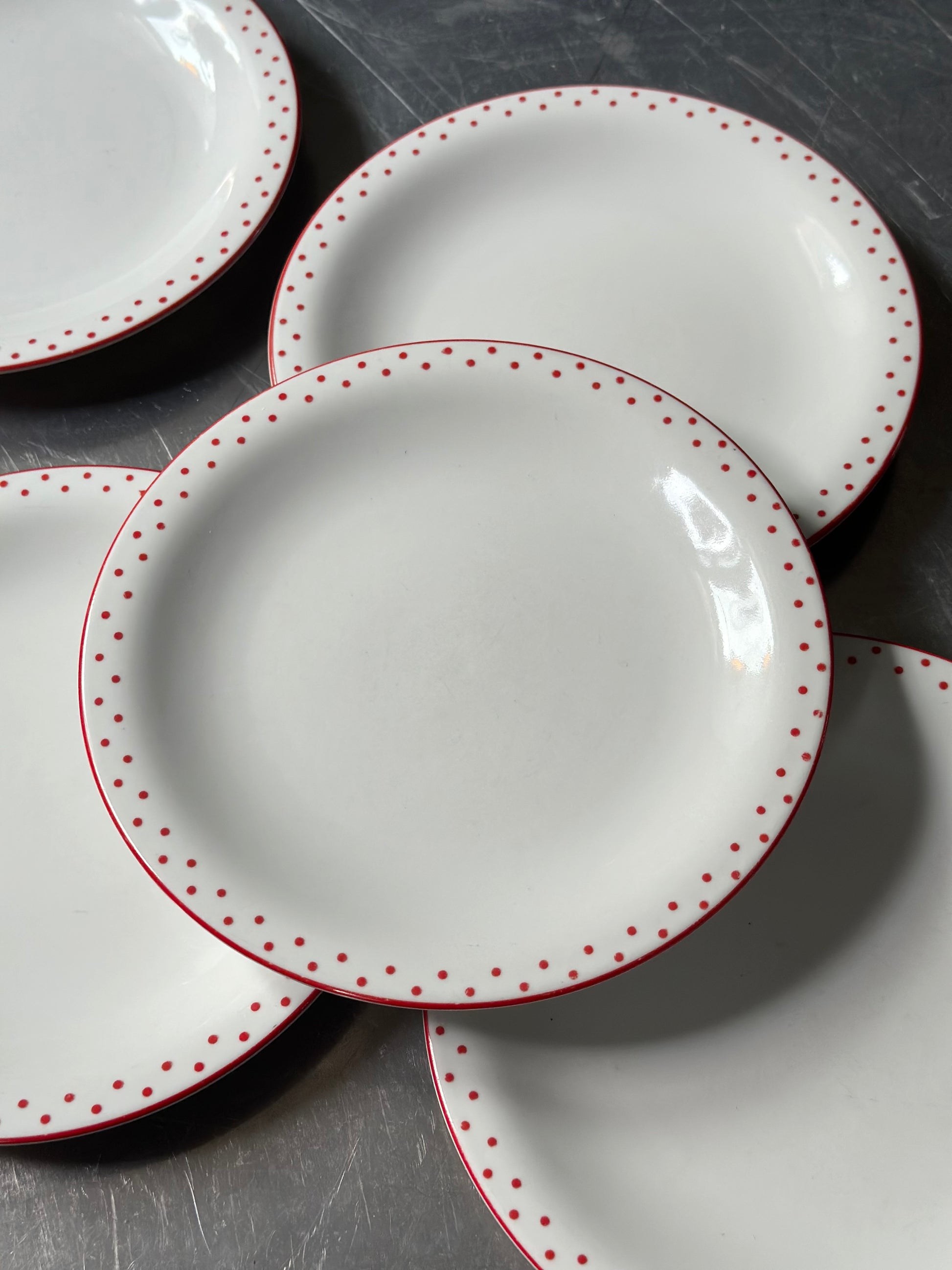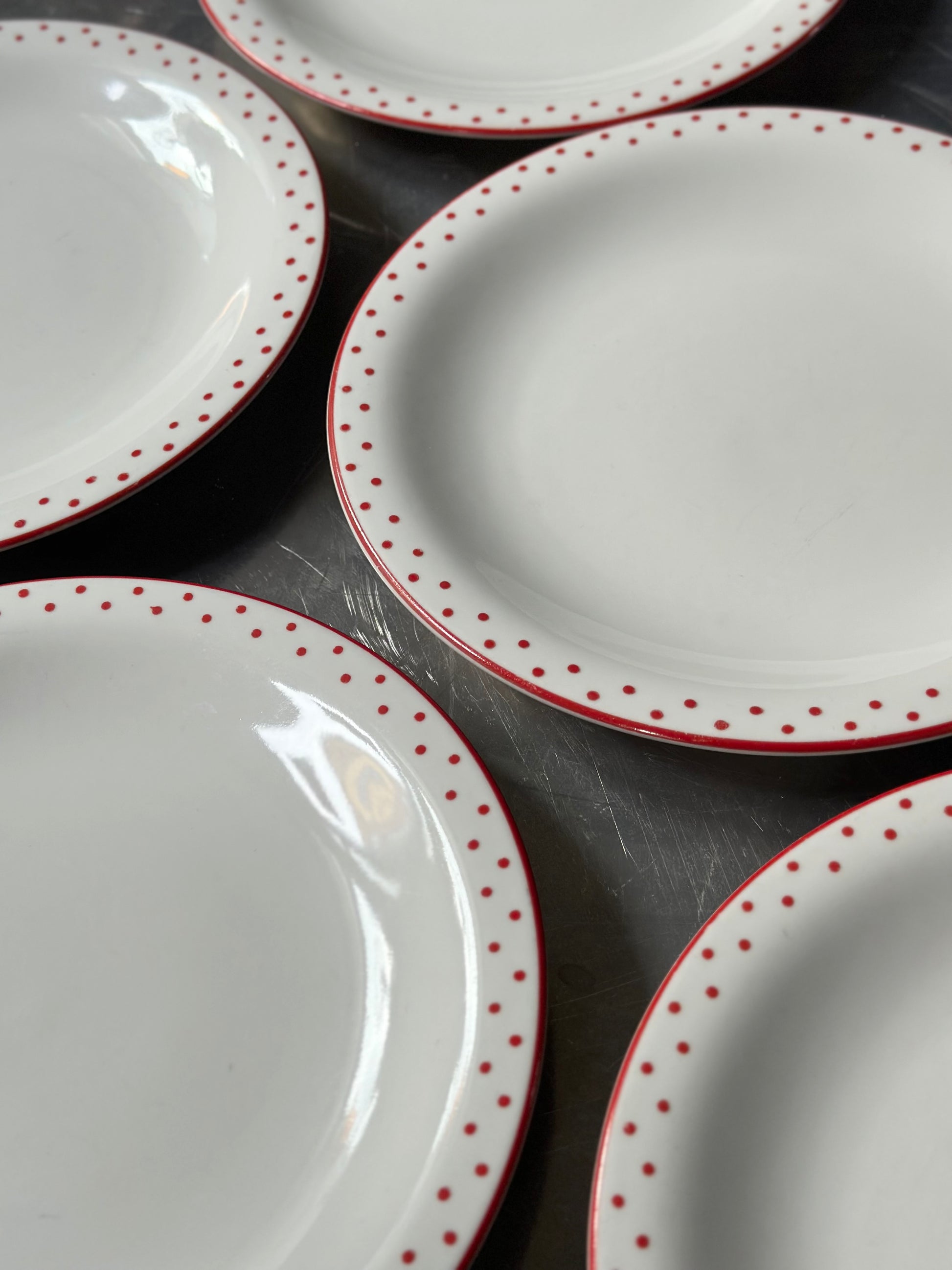 Italienske vintage frokost tallerkener i med røde prikkede bistro kant fundet i Italien. De er alle i flot stand uden skår og med kun alm lette brugsspor.