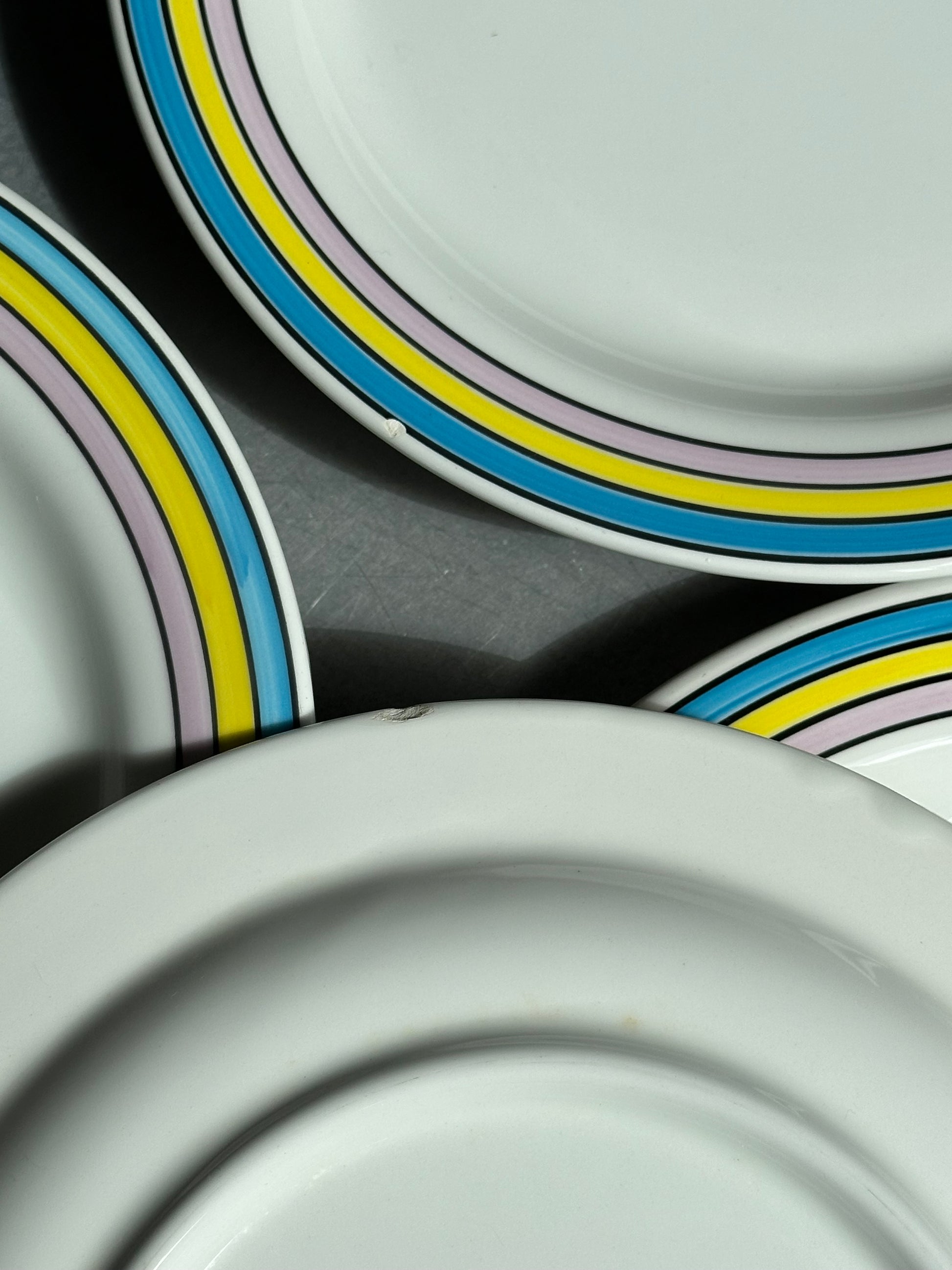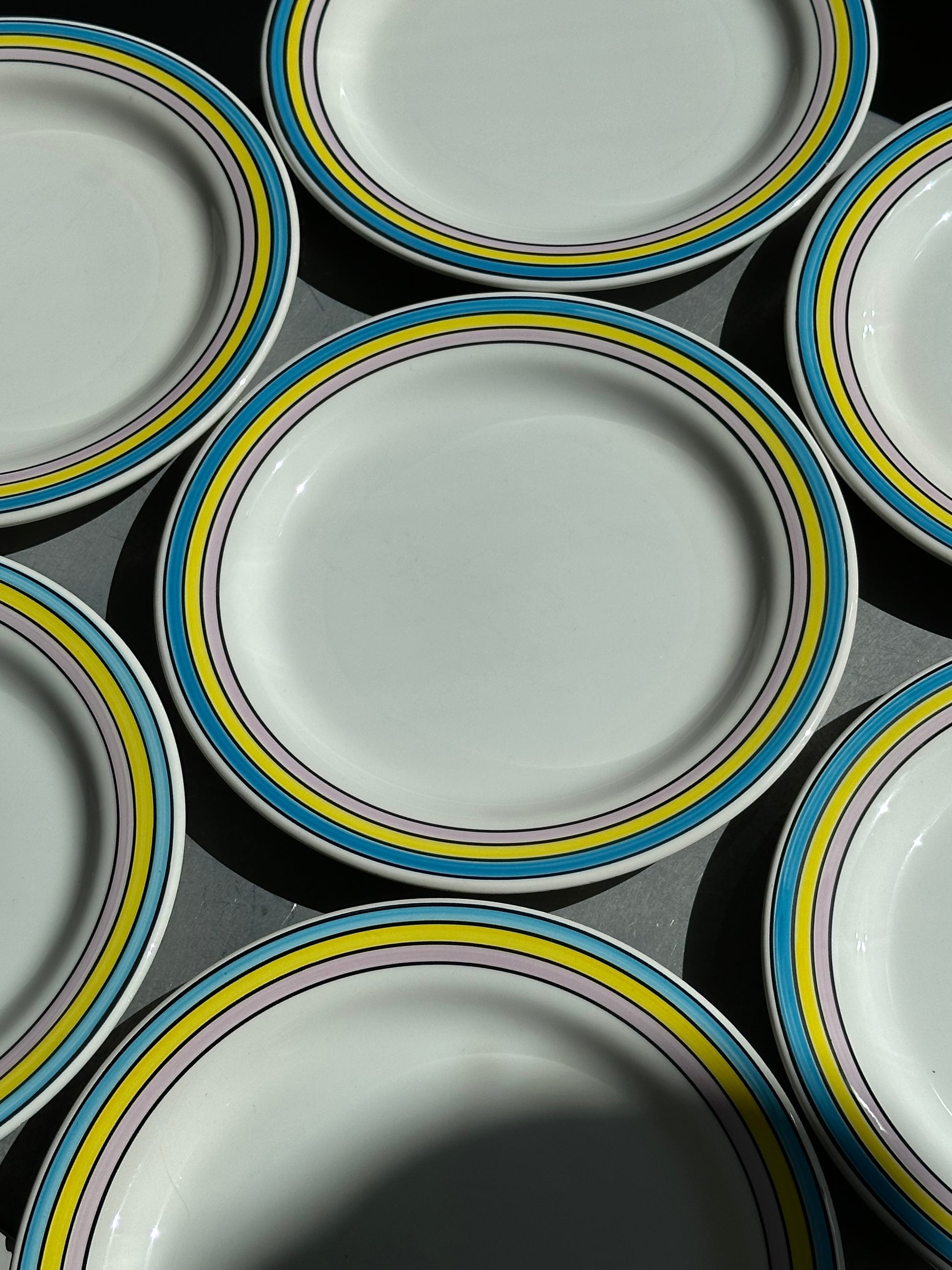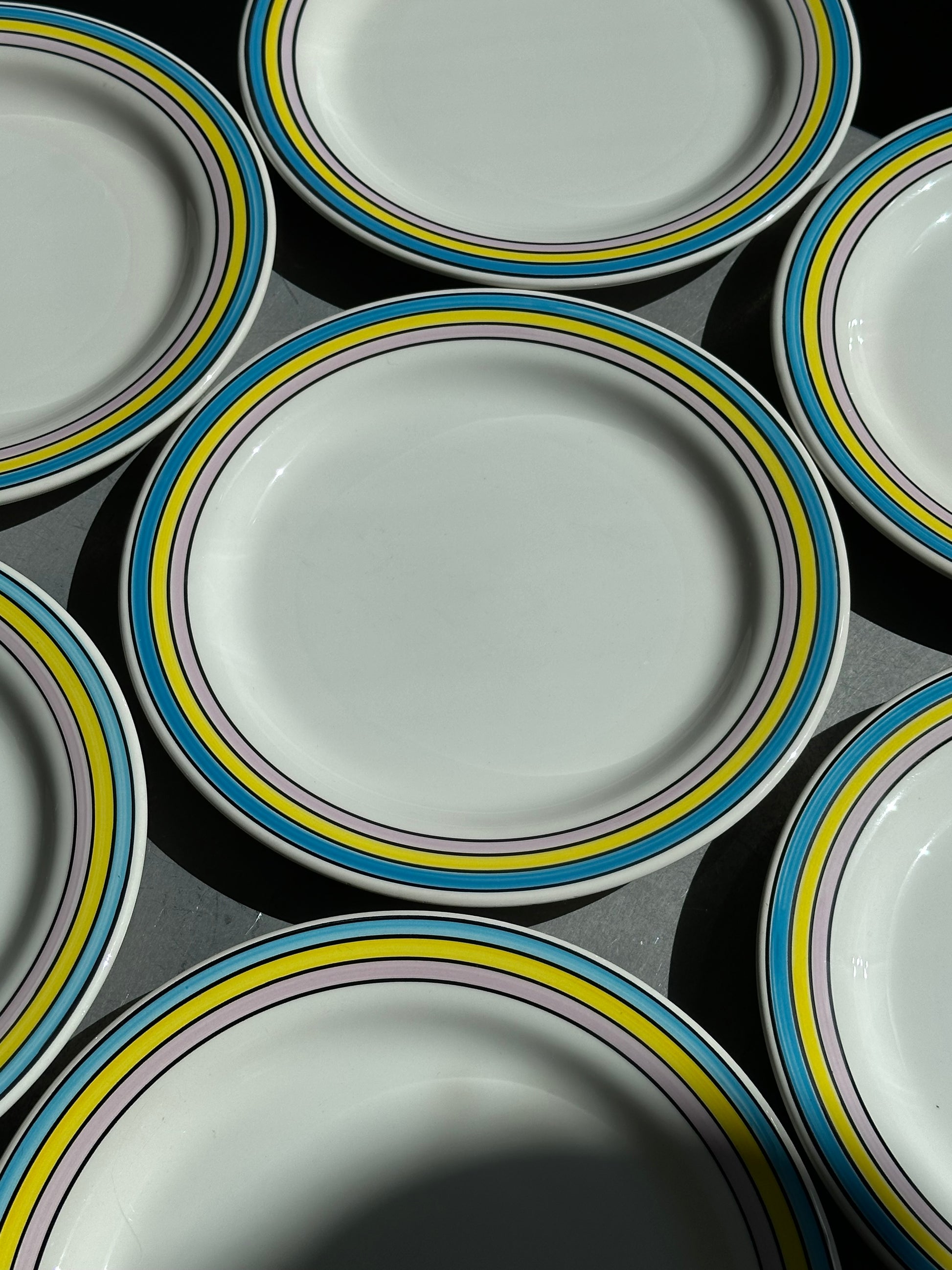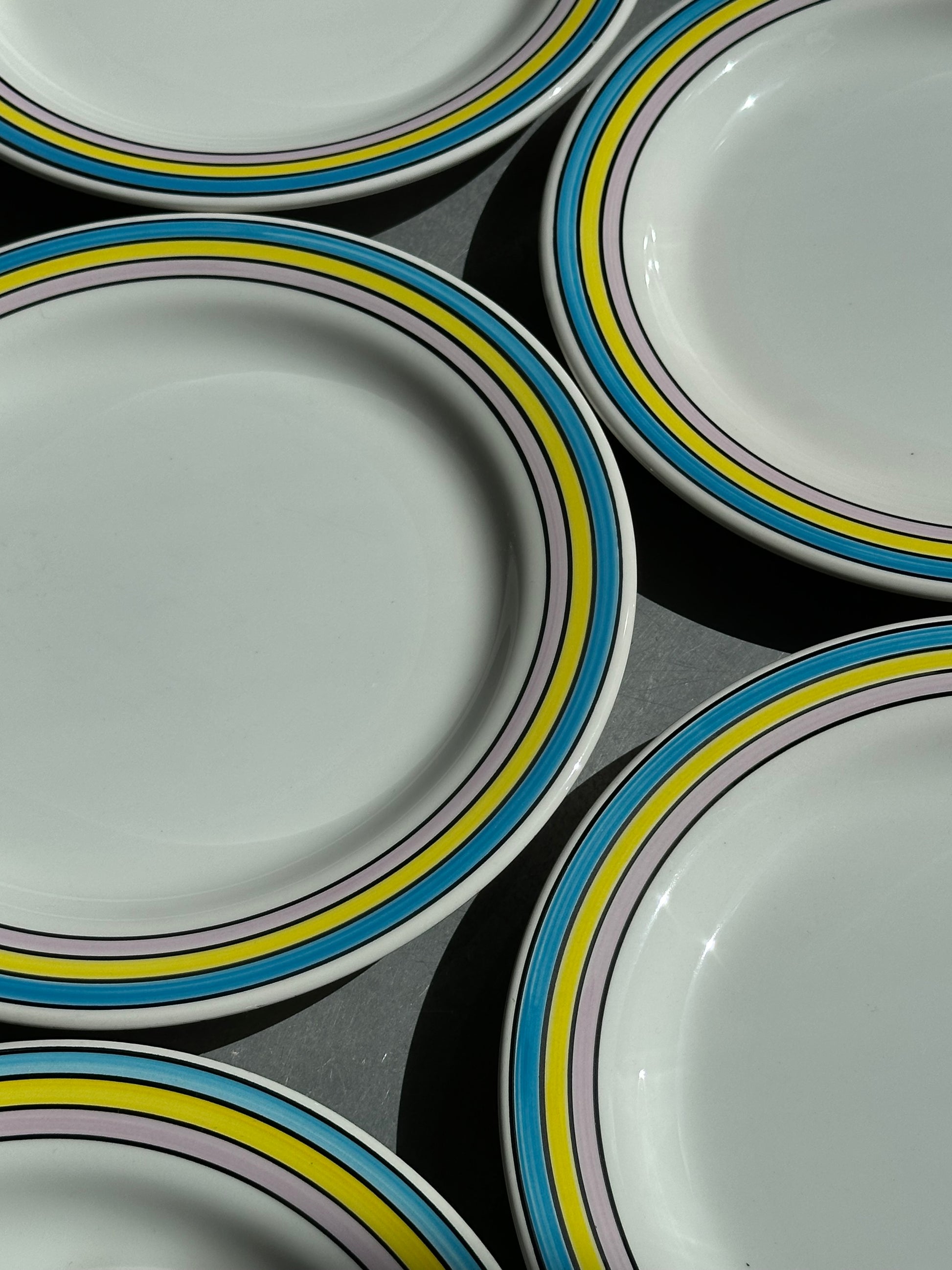 Italienske flade middagstallerkener med stribet kant - de er i flot vintage stand med små enkelte nag hist pist (se billede)