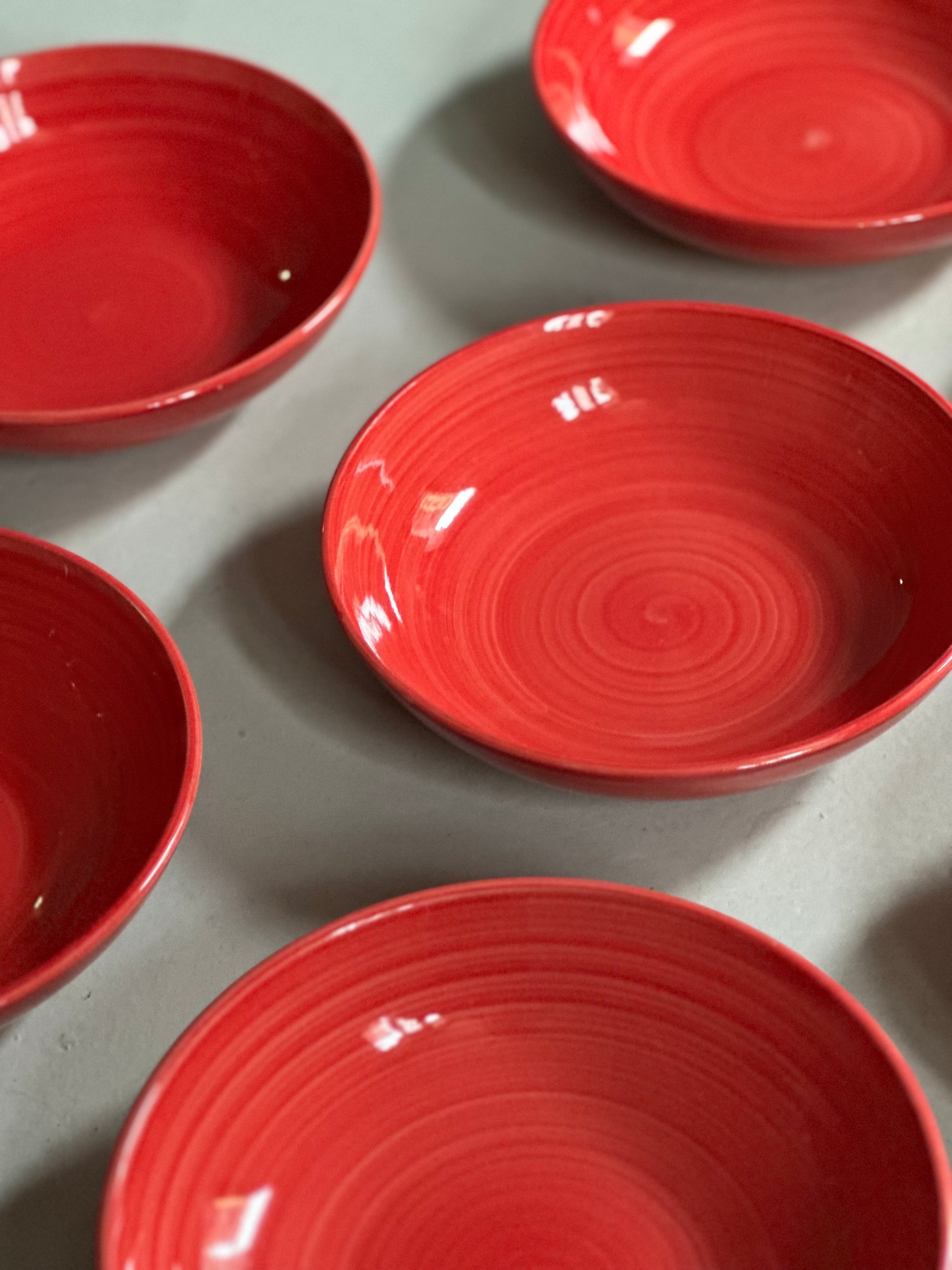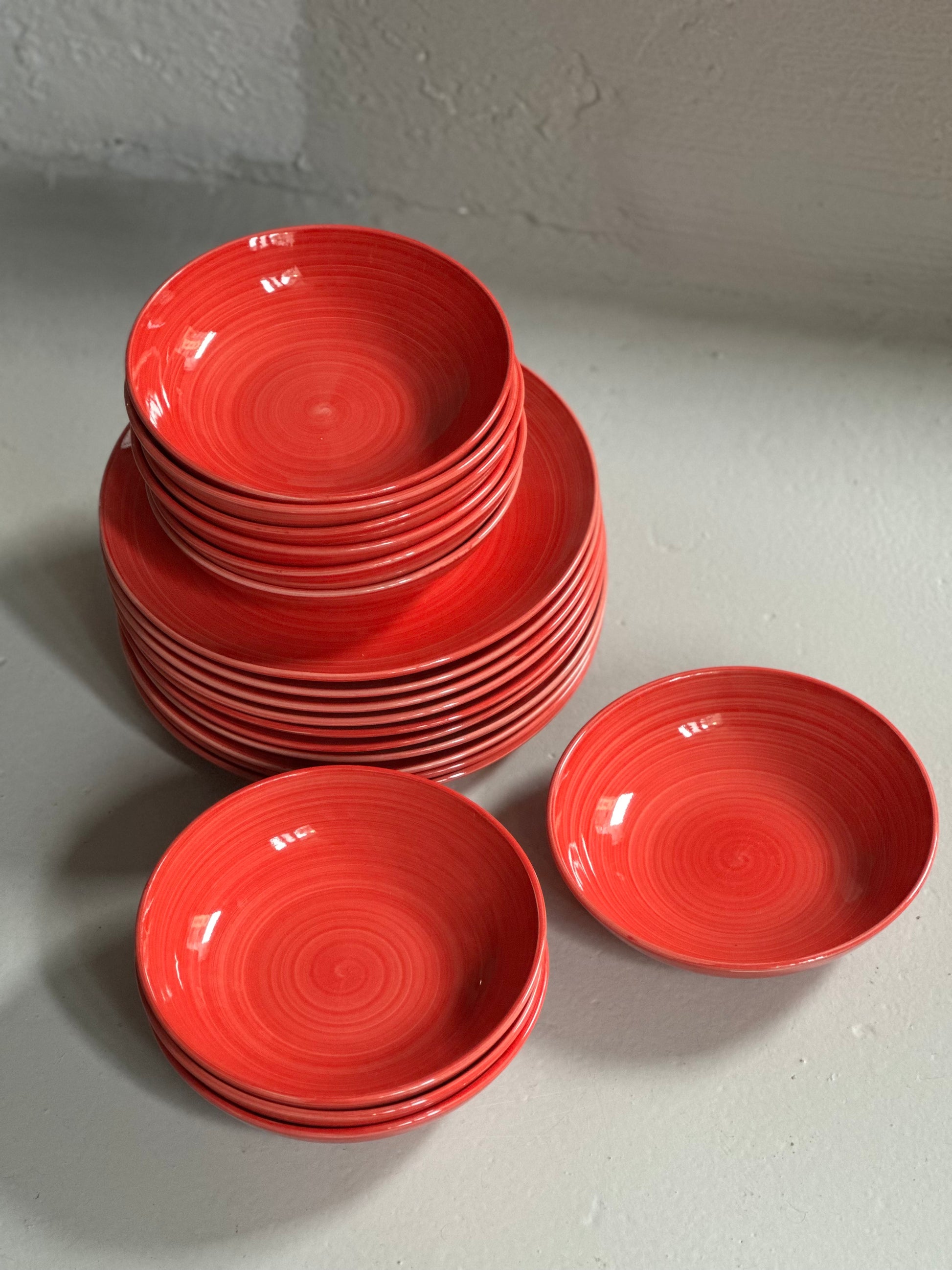 Italienske swirl tallerkener i rød. De er fundet i Italien og er alle i flot stand uden skår og med kun alm lette brugsspor.