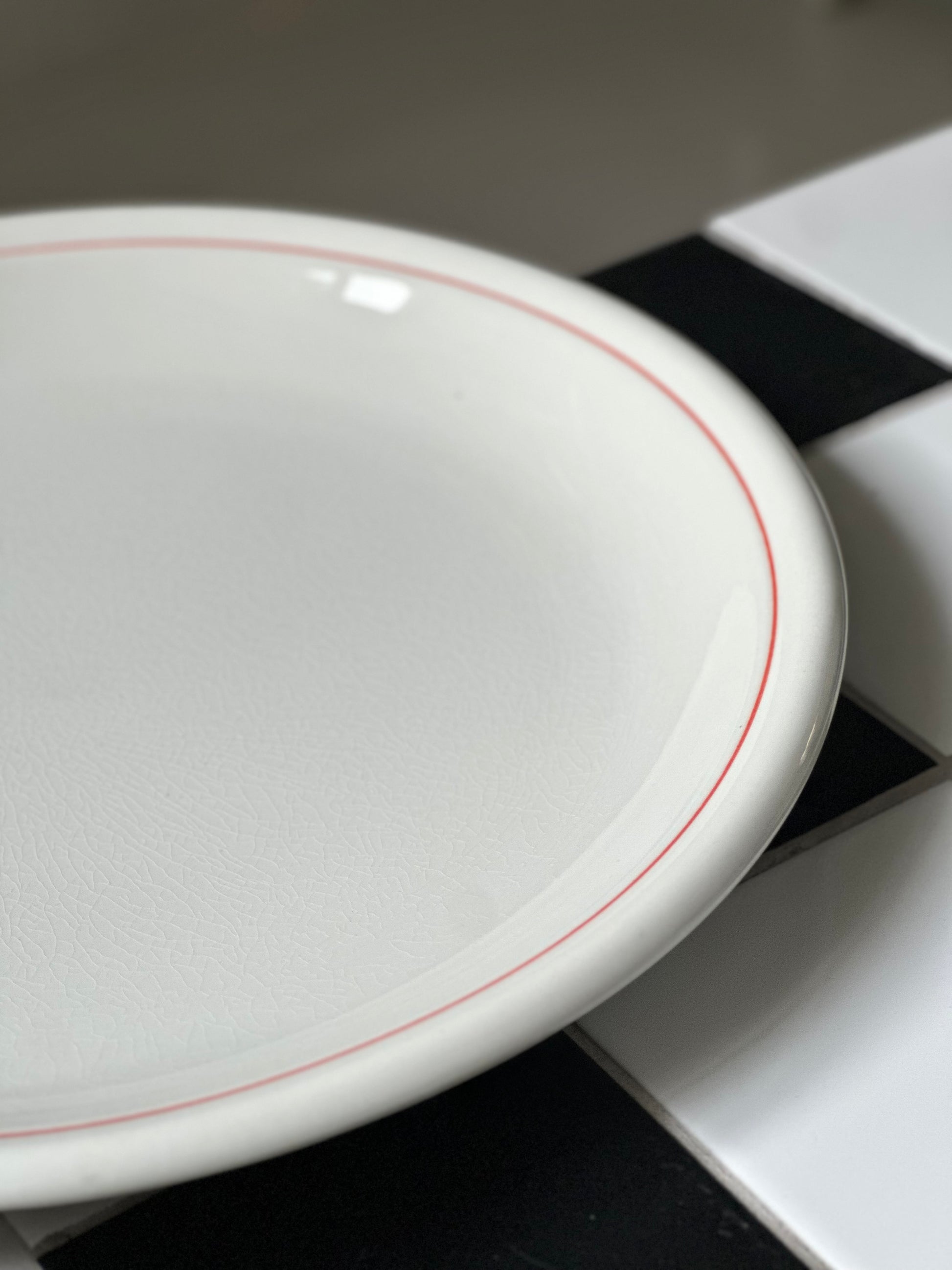 Italiensk vintage bistro fad hvidt porcelæn med røs kant. Det er fundet i Italien og er i flot stand uden skår.