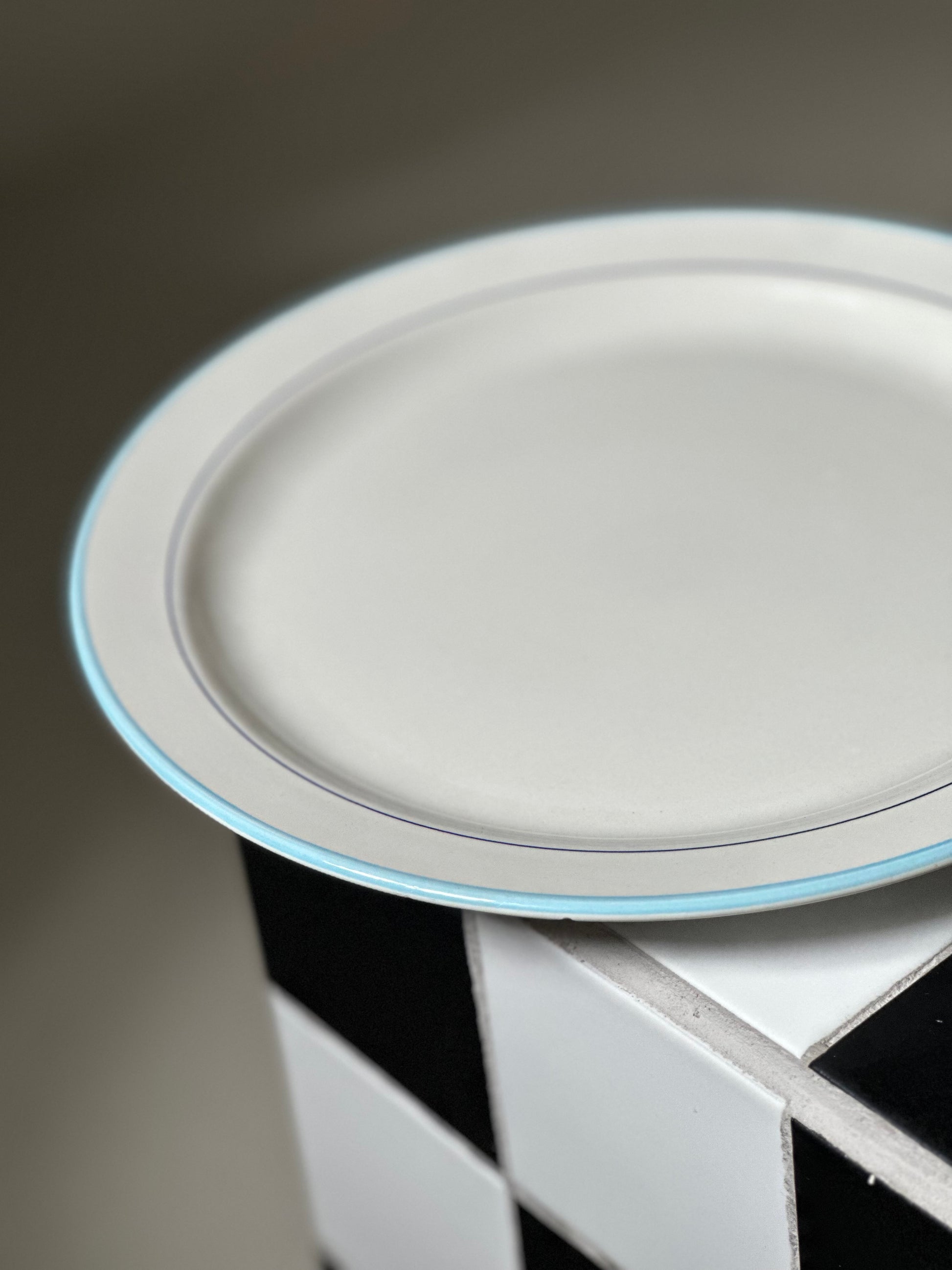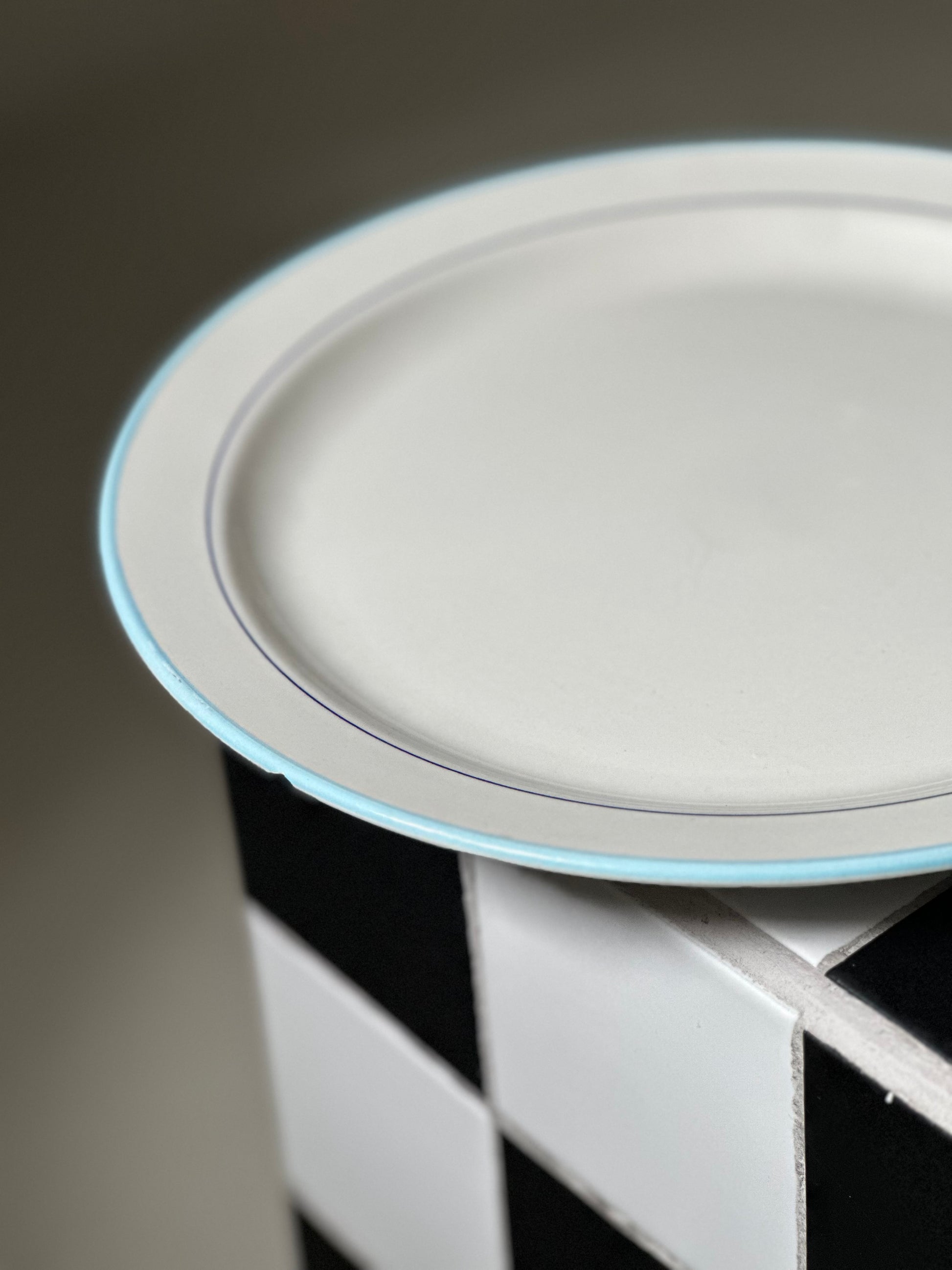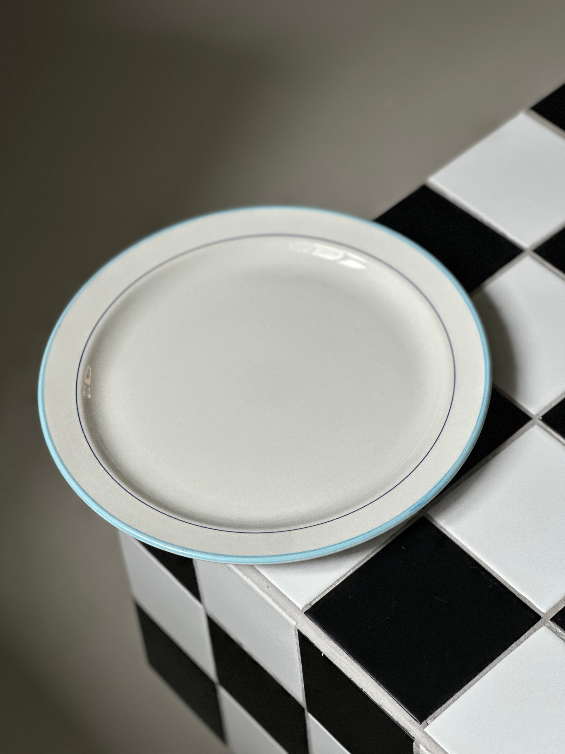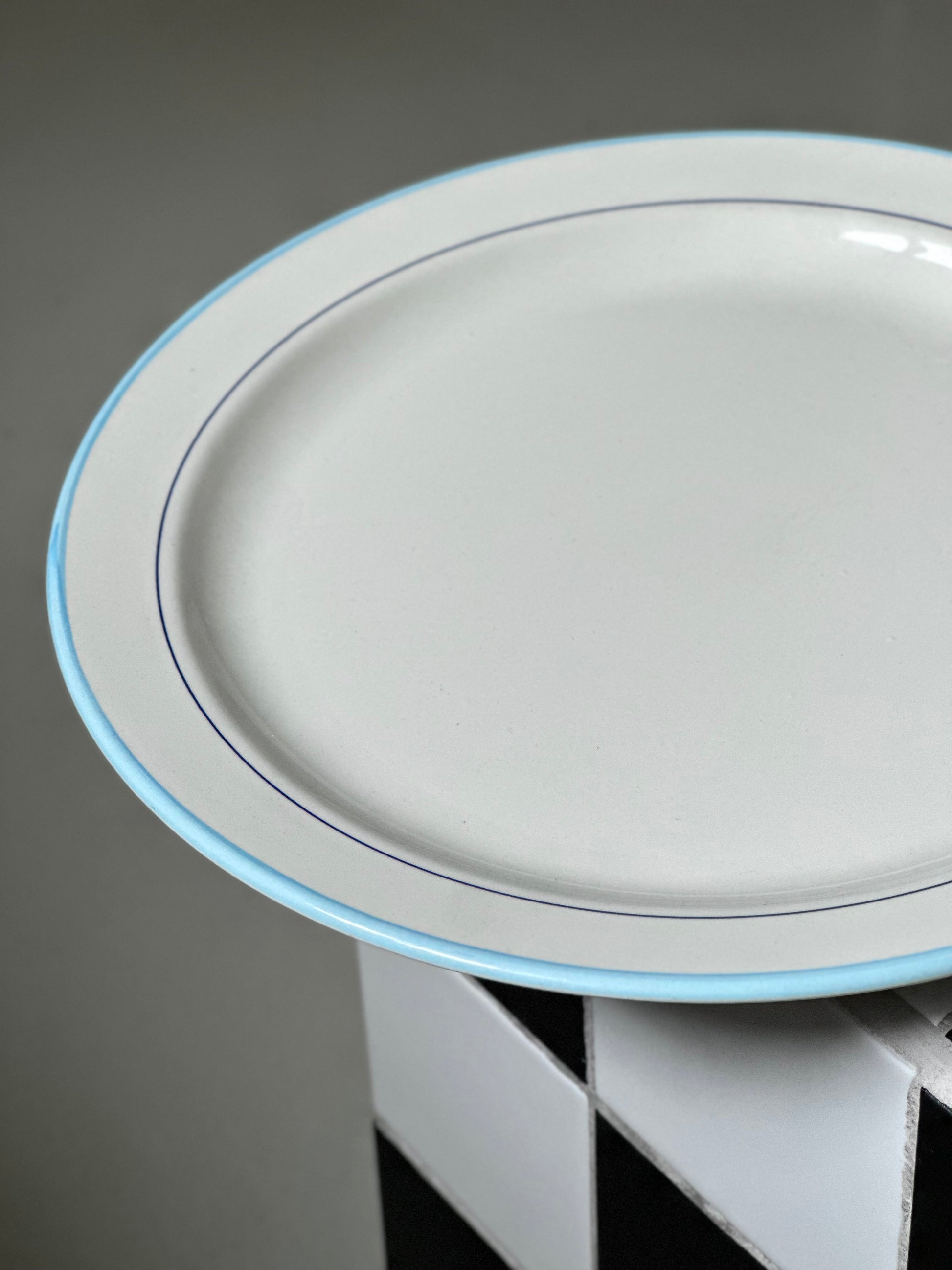Italiensk vintage bistro fad hvidt porcelæn med lyseblå og blå kant. Det er fundet i Italien og er i flot stand med et enkelt skår under kanten (se billede).