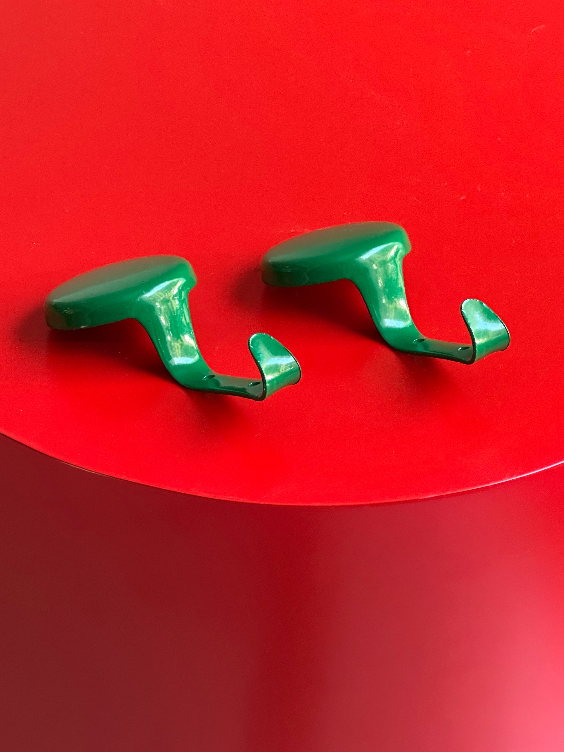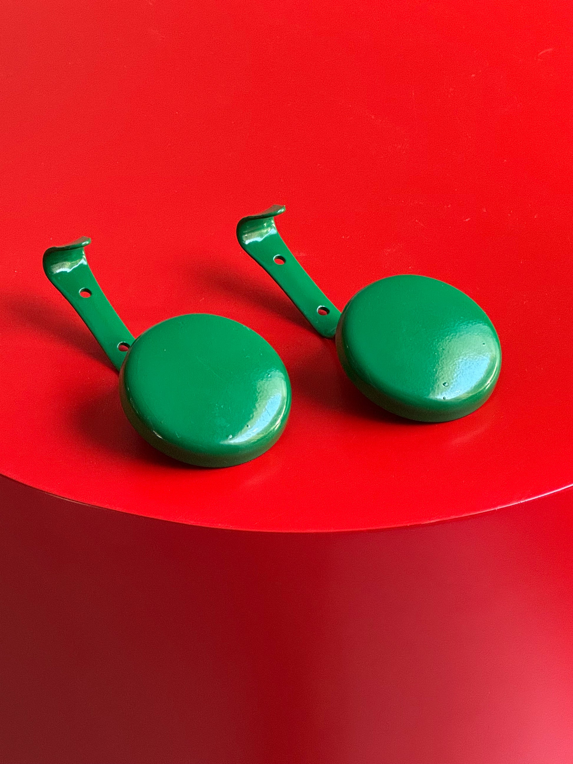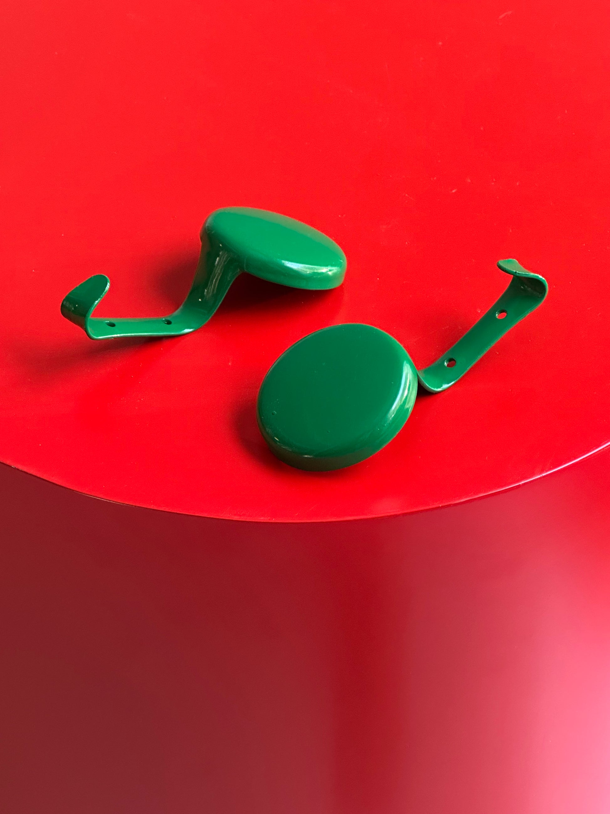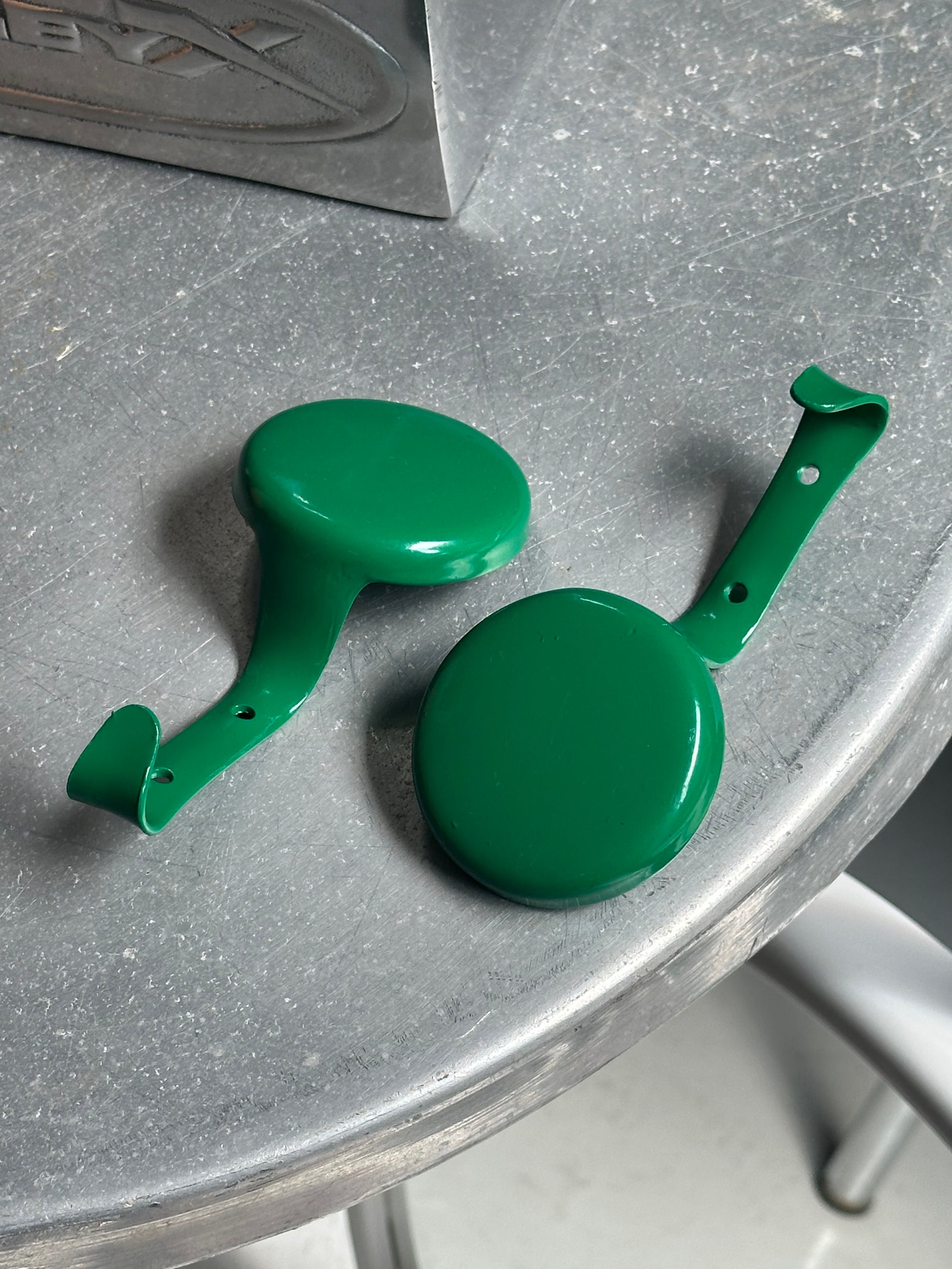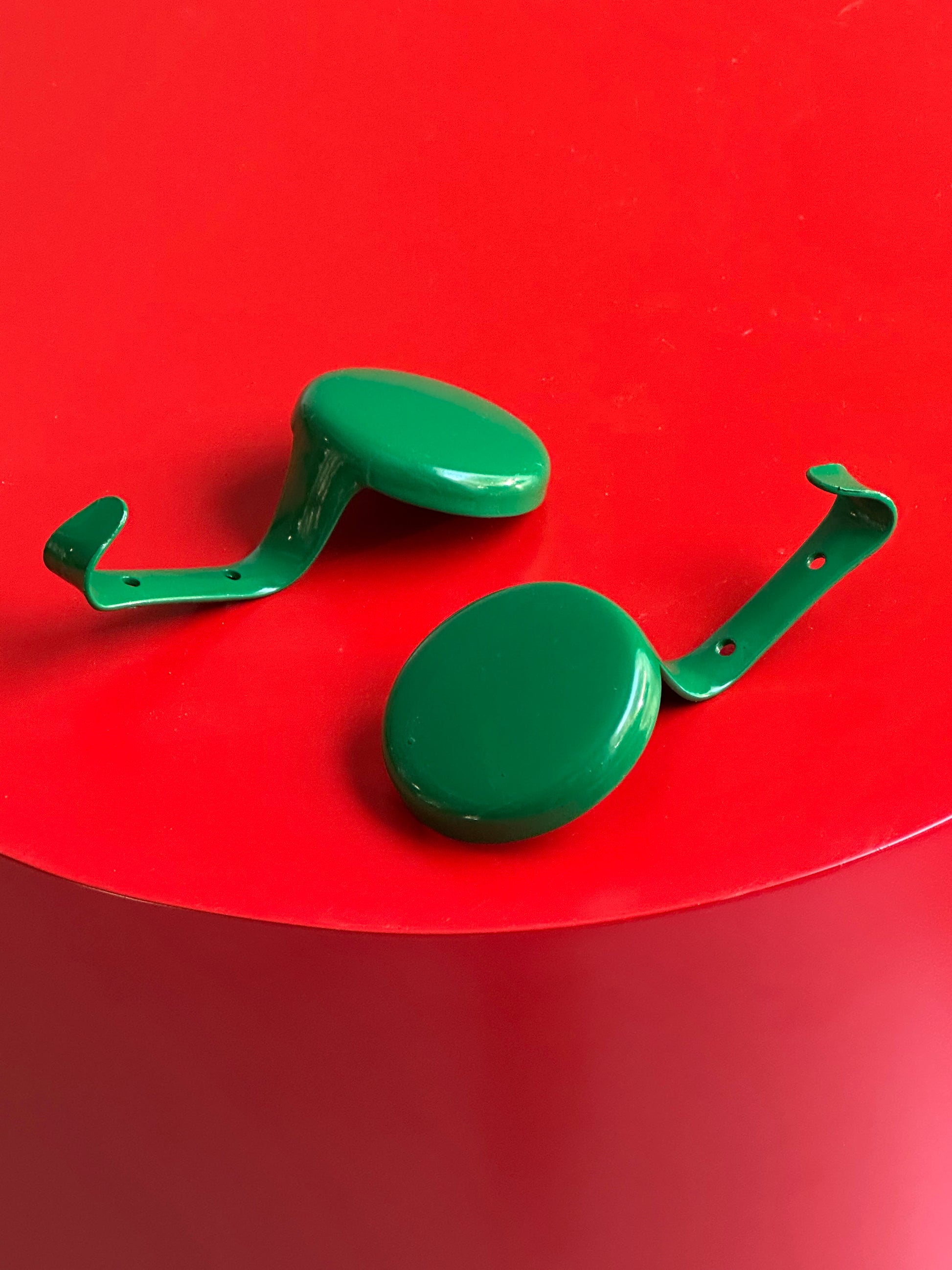 2 grønne vintage knager i grønlakeret metal (original lakering). De er fundet i Lucca i Italien og er begge i flot stand med lette brugsspor.