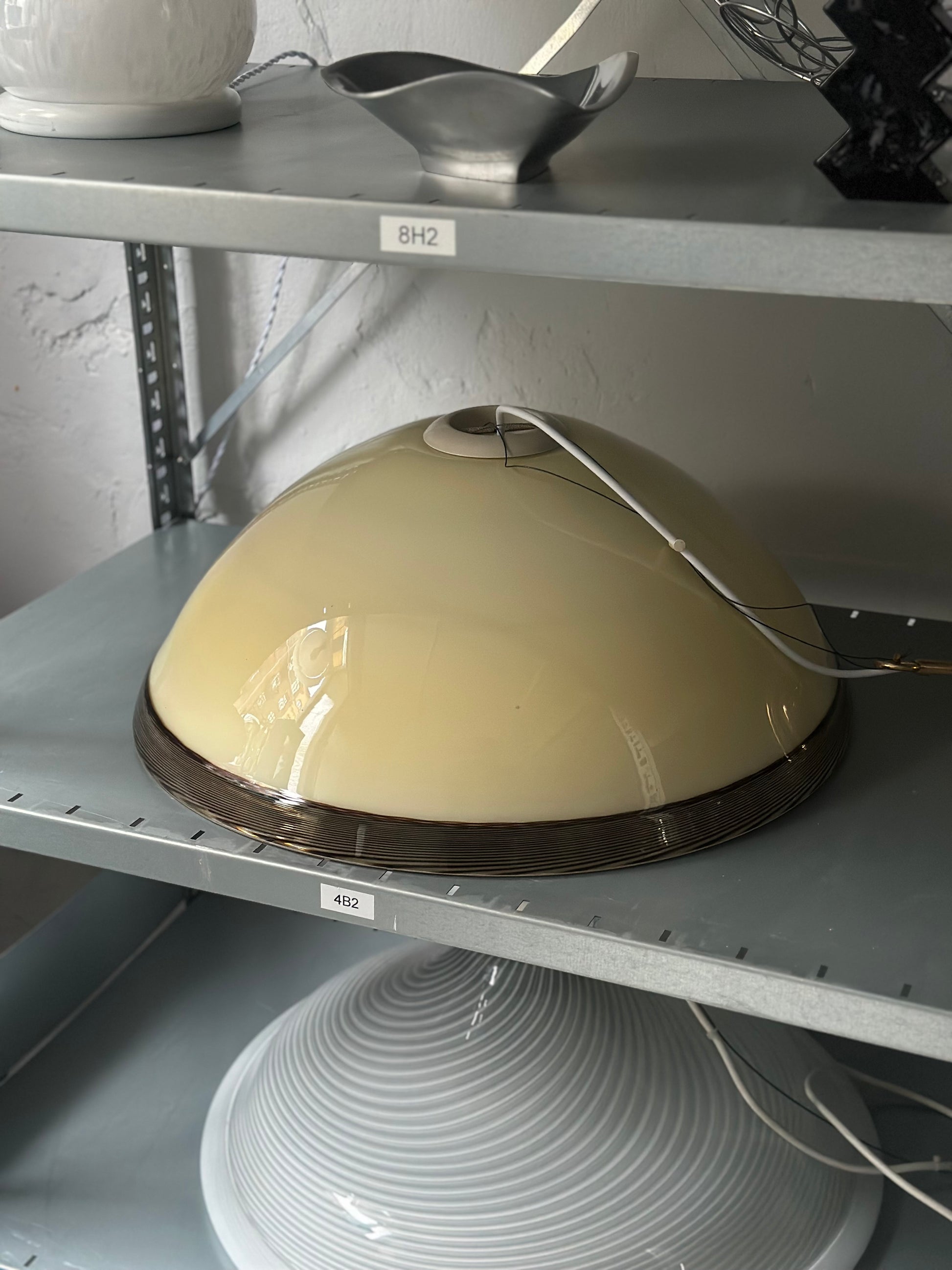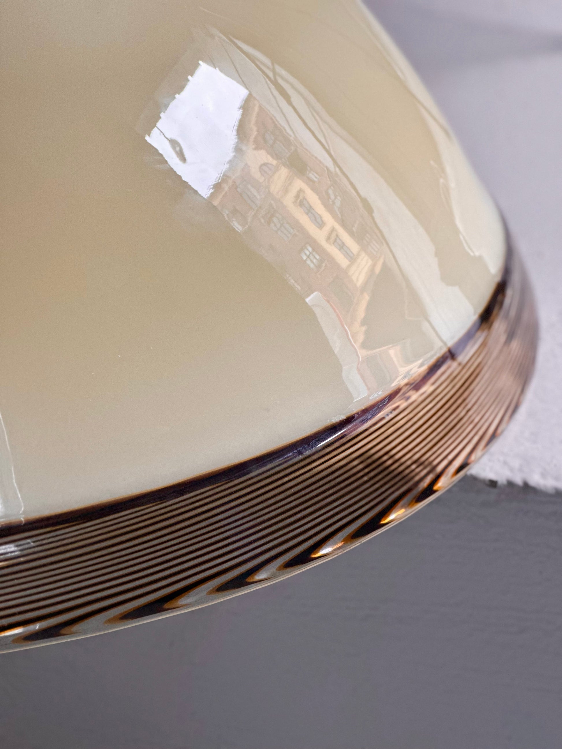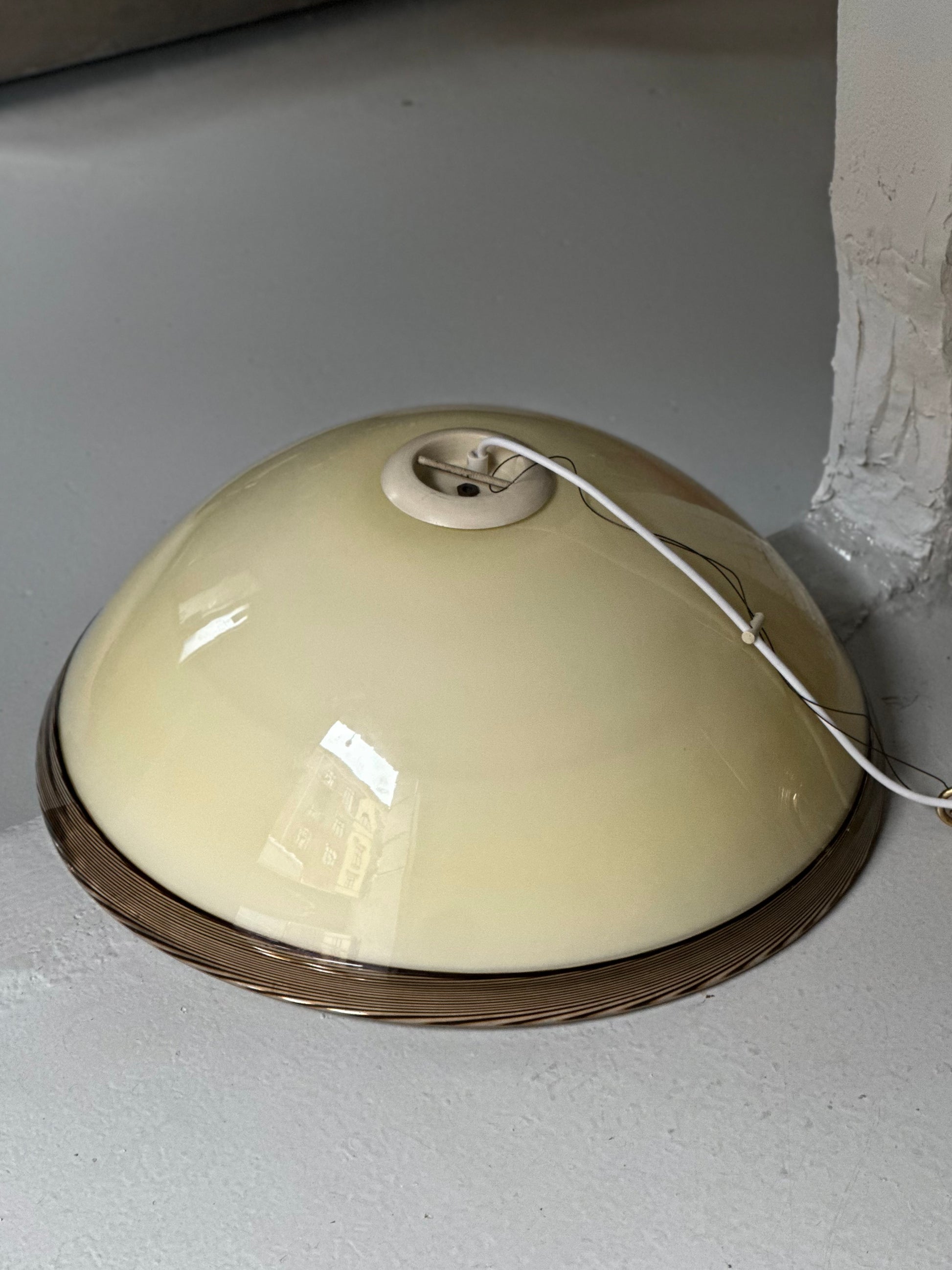Stor vintage Murano pendel i tykt cremefarvet glas med kant i brun swirl. Den er fundet i Italien og er i super flot stand uden skår. Den har fået ny frisk ledning.