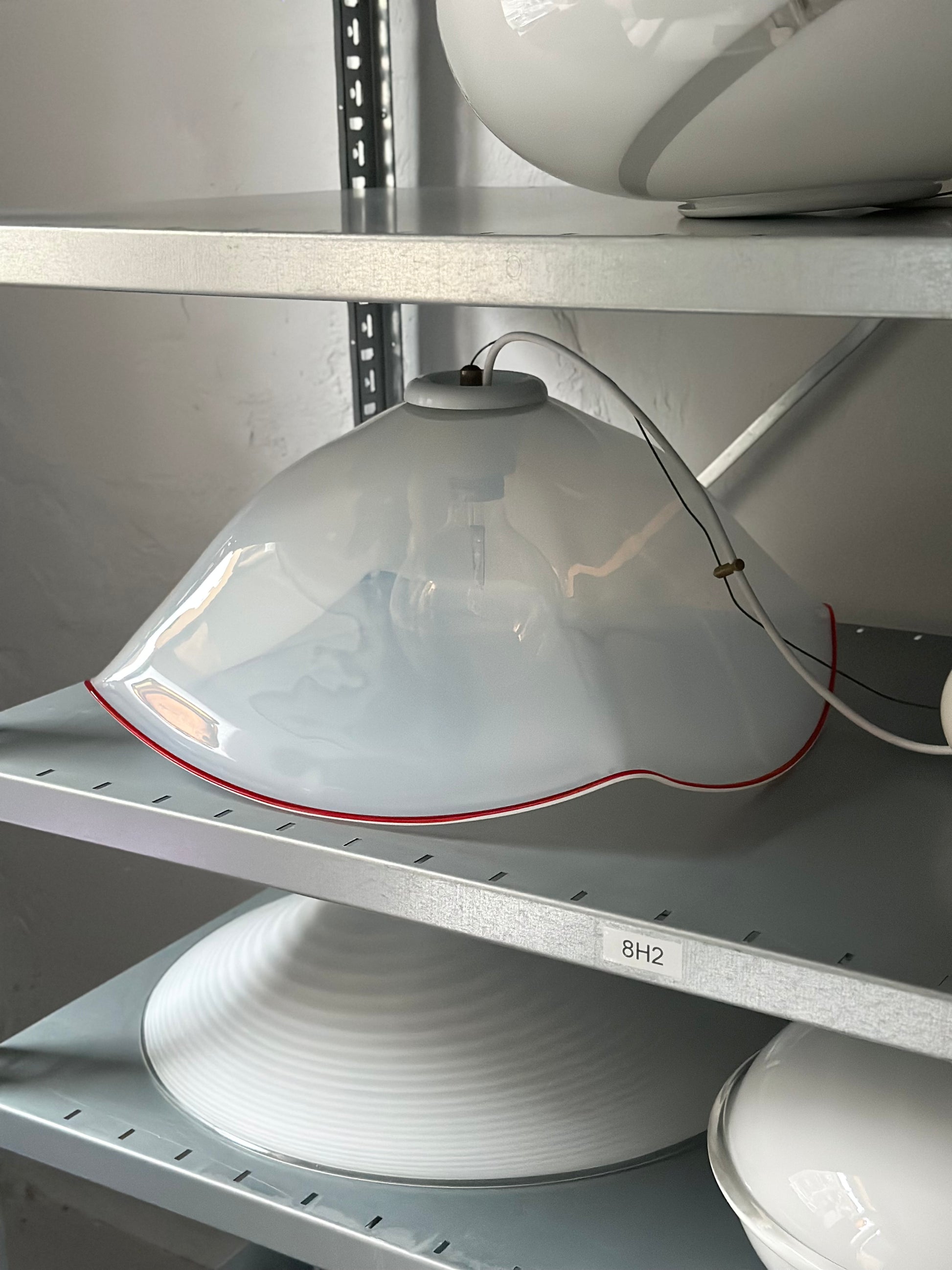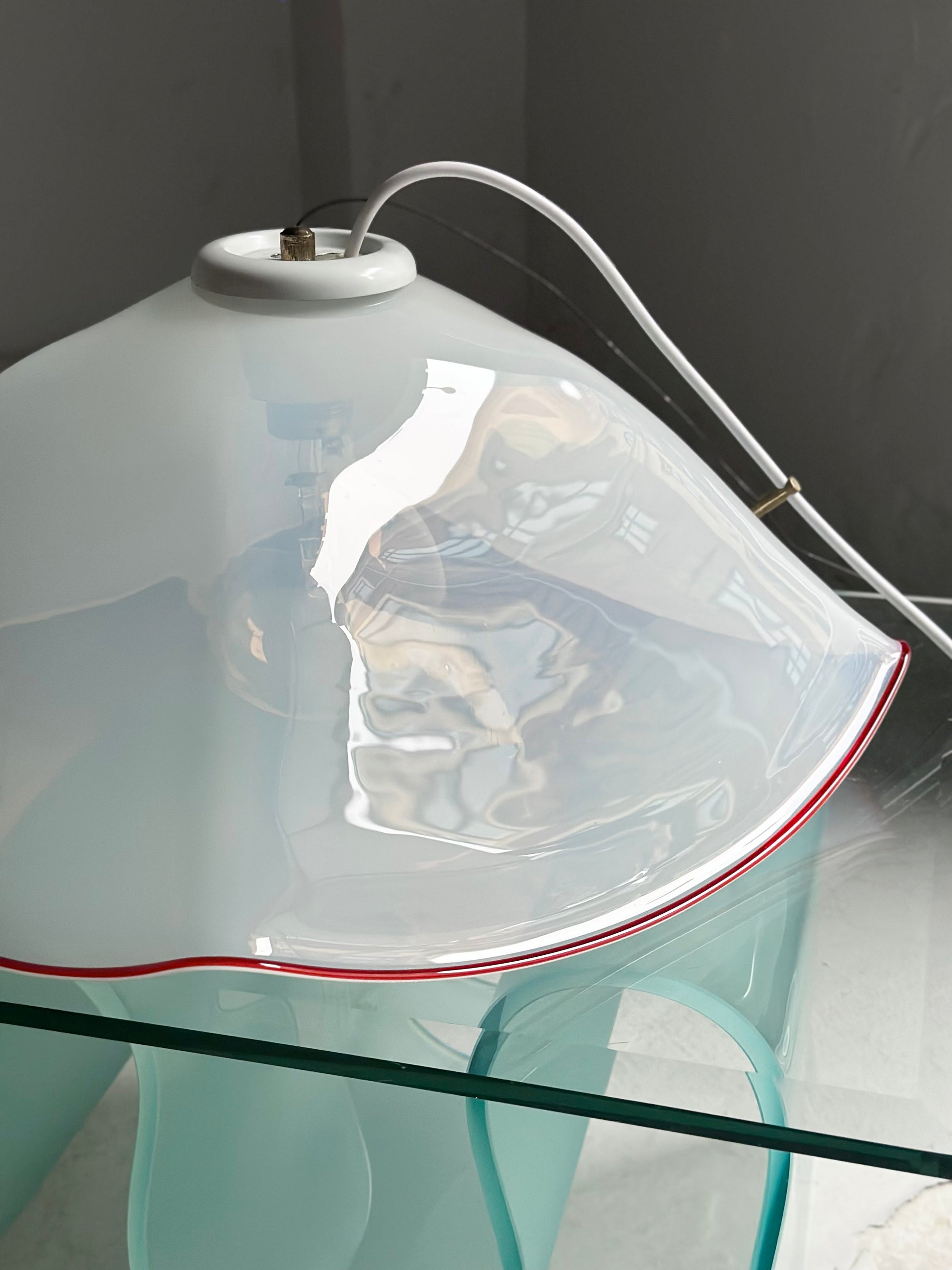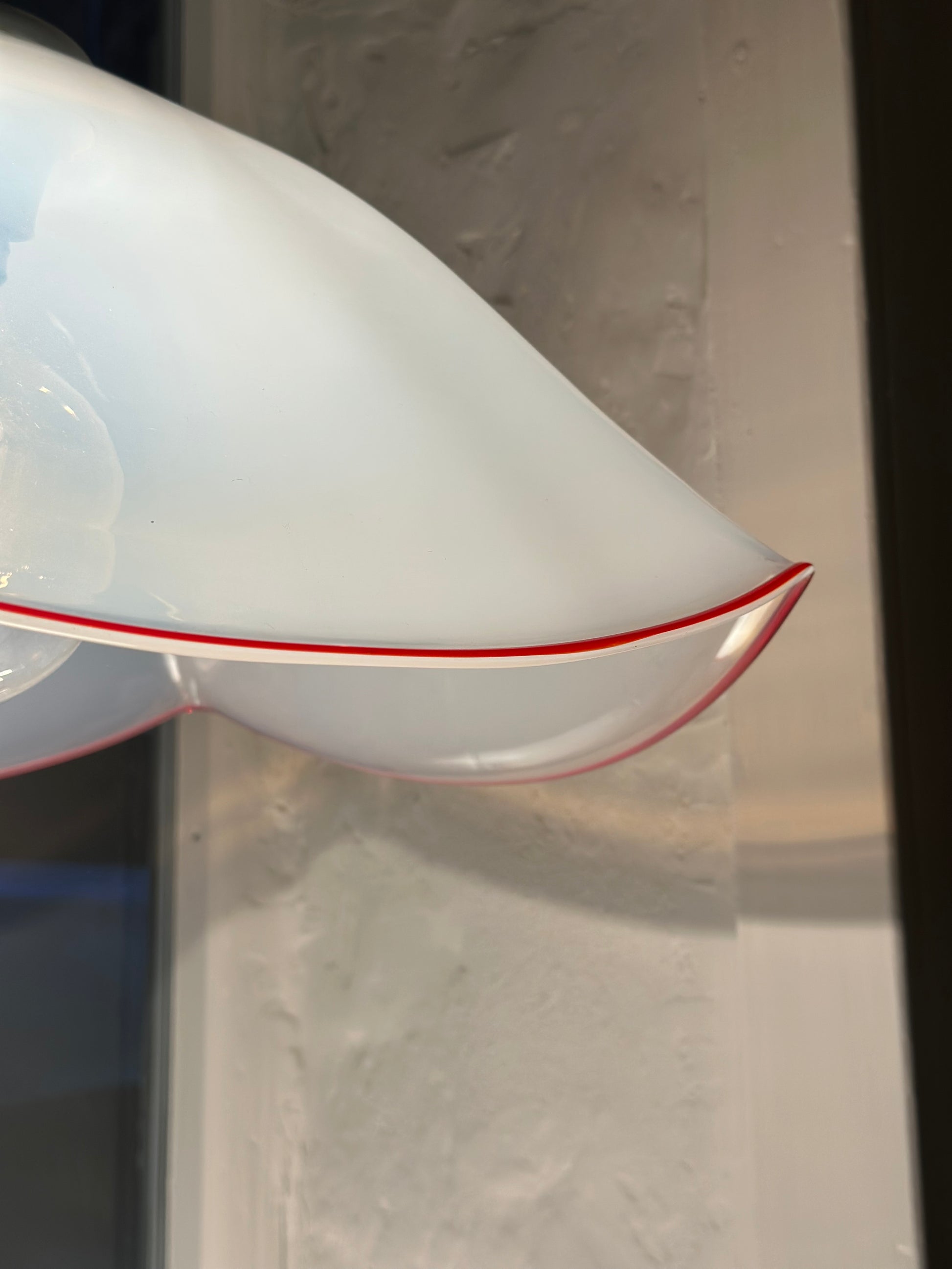 Vintage Murano lampe i bølget design. Den er fundet i Italien og er i mælket halv-transprent hvidt glas og med rød kontrast kant. Den er i fænomenal flot stand uden skår. Den har fået ny frisk ledning.