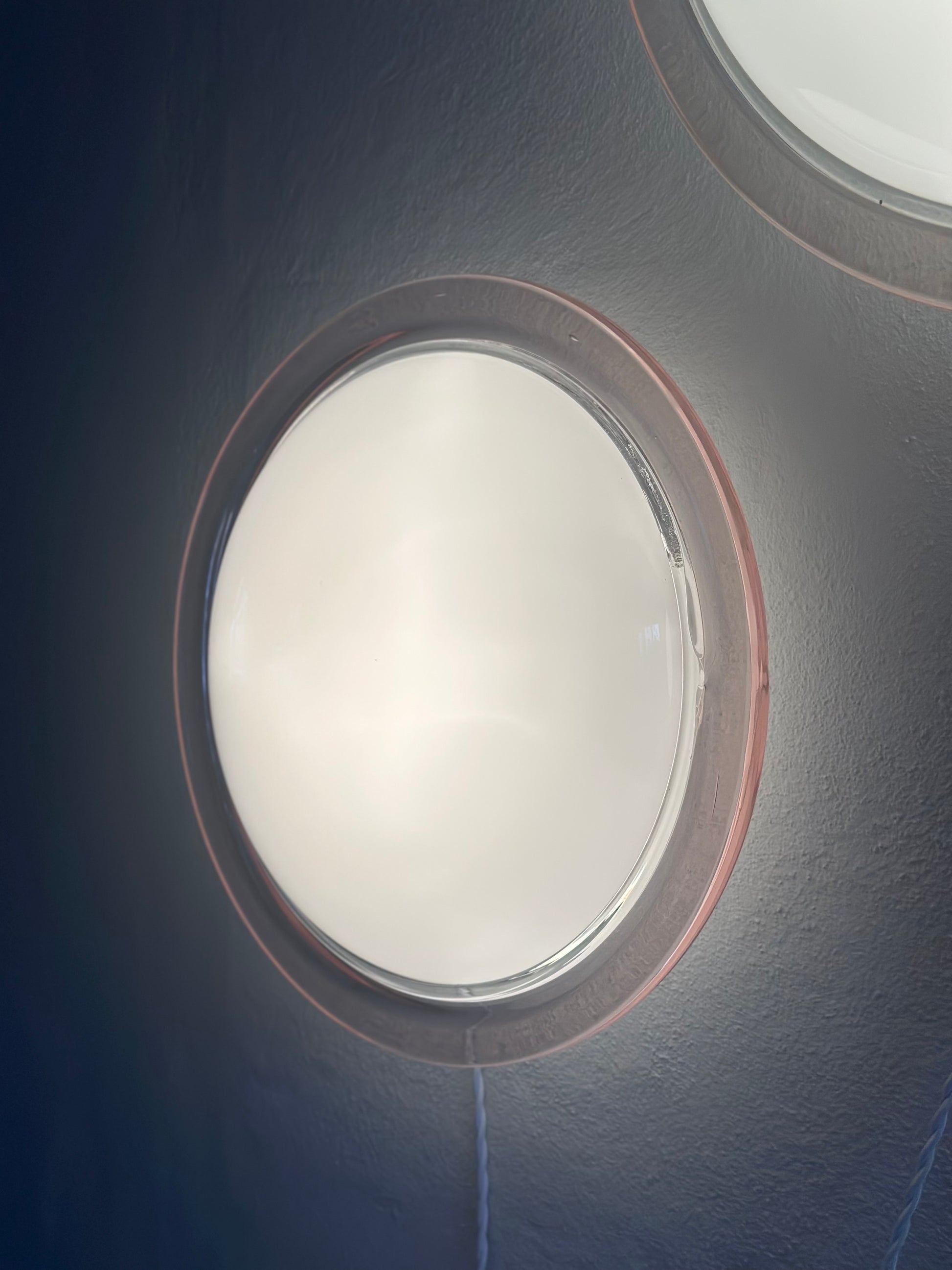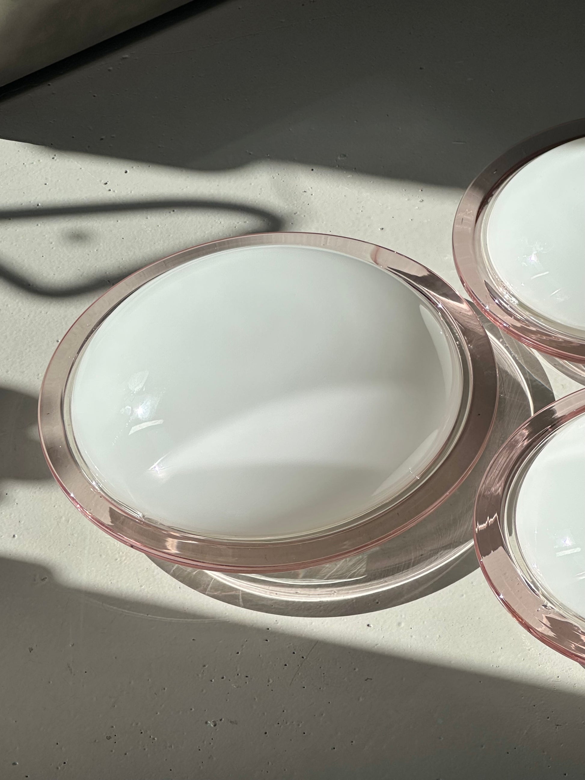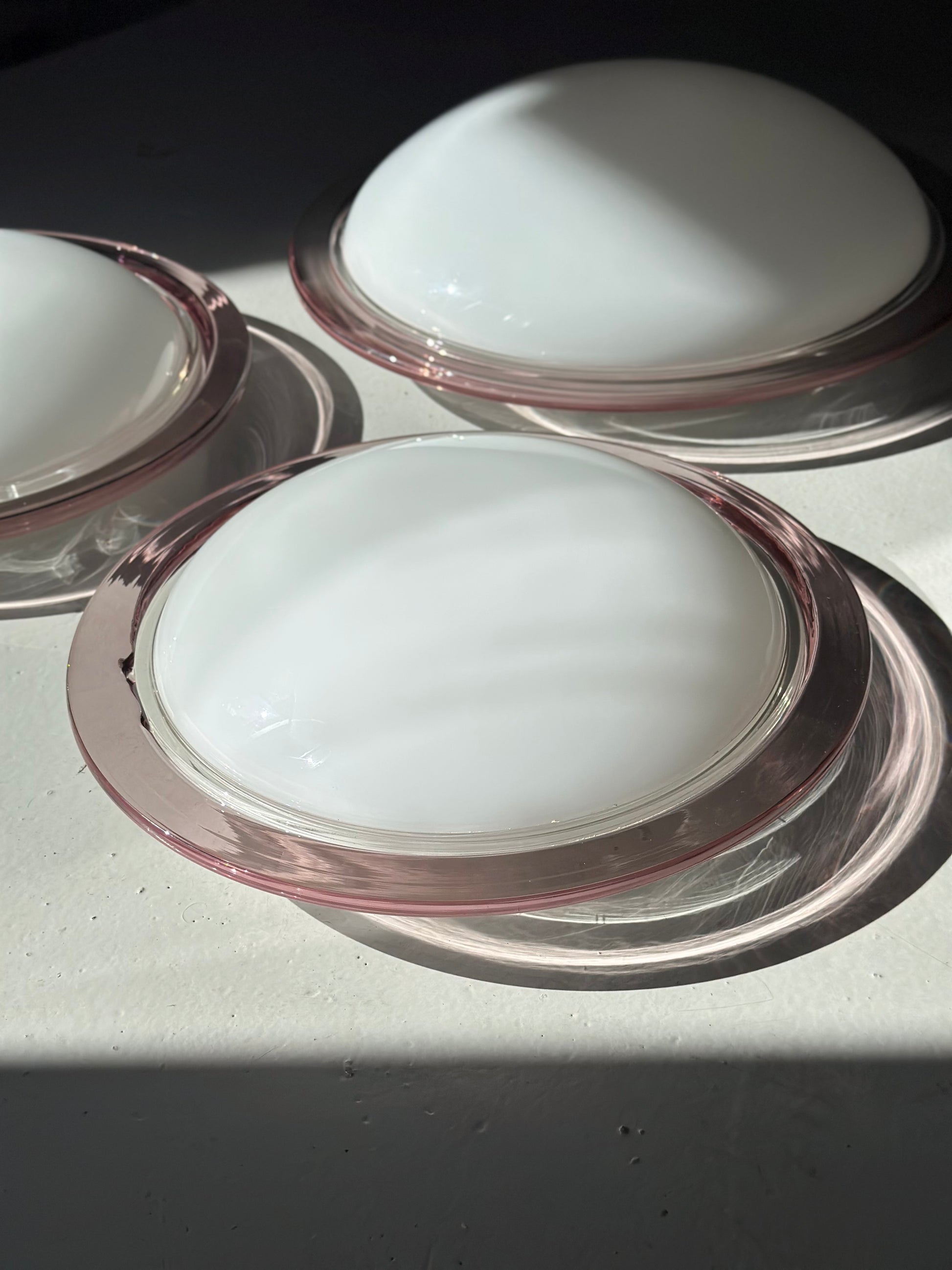 Vintage Murano plafond med hvid glas-midte og med kant i lyserødt glas. De er begge to i super flot stand uden revner og med kun alm lette brugsspor. De har begge fået nye friske hvide flettede stofledninger med afbryder.