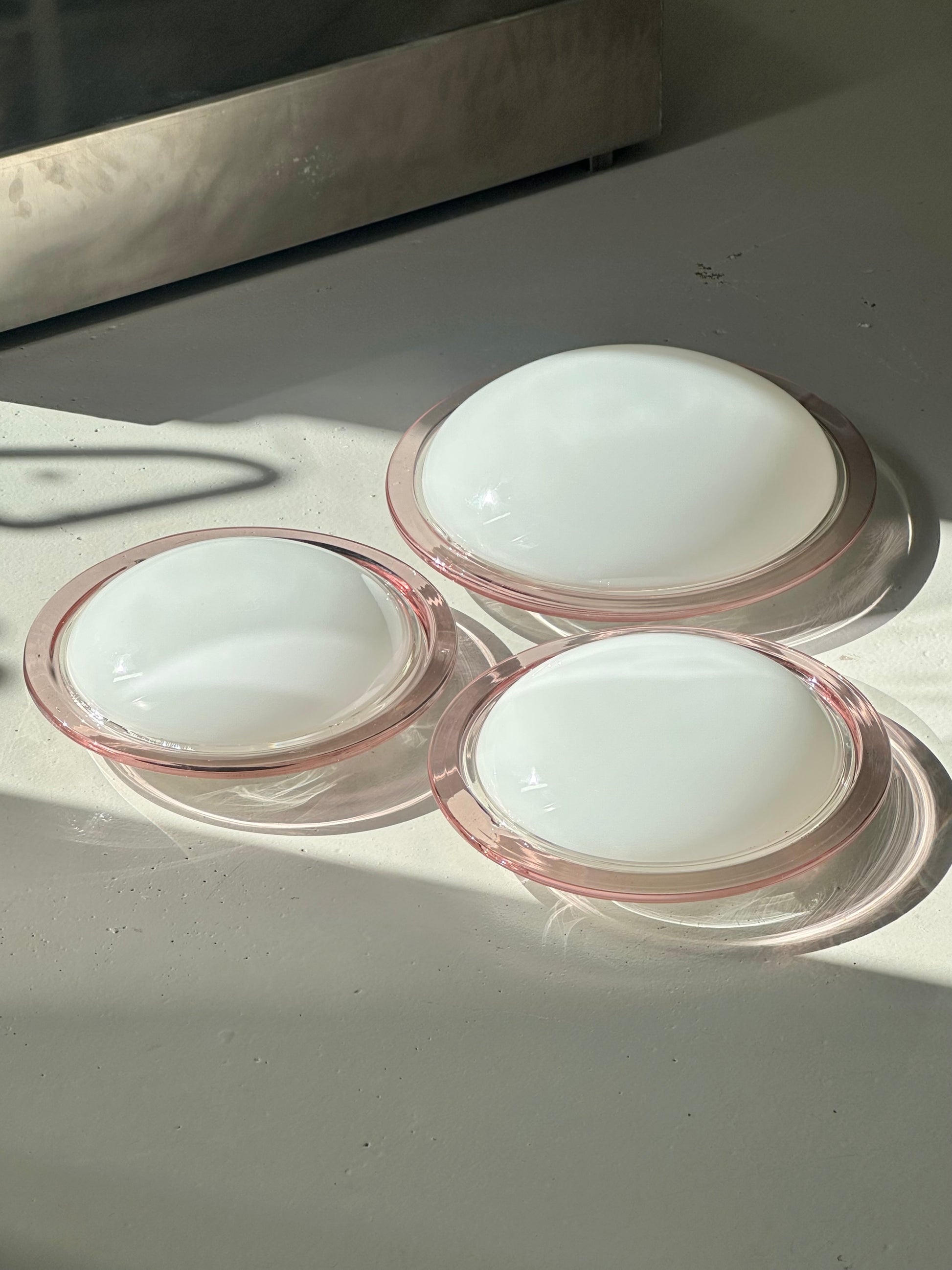 Vintage Murano plafond med hvid glas-midte og med kant i lyserødt glas. Den er i super flot stand uden revner og med kun alm lette brugsspor. Den har fået ny frisk hvid flettet stofledning med afbryder.