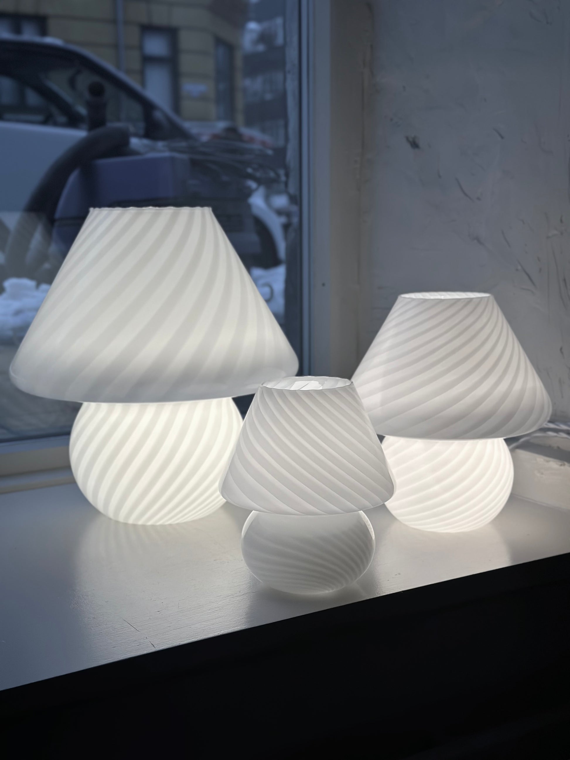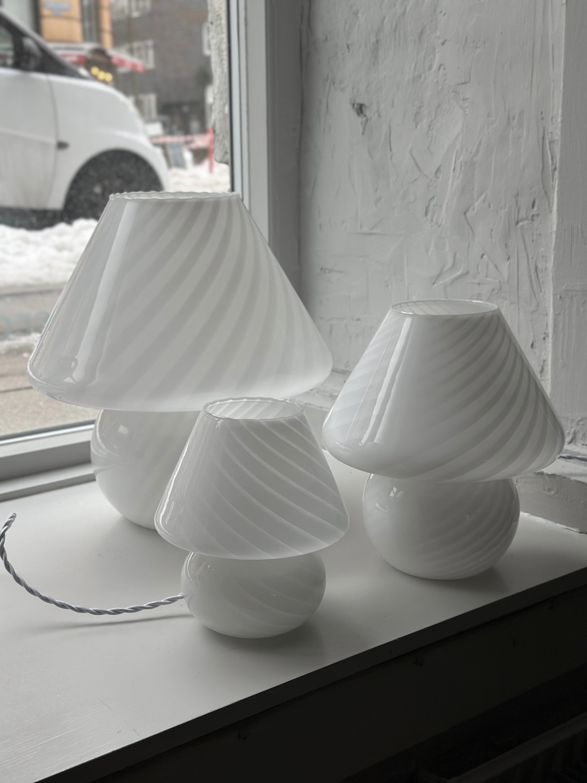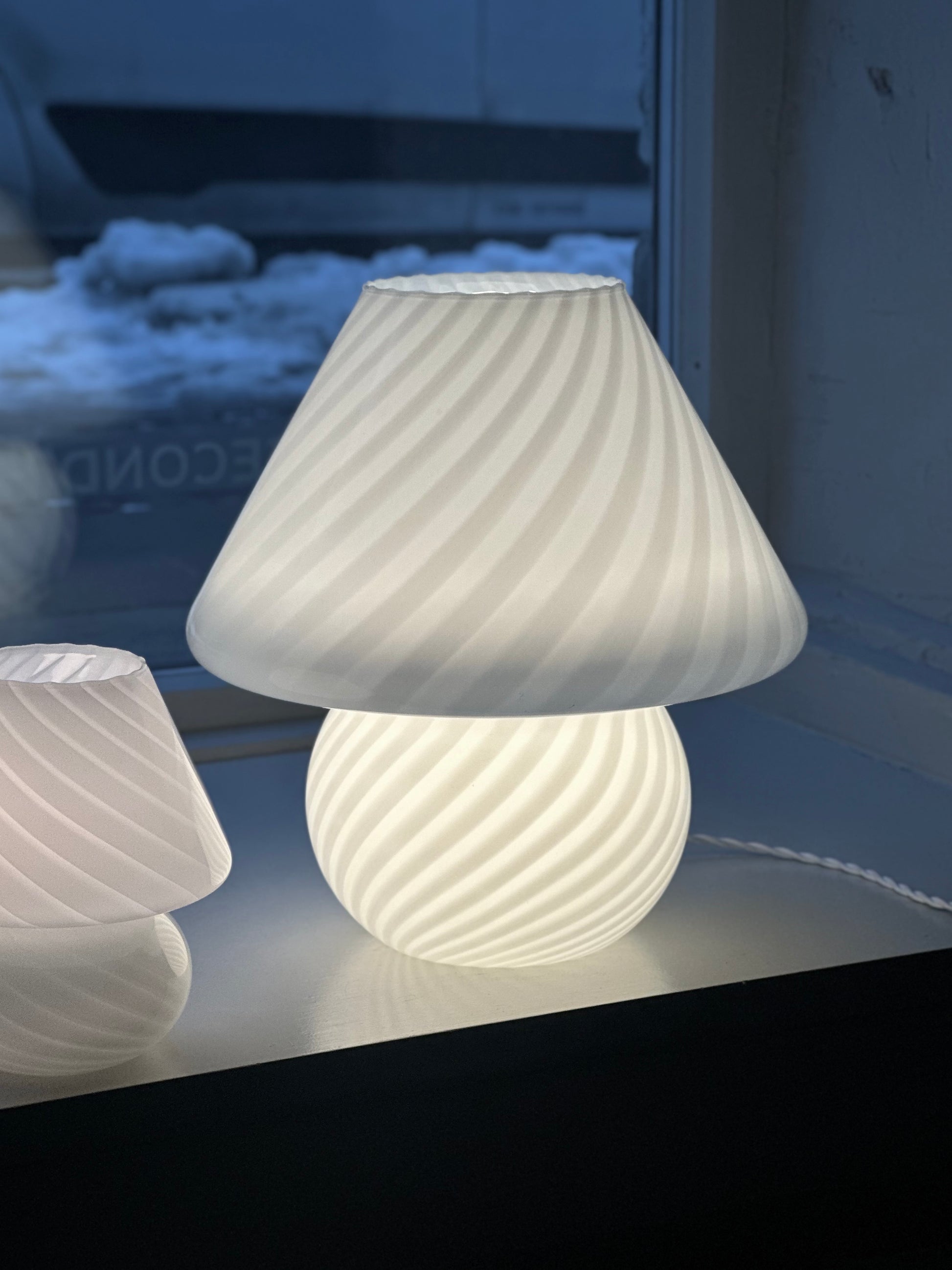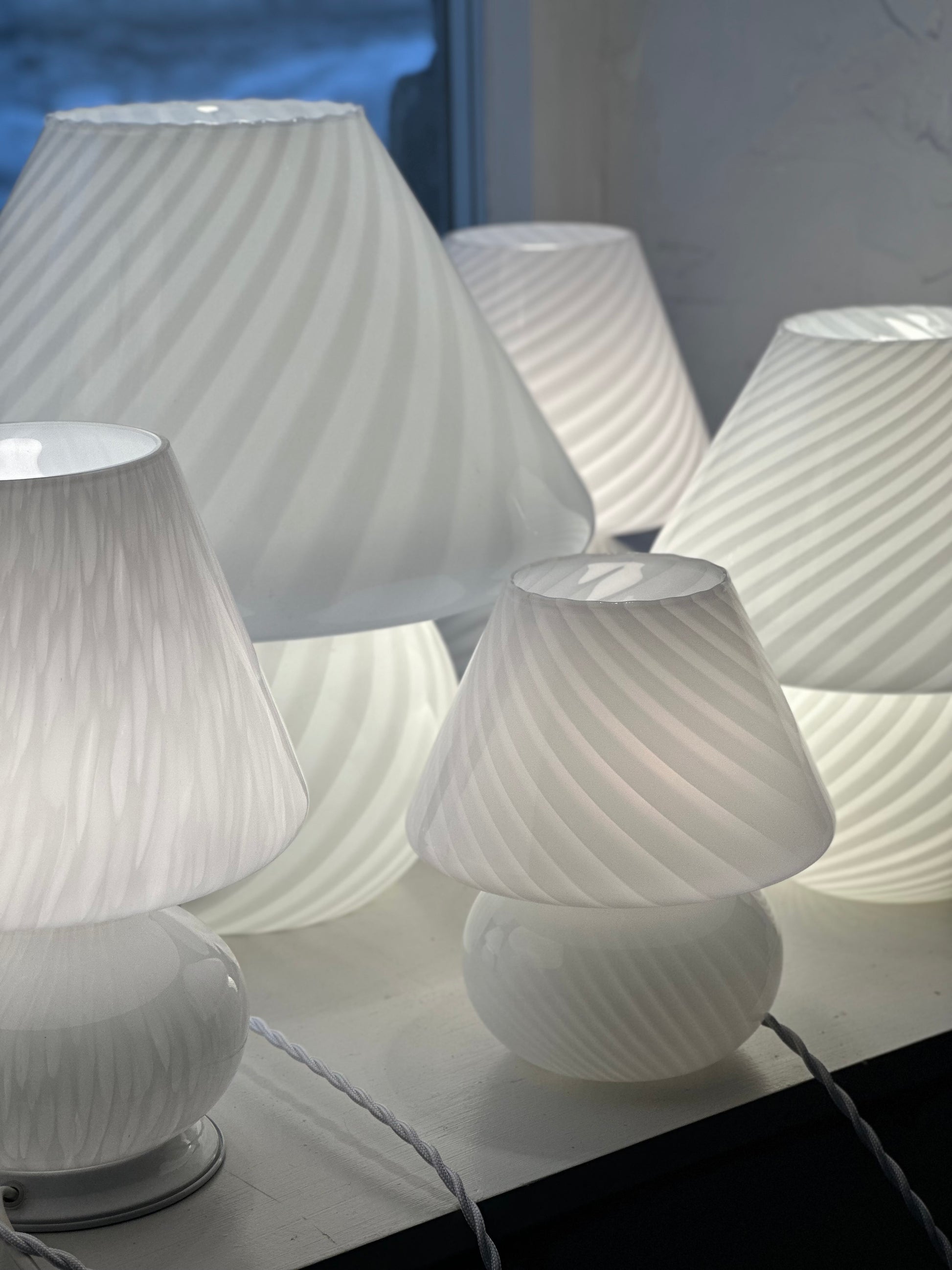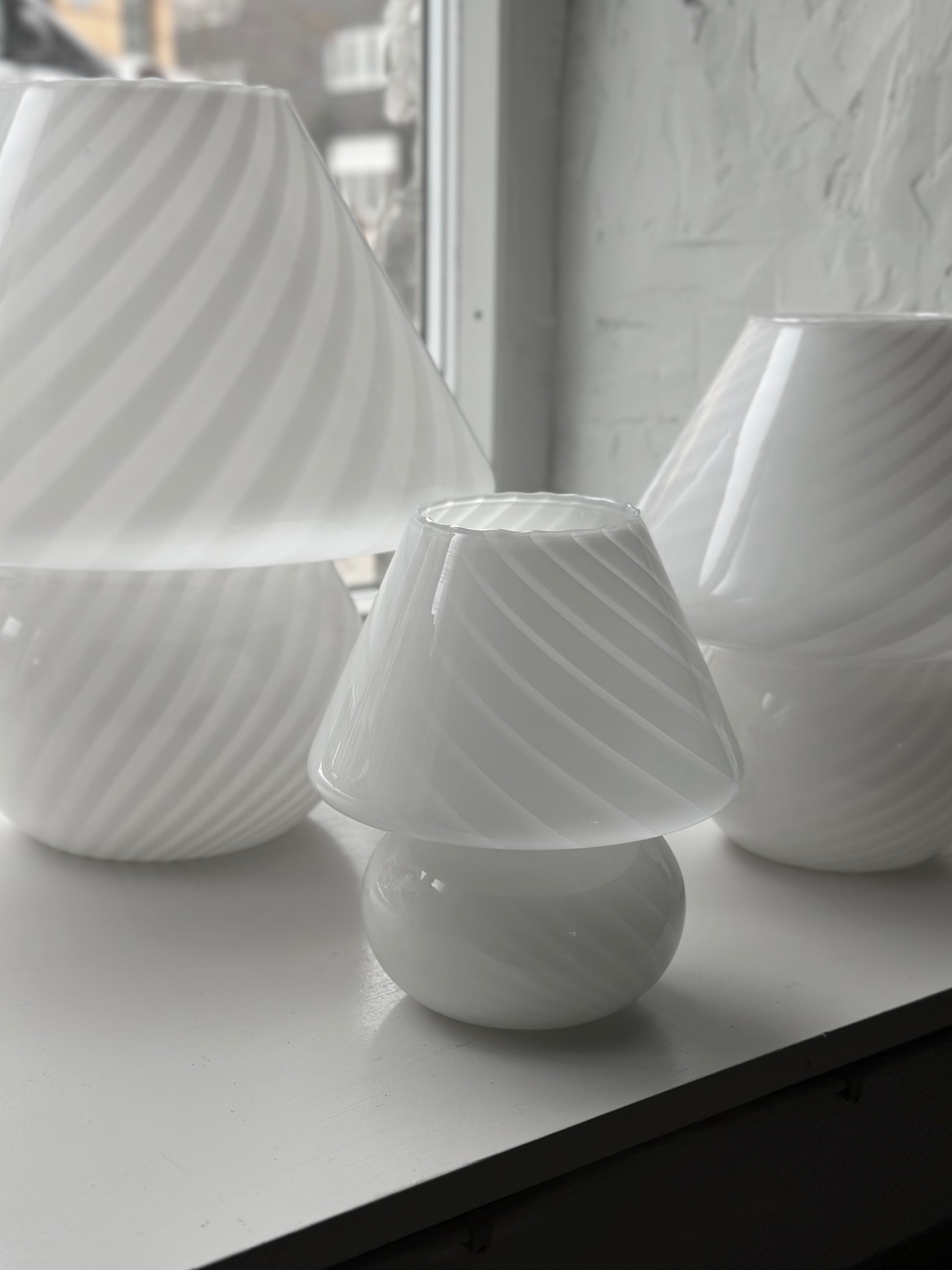 Italienske vintage Murano swirl mushroom-bordlamper i hvid. De er alle fundet i Italien og er i super flot stand uden skår. De har alle fået hvid flettet stofledning på.