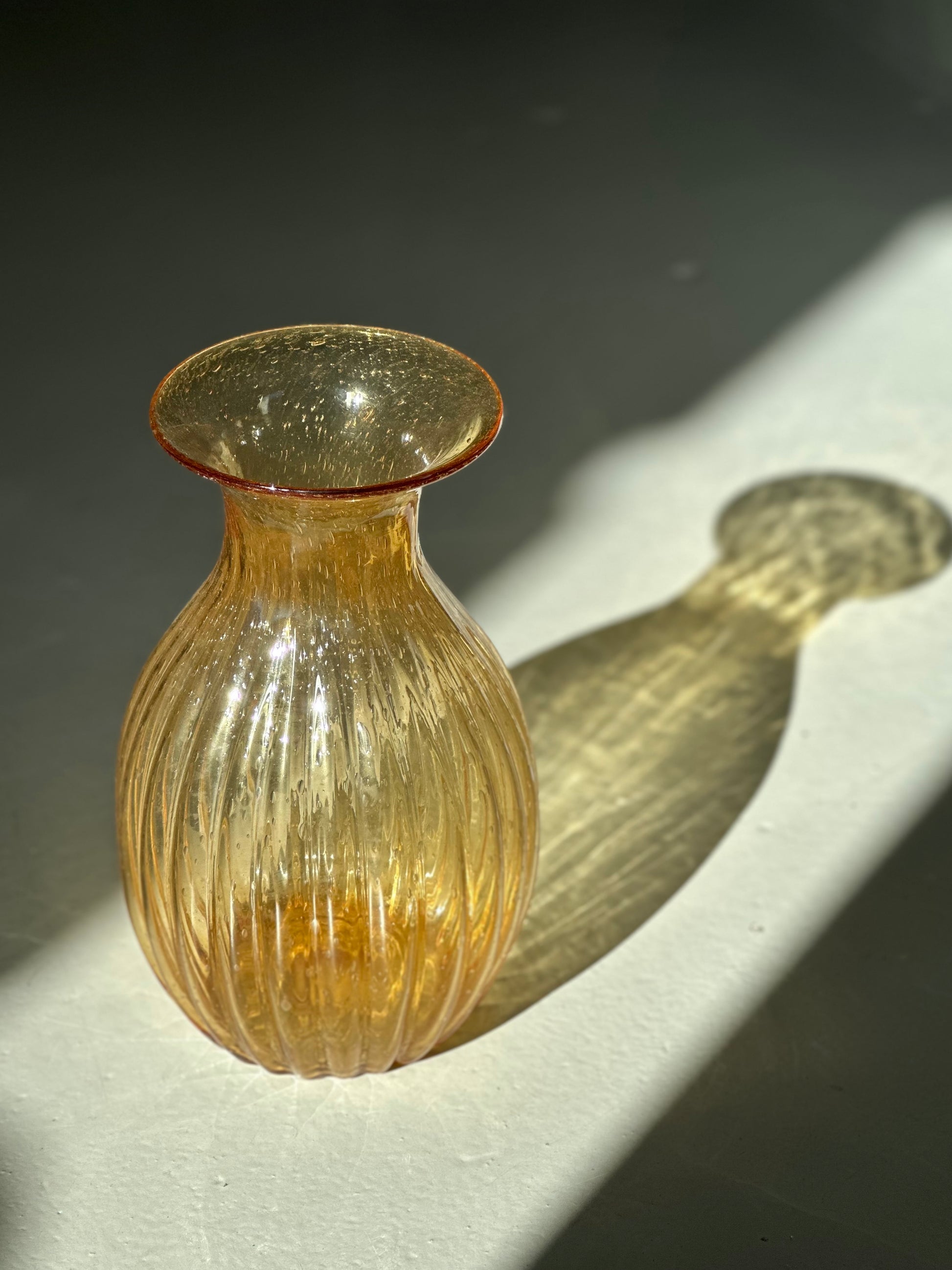 Vintage Murano vase i tykt riflet Murano glas i den fineste karamelgyldne farve. Den er i fantastisk flot stand uden skår og kun alm meget meget lette brugsspor.