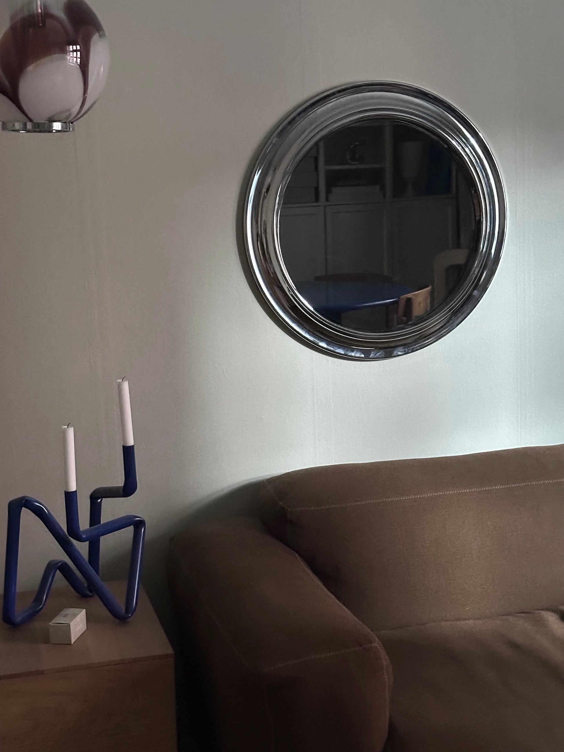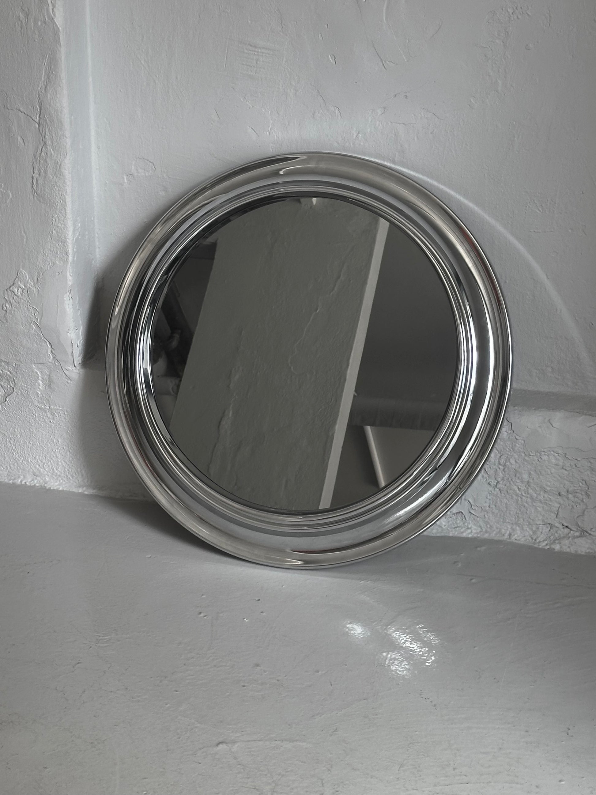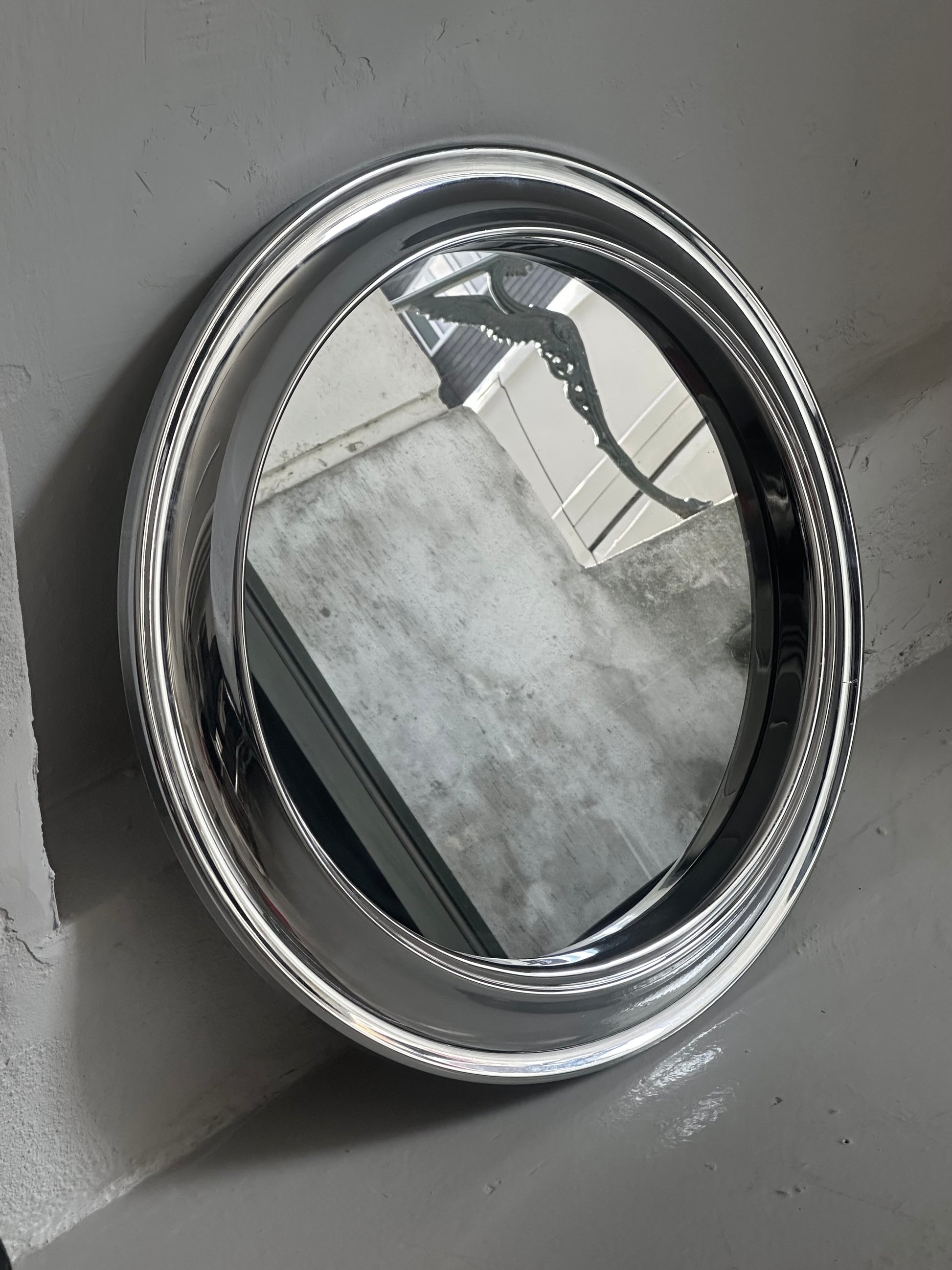 Stort rundt italiensk vintage spejl med ramme krom. Det er fundet i Italien og er i super flot stand med kun alm meget lette brugsspor og en enkelt sted med en lille rids (den camoufleres dog helt vildt pga kromen). Det er ophæng bagpå