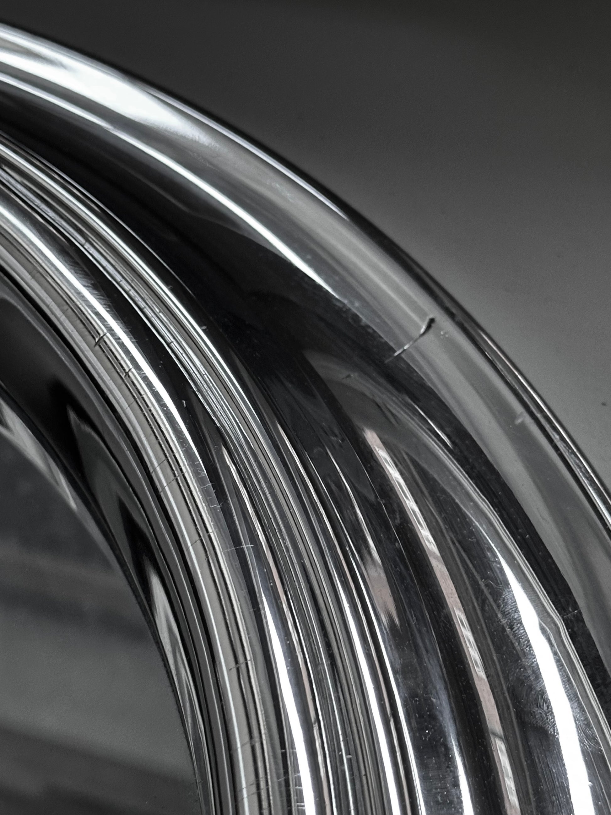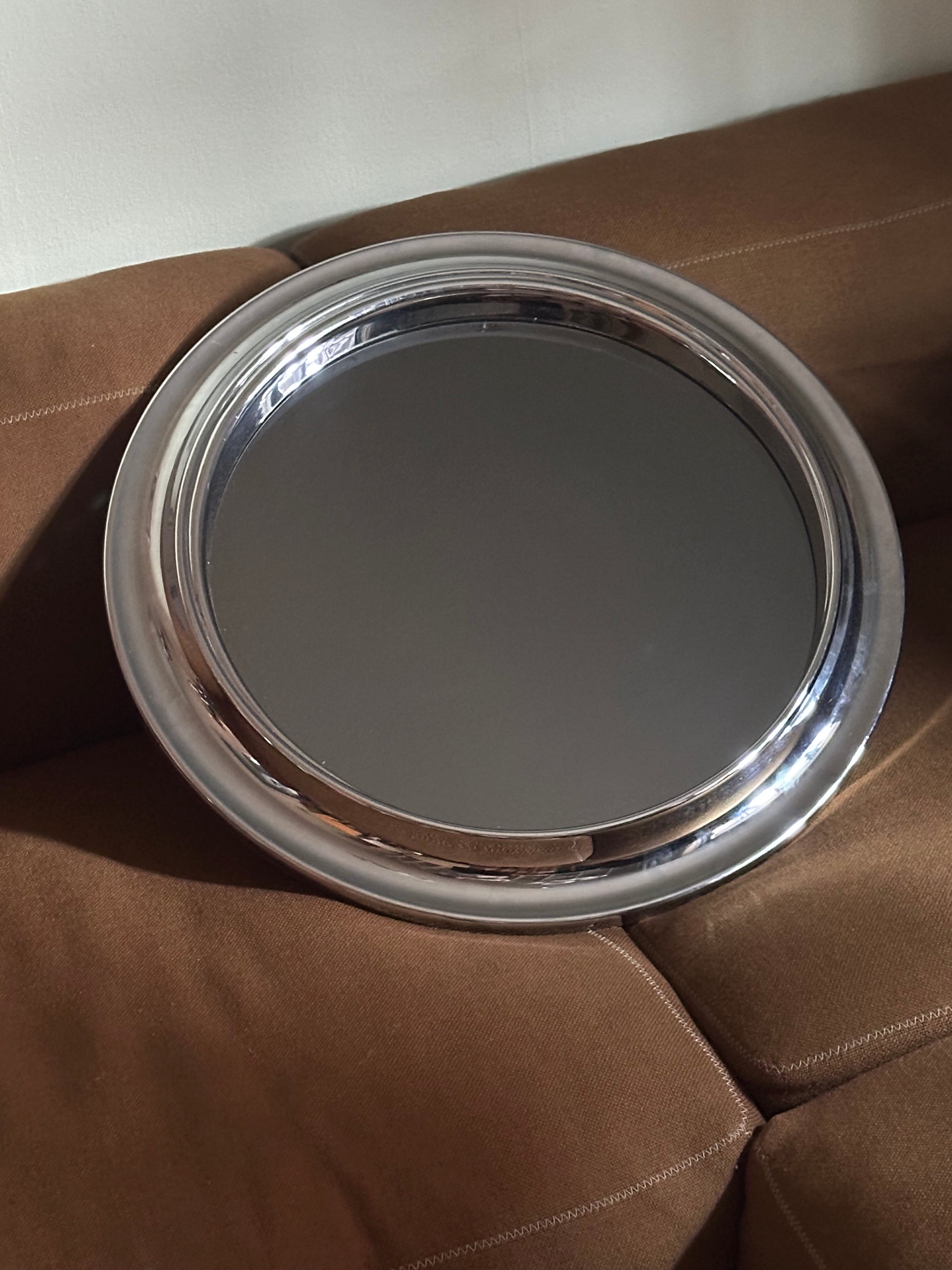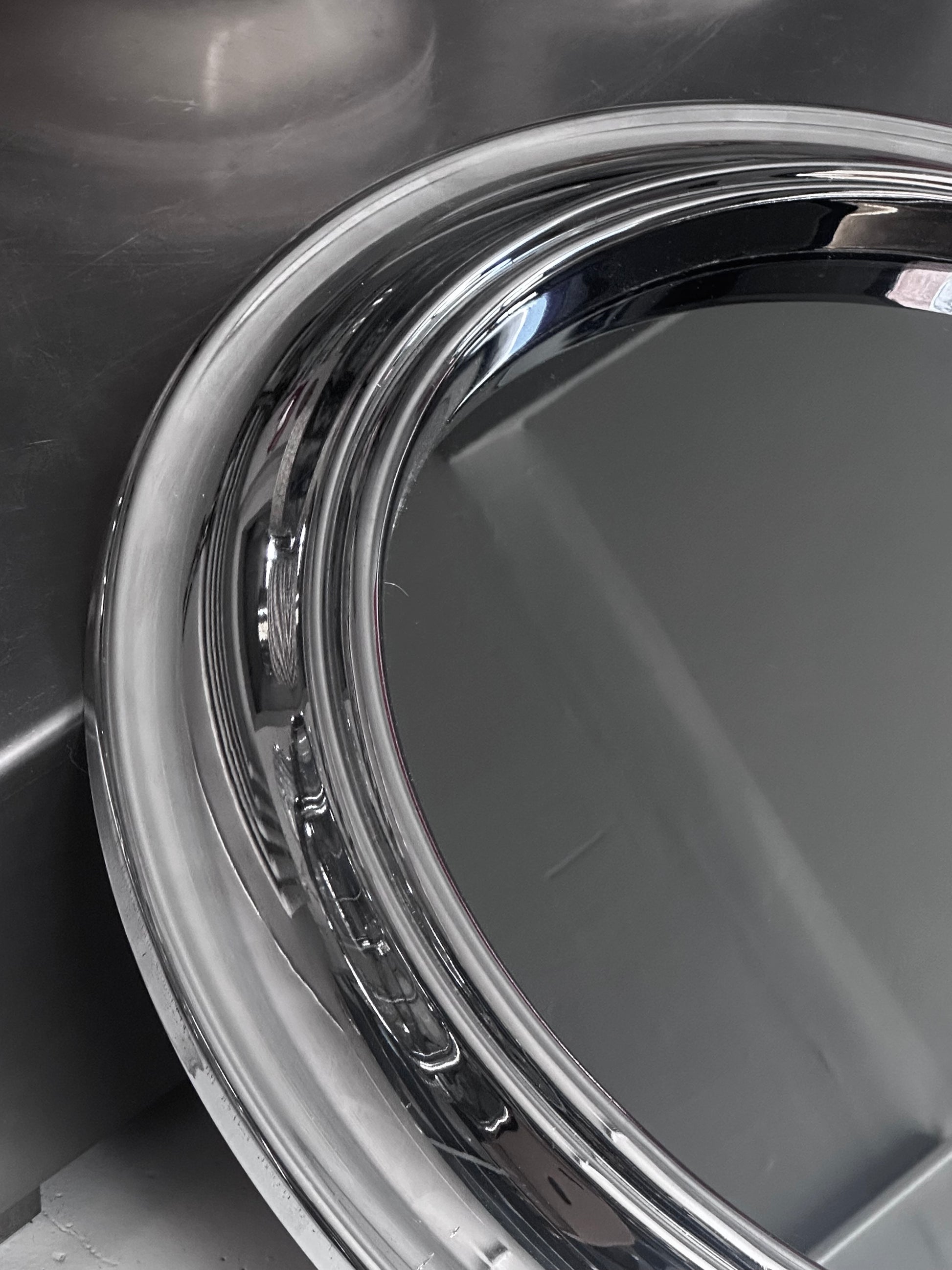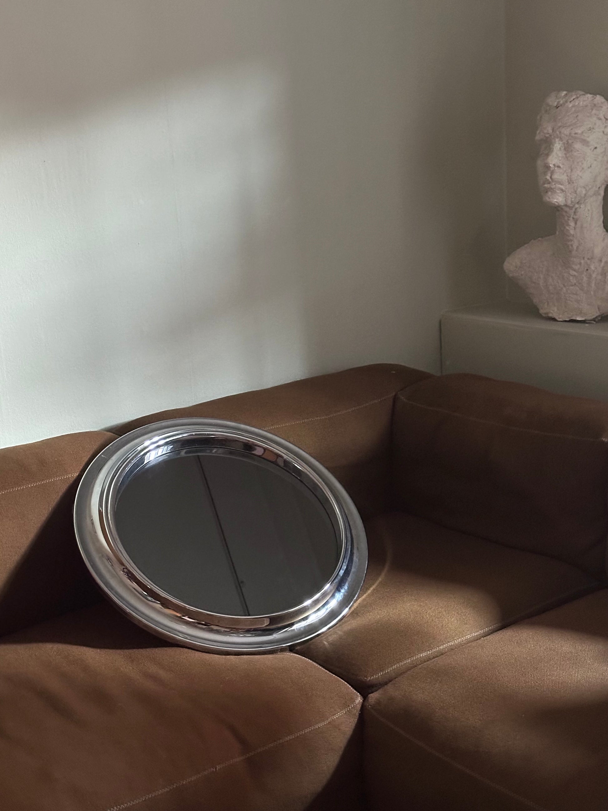 Stort rundt italiensk vintage spejl med ramme krom. Det er fundet i Italien og er i super flot stand med kun alm meget lette brugsspor og en enkelt sted med en lille rids (den camoufleres dog helt vildt pga kromen). Det er ophæng bagpå